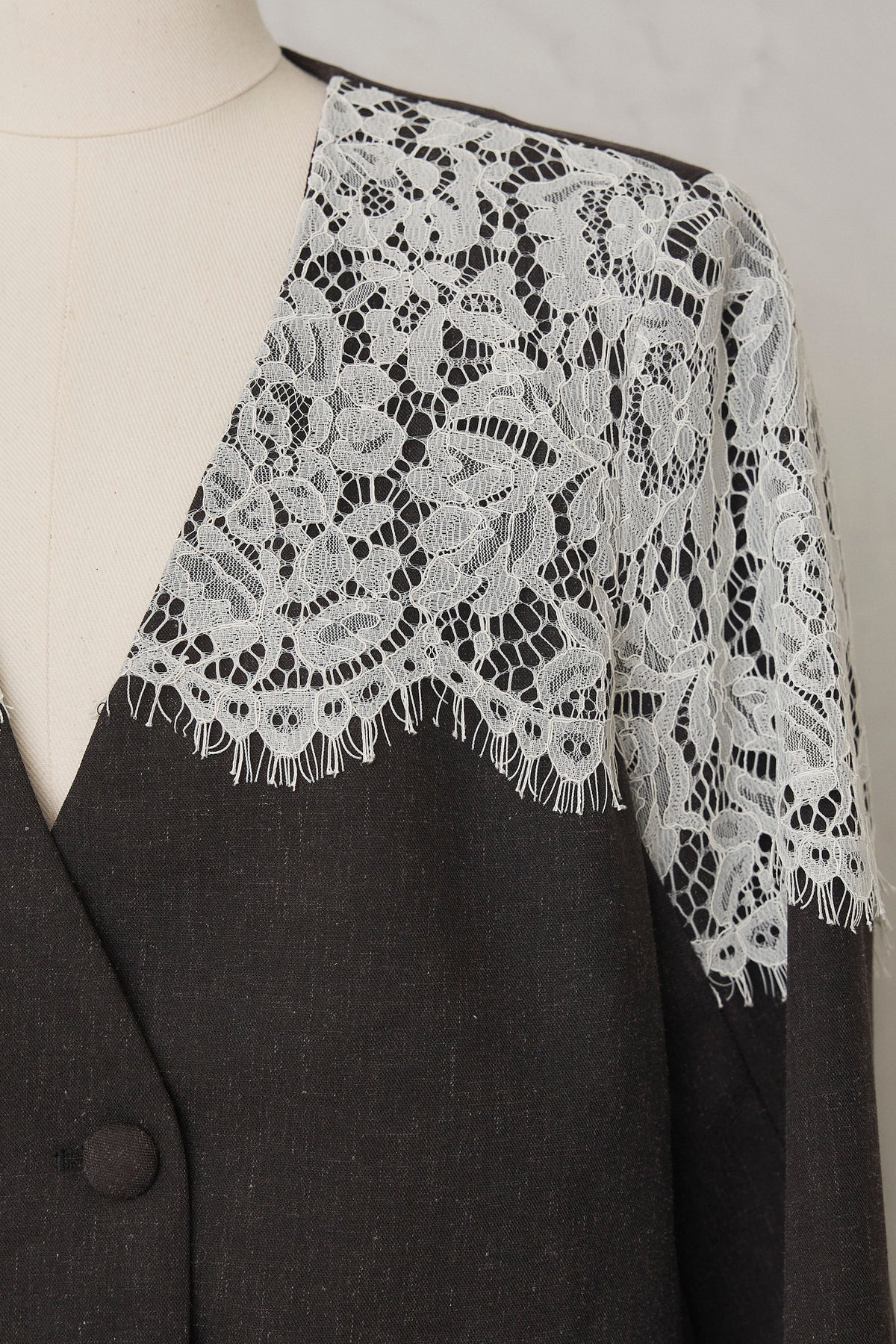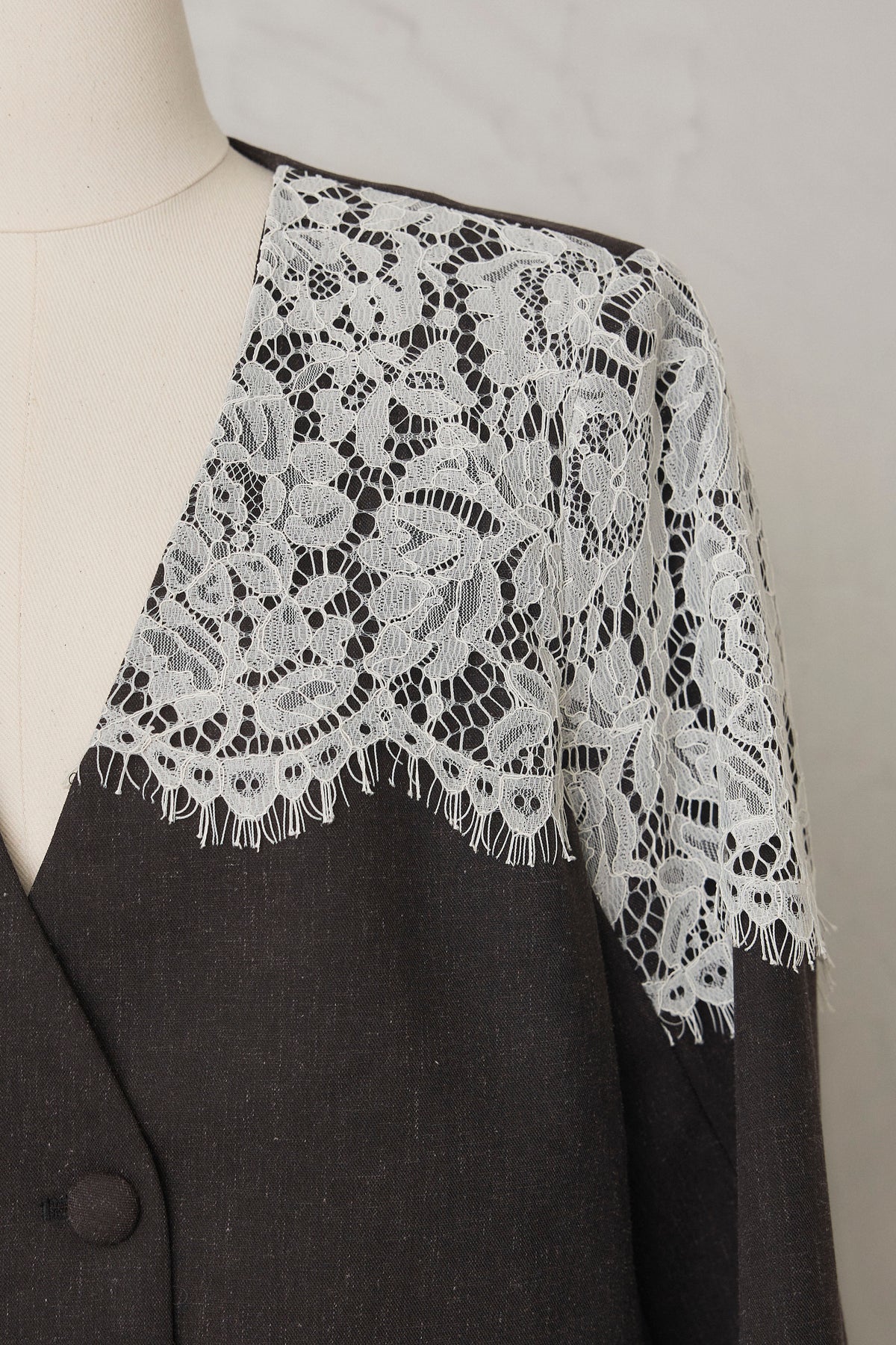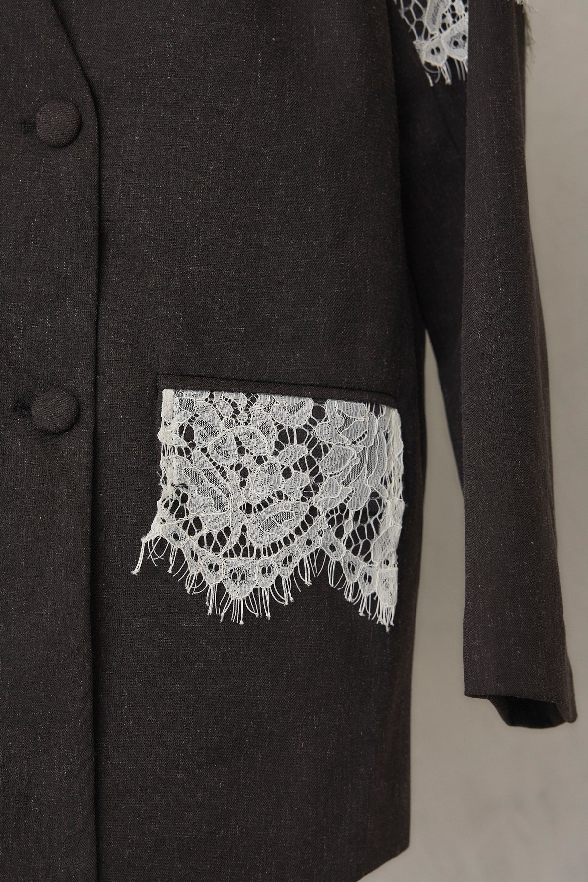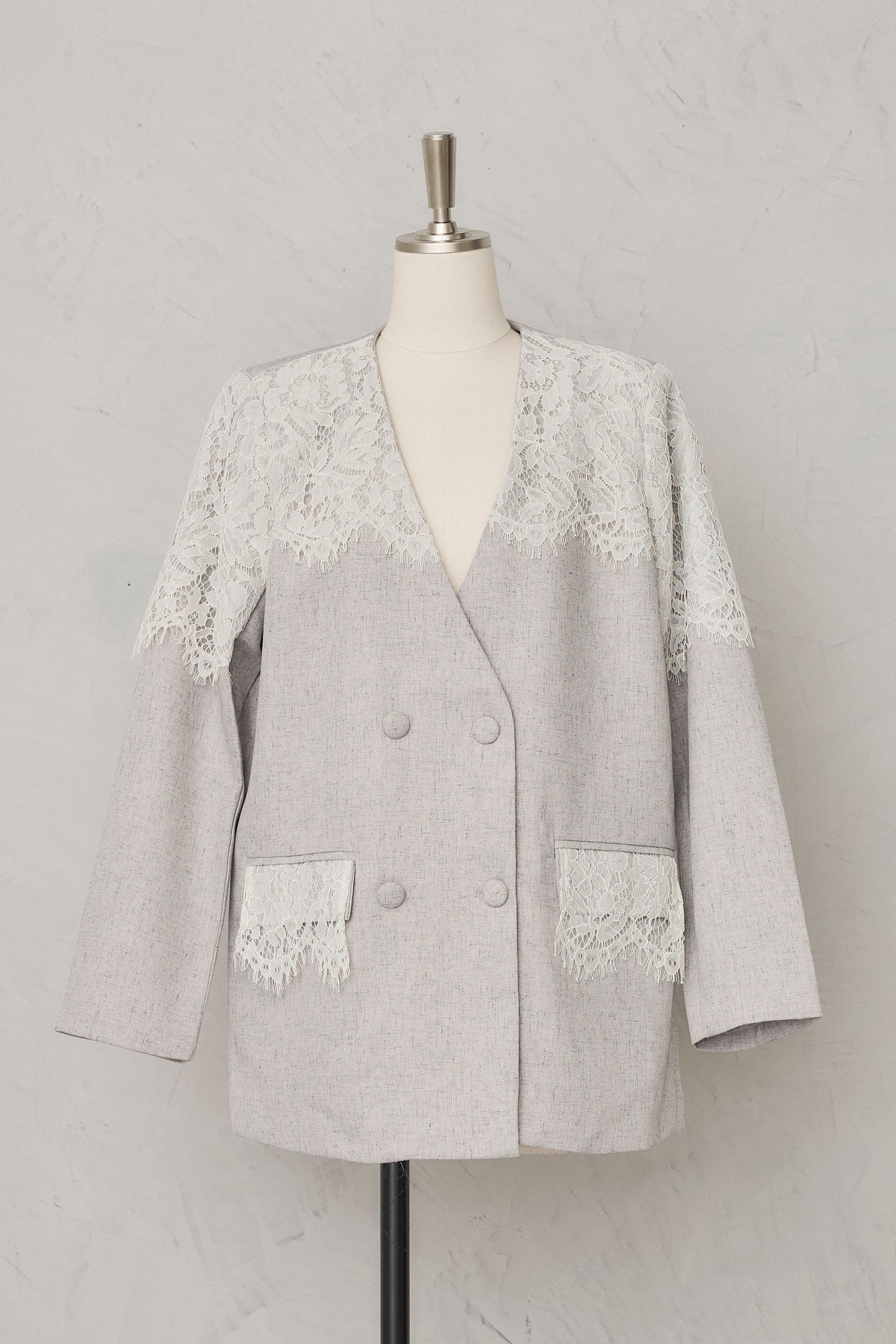 繊細なレースをショルダーから胸元に贅沢にあしらい、品よく華やぐ印象に仕上げたダブルジャケット。 落ち着いた生地とのコントラストが女性らしさを引き立て、羽織るだけでドレッシーな装いが完成します。 フォーマルにもきちんと馴染む端正なシルエットで、オケージョンシーンを上品に彩る一着です。