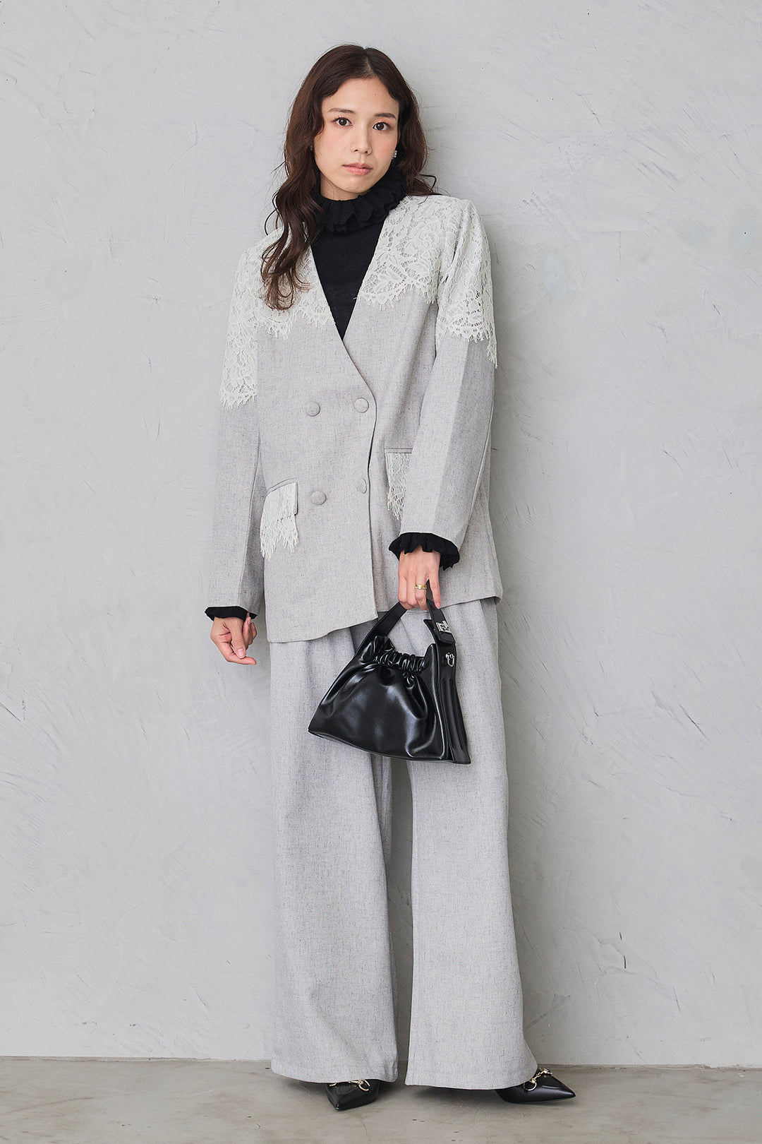 [予約/SET]ショルダーレースデザインジャケット+ライトツイードタックパンツ(2set)