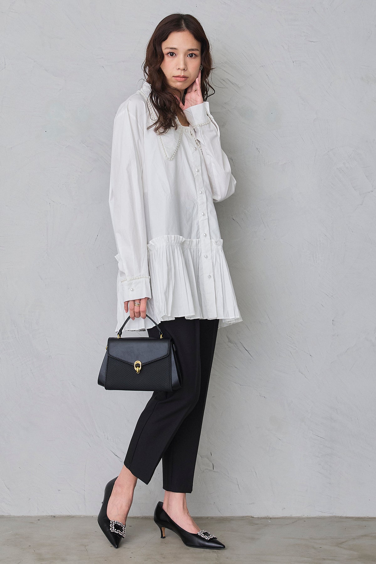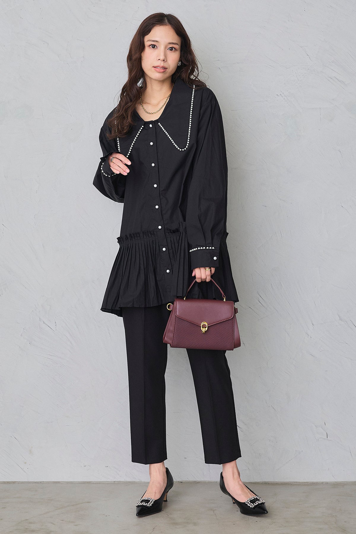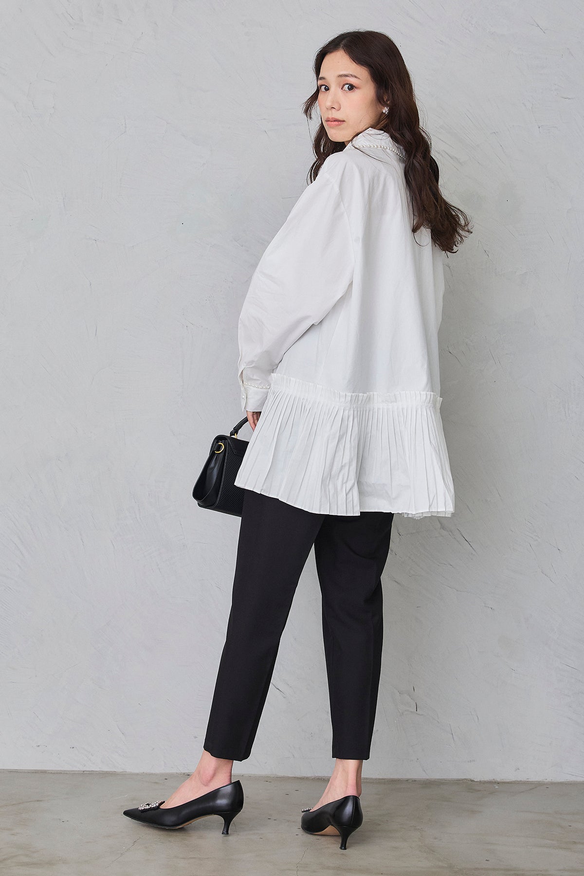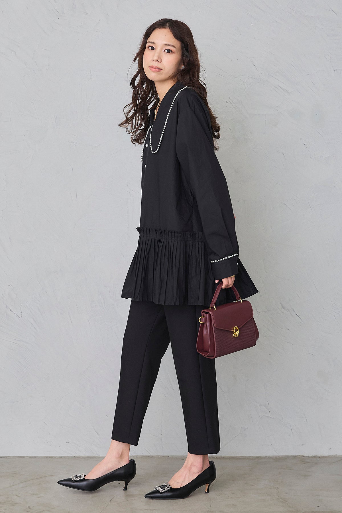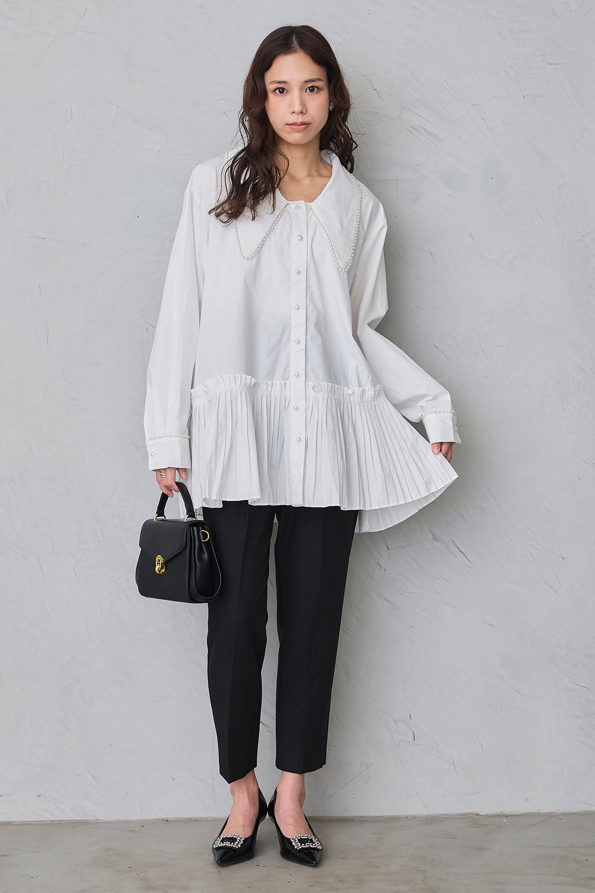 [予約/SET]パールライン襟×プリーツシャツ+タックテーパードパンツ(2set)