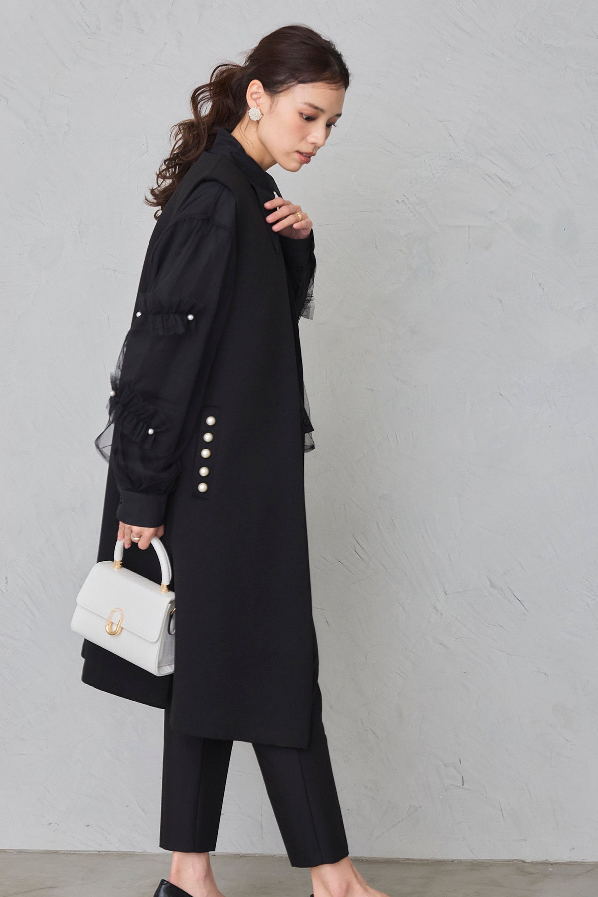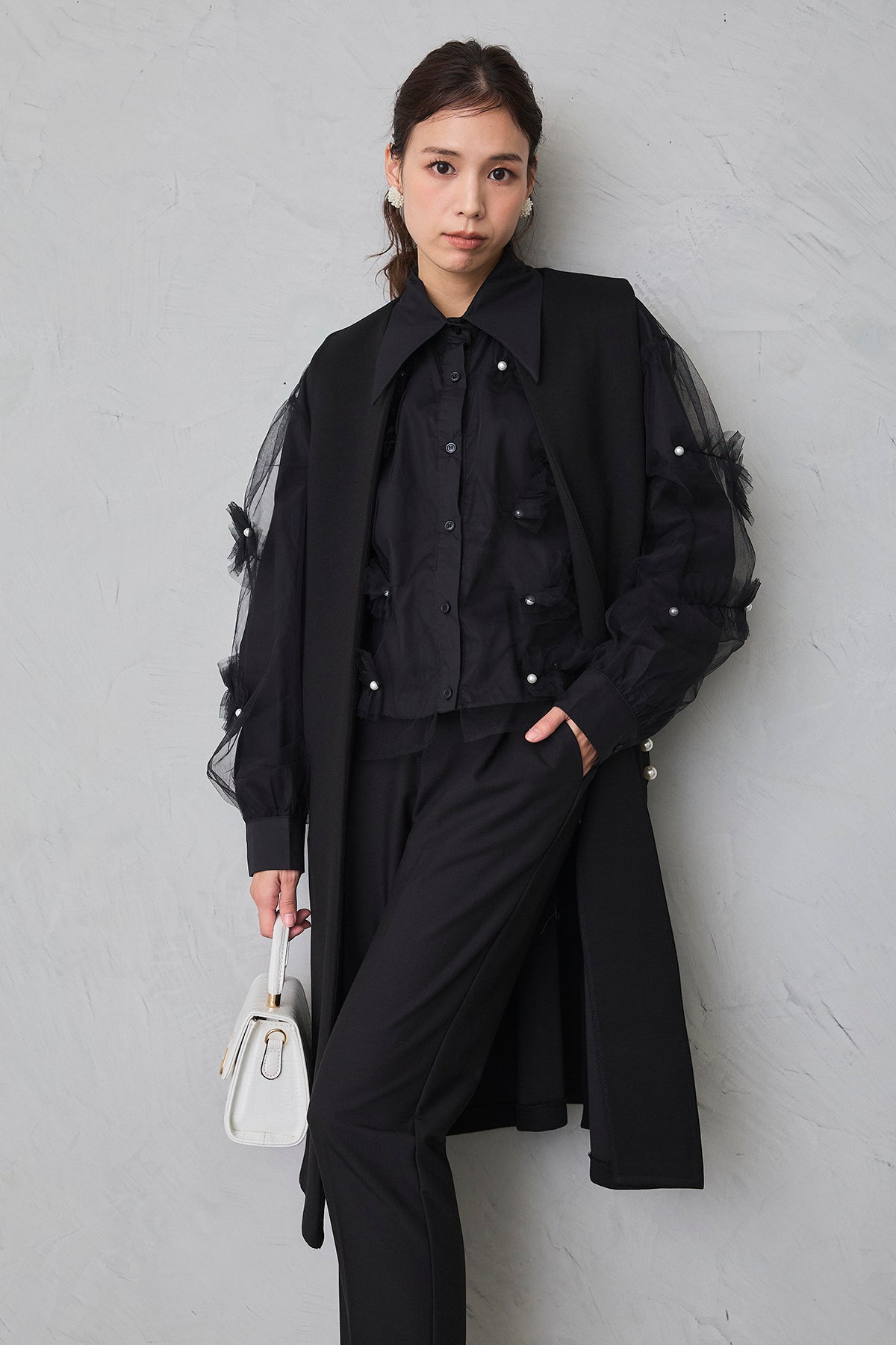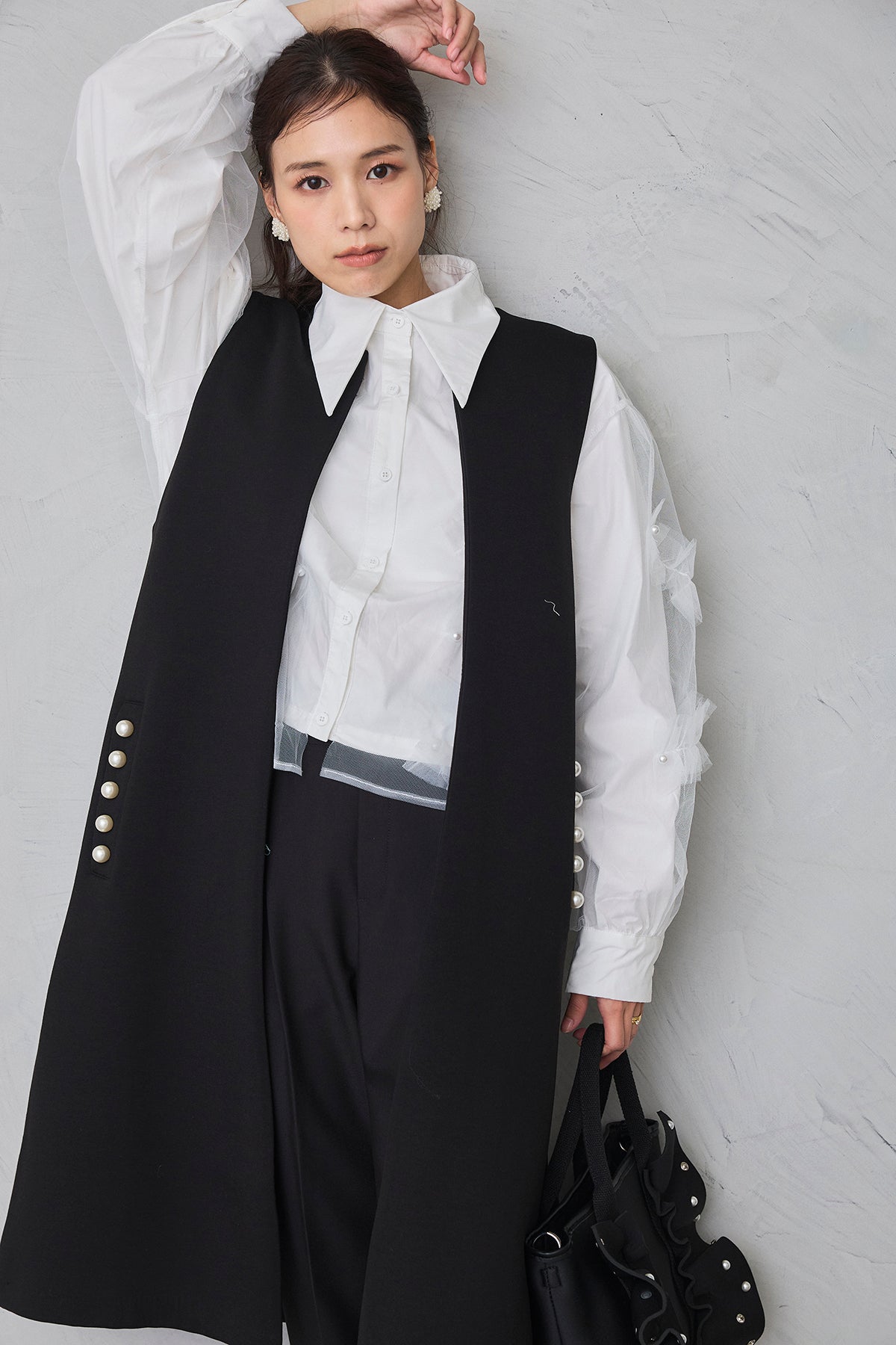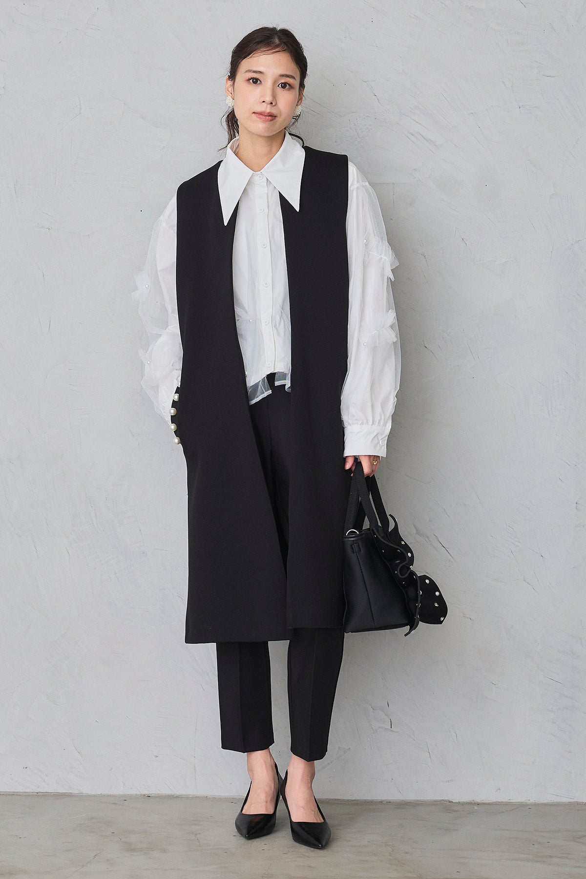 [予約/SET]チュールレイヤードパールシャツ+ポケットパール付きボンディングロングベスト+タックテーパードパンツ(3set)
