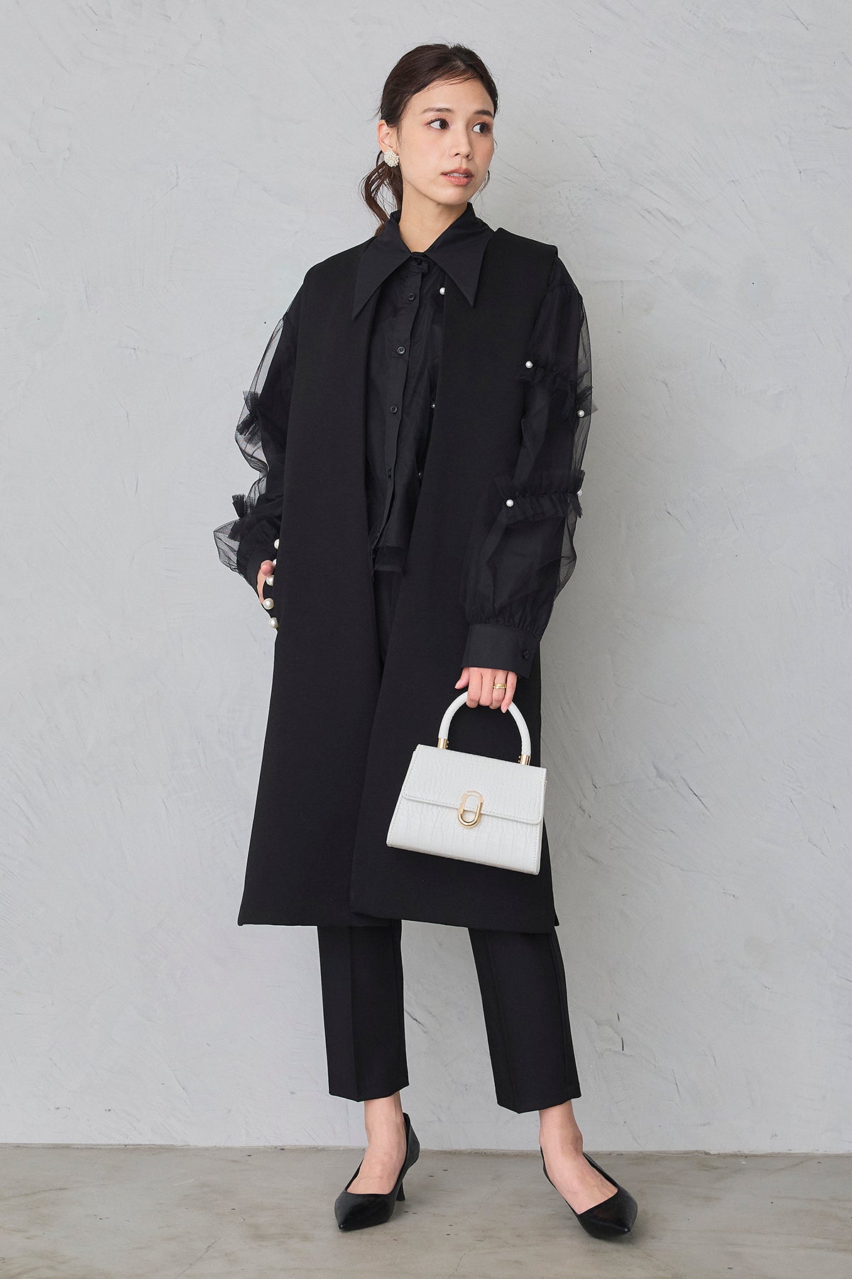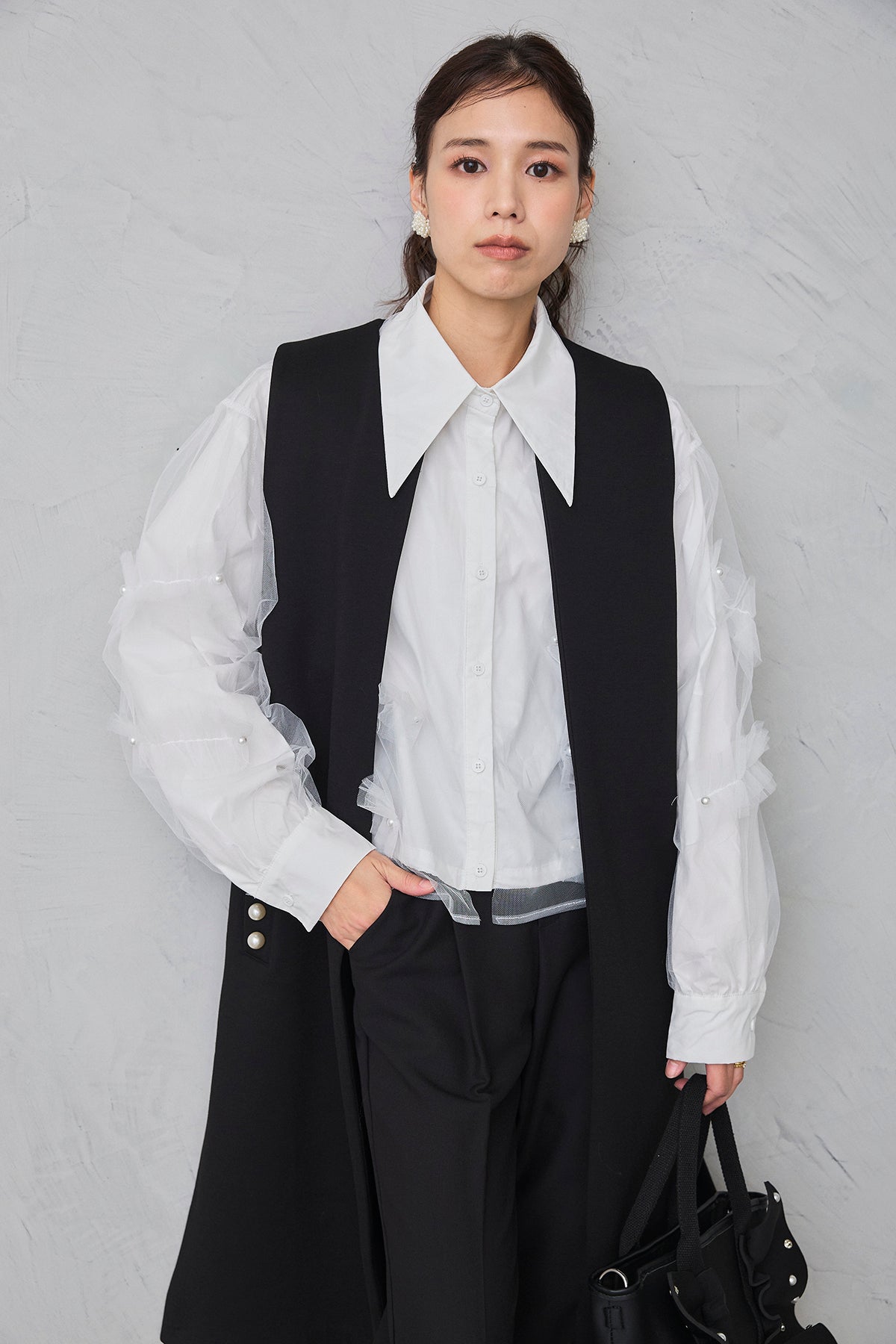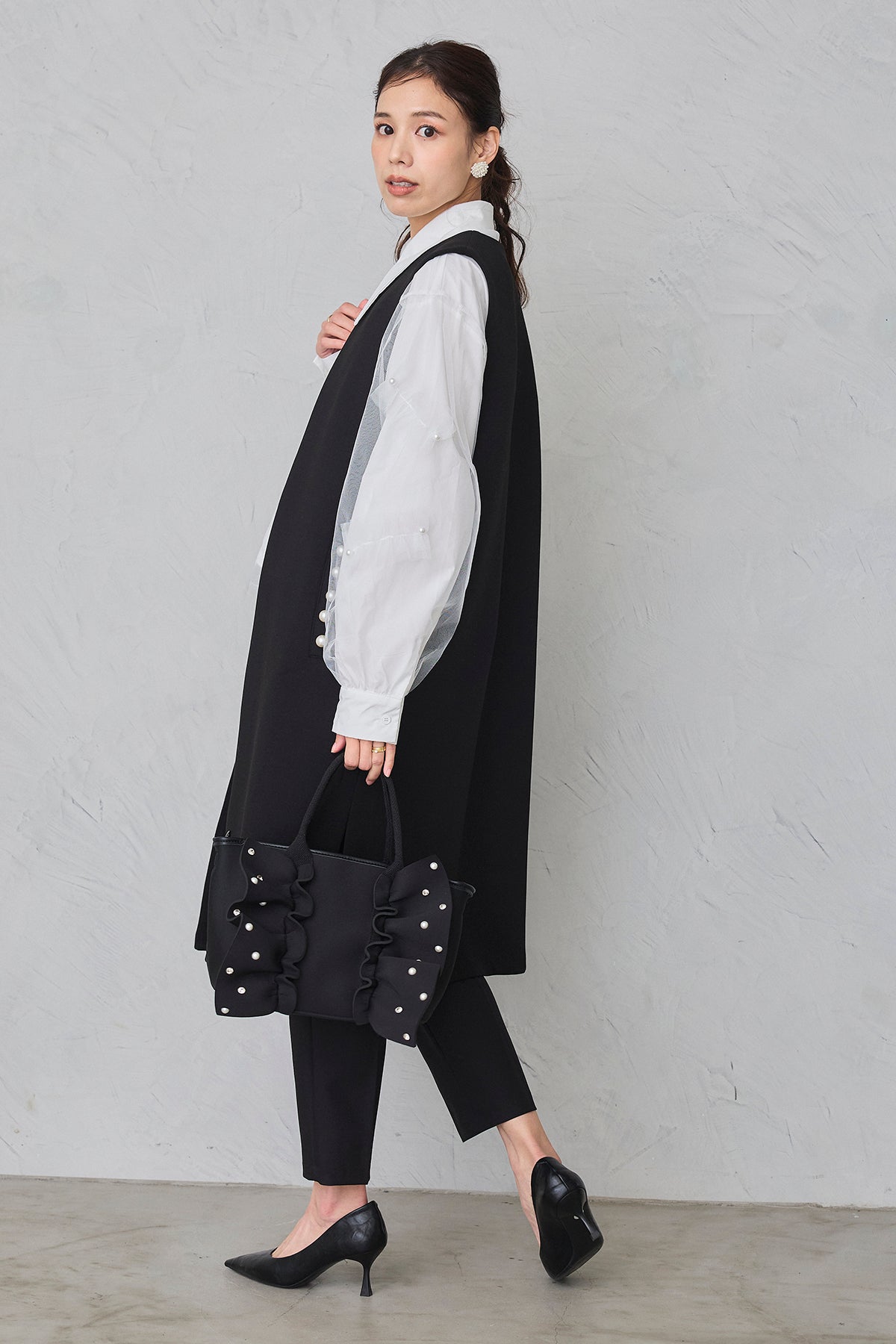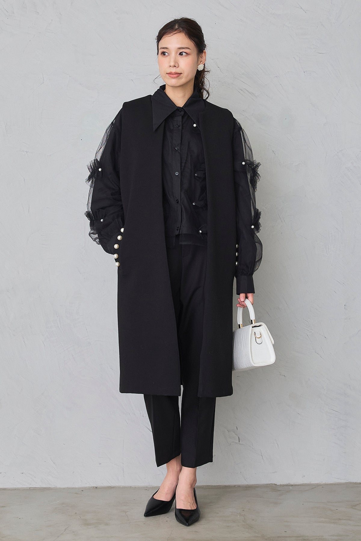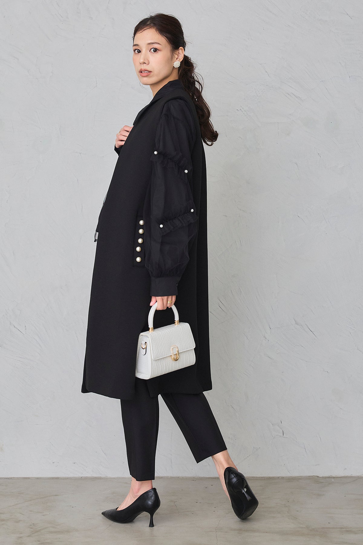 [予約/SET]チュールレイヤードパールシャツ+ポケットパール付きボンディングロングベスト+タックテーパードパンツ(3set)