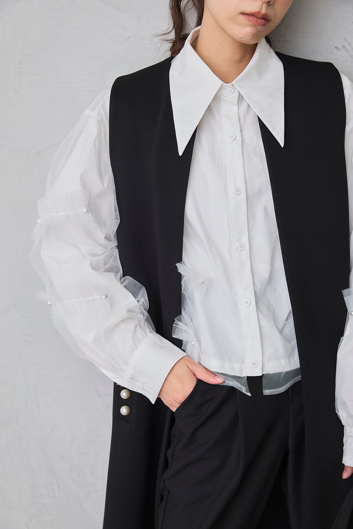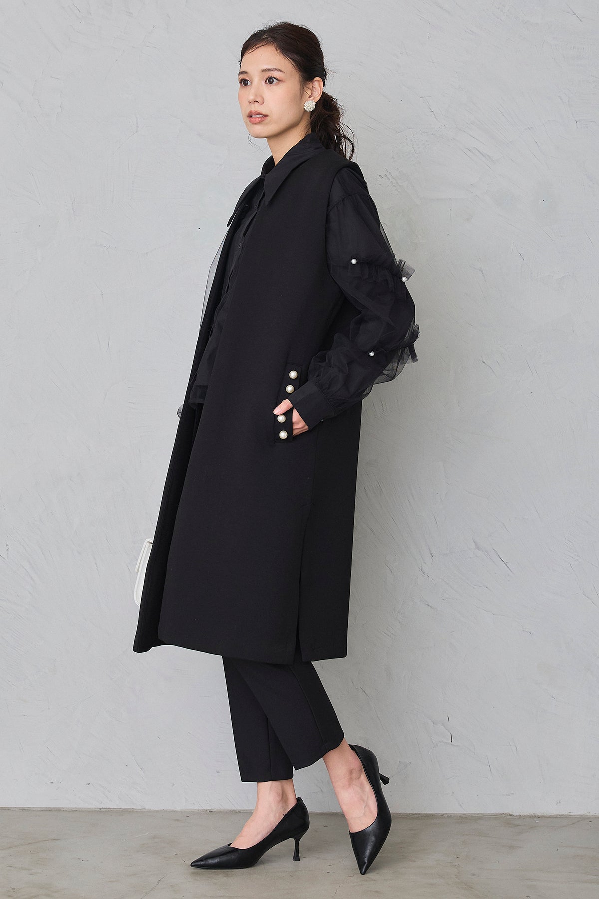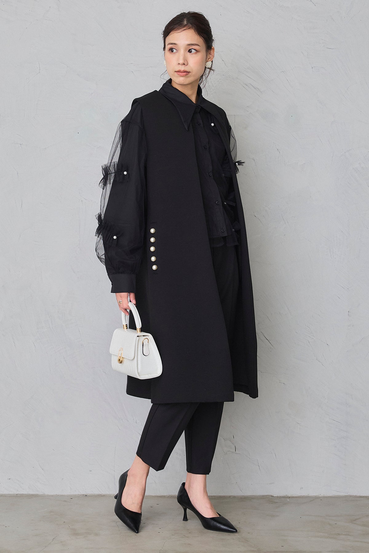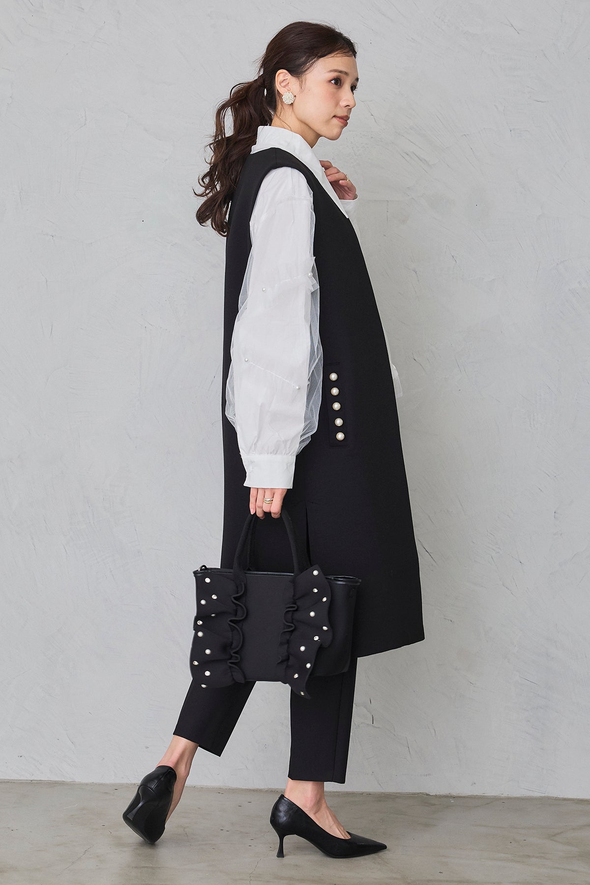 [予約/SET]チュールレイヤードパールシャツ+ポケットパール付きボンディングロングベスト+タックテーパードパンツ(3set)