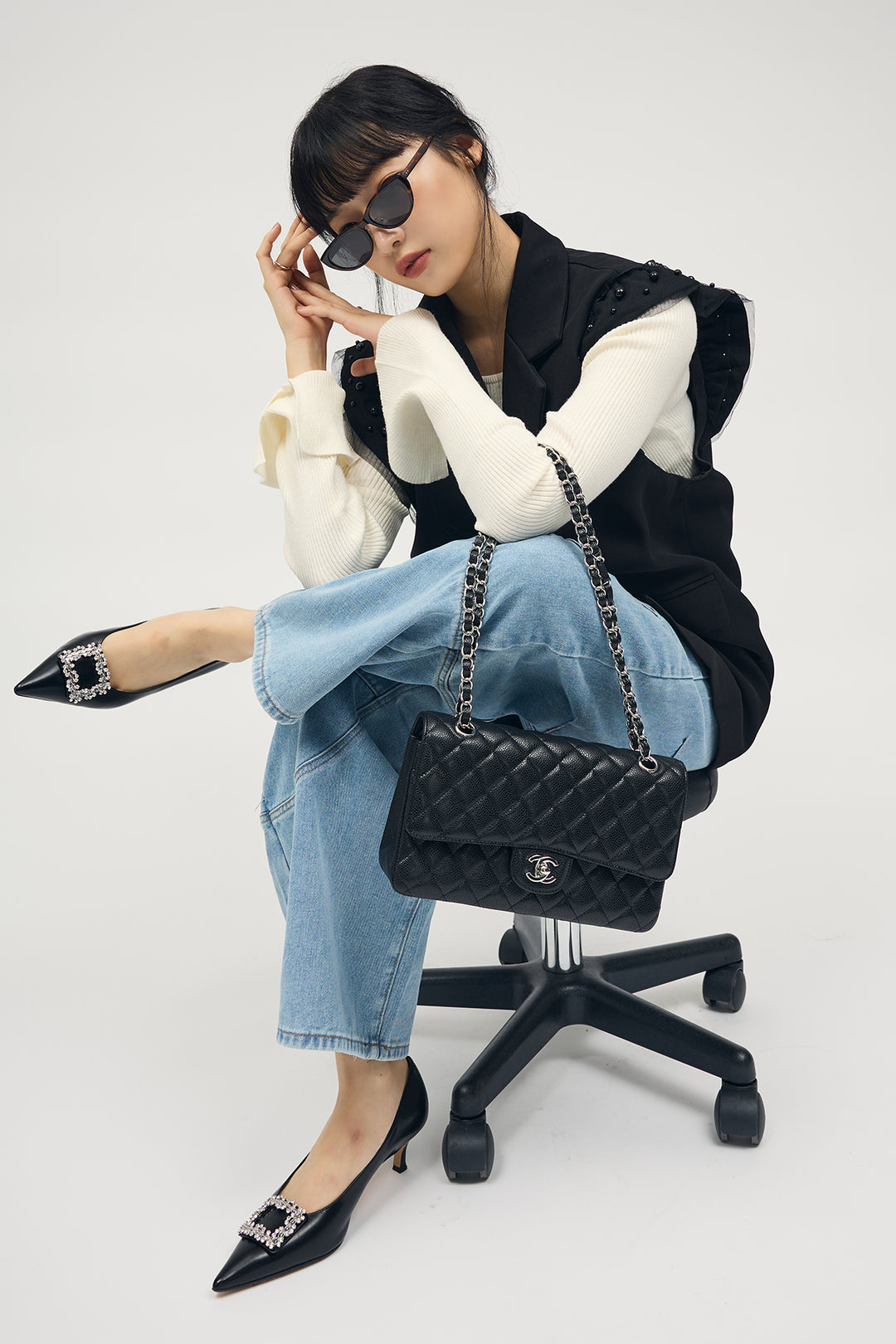 [予約/SET]フレアカフスボタン付きニット+パールフリルショルダーデザインベスト+ステッチ美ラインカーブデニムパンツ(3set)