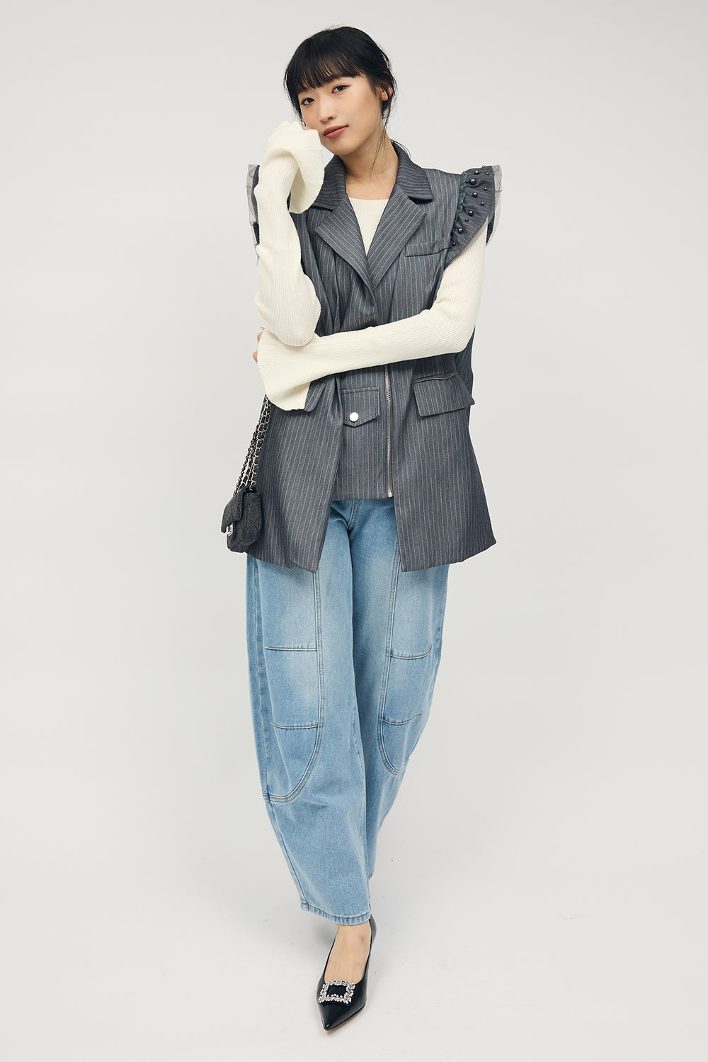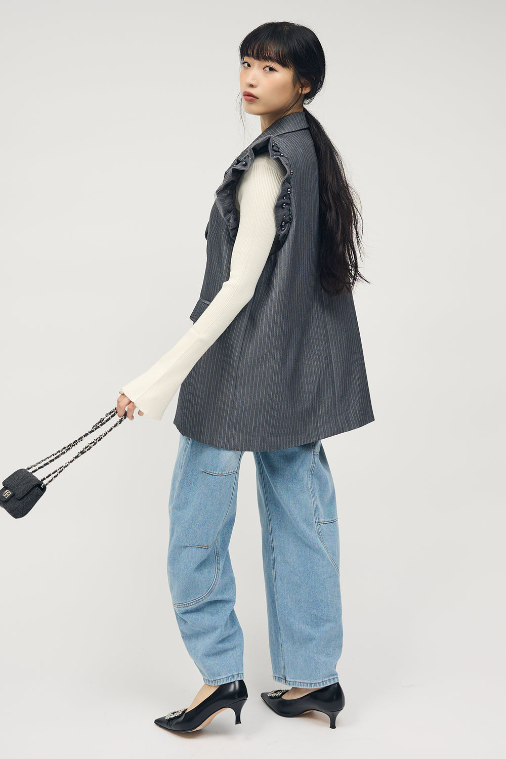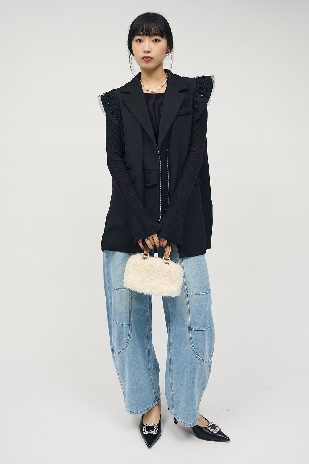 [予約/SET]パールフリルショルダーデザインベスト+ステッチ美ラインカーブデニムパンツ(2set)