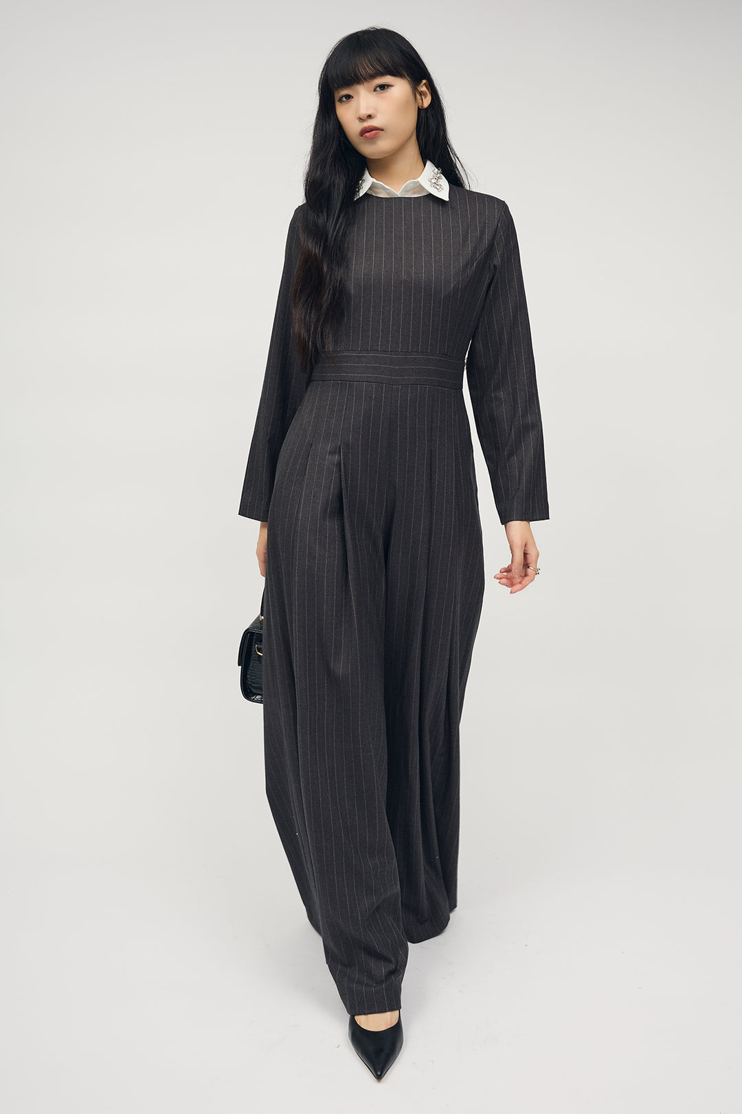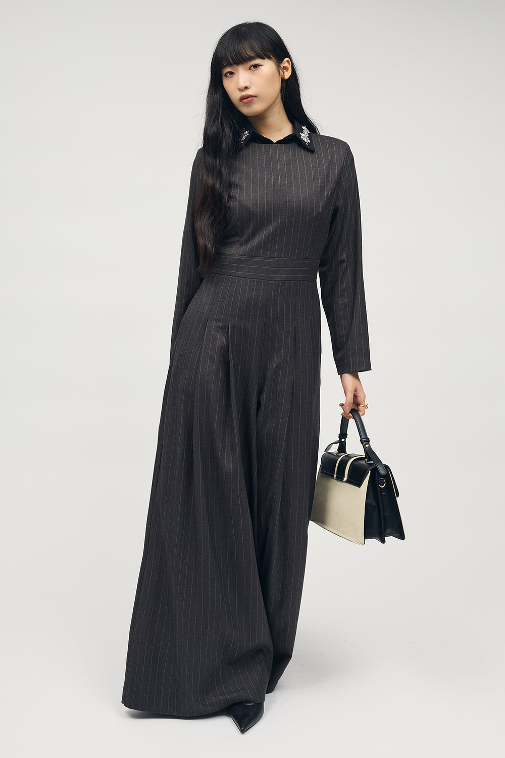 [予約/SET]ビジュー付け襟+ストライプ美ラインシルエットロンパース(2set)