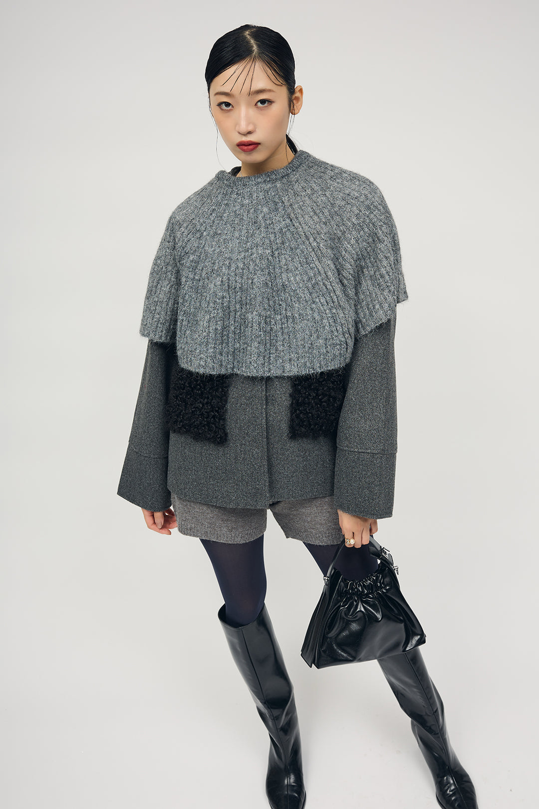 [予約/SET]ボアポケットノーカラーコート+ウールタッチケープ2wayニット(2set)