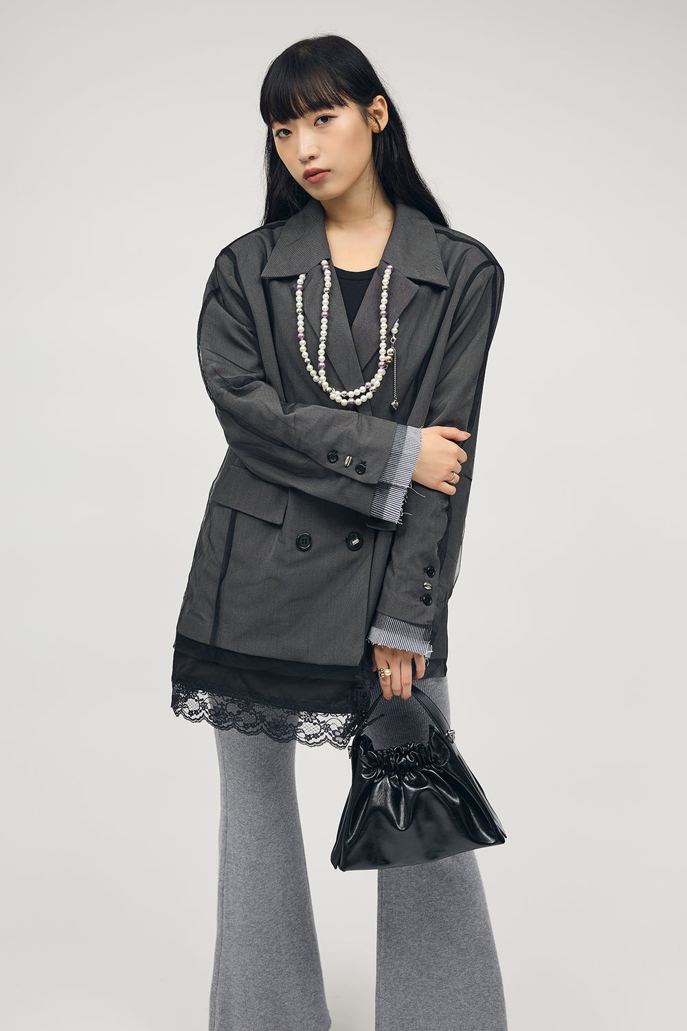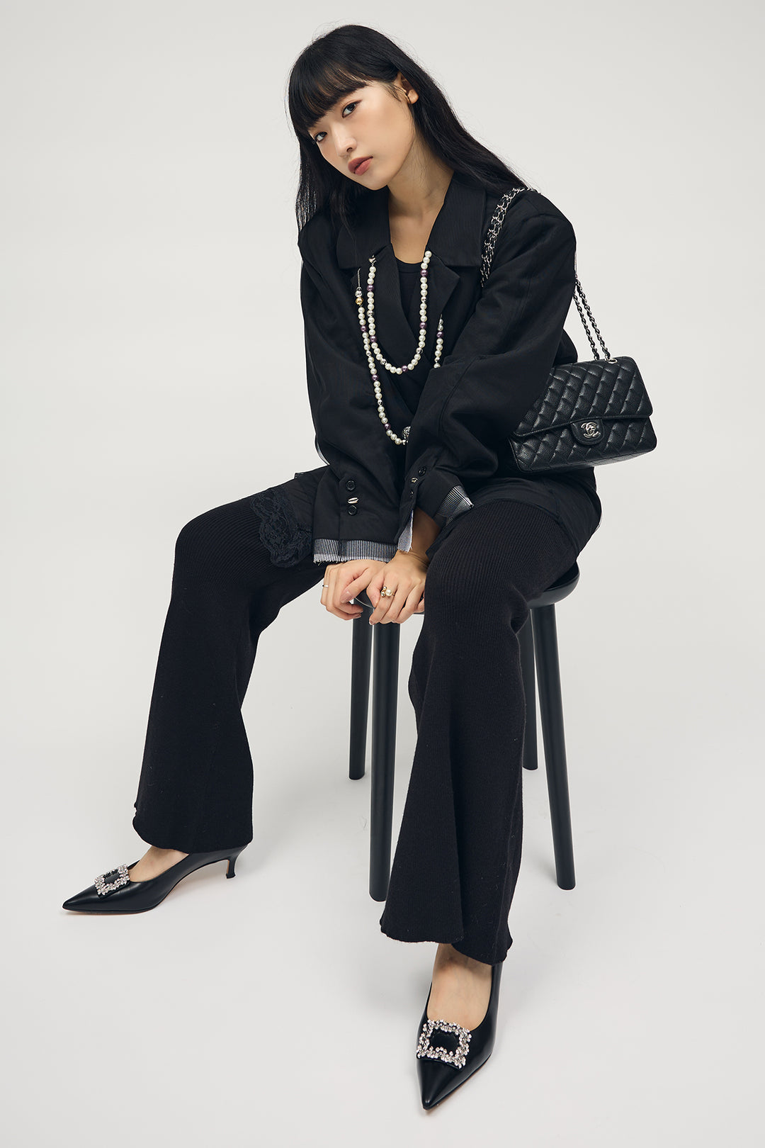 [予約/SET]パールネックレスセットチュールレイヤードジャケット+リブストレッチフレアニットパンツ(2set)