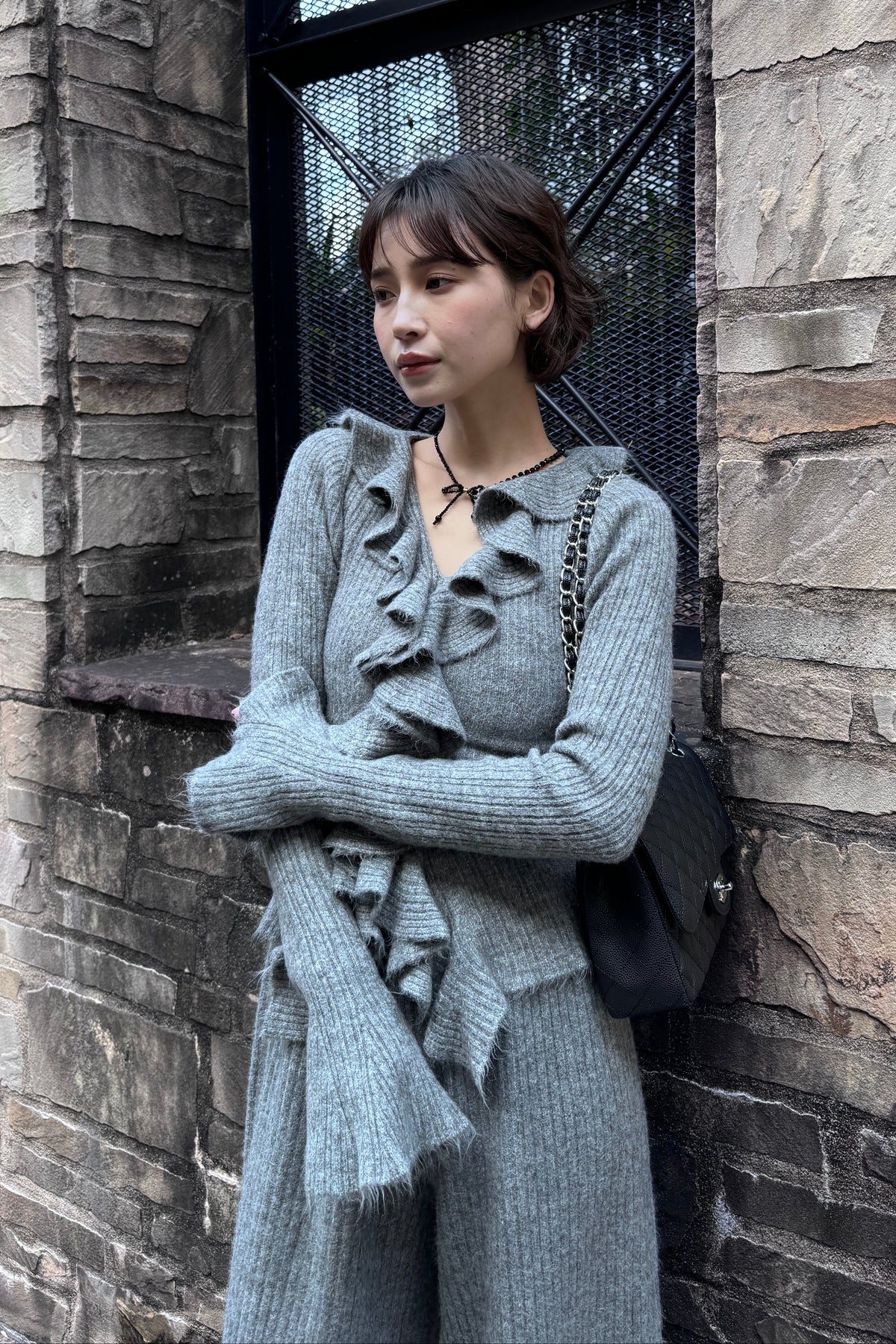 フロントにあしらわれた立体的なフリルが、華やかなアクセントになるニットセットアップ。 縦のラインを強調するリブ編みとセンターフリルの相乗効果で、着るだけですっきりとした縦長シルエットを叶えます。 袖口に向かって広がるベルスリーブや、デコルテを美しく見せるVネックなど、女性らしさを引き立てるディテールも満載。 リラックス感のあるワイドパンツとのセットで、大人の余裕を感じさせるエレガントなリラックススタイルが完成します。