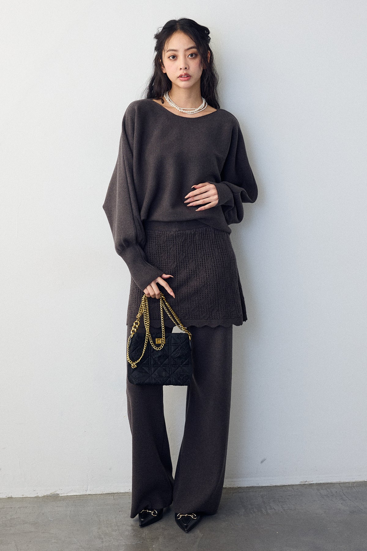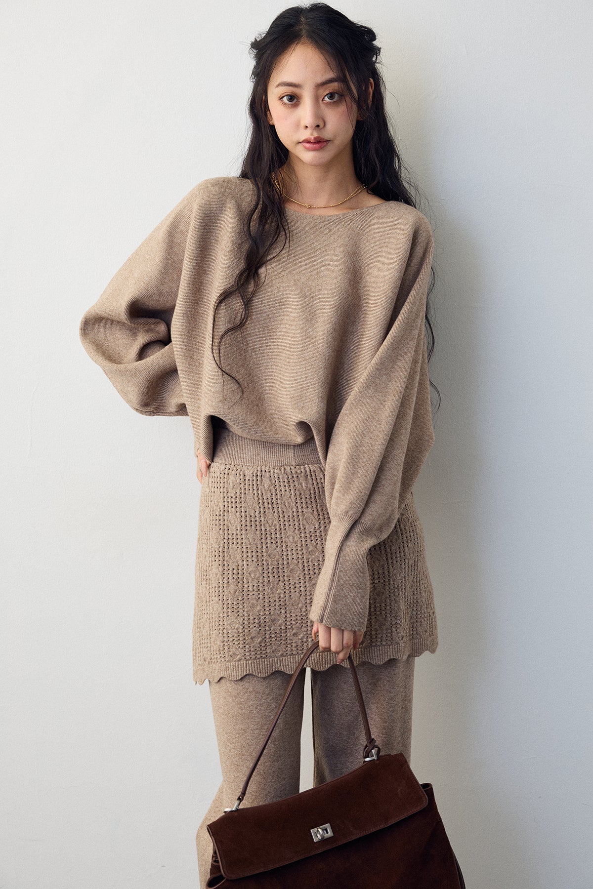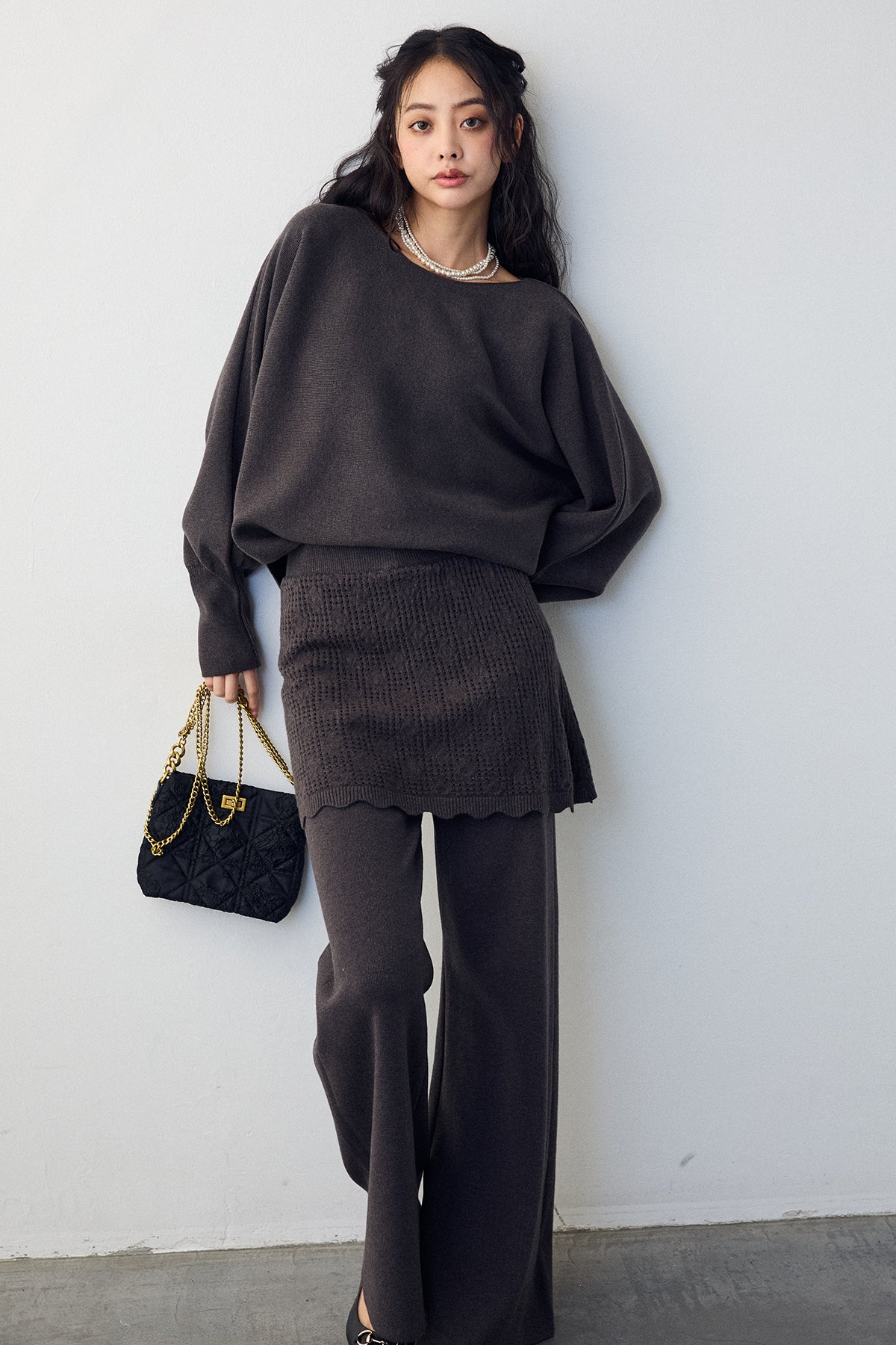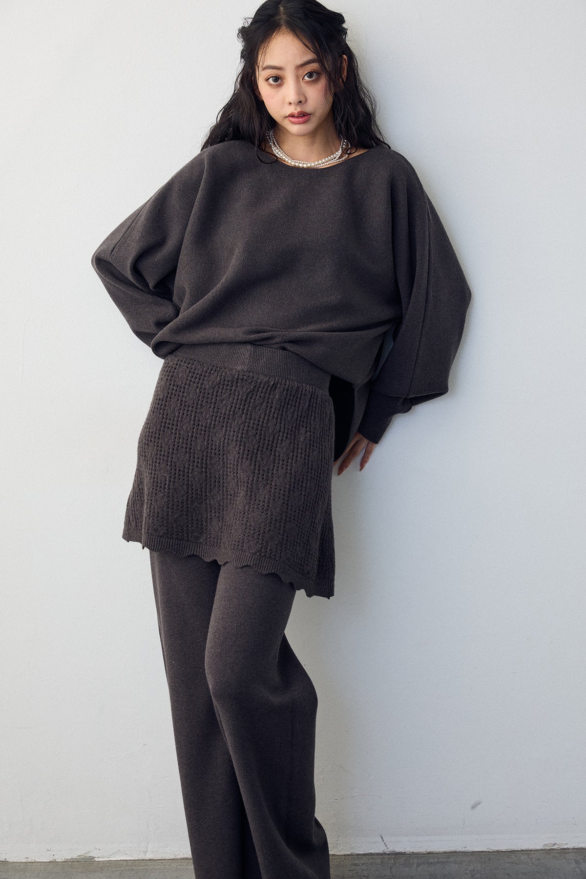 大人の抜け感と可憐なディテールが調和した、スカートレイヤードニットセットアップ。 ゆったりとしたドルマンスリーブのトップス、表情豊かな透かし編みのミニスカート、そしてリラクシーなワイドパンツが、感度の高いワントーンスタイルを完成させます。 特に目を惹くのは、スカート裾にあしらわれたスカラップデザイン。 甘くなりすぎない大人の愛らしさを添えつつ、異なる編み地のコントラストが装いに奥行きをもたらします。 セットで着るだけで旬なレイヤードバランスが整い、リラックスした着心地と洗練された佇まいを同時に叶える一着です。