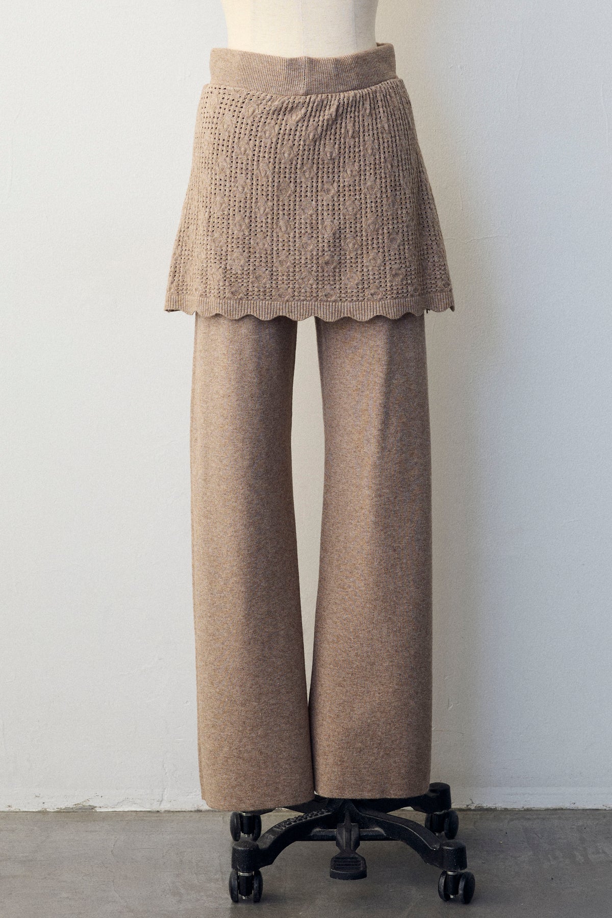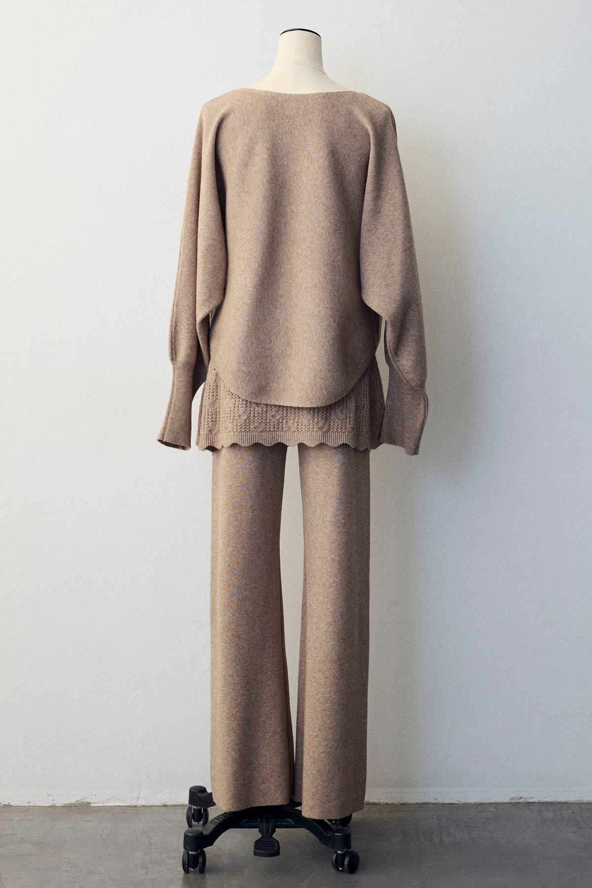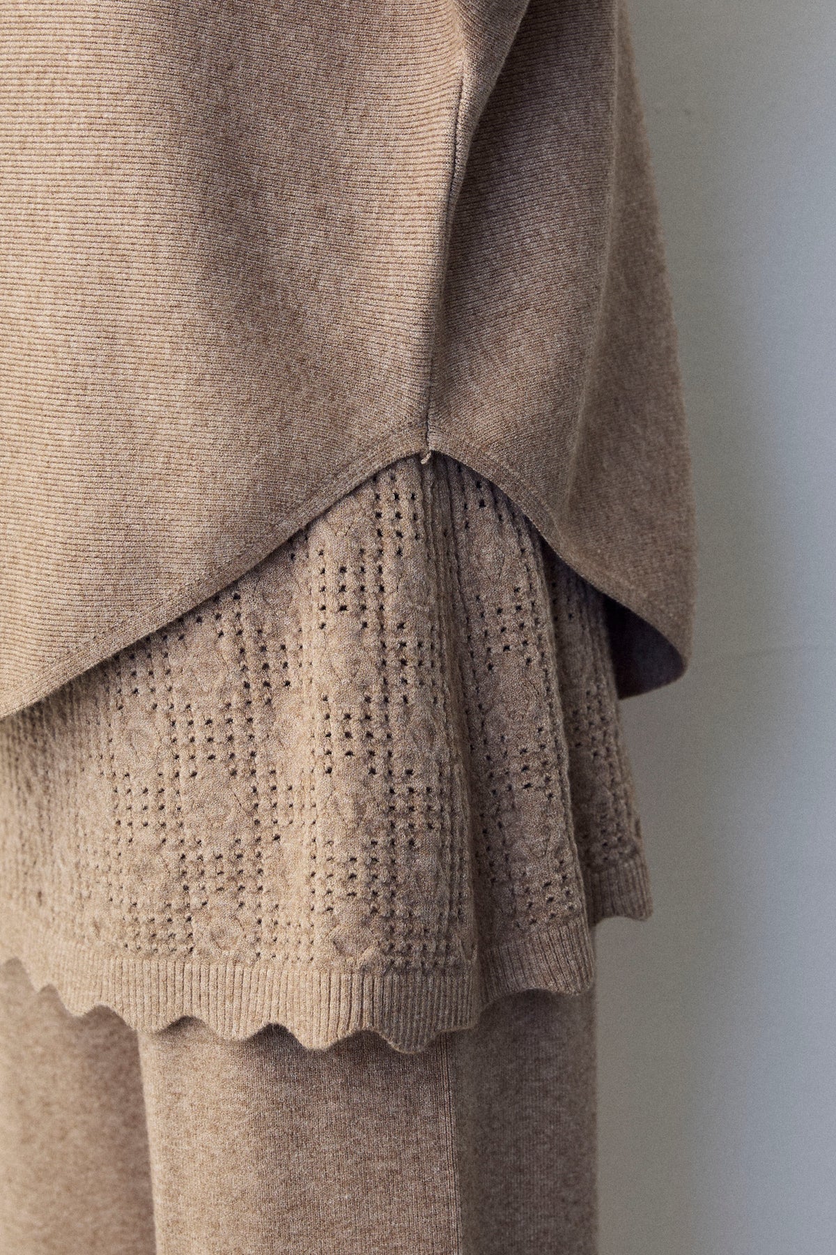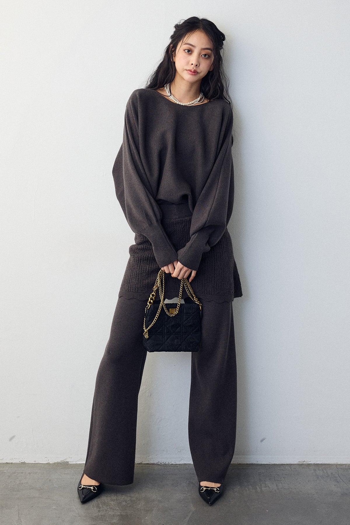 大人の抜け感と可憐なディテールが調和した、スカートレイヤードニットセットアップ。 ゆったりとしたドルマンスリーブのトップス、表情豊かな透かし編みのミニスカート、そしてリラクシーなワイドパンツが、感度の高いワントーンスタイルを完成させます。 特に目を惹くのは、スカート裾にあしらわれたスカラップデザイン。 甘くなりすぎない大人の愛らしさを添えつつ、異なる編み地のコントラストが装いに奥行きをもたらします。 セットで着るだけで旬なレイヤードバランスが整い、リラックスした着心地と洗練された佇まいを同時に叶える一着です。