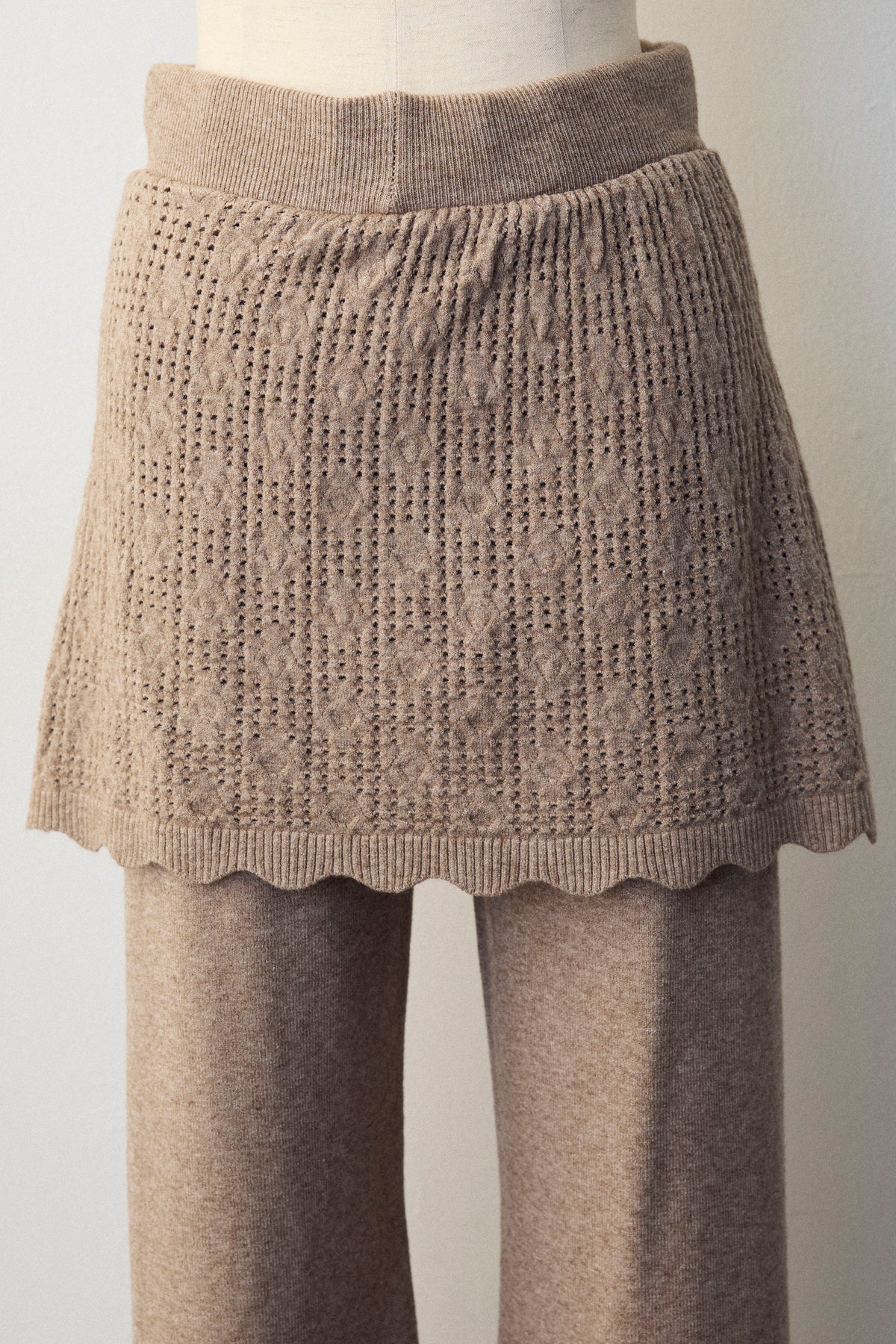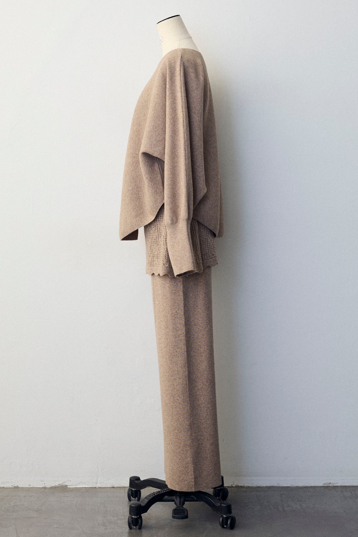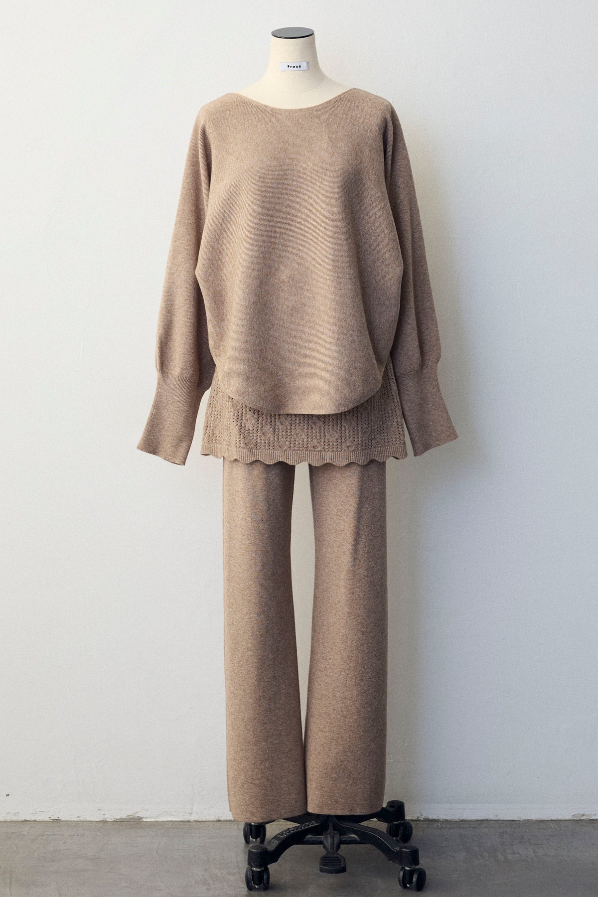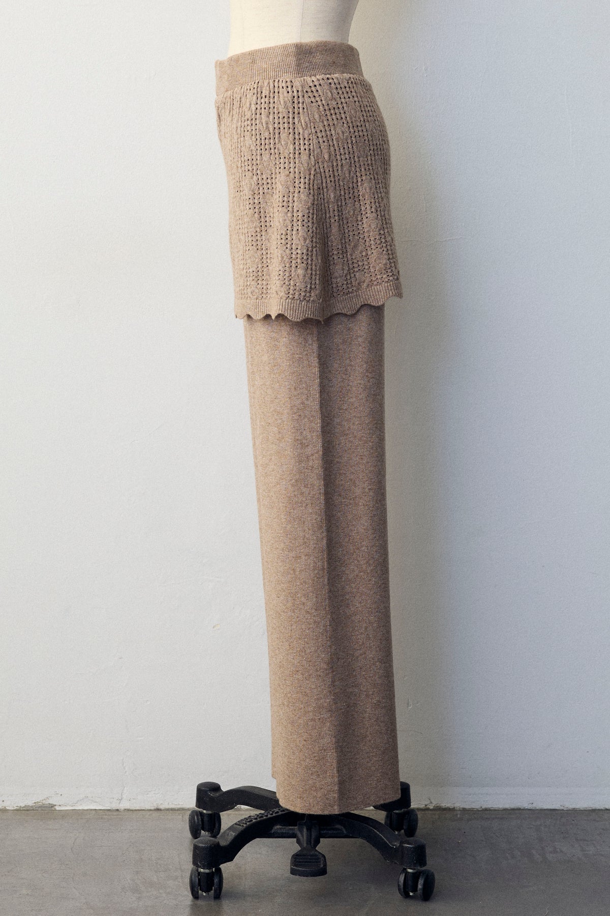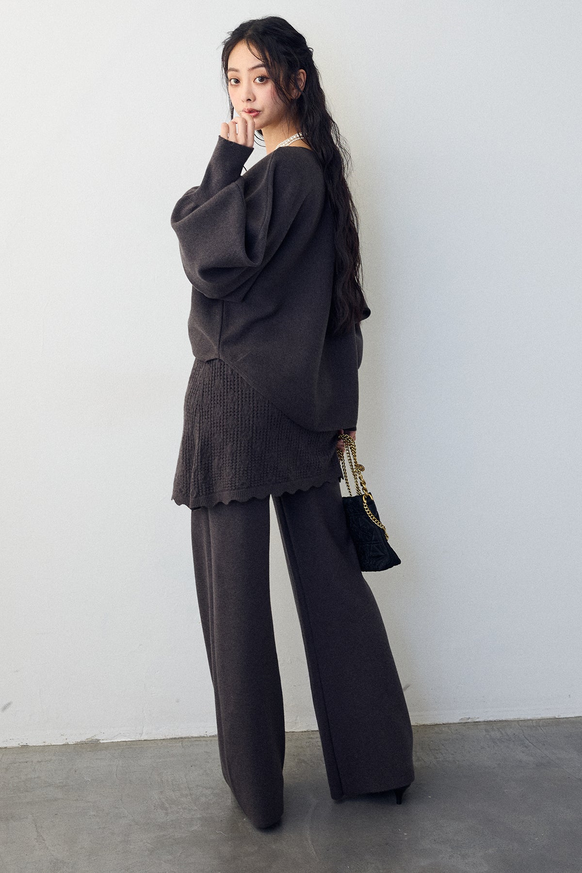 大人の抜け感と可憐なディテールが調和した、スカートレイヤードニットセットアップ。 ゆったりとしたドルマンスリーブのトップス、表情豊かな透かし編みのミニスカート、そしてリラクシーなワイドパンツが、感度の高いワントーンスタイルを完成させます。 特に目を惹くのは、スカート裾にあしらわれたスカラップデザイン。 甘くなりすぎない大人の愛らしさを添えつつ、異なる編み地のコントラストが装いに奥行きをもたらします。 セットで着るだけで旬なレイヤードバランスが整い、リラックスした着心地と洗練された佇まいを同時に叶える一着です。