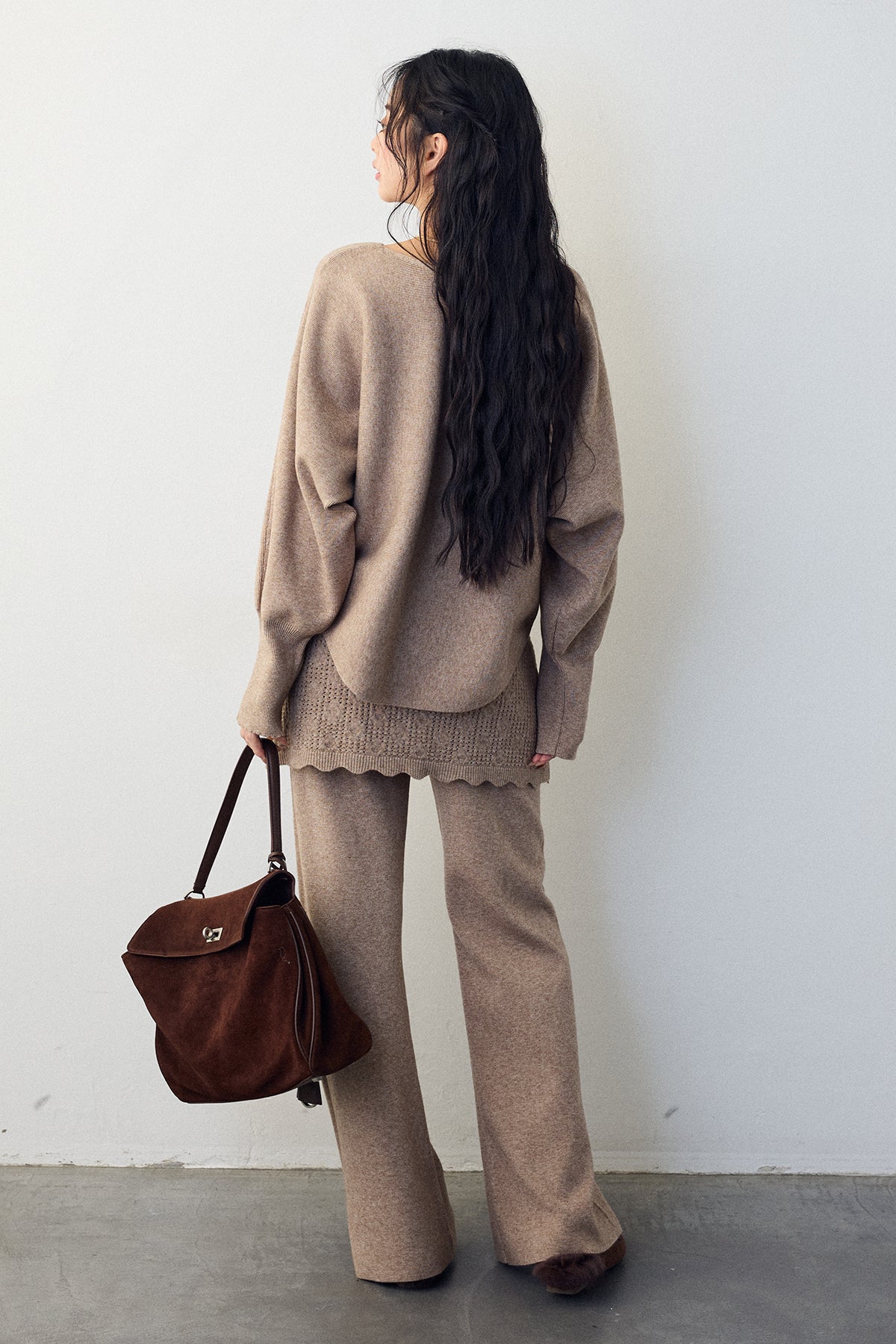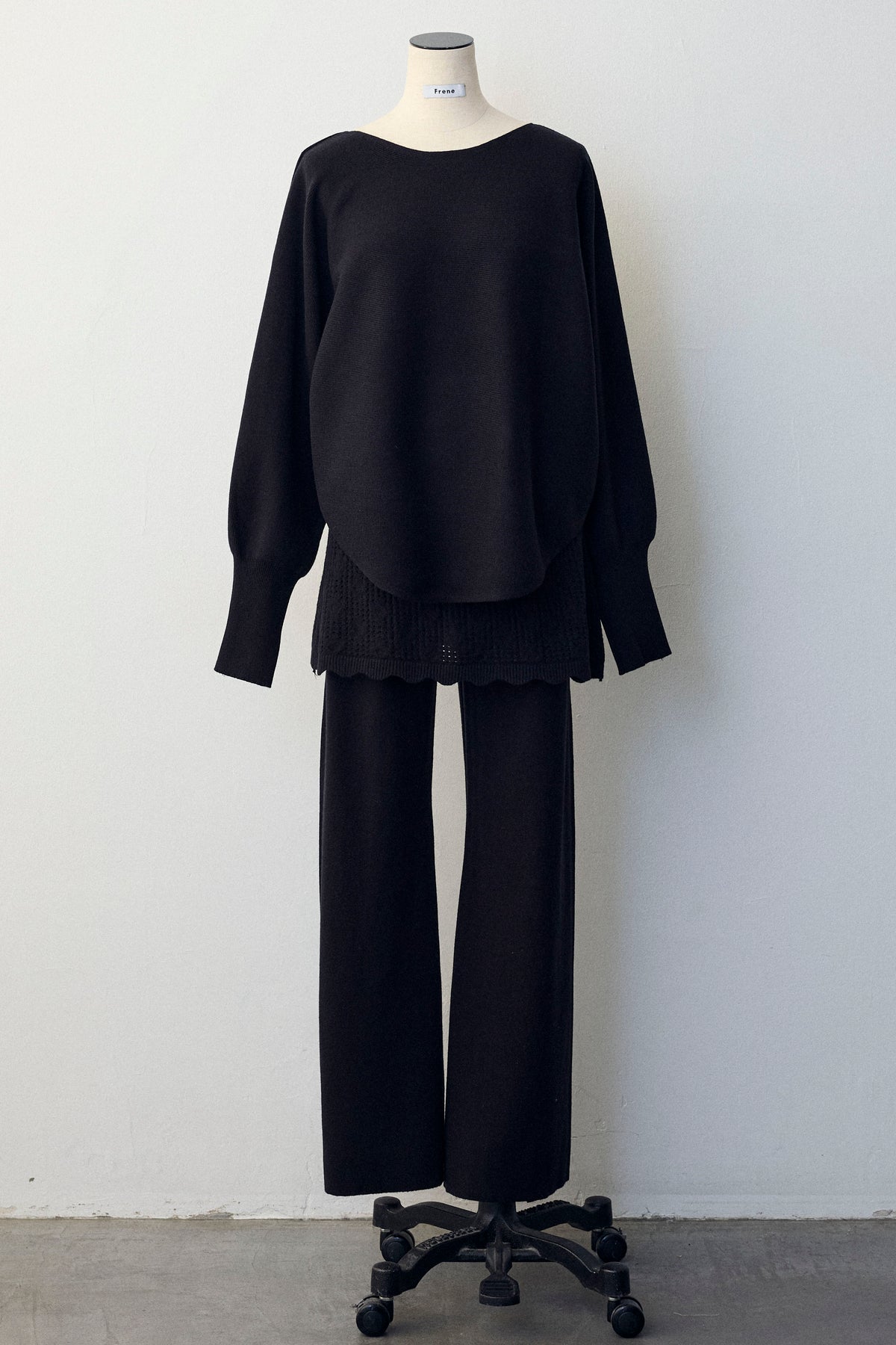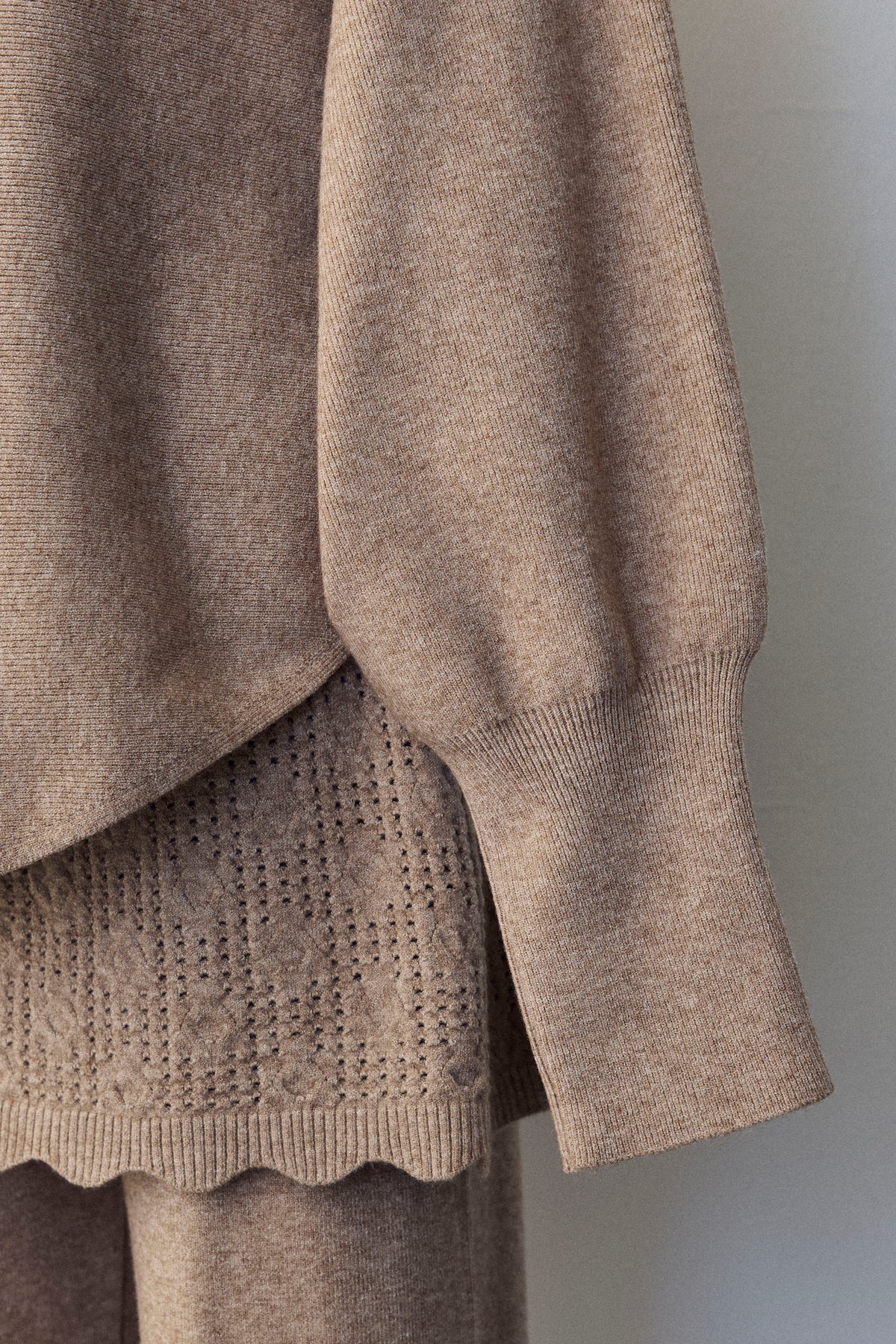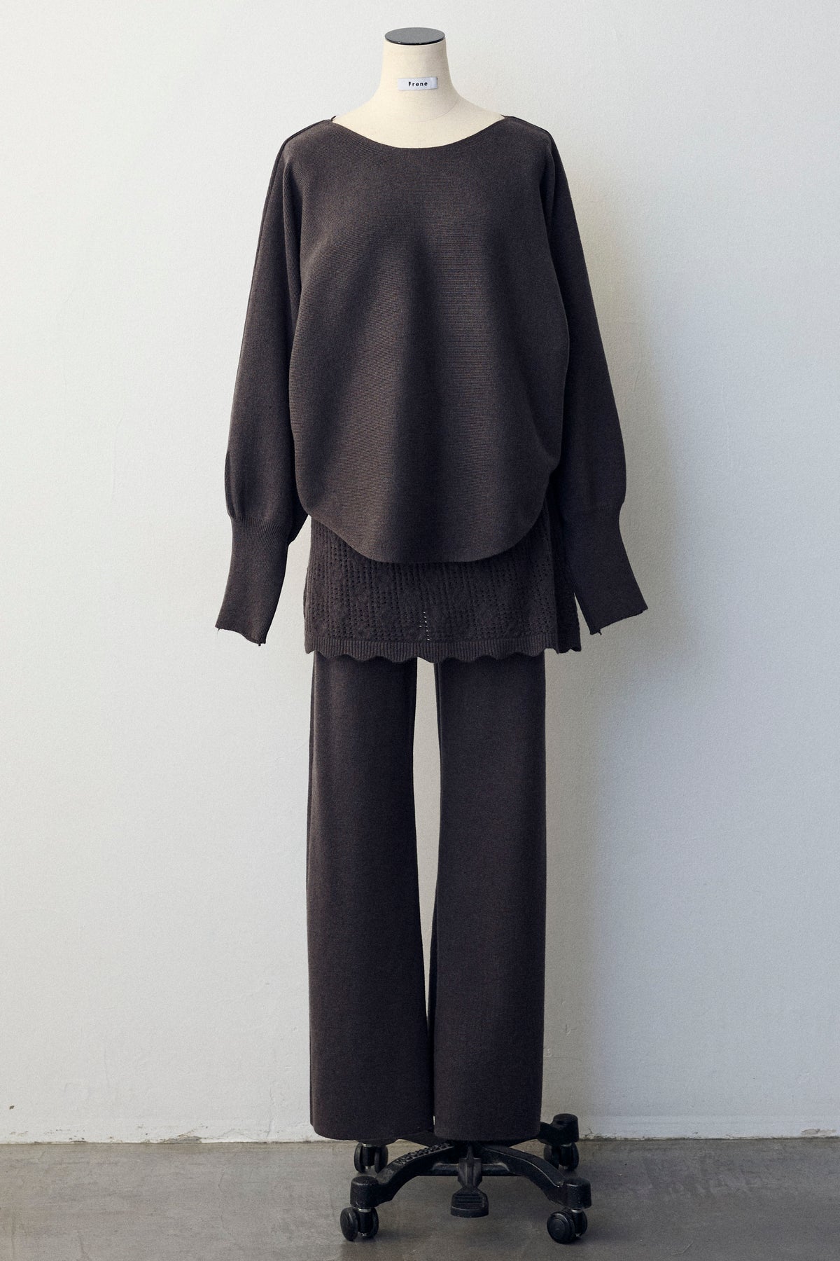 大人の抜け感と可憐なディテールが調和した、スカートレイヤードニットセットアップ。 ゆったりとしたドルマンスリーブのトップス、表情豊かな透かし編みのミニスカート、そしてリラクシーなワイドパンツが、感度の高いワントーンスタイルを完成させます。 特に目を惹くのは、スカート裾にあしらわれたスカラップデザイン。 甘くなりすぎない大人の愛らしさを添えつつ、異なる編み地のコントラストが装いに奥行きをもたらします。 セットで着るだけで旬なレイヤードバランスが整い、リラックスした着心地と洗練された佇まいを同時に叶える一着です。
