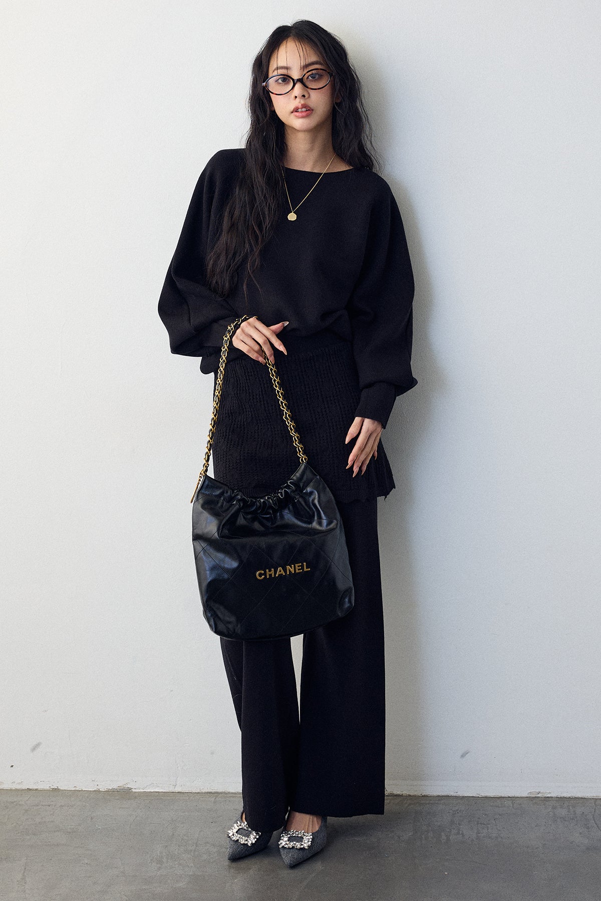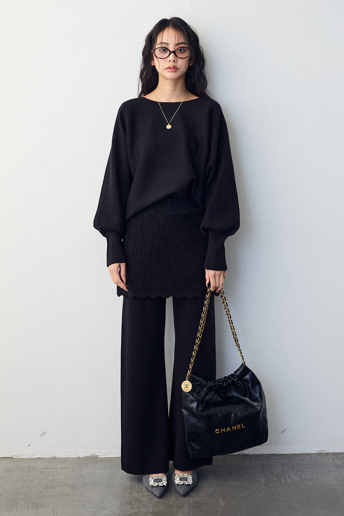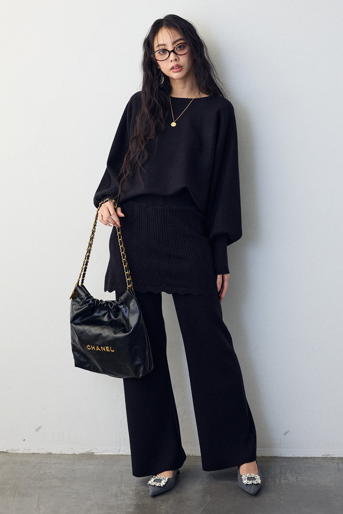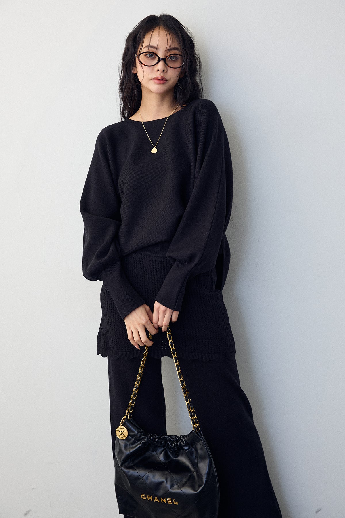 大人の抜け感と可憐なディテールが調和した、スカートレイヤードニットセットアップ。 ゆったりとしたドルマンスリーブのトップス、表情豊かな透かし編みのミニスカート、そしてリラクシーなワイドパンツが、感度の高いワントーンスタイルを完成させます。 特に目を惹くのは、スカート裾にあしらわれたスカラップデザイン。 甘くなりすぎない大人の愛らしさを添えつつ、異なる編み地のコントラストが装いに奥行きをもたらします。 セットで着るだけで旬なレイヤードバランスが整い、リラックスした着心地と洗練された佇まいを同時に叶える一着です。