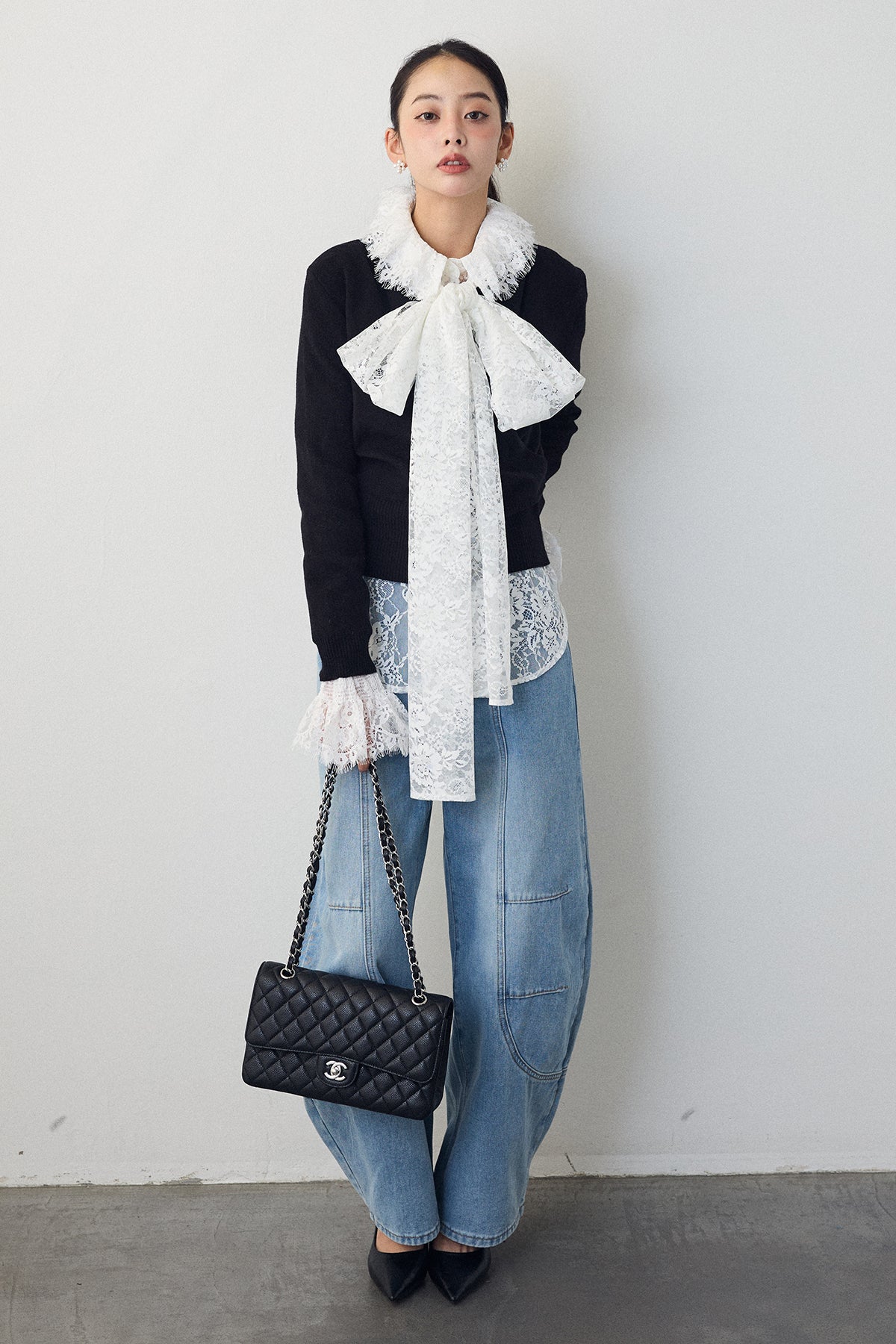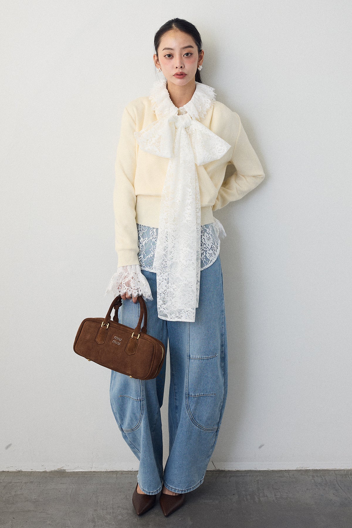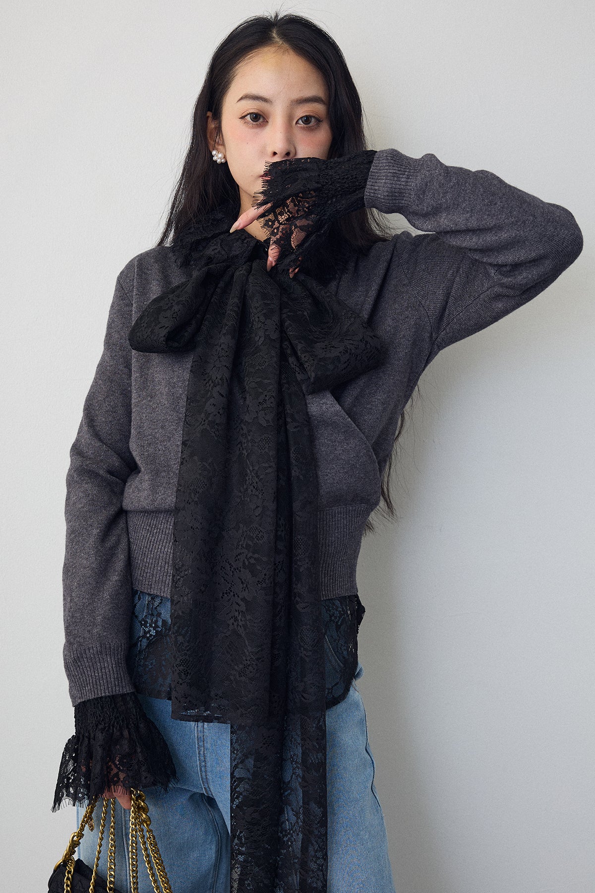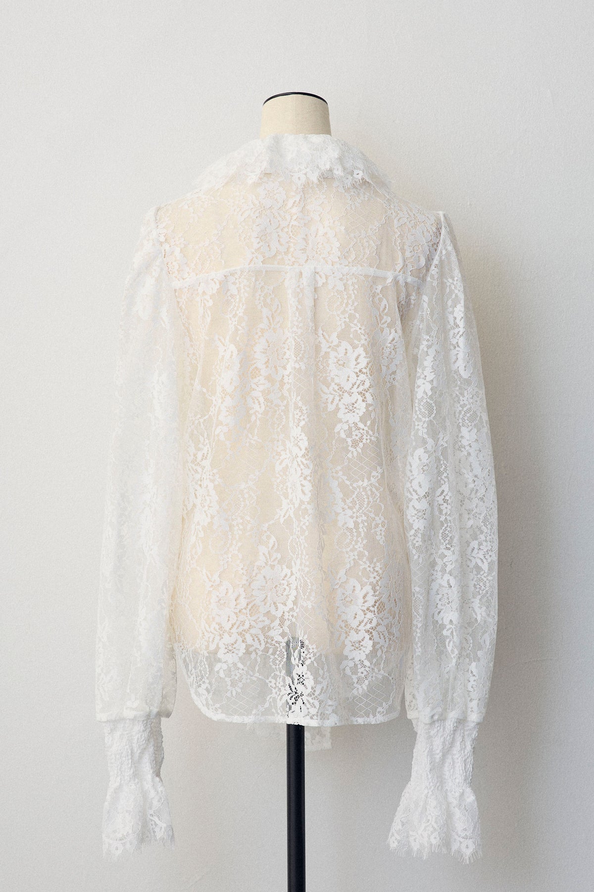 繊細なレースが華やかな印象を与えるクラシカルなブラウス。 大きめのボウタイが顔まわりを上品に彩り、襟と袖口のフリルがさらに女性らしさを添えます。 リボンをつけても可愛く、つけなくても首元のフリルが映える2wayデザイン。ニットやベストとのレイヤードにもおすすめです。