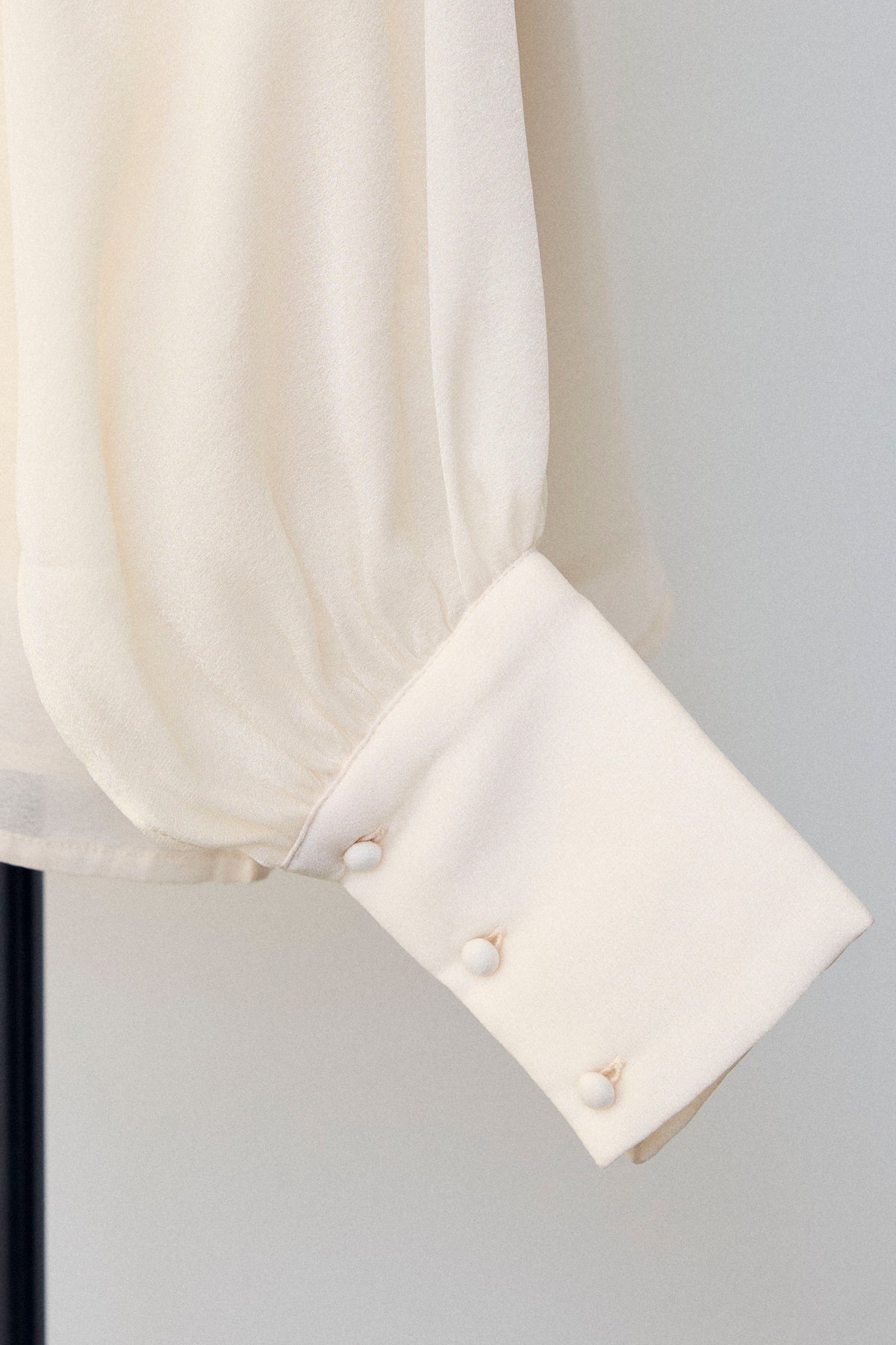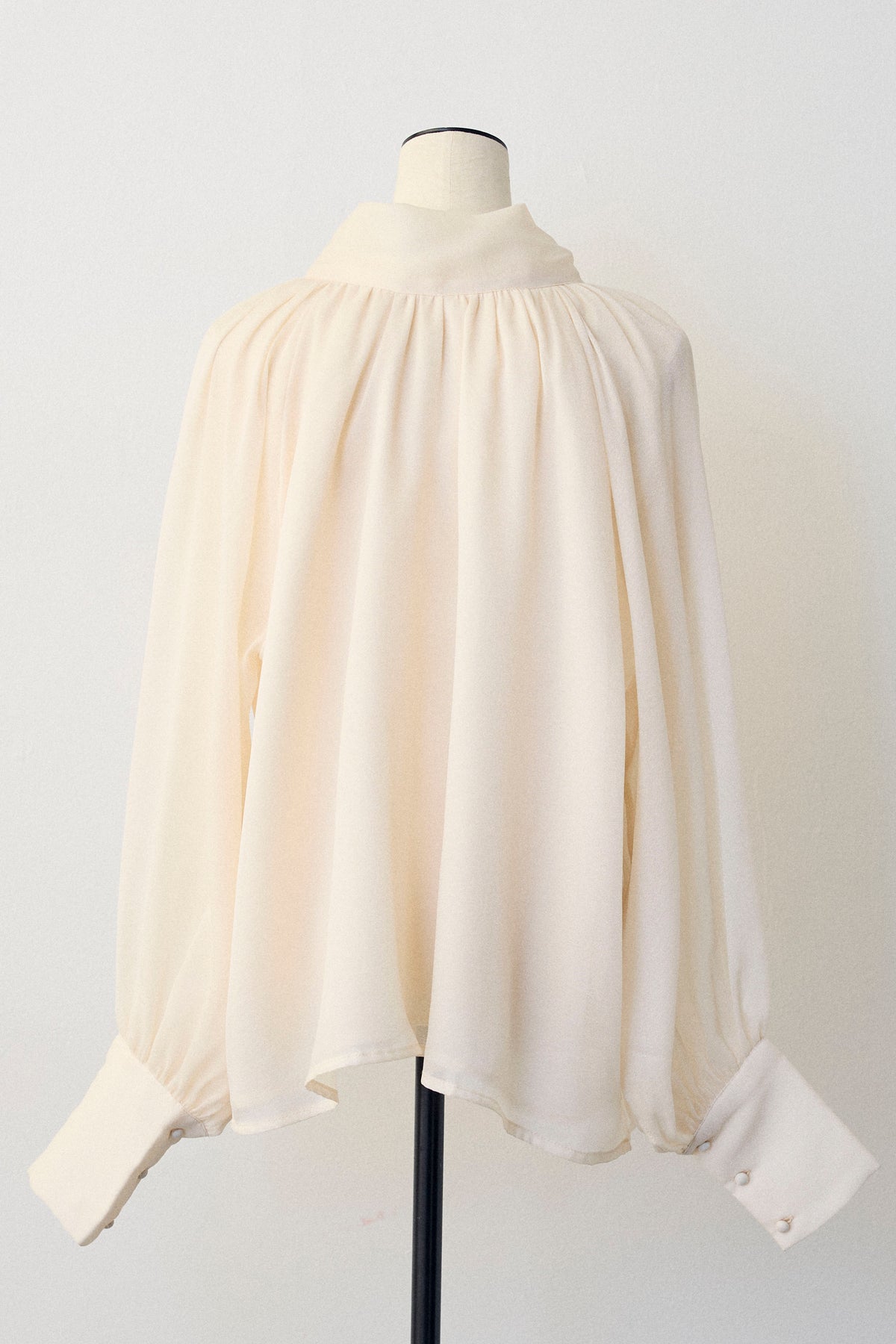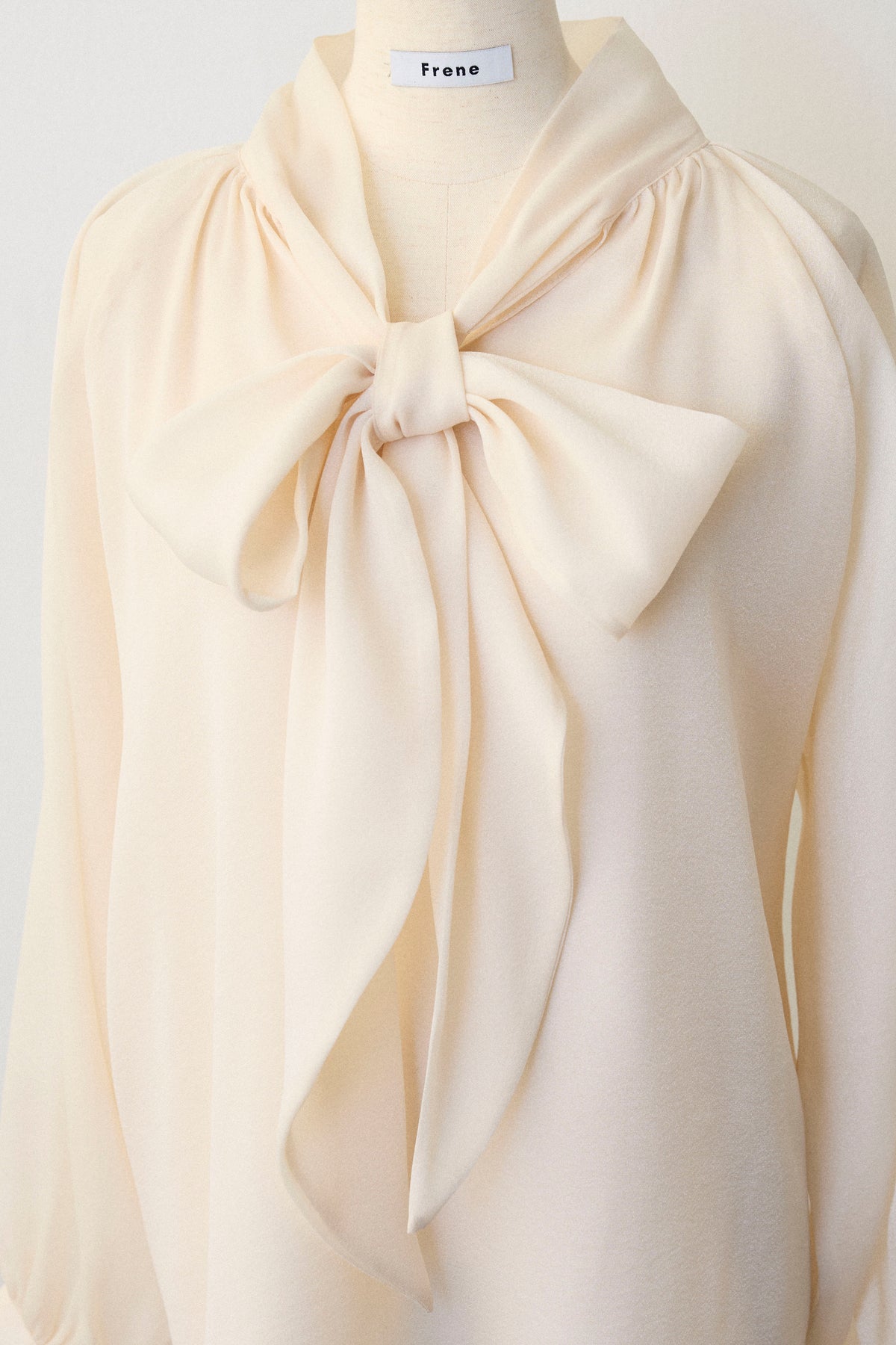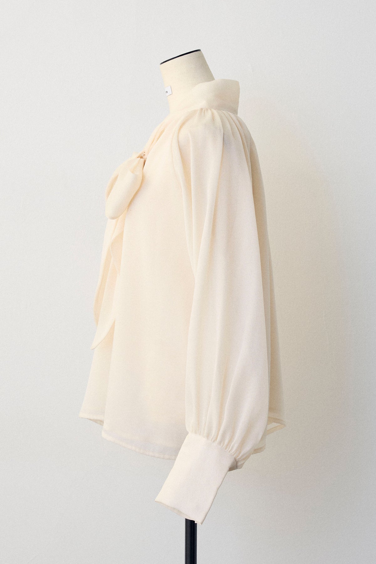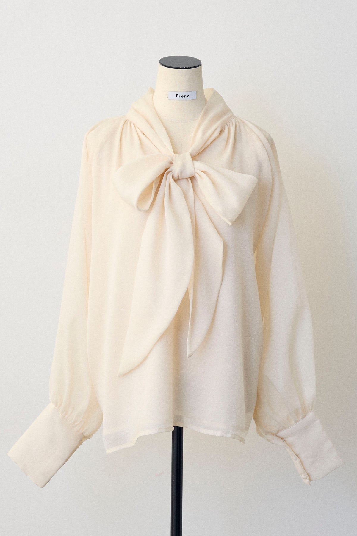 リボン付きシアーブラウスは、前後どちらでも着用できる2WAYデザインで、シーンに合わせたコーディネートが楽しめます。オフィススタイルには、きちんと感のあるリボンを前にしてエレガントにまとめたり、カジュアルなシーンでは後ろにリボンを結んでリラックス感を演出したりと、さまざまな表情を楽しむことができます。ボリュームのある袖が、上品なシルエットを引き立てつつ、スタイリングのアクセントにもなります。