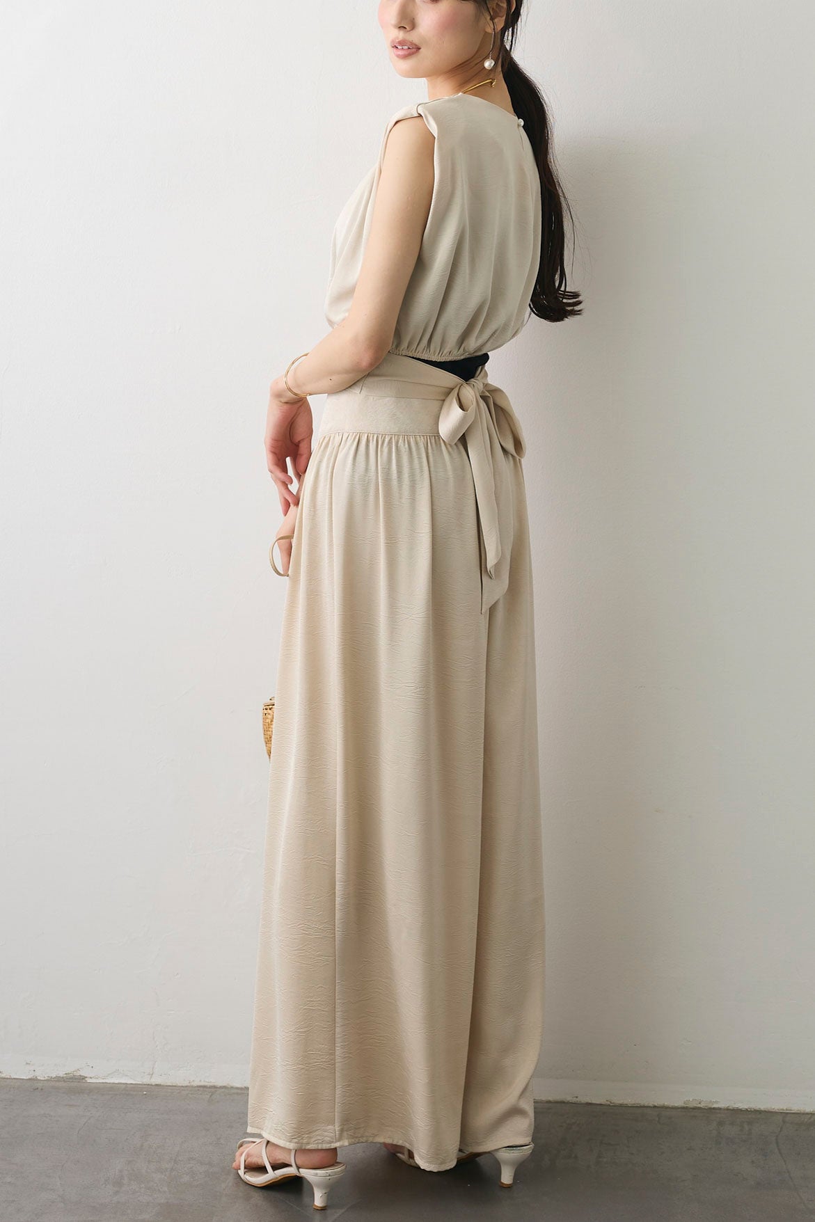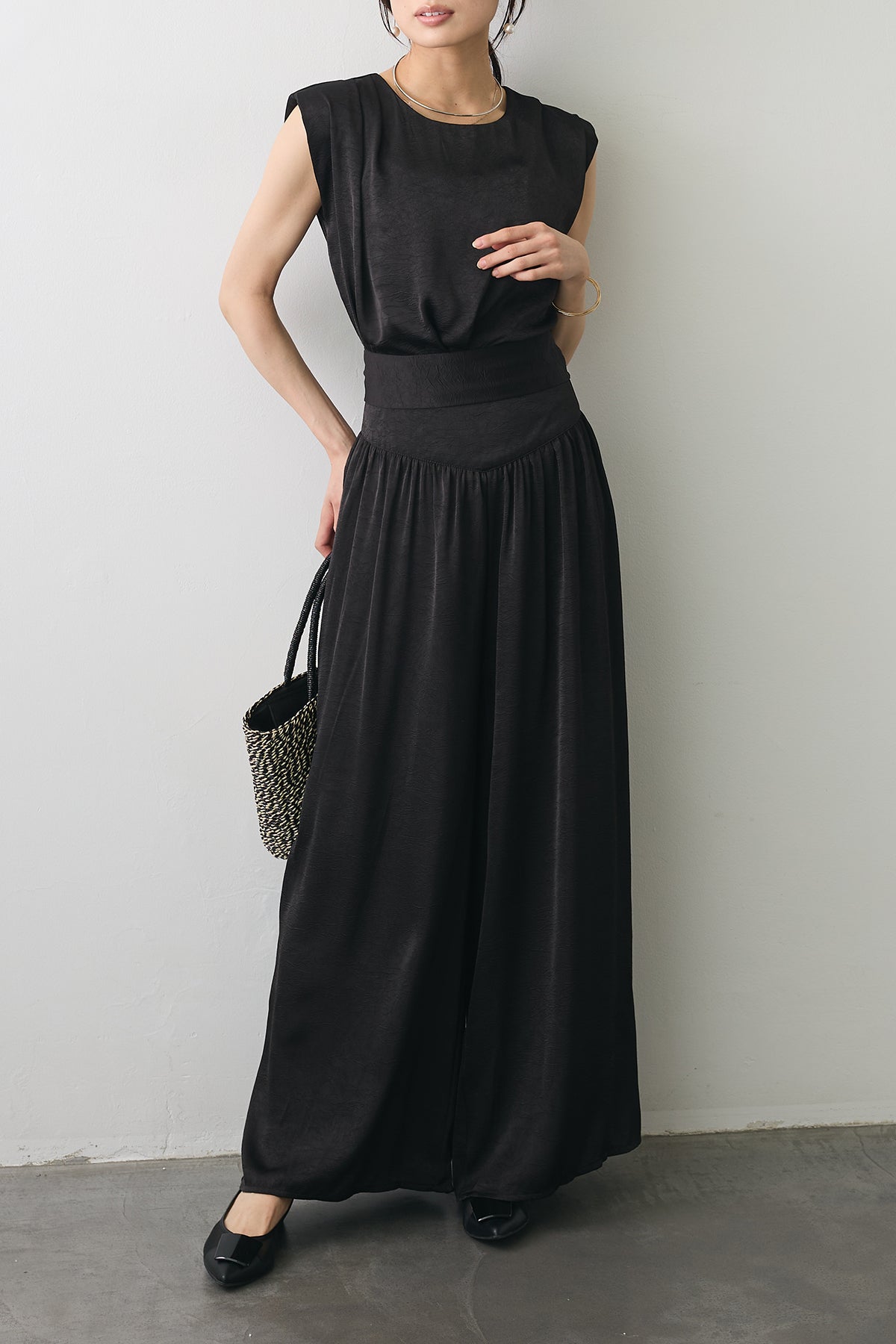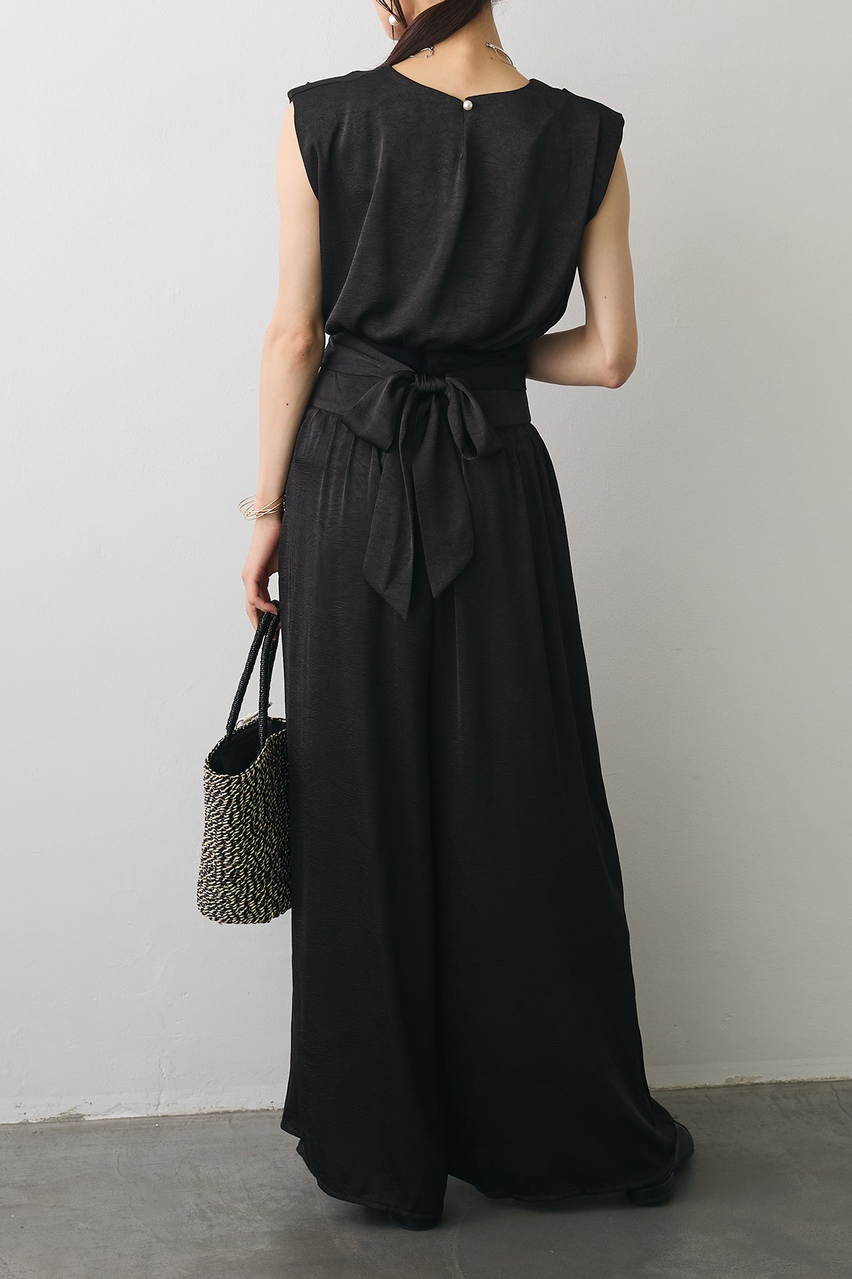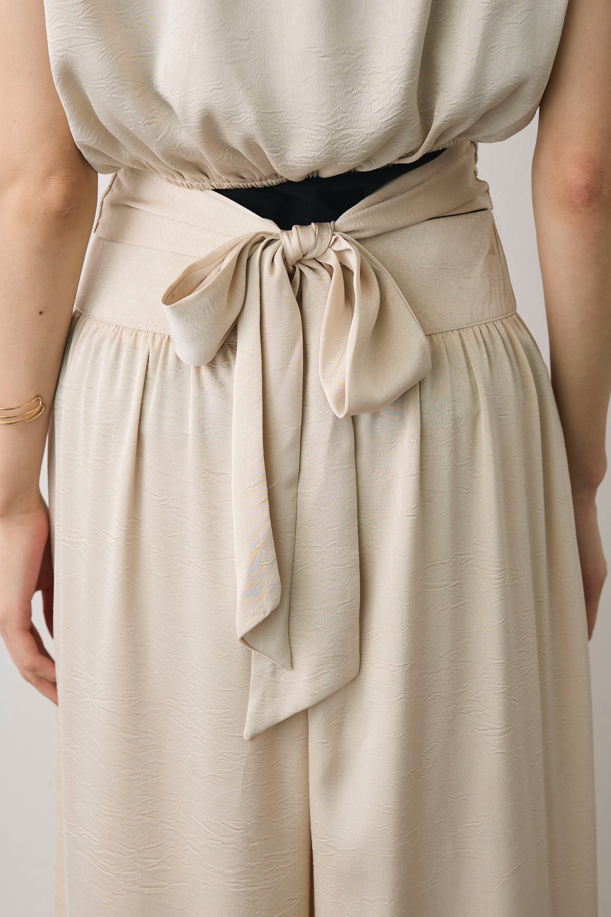 柔らかな光沢のマットサテンが上品なセットアップ。ウエストのワイドデザインがメリハリを演出し、後ろのリボンディテールでバックスタイルも印象的に。ドレープ感のある素材とワイドパンツで体型を拾わず、リラクシーながらも女性らしさを引き立てます。デイリーにもお出かけにもおすすめな一着です。