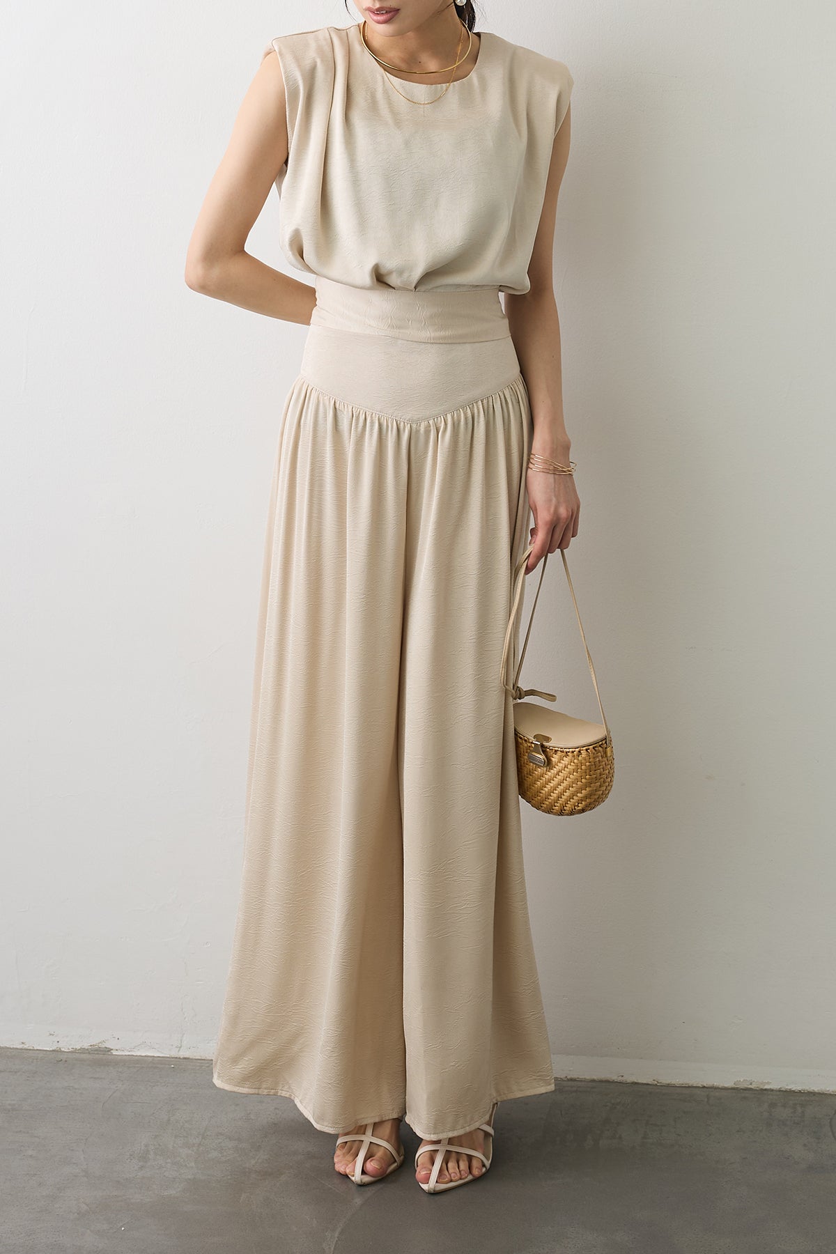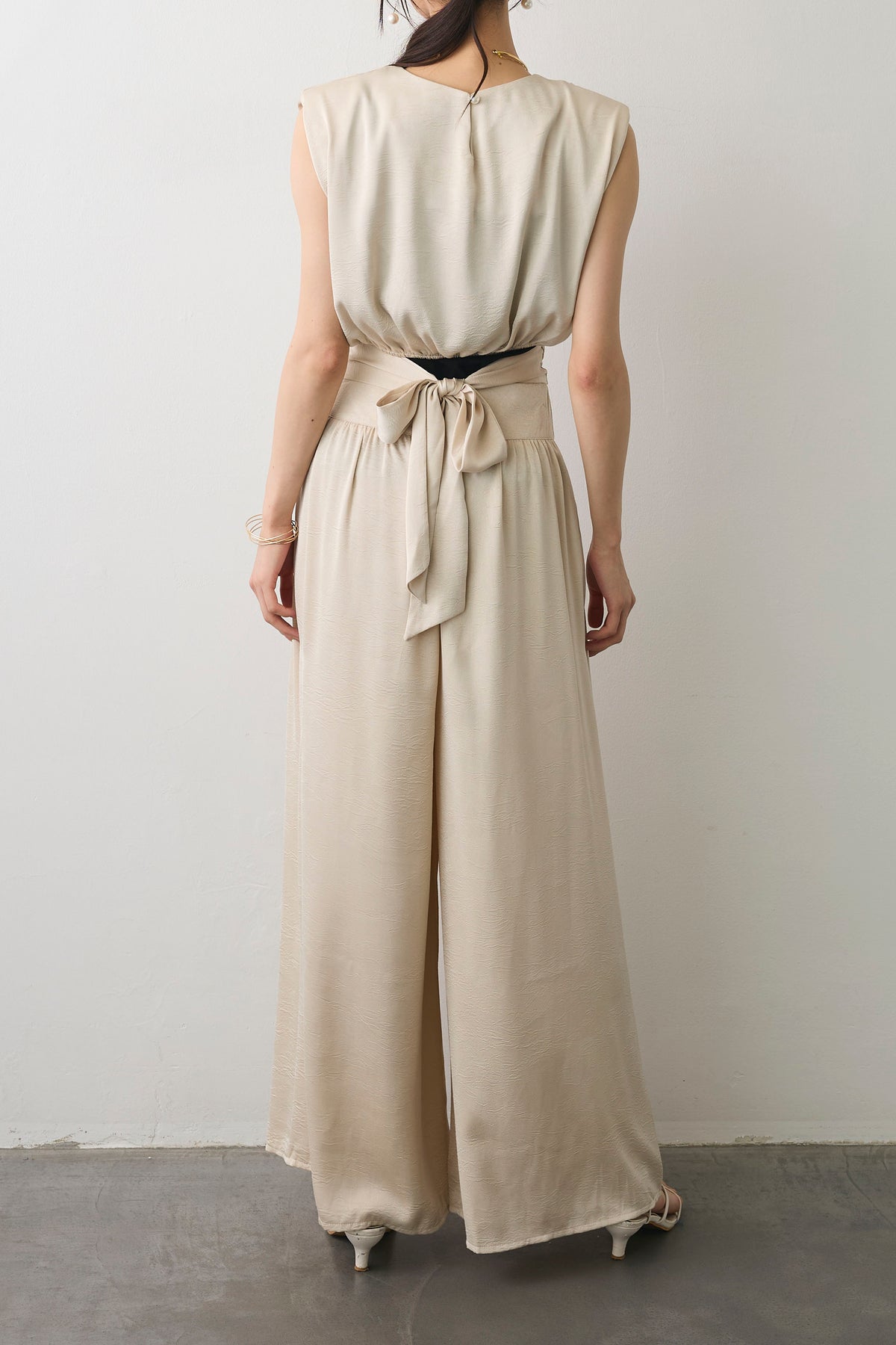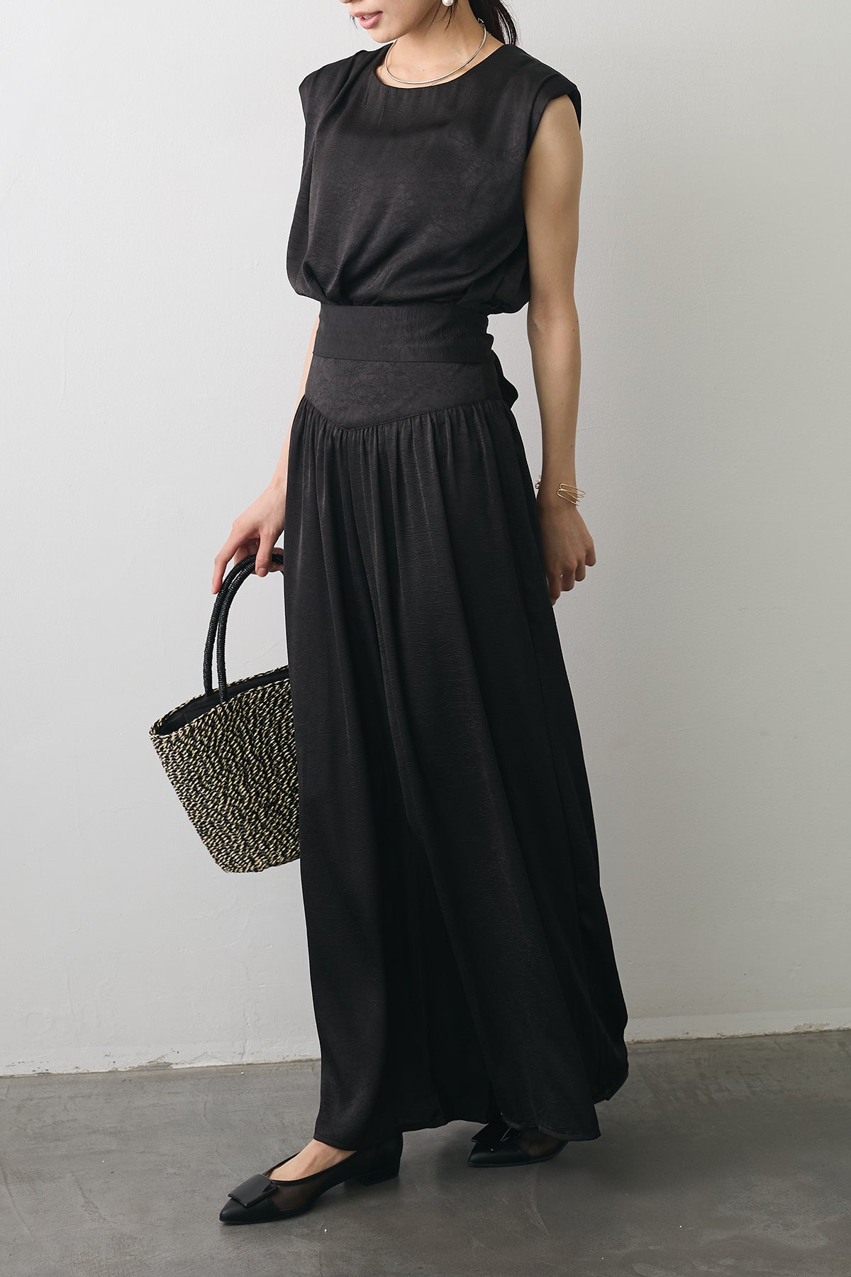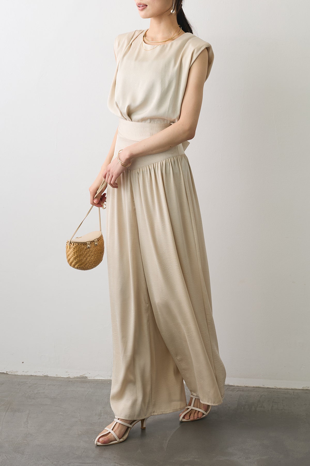 柔らかな光沢のマットサテンが上品なセットアップ。ウエストのワイドデザインがメリハリを演出し、後ろのリボンディテールでバックスタイルも印象的に。ドレープ感のある素材とワイドパンツで体型を拾わず、リラクシーながらも女性らしさを引き立てます。デイリーにもお出かけにもおすすめな一着です。
