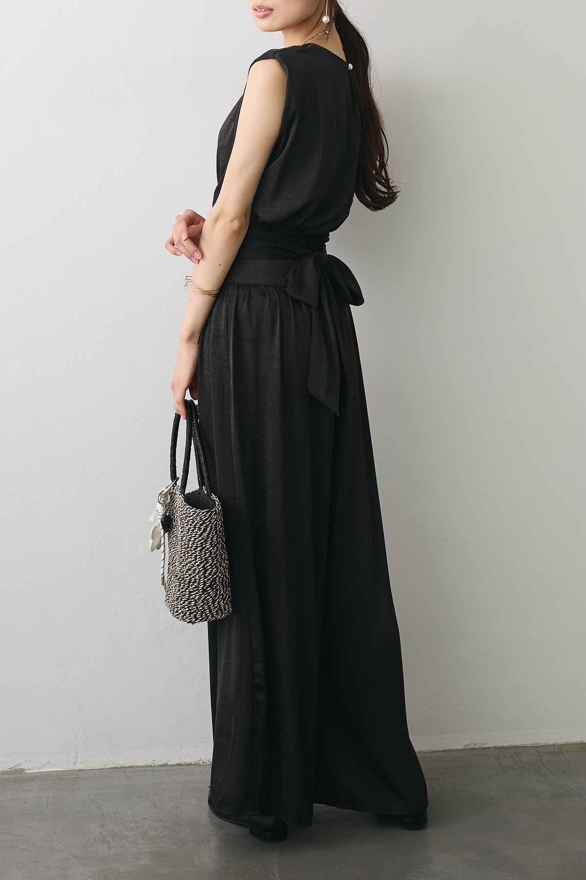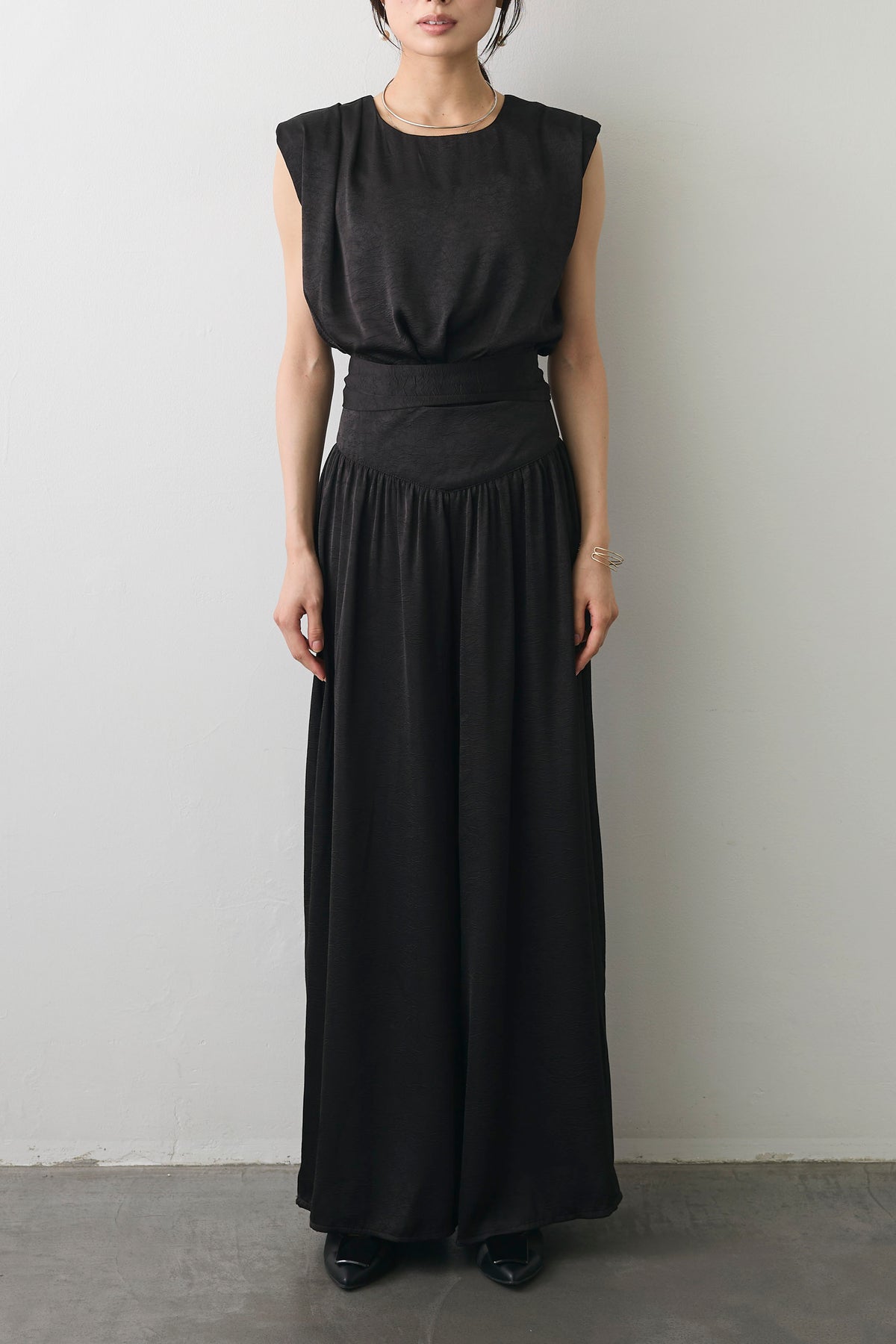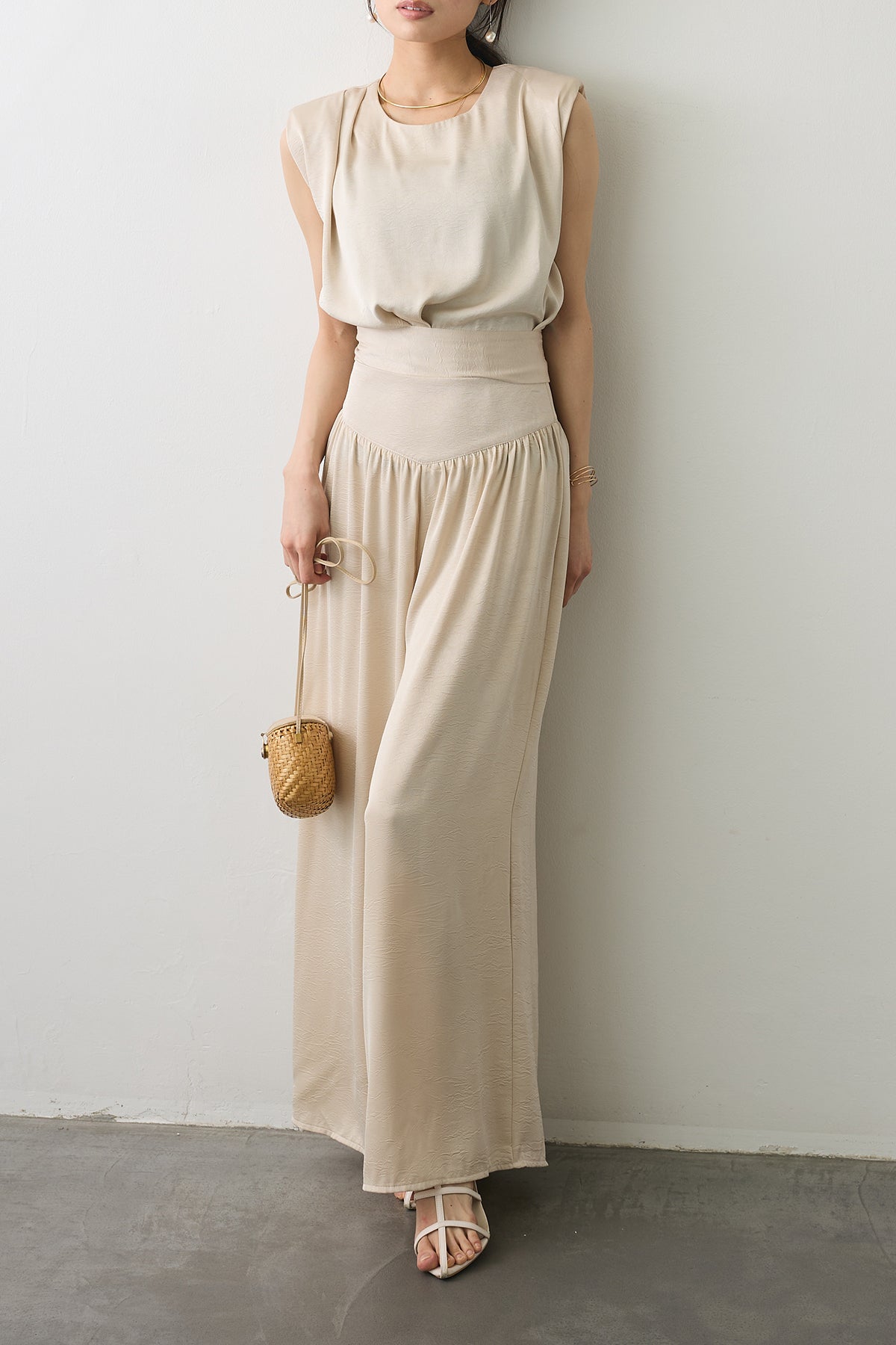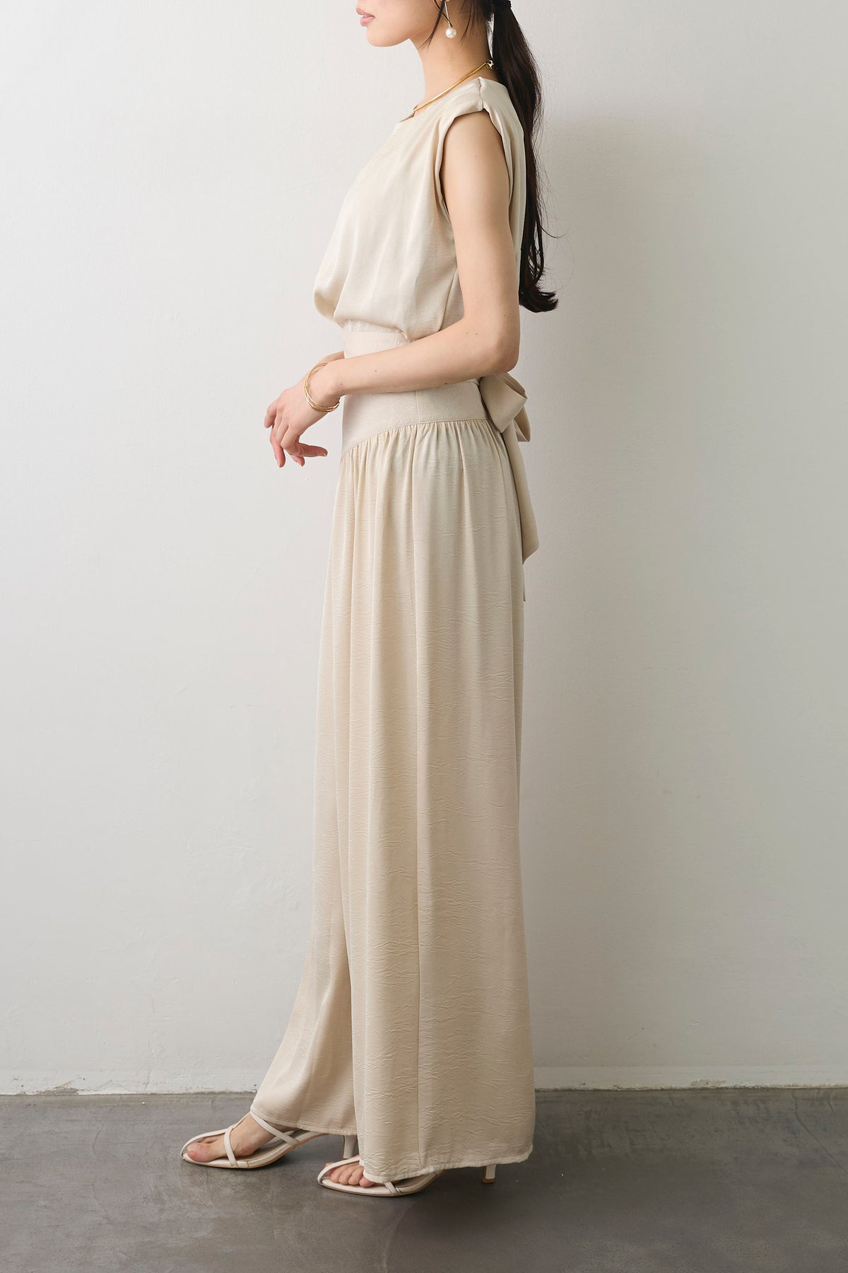 柔らかな光沢のマットサテンが上品なセットアップ。ウエストのワイドデザインがメリハリを演出し、後ろのリボンディテールでバックスタイルも印象的に。ドレープ感のある素材とワイドパンツで体型を拾わず、リラクシーながらも女性らしさを引き立てます。デイリーにもお出かけにもおすすめな一着です。