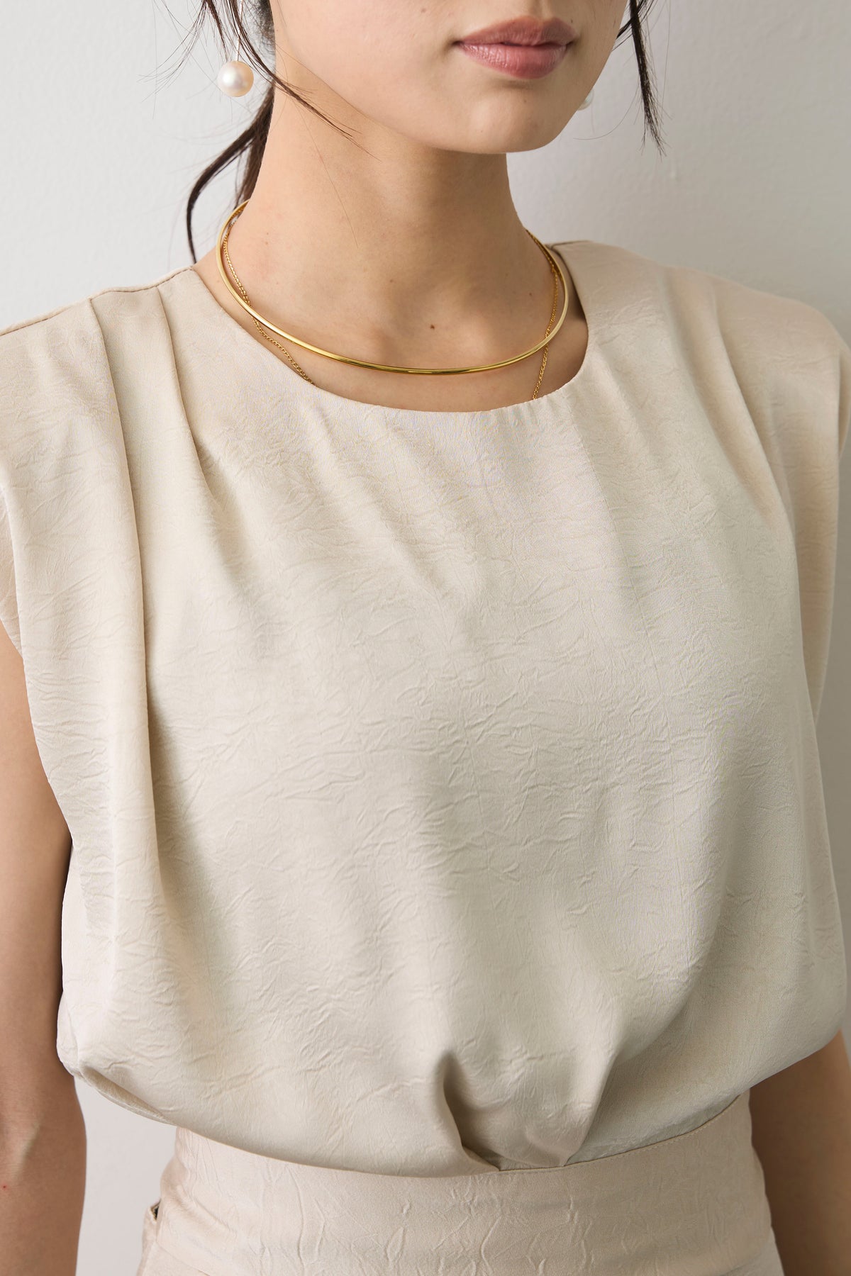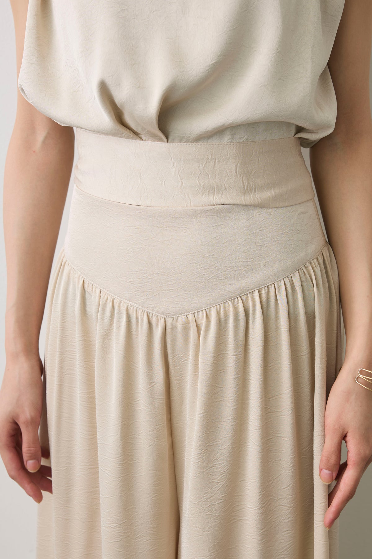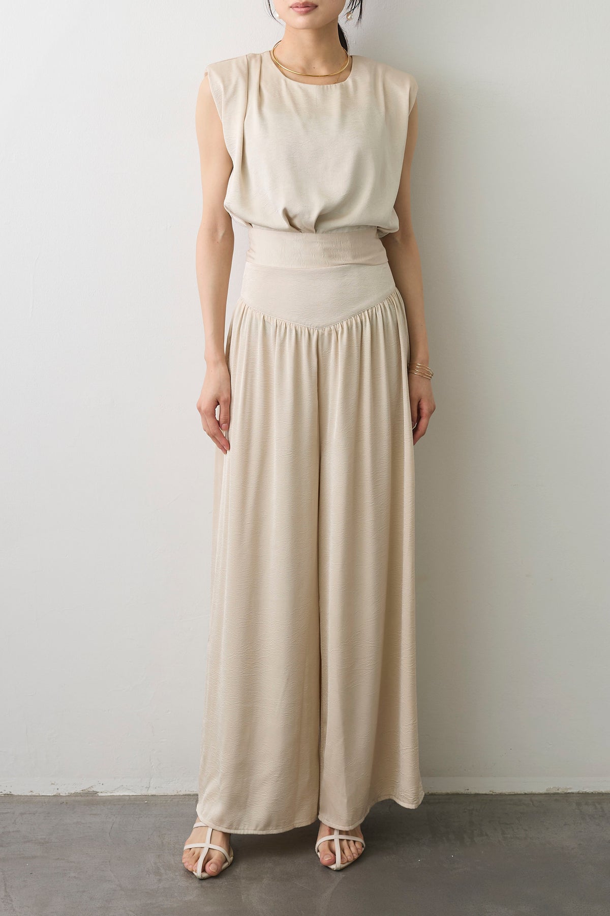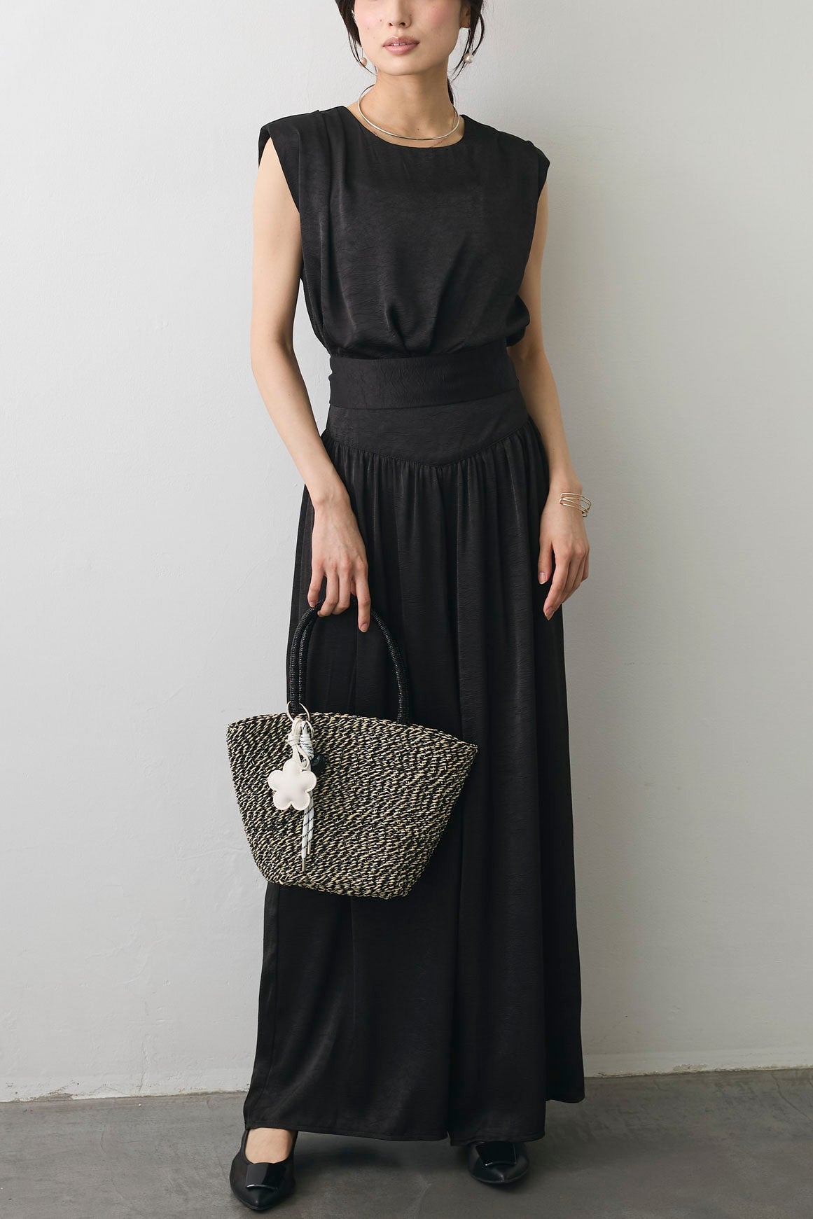 柔らかな光沢のマットサテンが上品なセットアップ。ウエストのワイドデザインがメリハリを演出し、後ろのリボンディテールでバックスタイルも印象的に。ドレープ感のある素材とワイドパンツで体型を拾わず、リラクシーながらも女性らしさを引き立てます。デイリーにもお出かけにもおすすめな一着です。