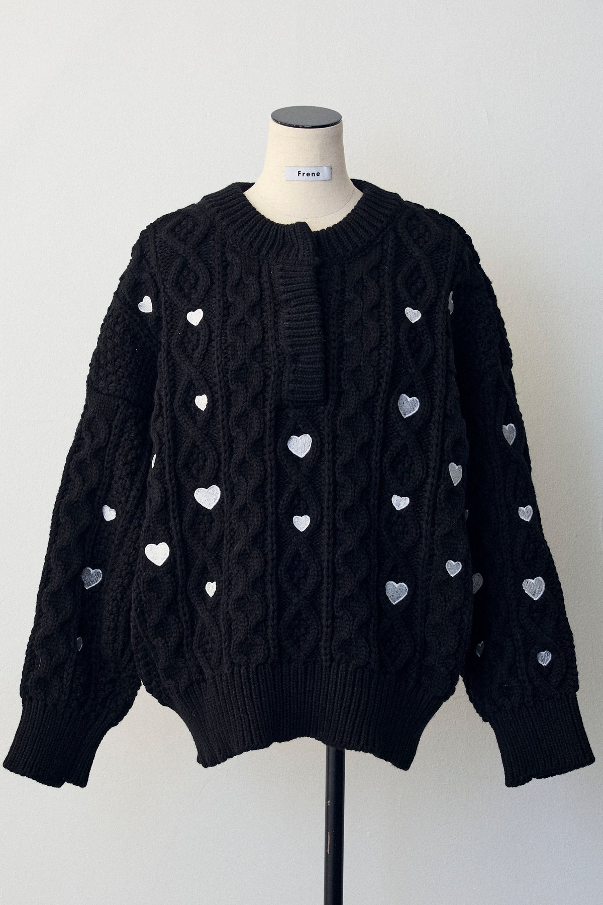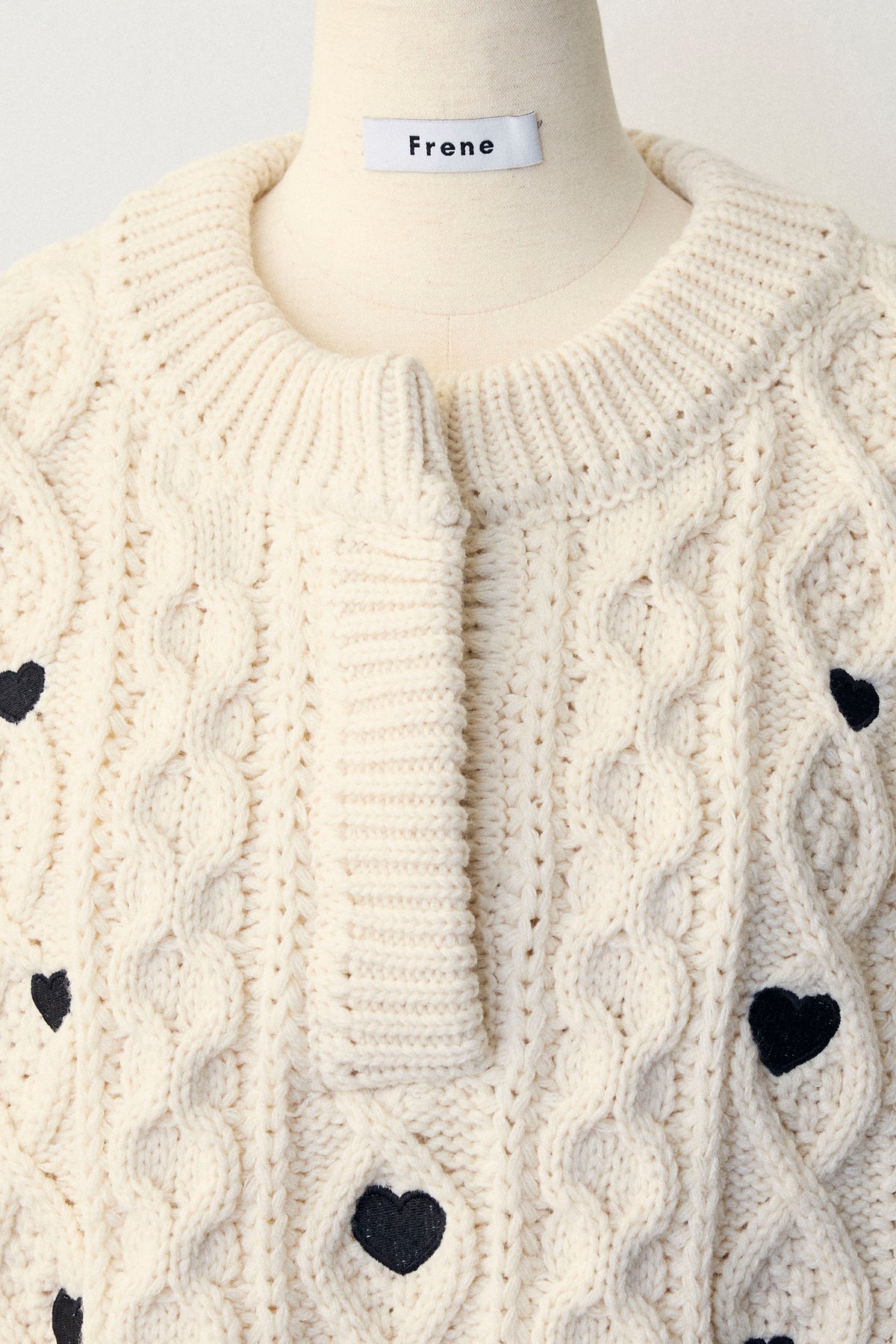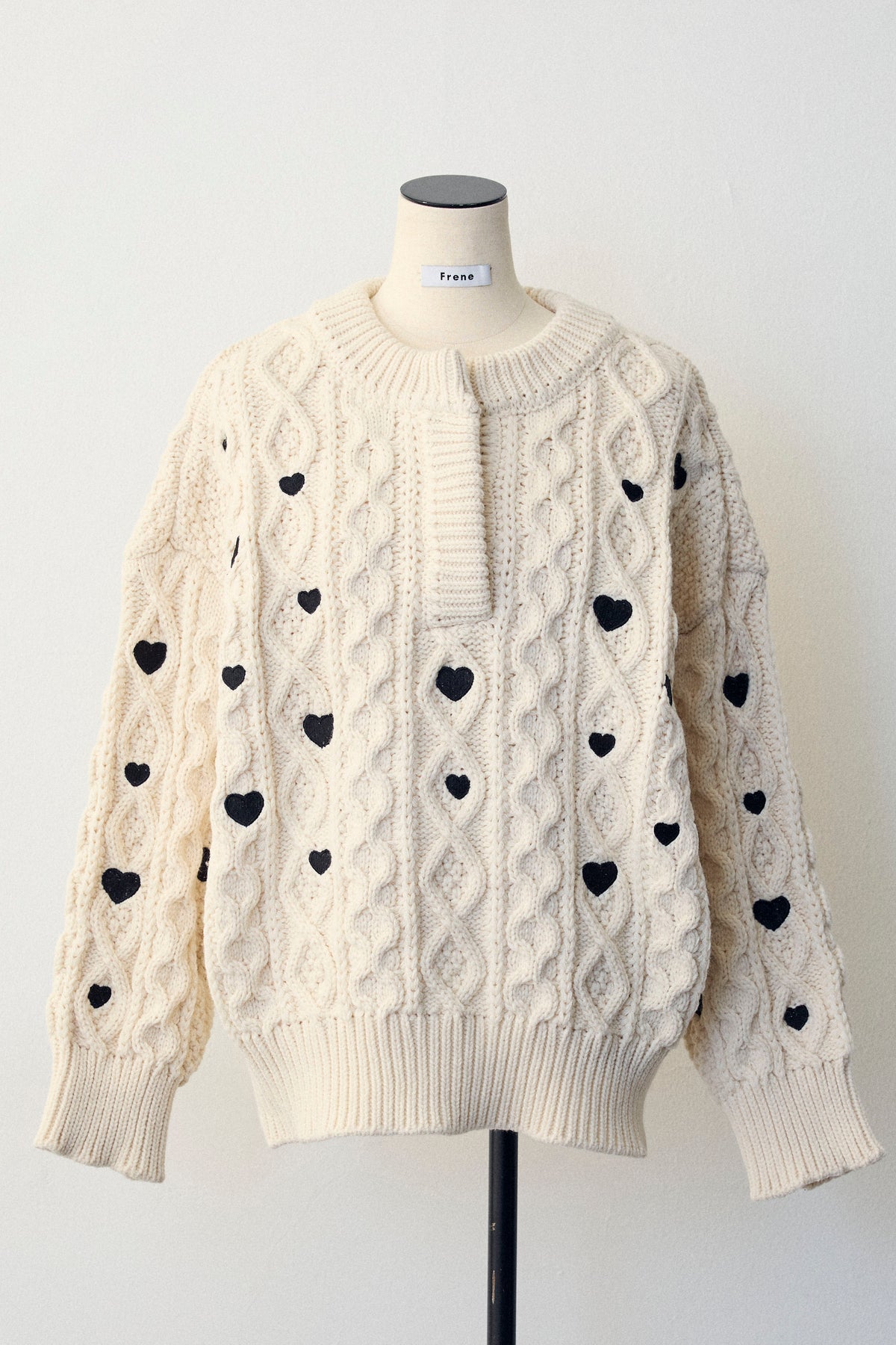 クラシカルなケーブル編みと、愛らしいハート刺繍が響き合う主役級ニット。 ほっこりとしがちなケーブル柄も、トレンドのヘンリーネックを取り入れることで抜け感が生まれ、大人の遊び心を感じさせるデザインに仕上げました。 首元のボタンを開けてインナーを覗かせたり、ふんわりとした袖のシルエットを生かして一枚で着たりと、その日の気分でアレンジ自在。 デニムからチュールスカートまで幅広くマッチし、冬の装いをドラマティックに彩ります。