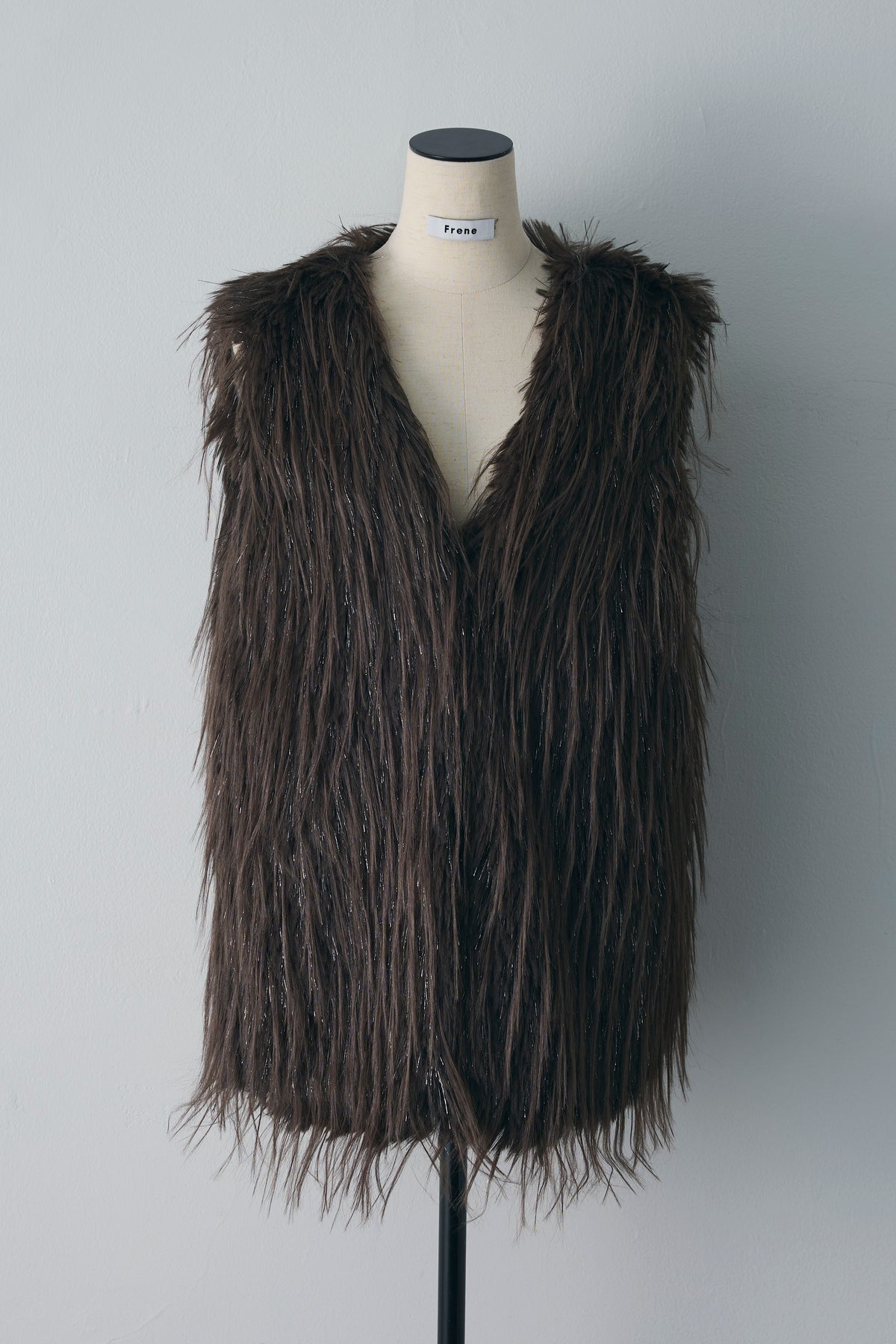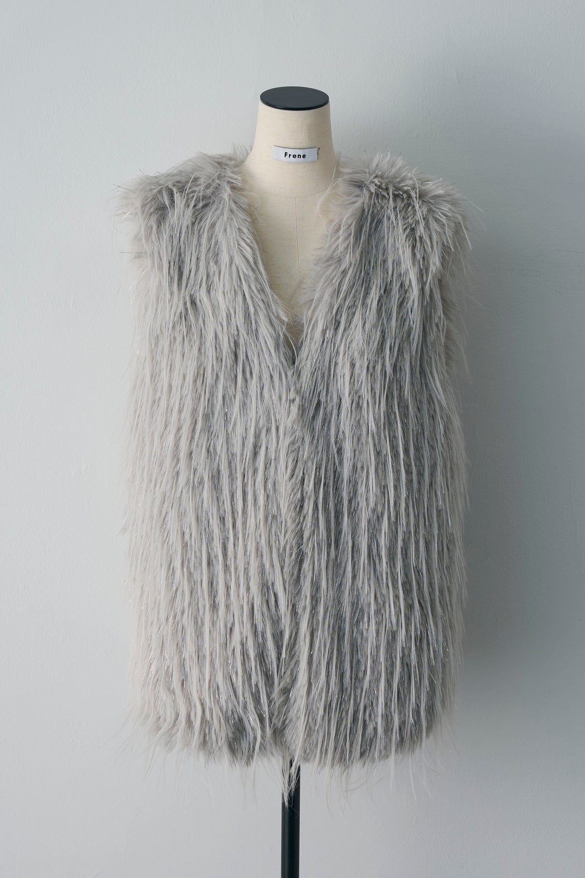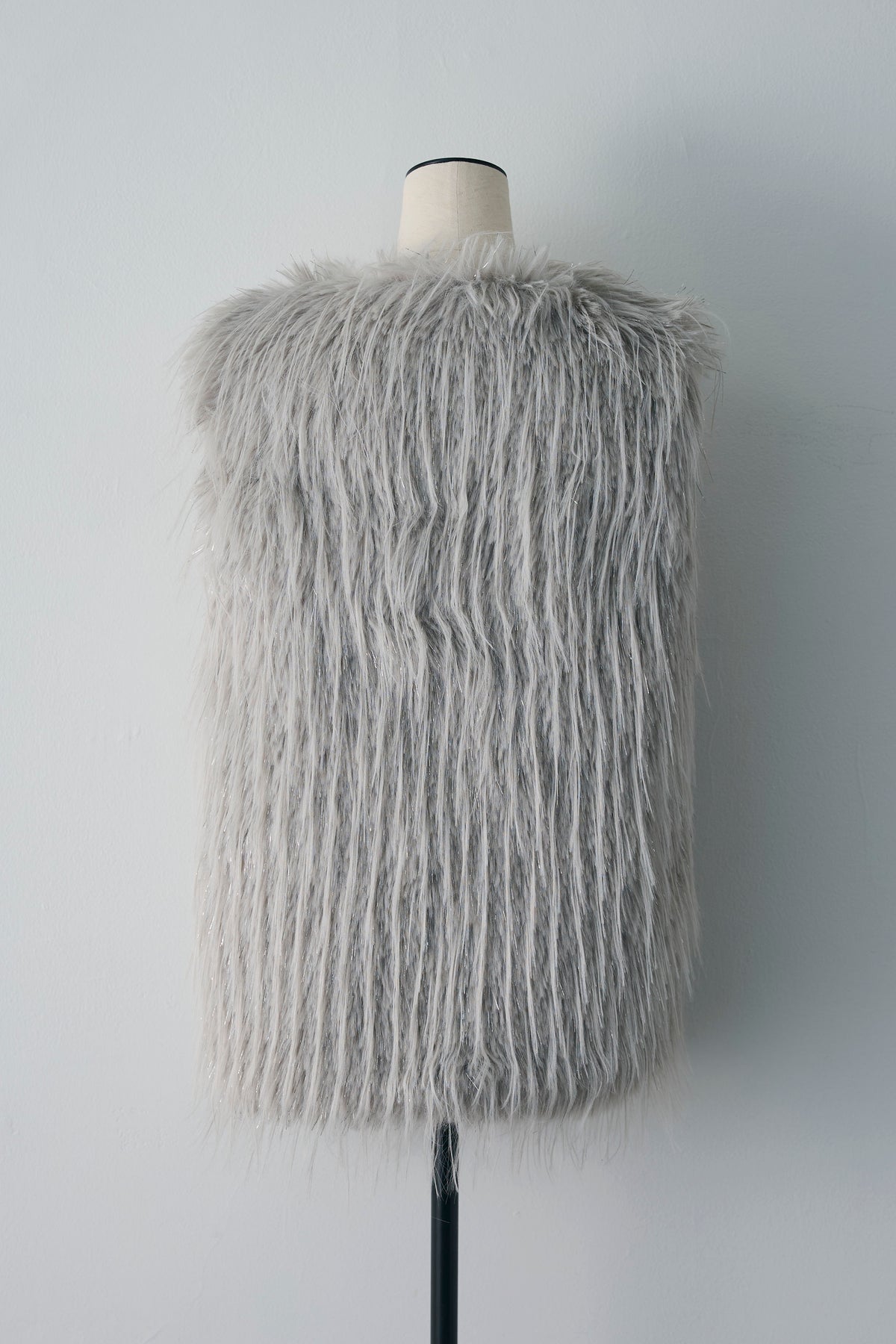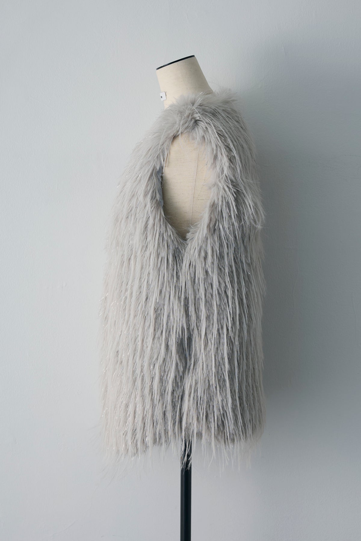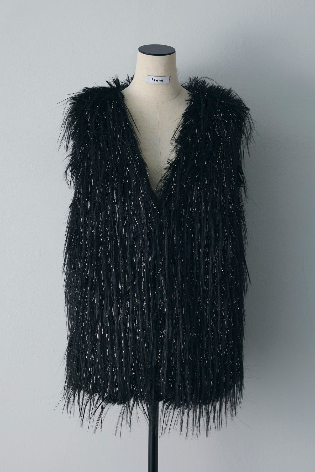 繊細なラメ糸を散らした長毛フェイクファーが、動くたびきらりと揺れるロングベスト。深めVとすっきり丈でボリュームを軽やかに見せます。ニットやワンピに重ねるだけで立体感のある旬バランスに。デニムからきれいめまで、秋冬コーデの主役。