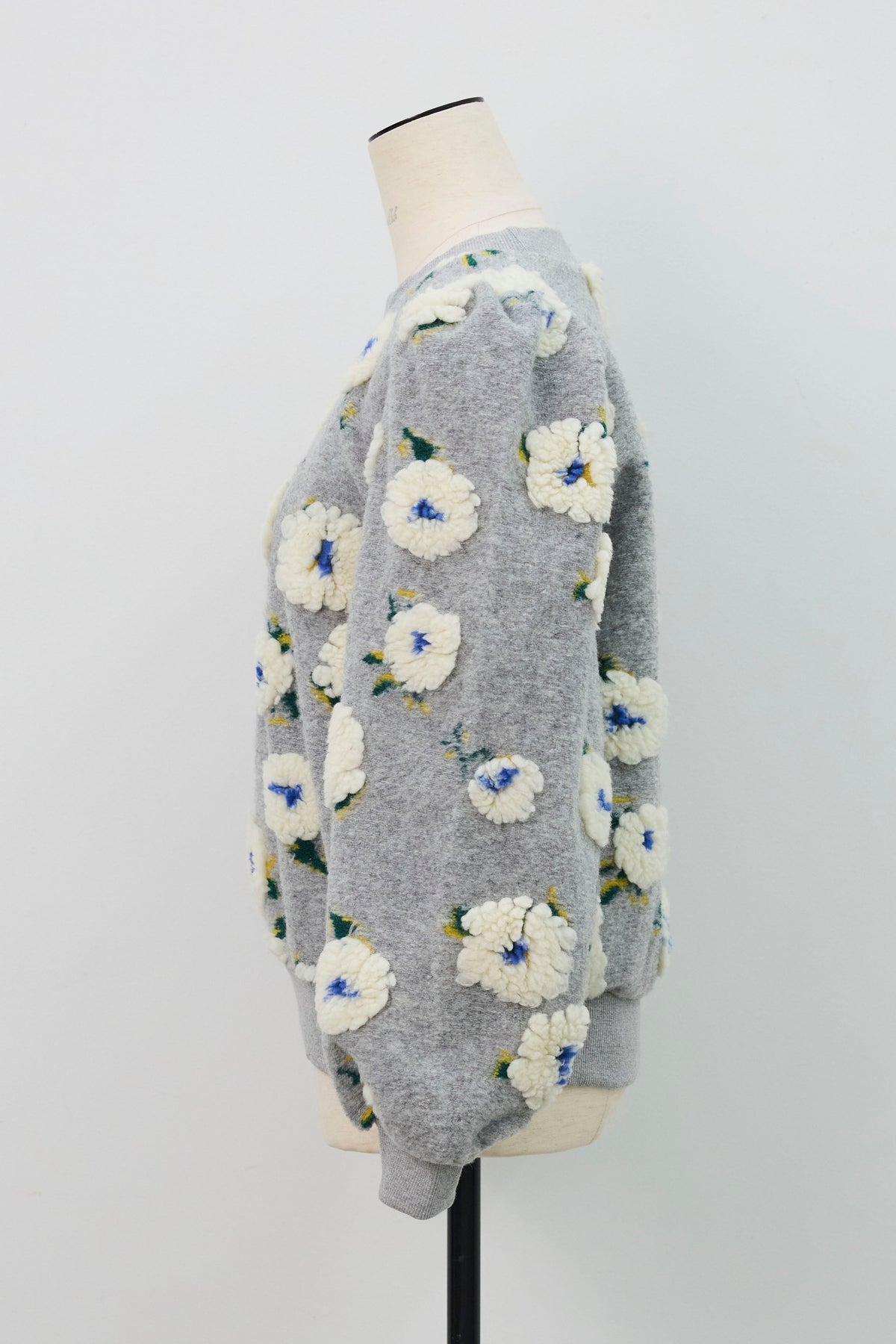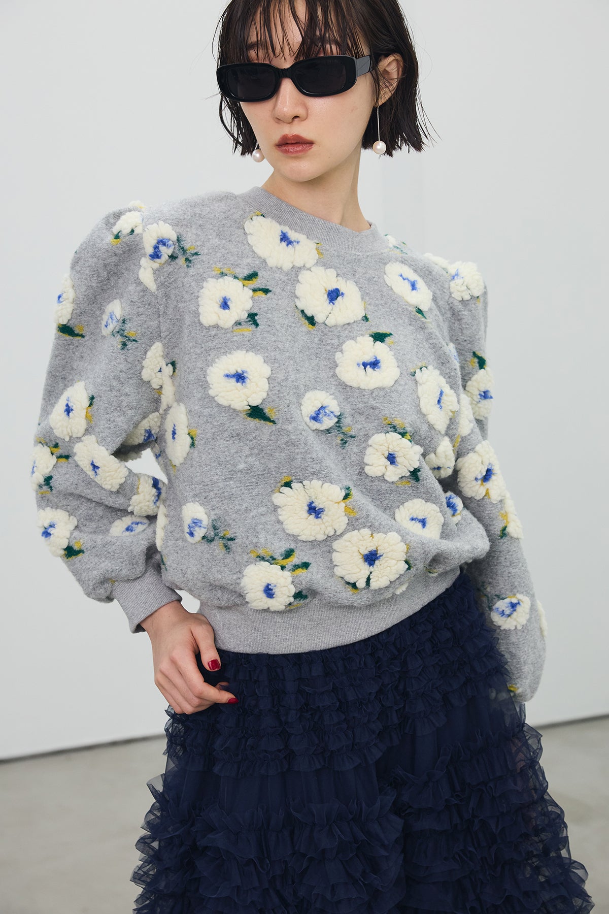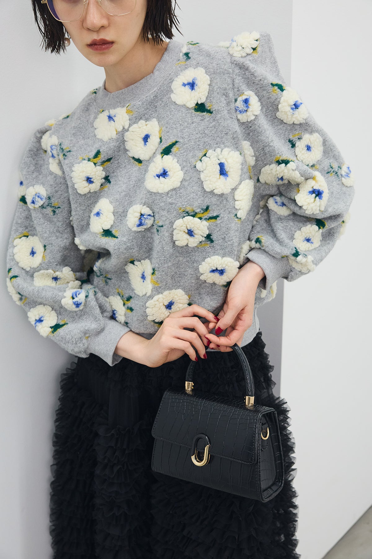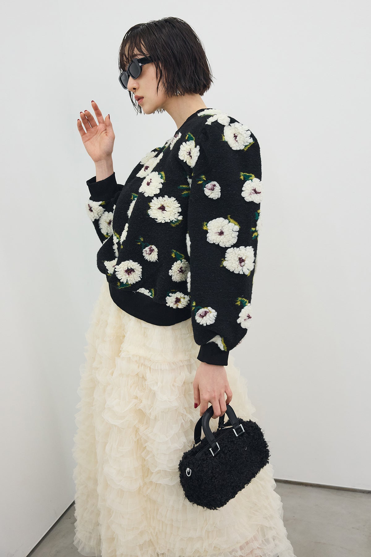 立体的なボアフラワーが目を惹く、存在感たっぷりのニット。 ふんわりとした花モチーフがあたたかみを添え、着るだけでコーデの主役に。 程よいボリュームのある袖とコンパクトな丈感で、スカートにもパンツにも好バランス。 甘すぎずモードな印象を叶える、秋冬の気分を盛り上げる一枚です。