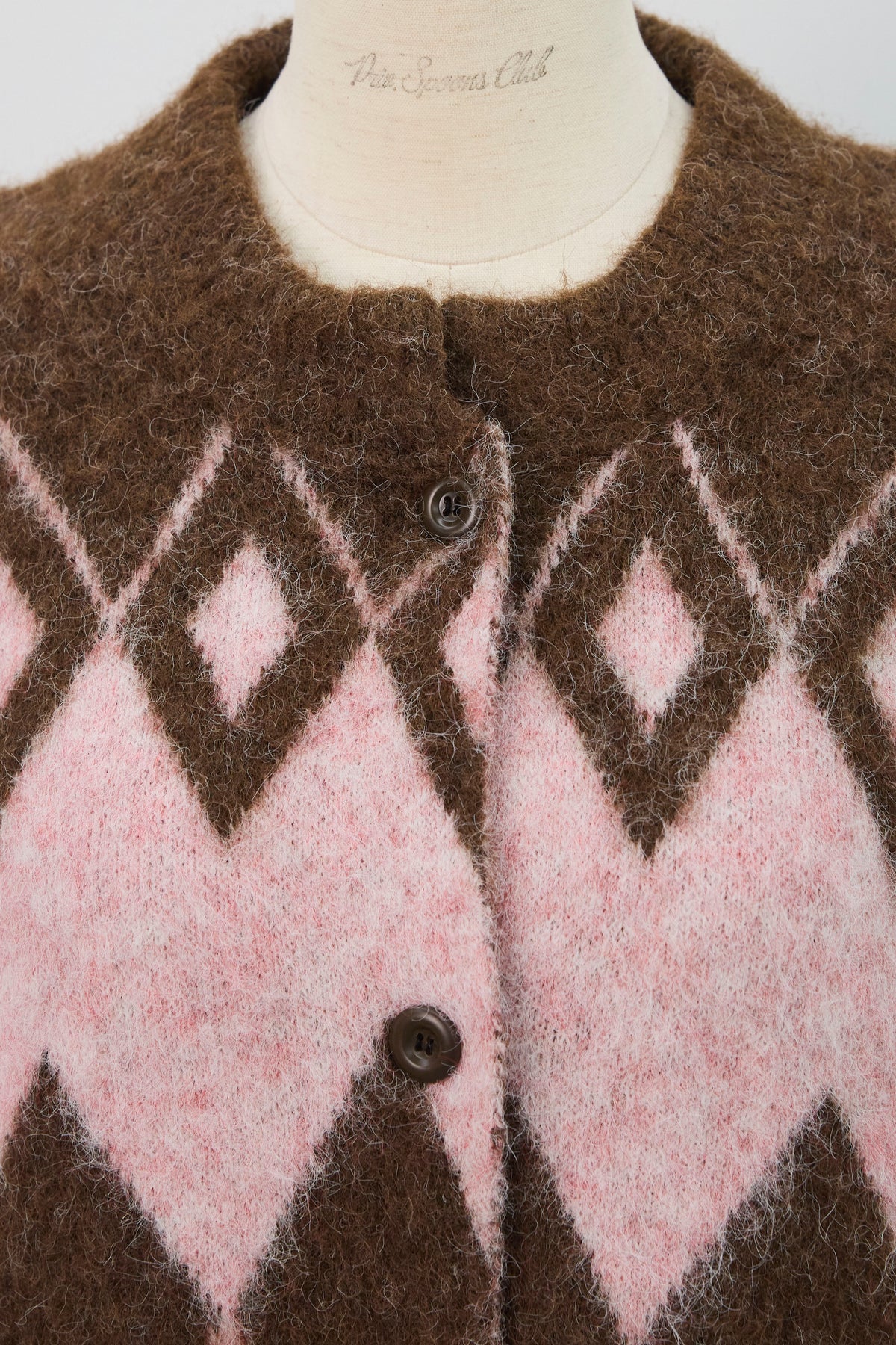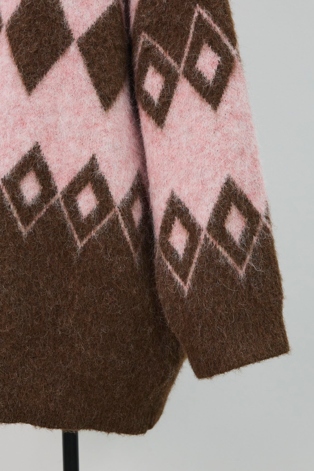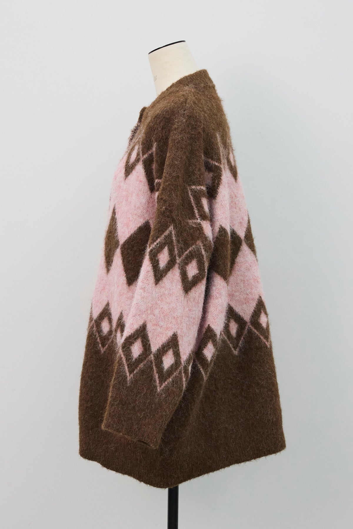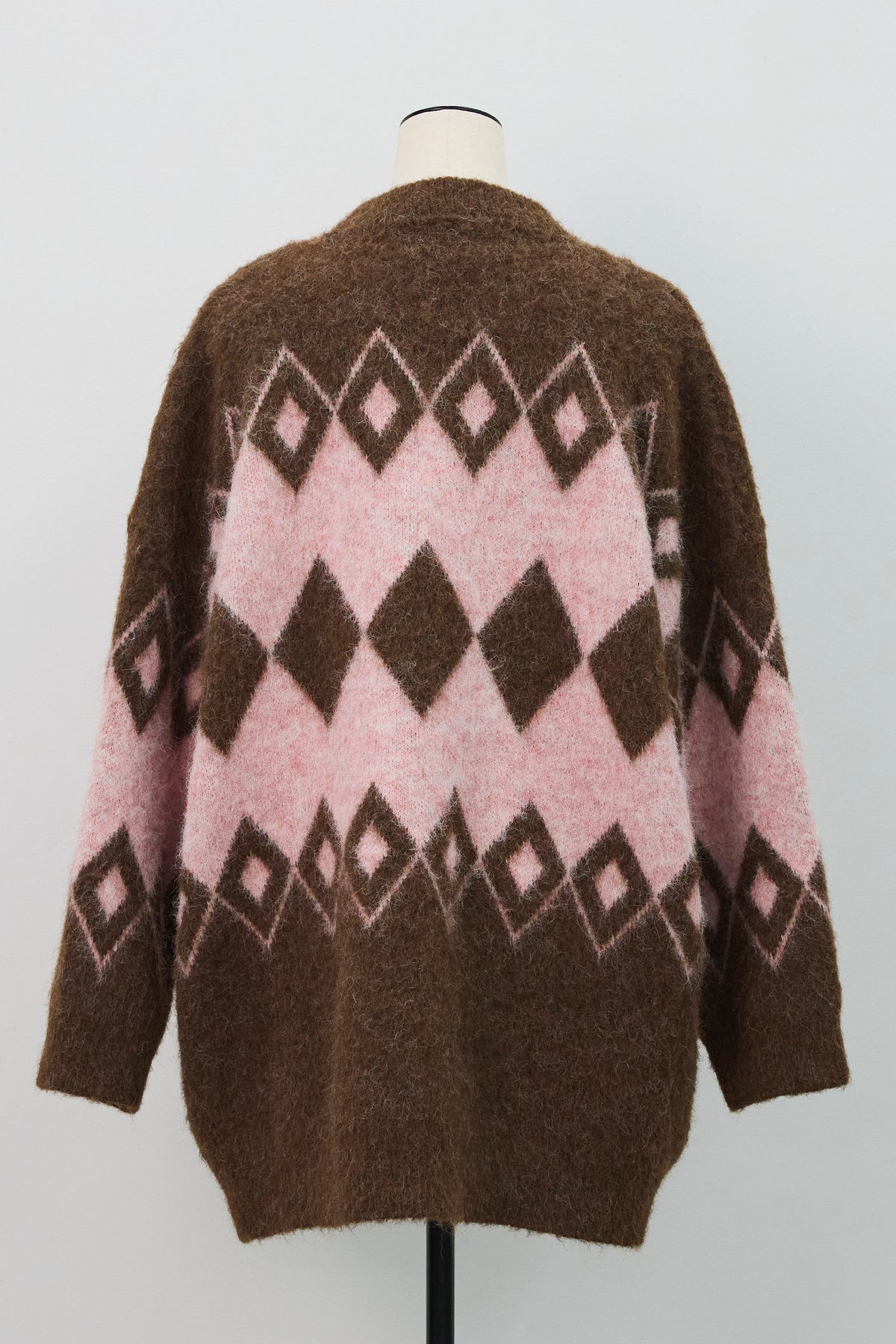 大きめのダイヤ柄が印象的なノルディックカーディガン。 毛足のあるふんわりとした糸を使用し、季節感とぬくもりを感じる一枚に仕上げました。 ゆったりとしたルーズシルエットで、羽織るだけで抜け感のあるスタイルが完成。 ボタンを留めてワンピース風にも着られる、主役級のニットカーデです。