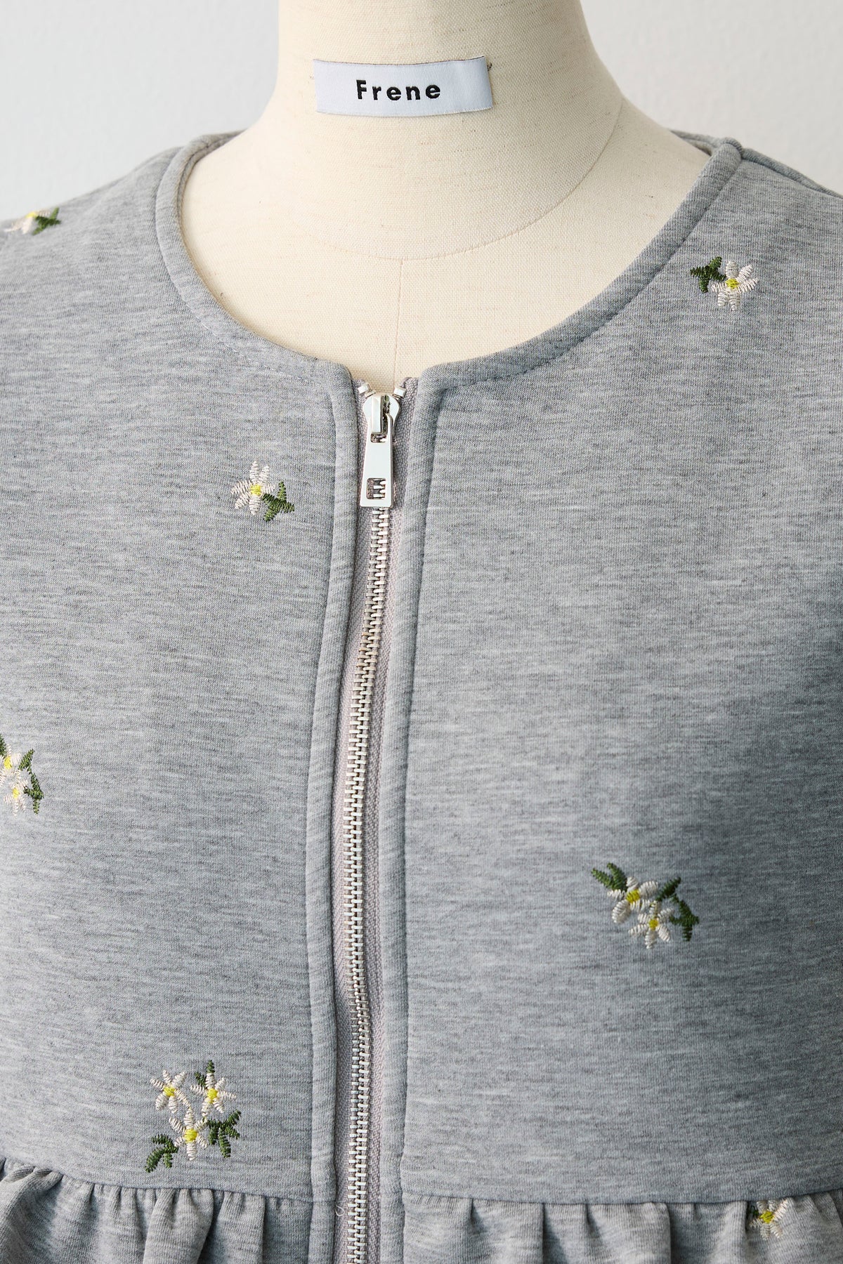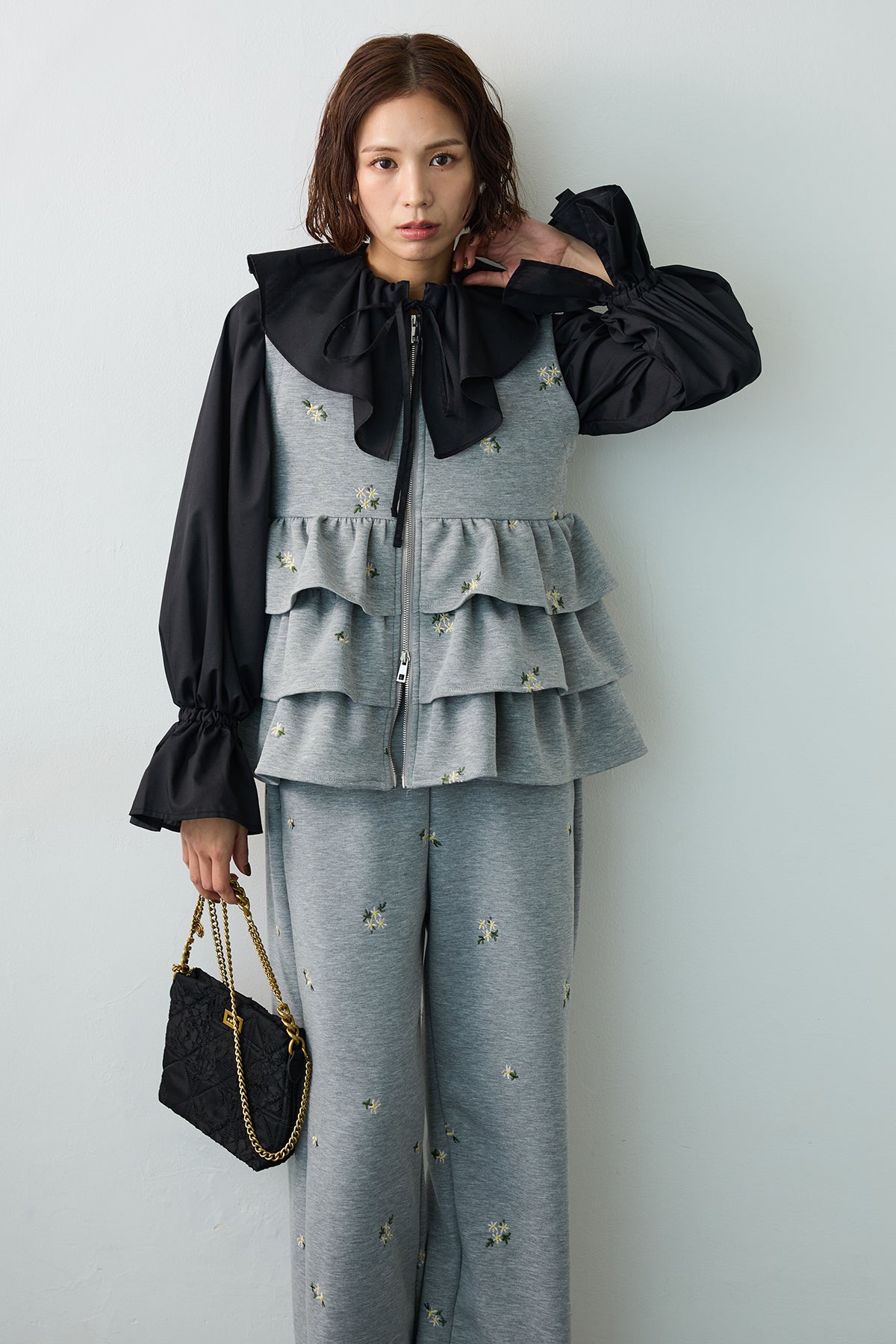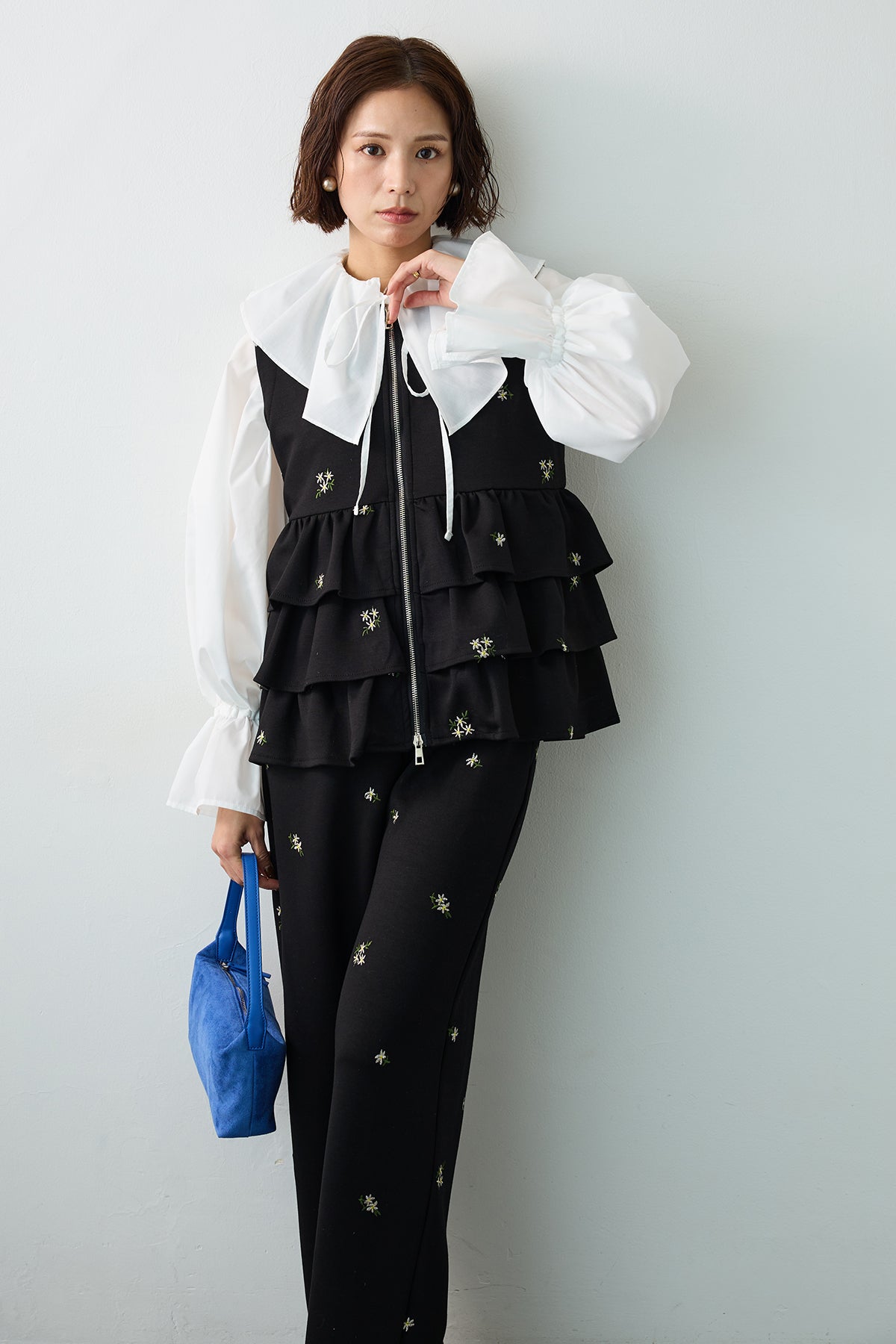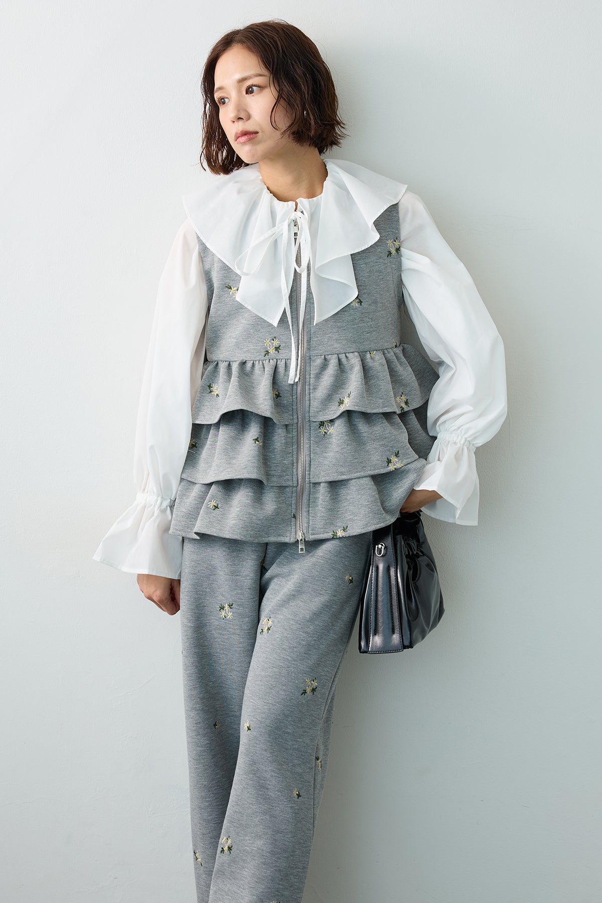 可憐な小花柄の刺繍を散りばめ、大人の愛らしさを表現したティアードベスト。 腰回りを華やかに飾る3段のフリルデザインが、動くたびに立体的なシルエットを描き、コーディネートの主役になる一着です。 フロントはシルバーのジップ仕様にすることで、甘さを程よく抑えたシャープなアクセントをプラス。 滑らかな肌触りの素材は着心地も良く、ブラウスやカットソーとレイヤードするだけで、鮮度の高いスタイルが完成します。