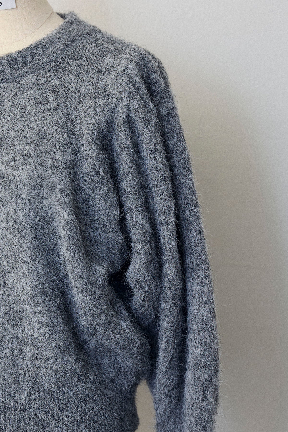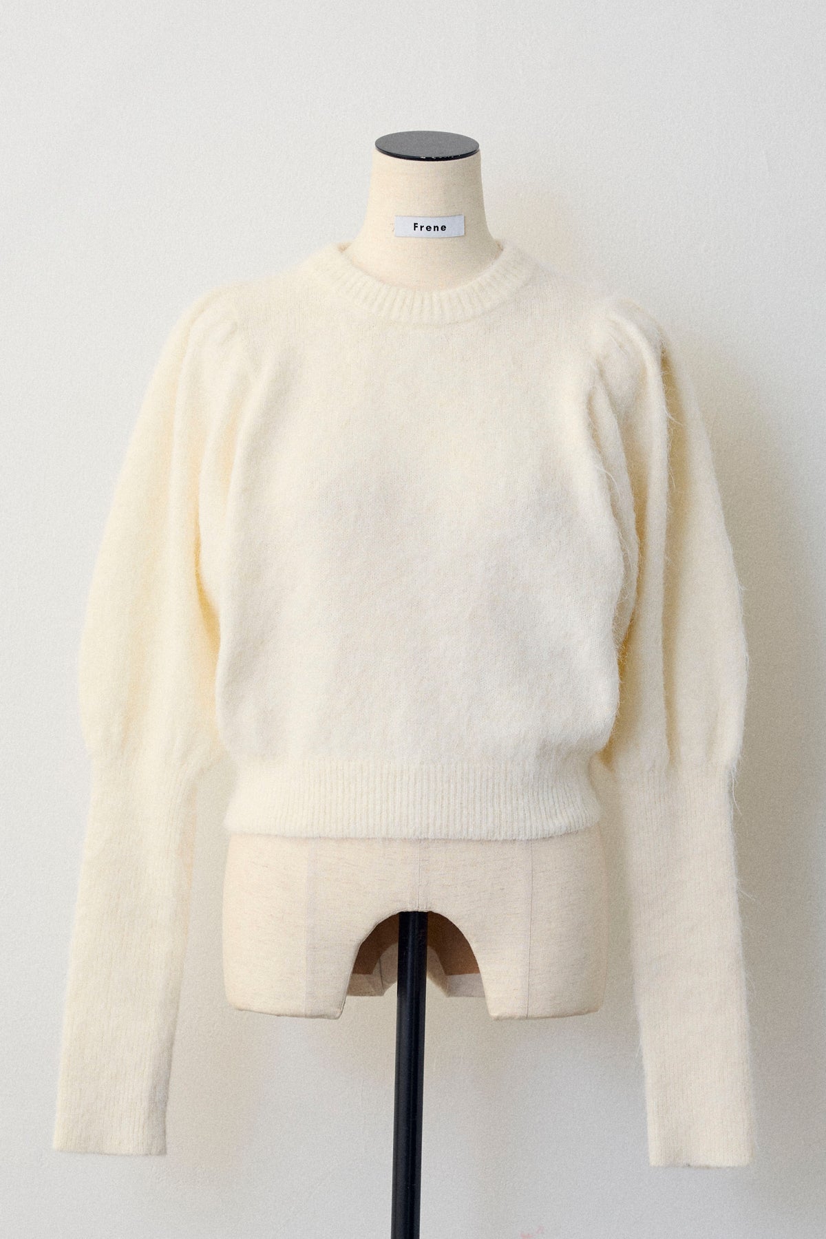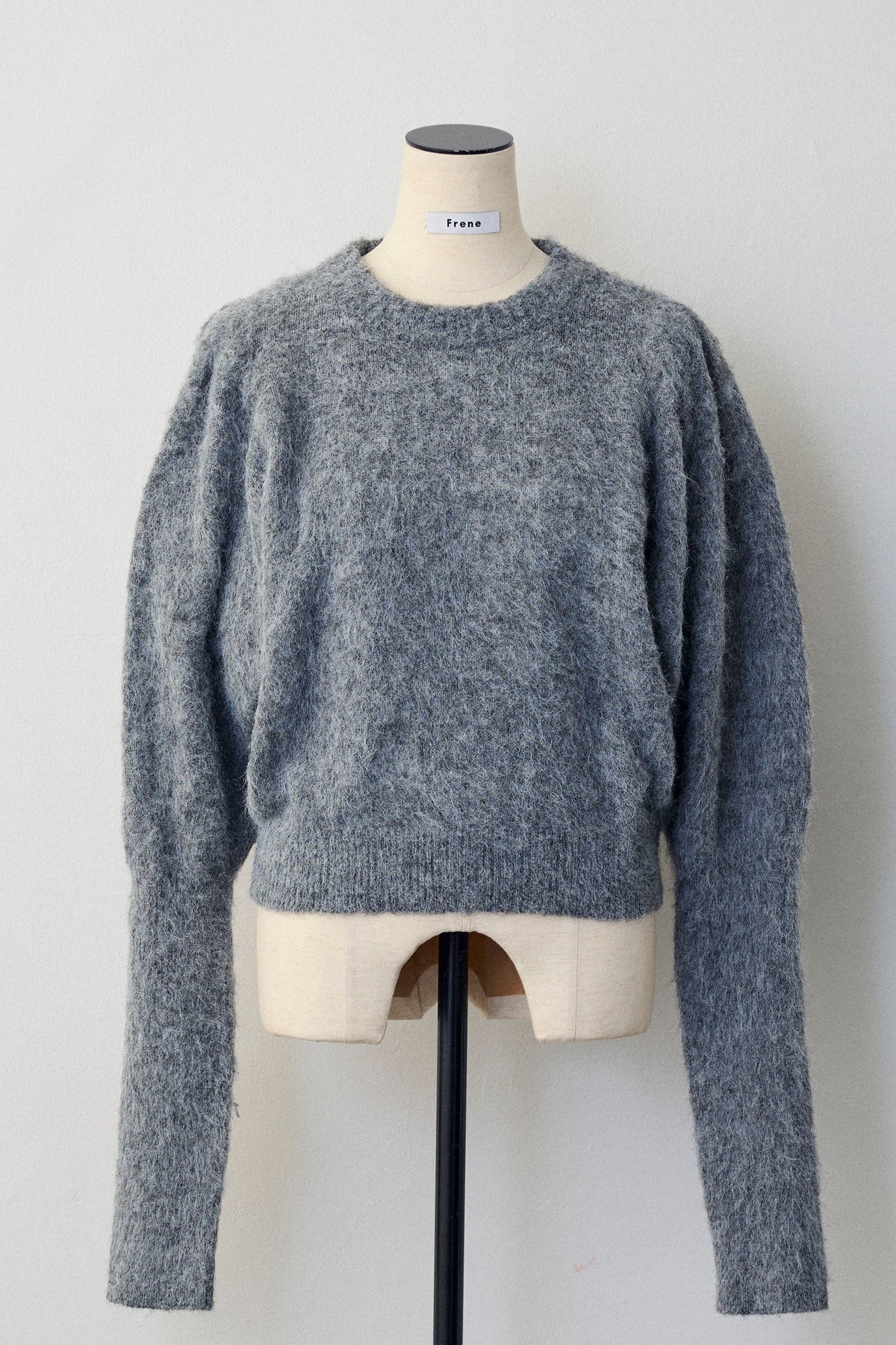 ふんわりとしたモヘアの質感が魅力のパフスリーブプルオーバー。程よくボリュームを持たせた肩まわりが、シンプルなシルエットに女性らしい立体感を添えています。短めの着丈はバランスが取りやすく、ワイドパンツやスカートとも好相性。軽やかな風合いがスタイリングに柔らかいニュアンスを生み、大人のフェミニンスタイルを品よく引き立ててくれる一枚です。