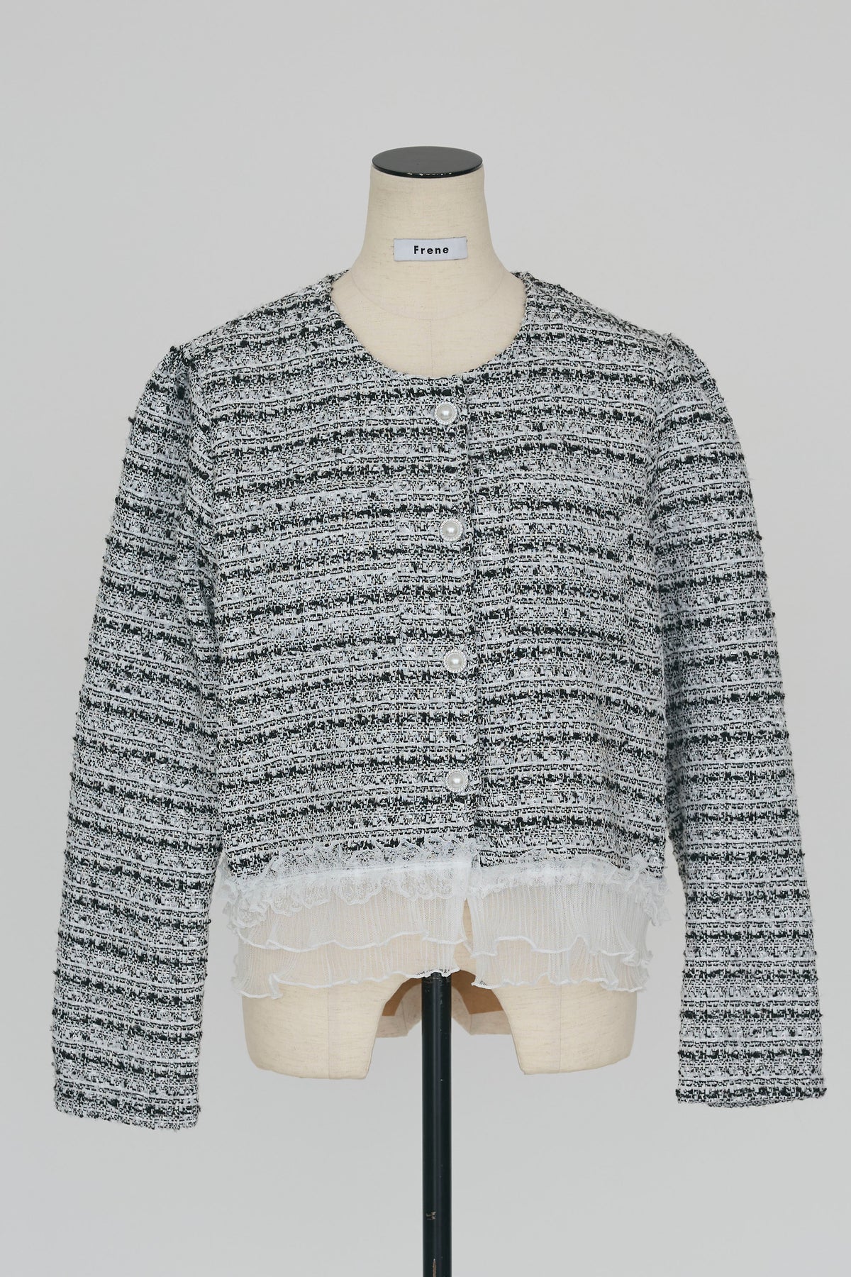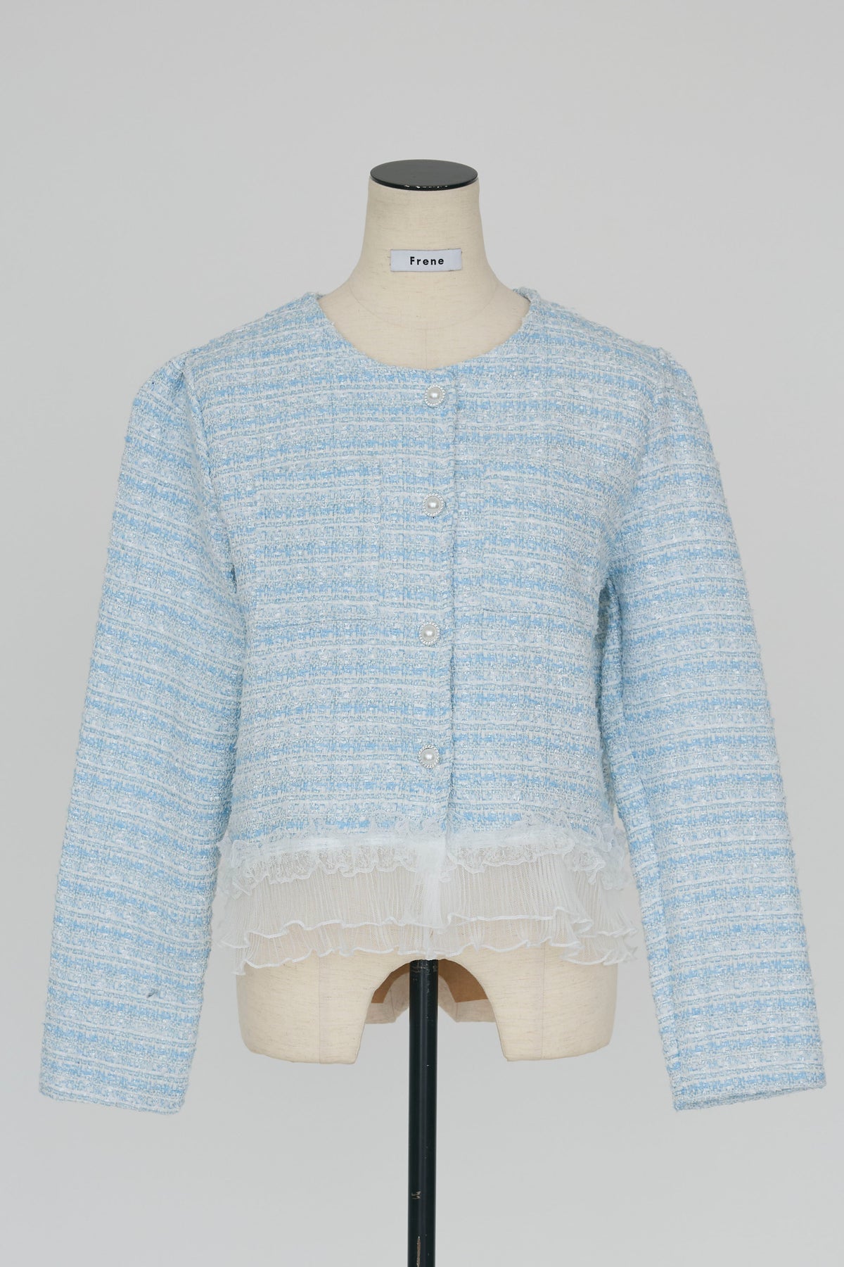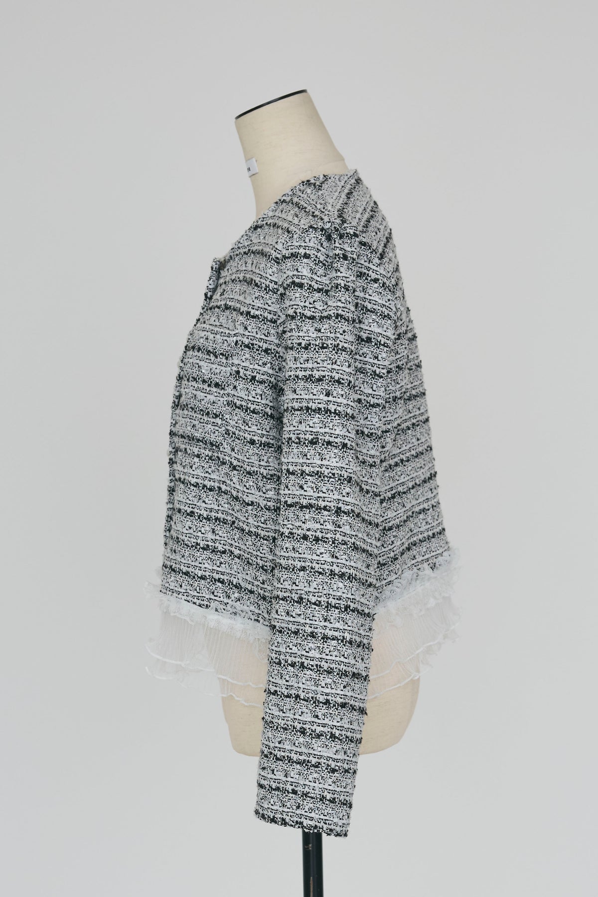 表情豊かなツイード生地と裾にあしらわれた透け感のあるプリーツフリルが華やかなジャケット。 フロントに並んだ控えめな輝きのボタンが上品なアクセントとなり大人のフェミニンさを引き立てます。すっきりとしたコンパクトな着丈が全体のバランスを良く見せ自然なスタイルアップを叶えるデザイン。 きれいめなワンピースに羽織ったりカジュアルなワイドパンツを合わせたりと幅広いスタイリングで活躍する一着です。