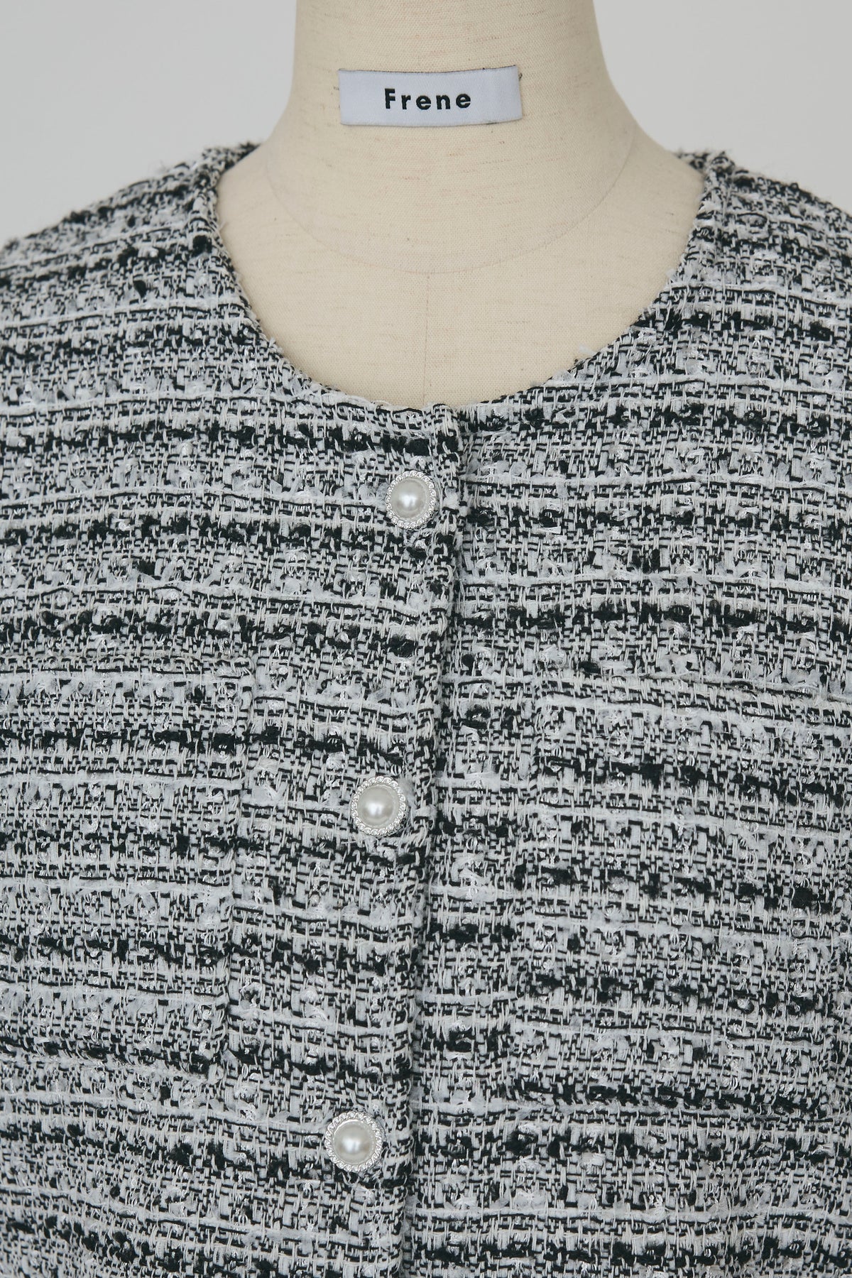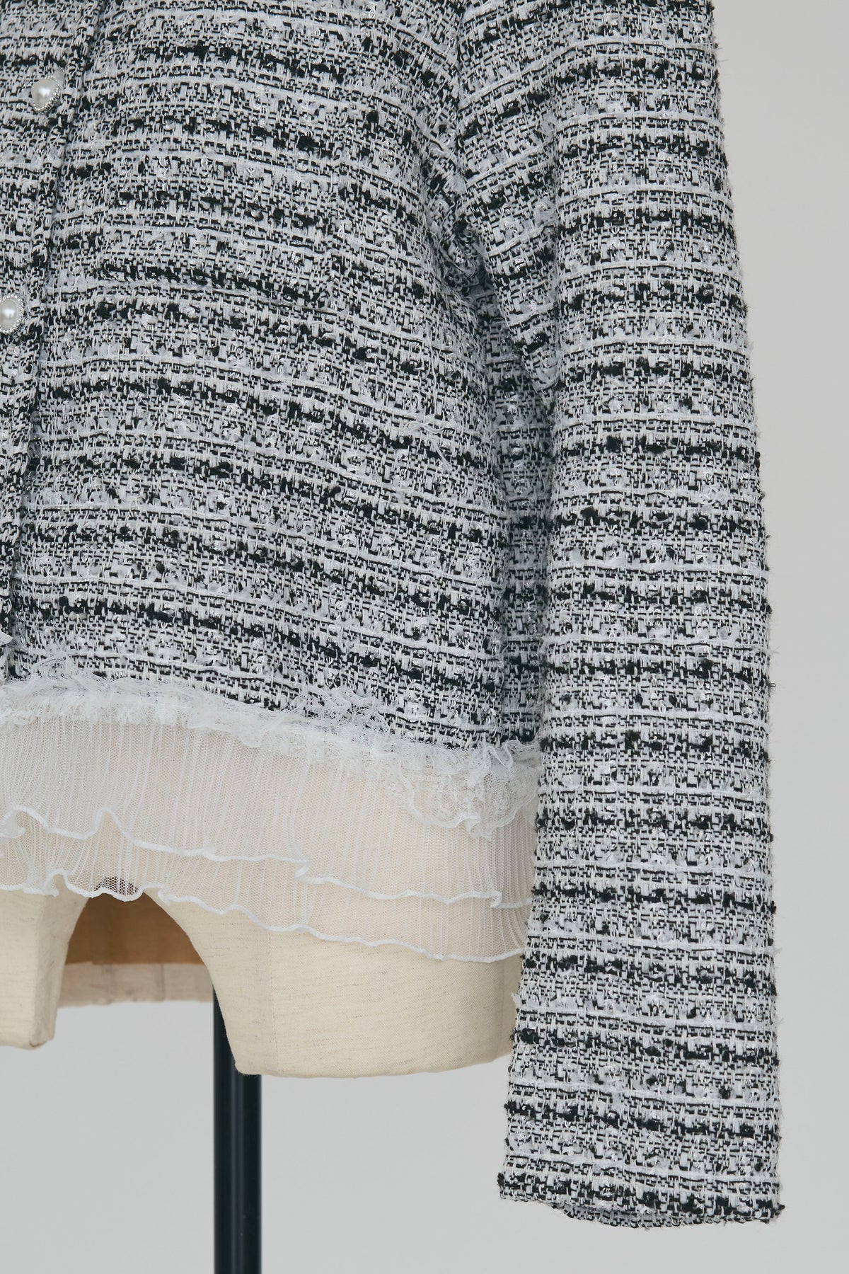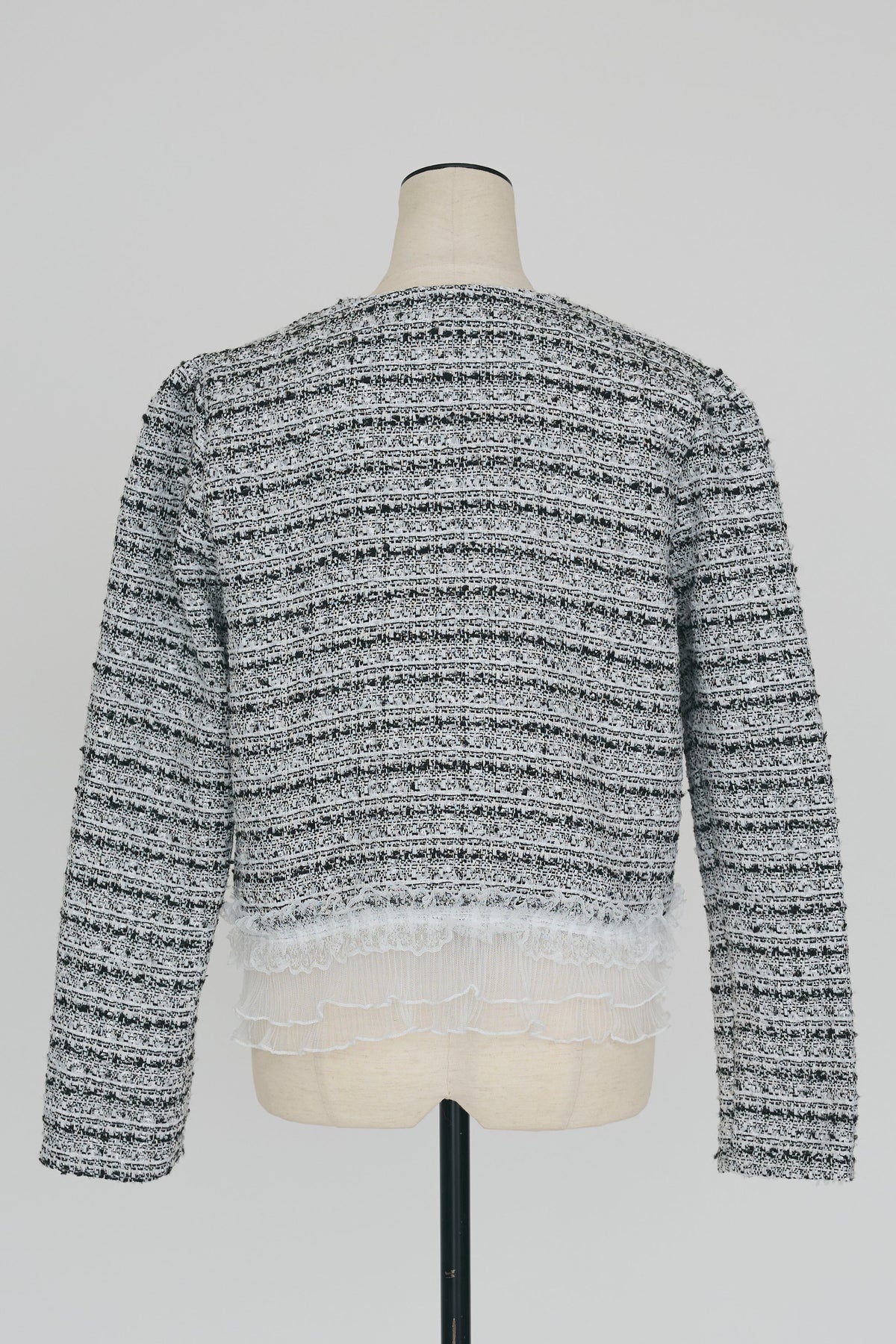 表情豊かなツイード生地と裾にあしらわれた透け感のあるプリーツフリルが華やかなジャケット。 フロントに並んだ控えめな輝きのボタンが上品なアクセントとなり大人のフェミニンさを引き立てます。すっきりとしたコンパクトな着丈が全体のバランスを良く見せ自然なスタイルアップを叶えるデザイン。 きれいめなワンピースに羽織ったりカジュアルなワイドパンツを合わせたりと幅広いスタイリングで活躍する一着です。