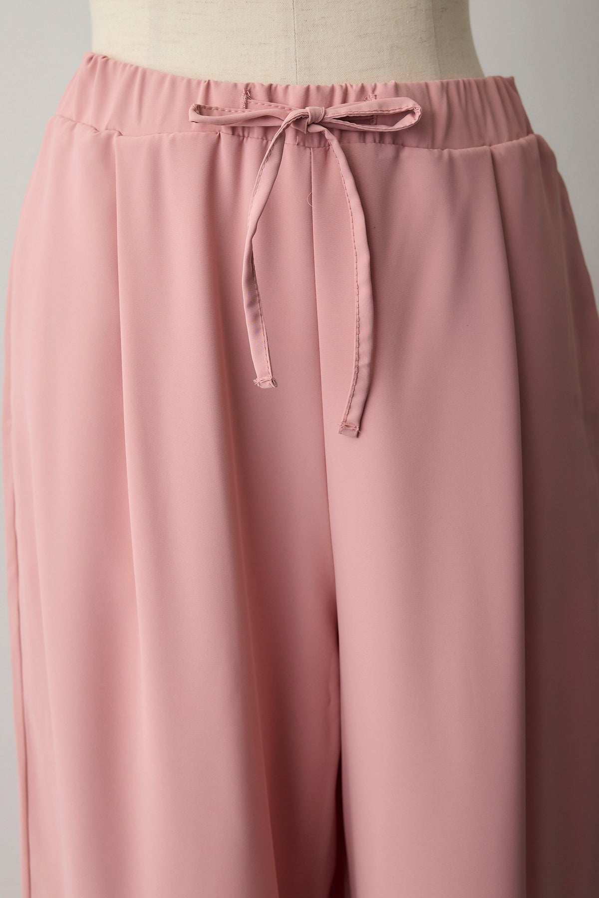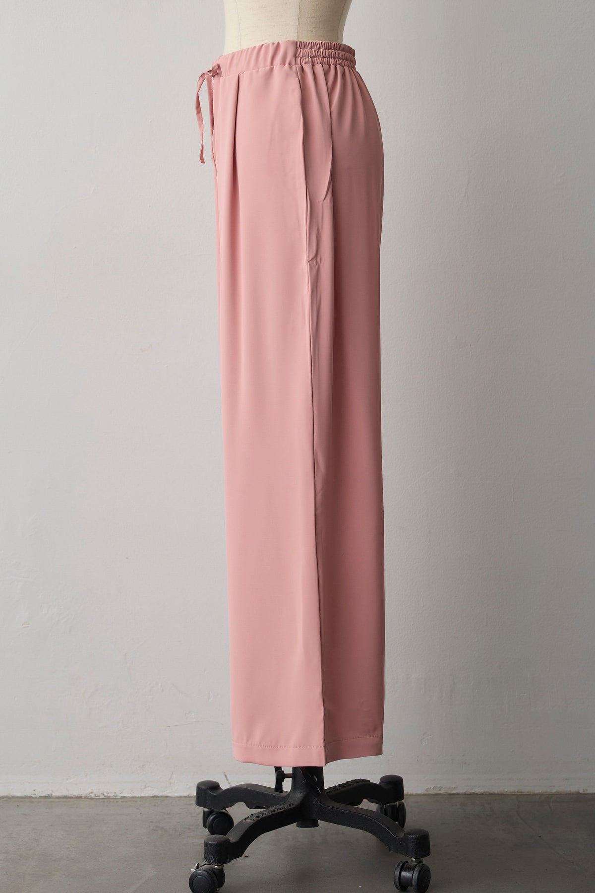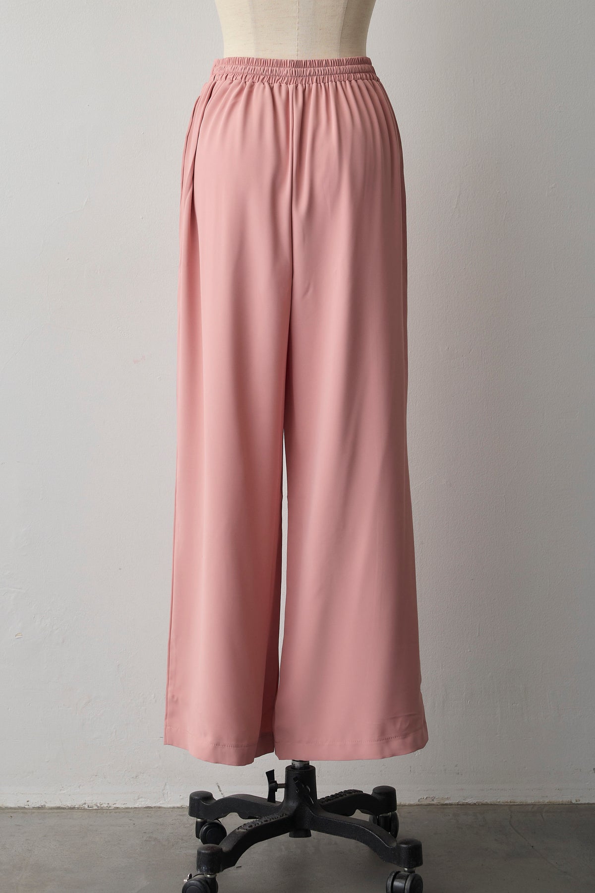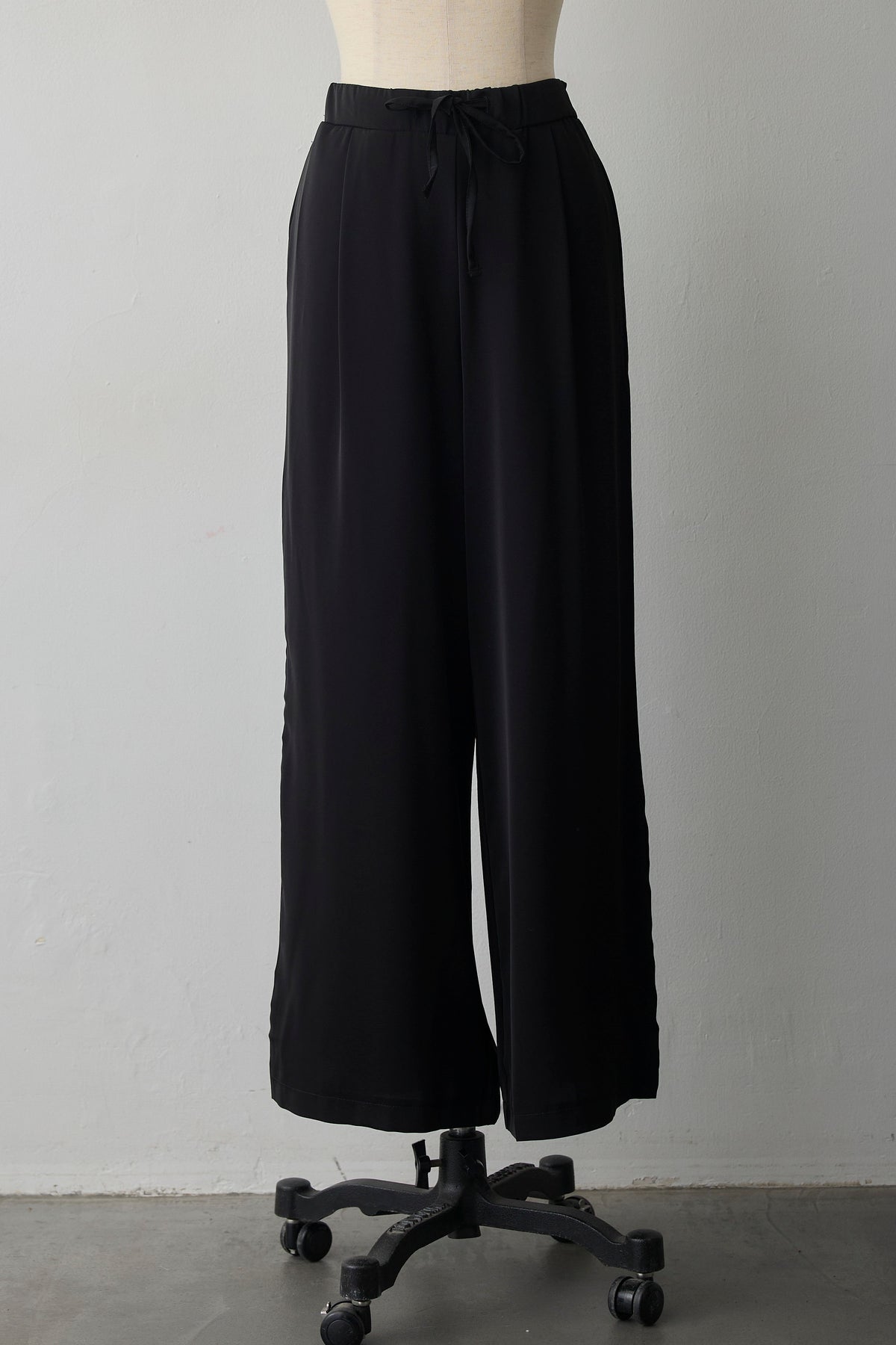 滑らかな落ち感と上品な質感が魅力の、大人のためのドロストワイドパンツ。 ウエストはゴム&リボン仕様でリラックスした履き心地ながら、とろみのある素材が洗練された印象を与え、カジュアルになりすぎないのがポイントです。 脚のラインを拾いすぎないゆったりとしたシルエットが、気になる腰回りや太ももを自然にカバーし、リラクシーな抜け感を演出。 シンプルなニットや華やかなデザインのブラウスとも相性が良く、オンオフ問わずデイリーに活躍する頼れる一着です。