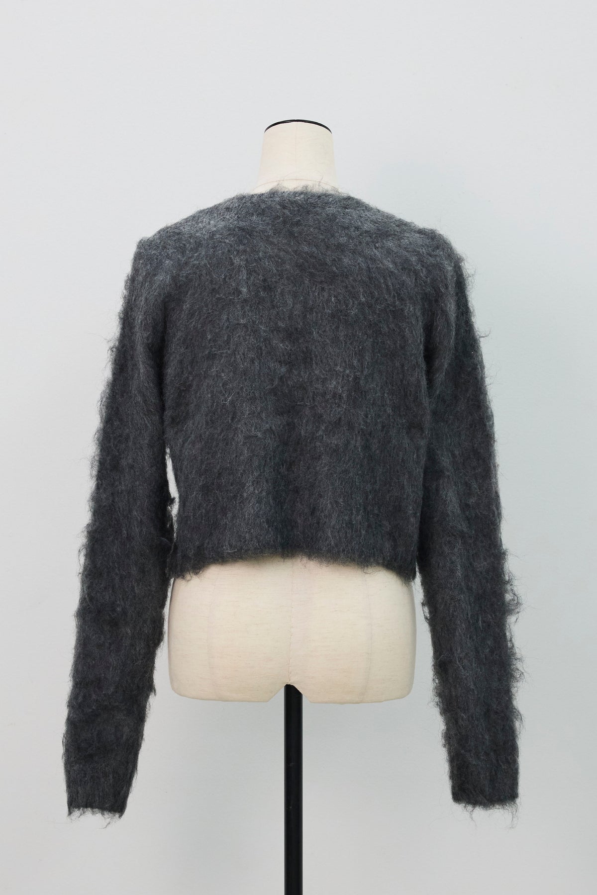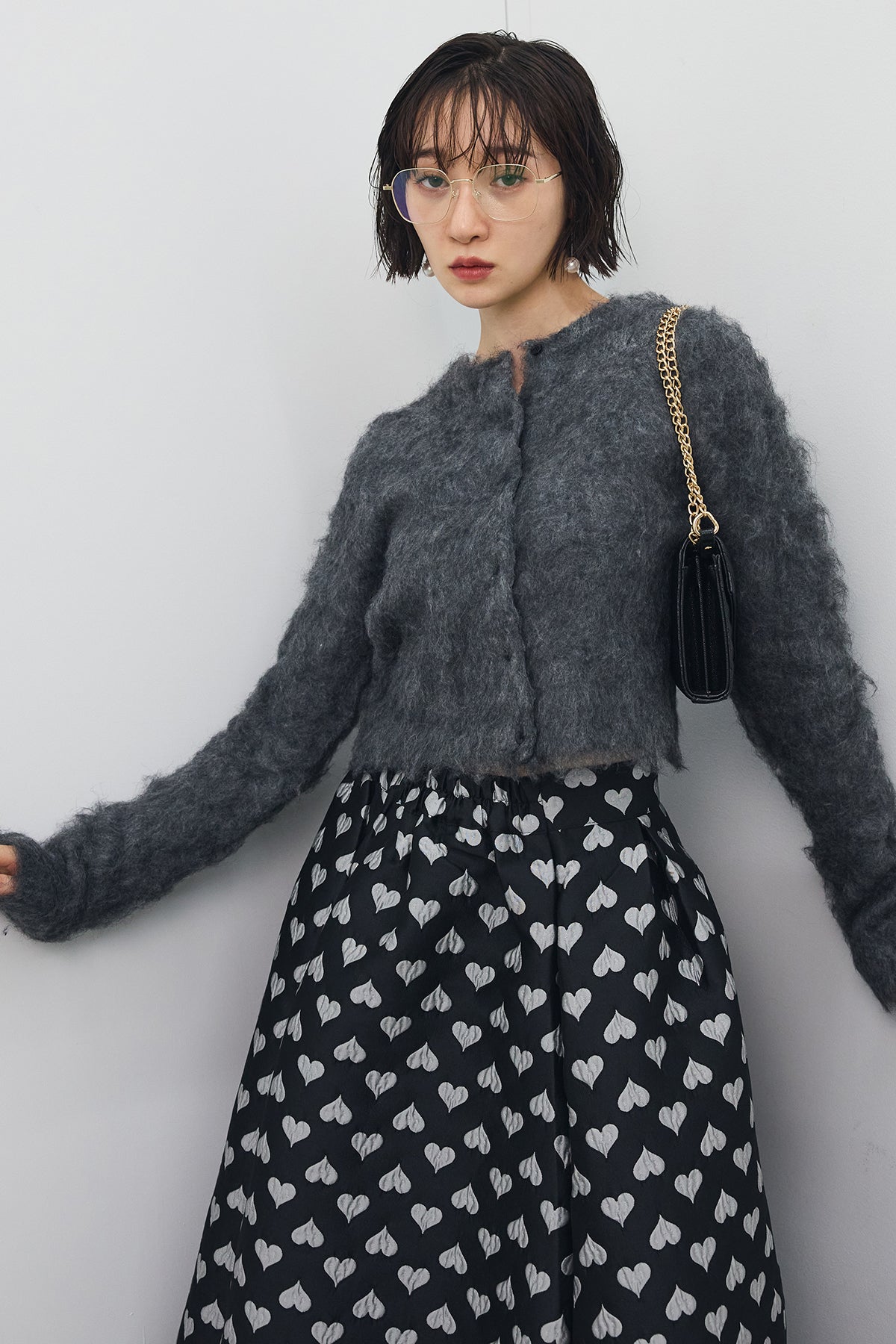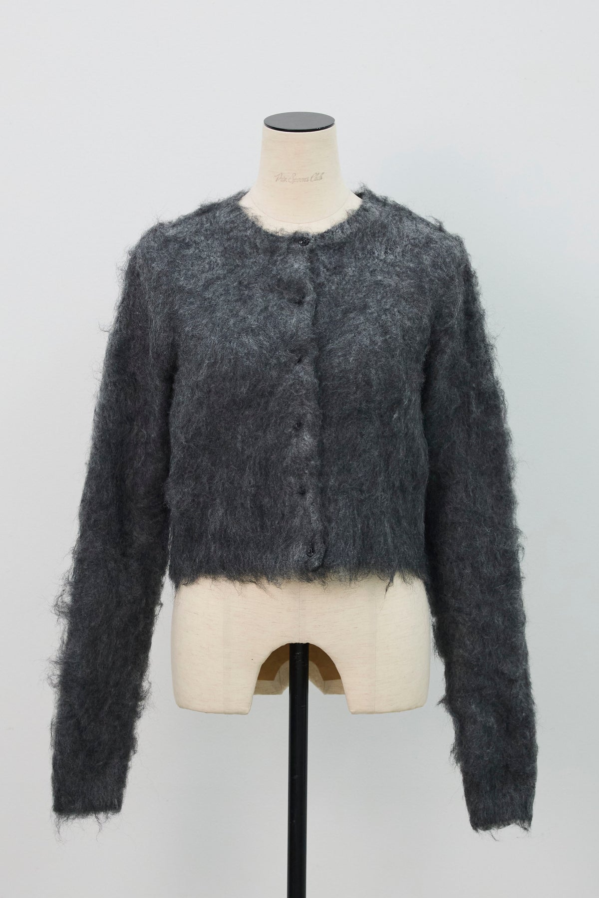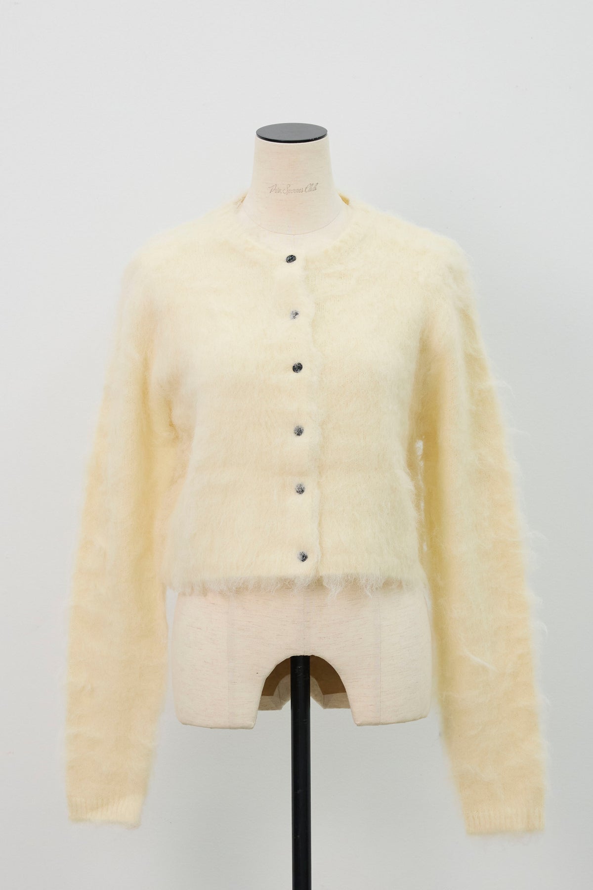ふわふわとした毛足が魅力のモヘアタッチカーディガン。 クロップド丈でバランスが取りやすく、ハイウエストボトムとも好相性。 軽やかな着心地ながら、シーズンムードをしっかり演出してくれます。 シンプルながら存在感のある質感で、一枚で着ても羽織っても主役になるアイテムです。