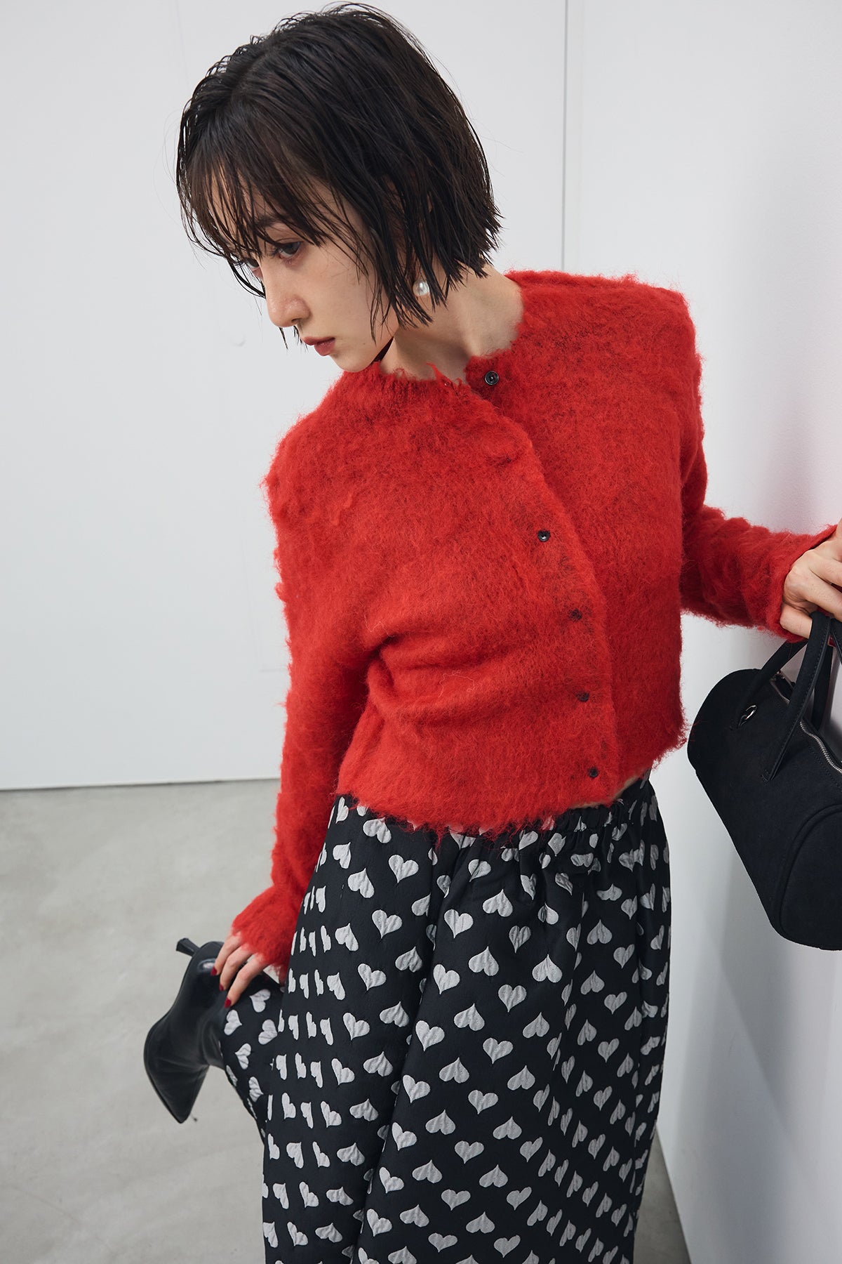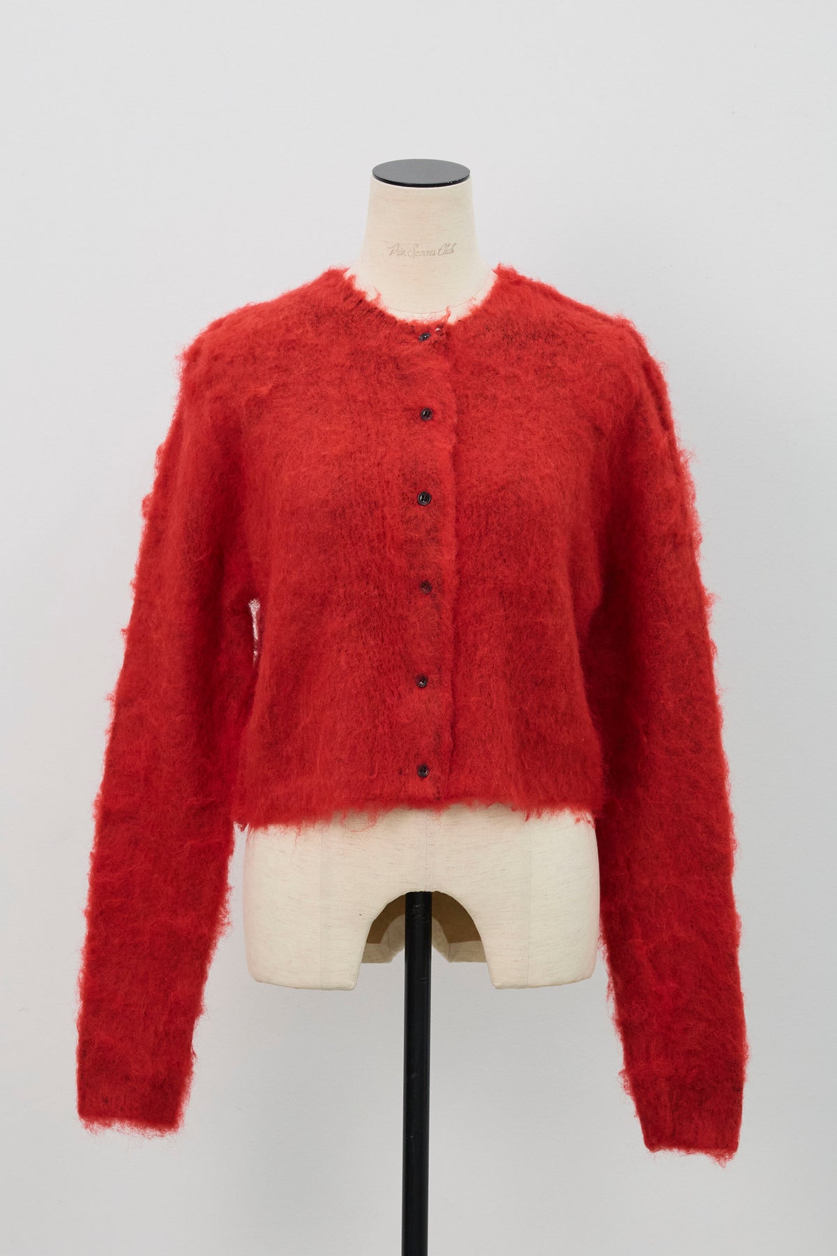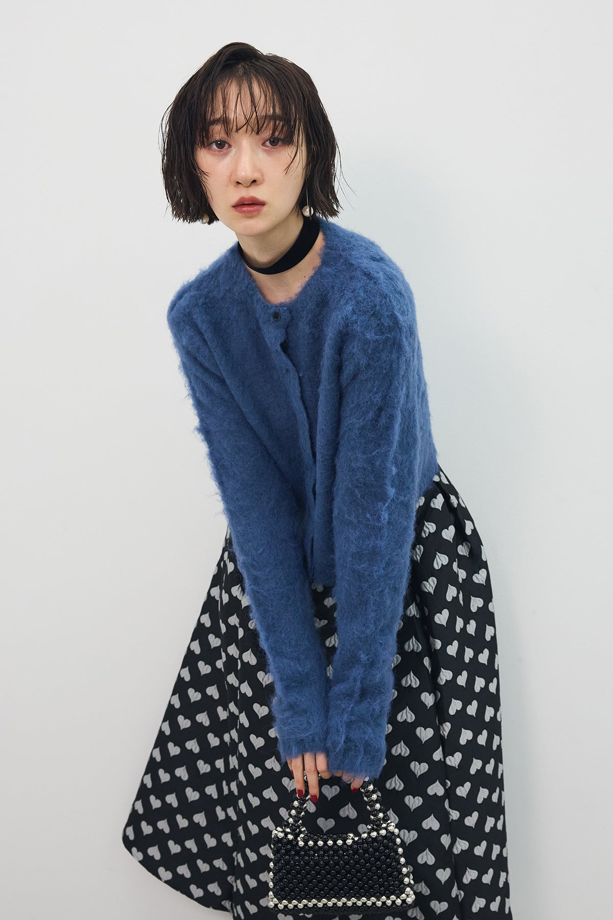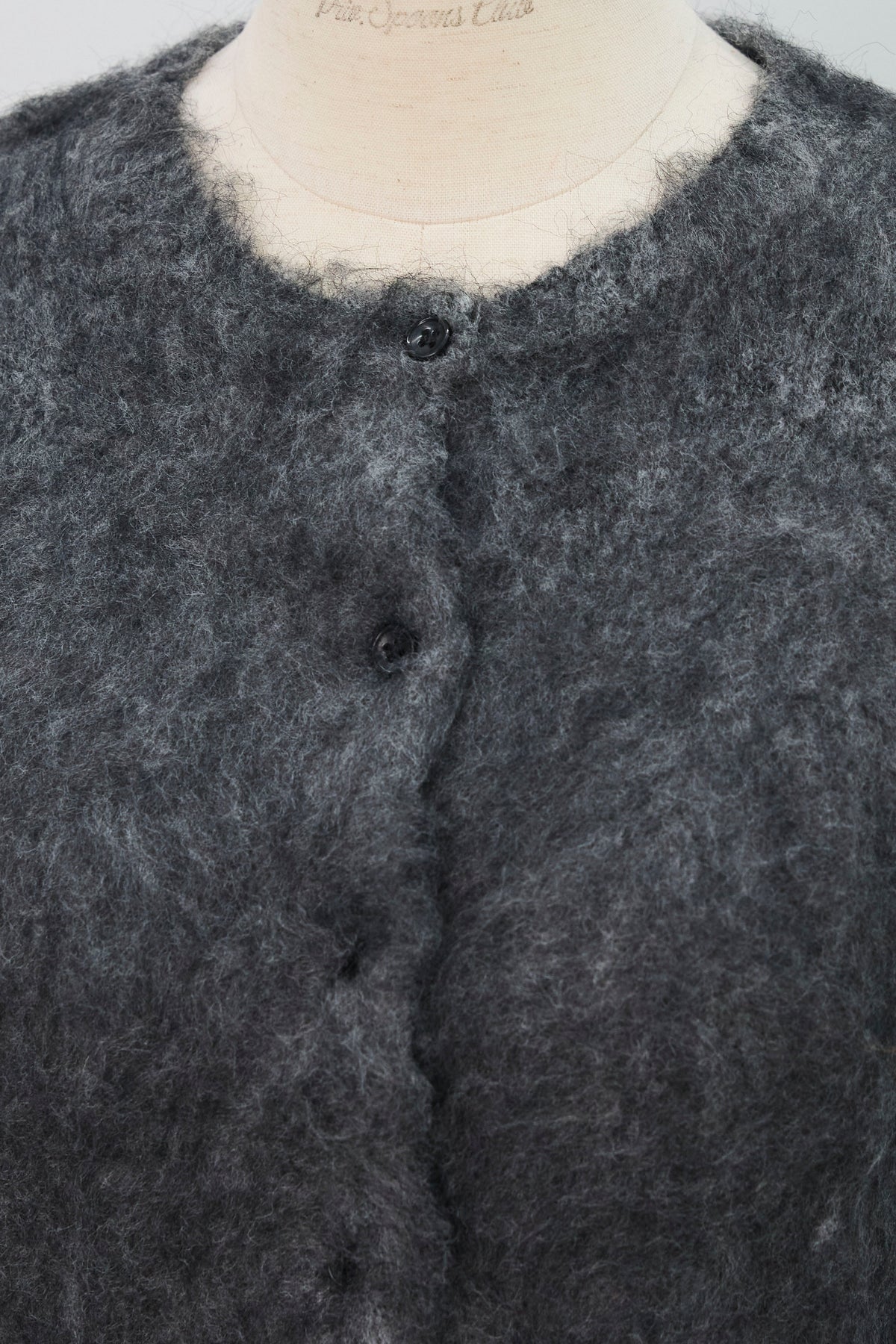 ふわふわとした毛足が魅力のモヘアタッチカーディガン。 クロップド丈でバランスが取りやすく、ハイウエストボトムとも好相性。 軽やかな着心地ながら、シーズンムードをしっかり演出してくれます。 シンプルながら存在感のある質感で、一枚で着ても羽織っても主役になるアイテムです。
