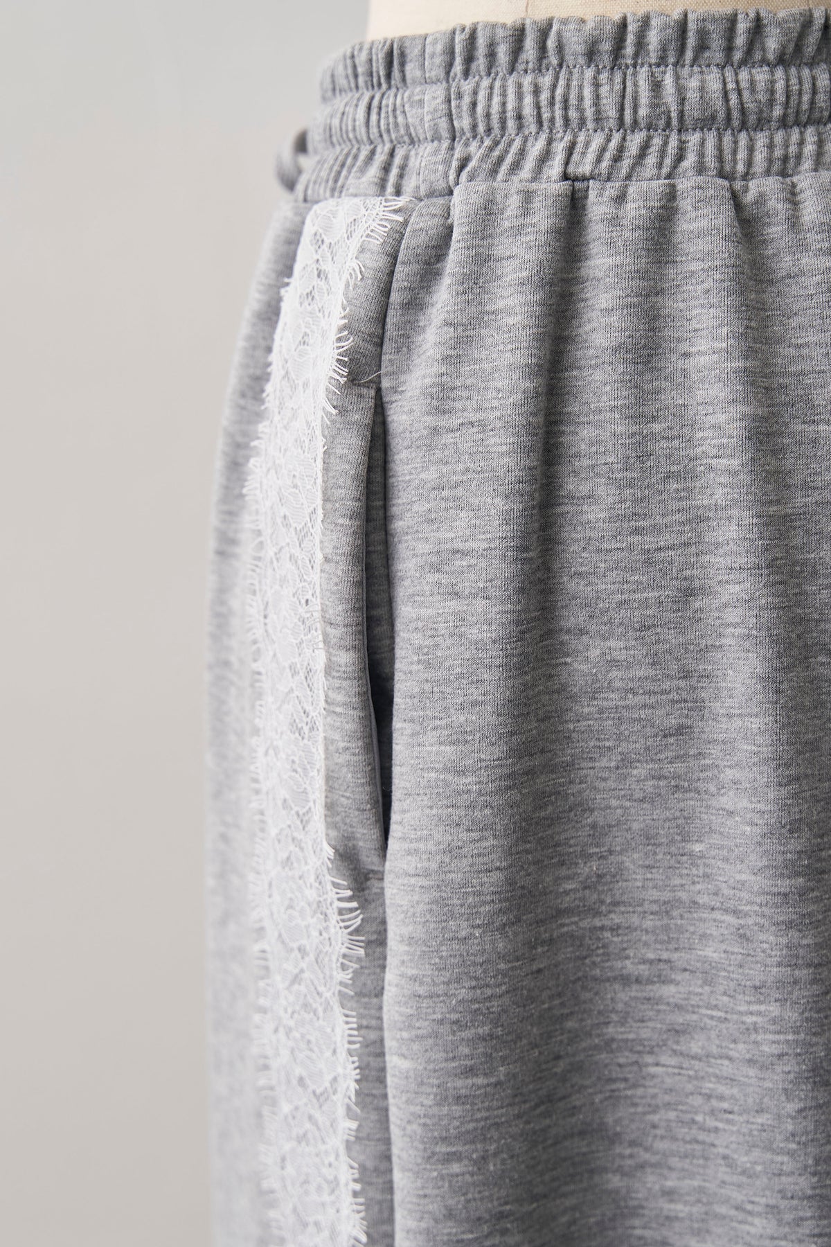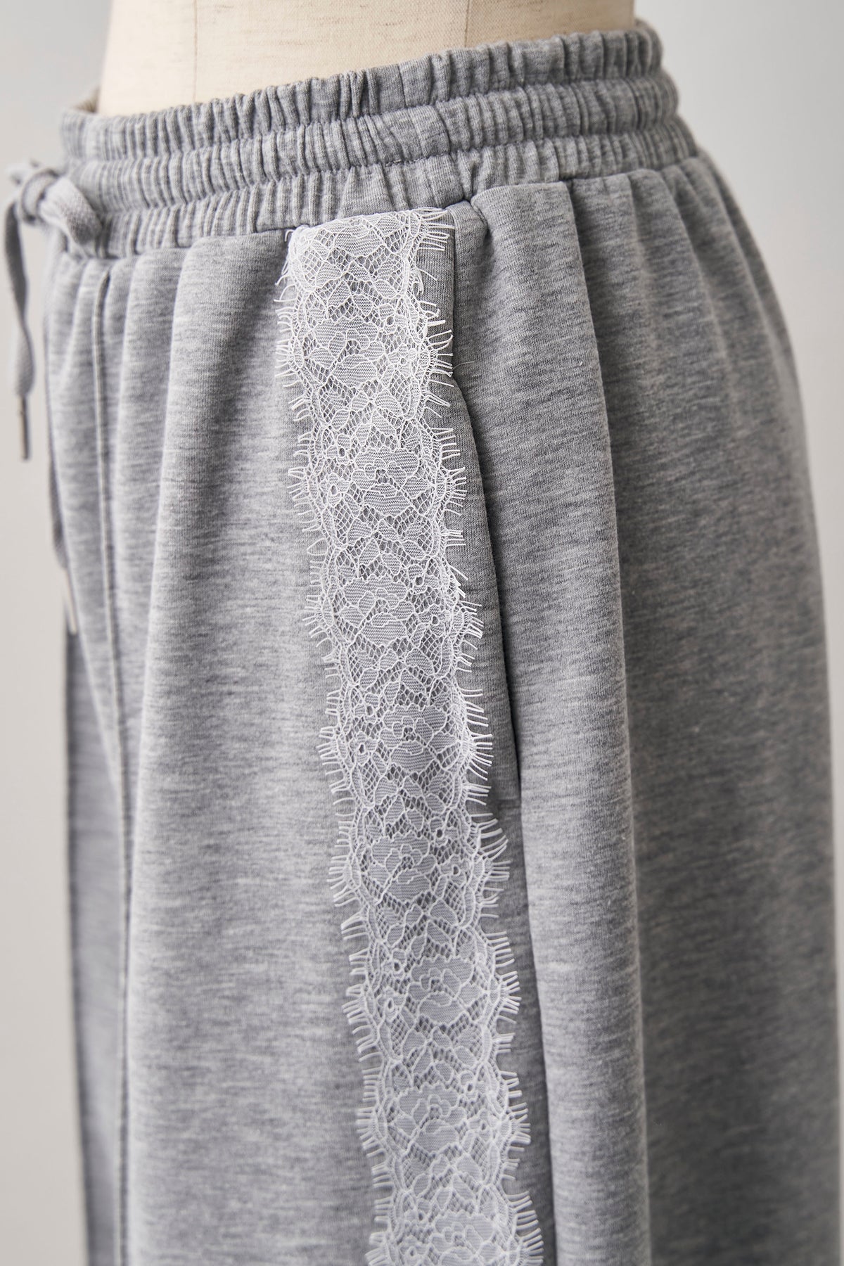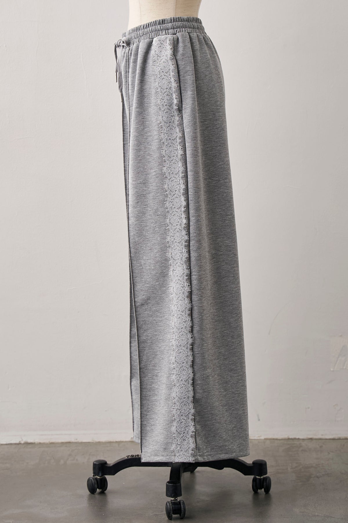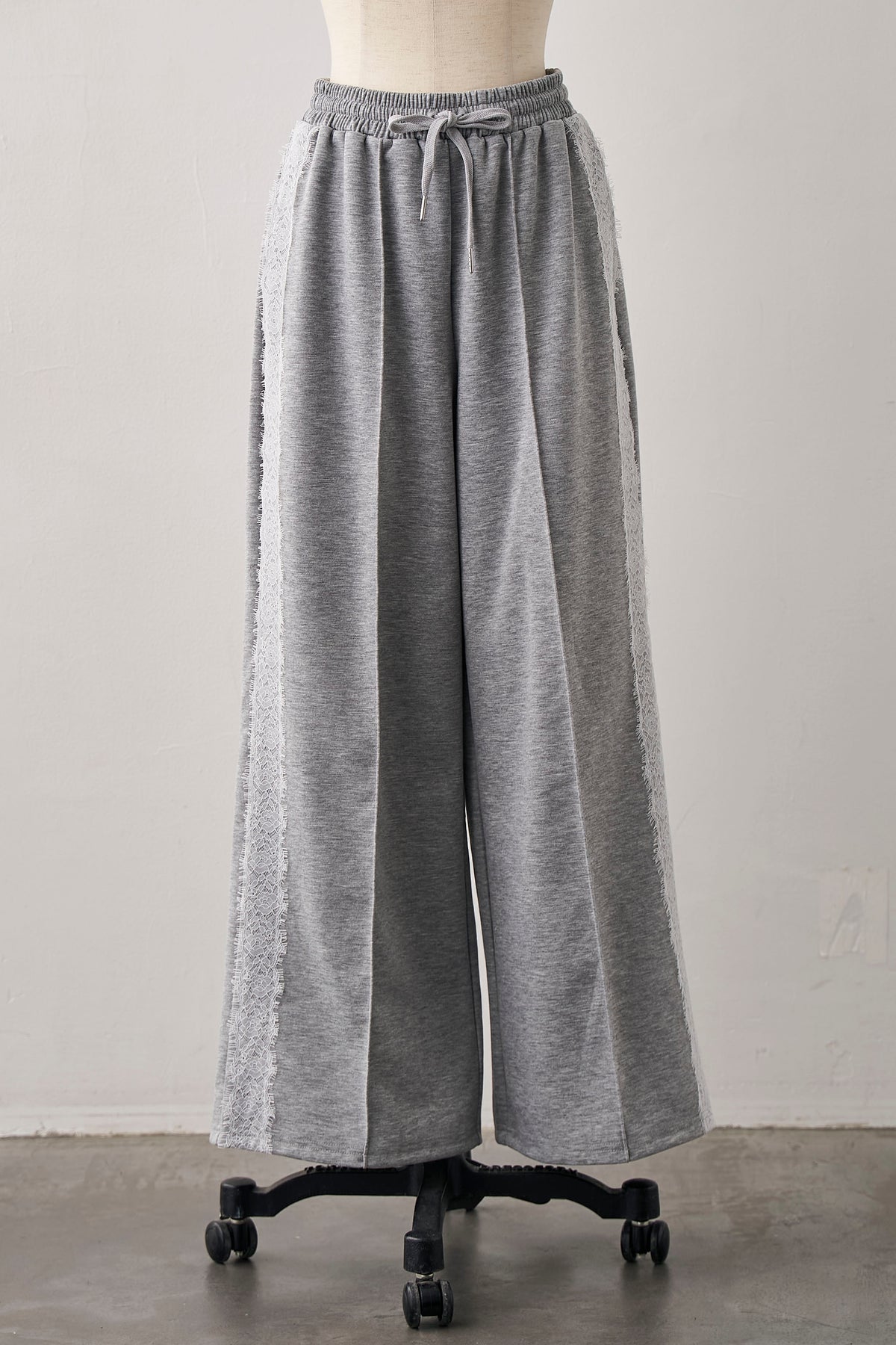 リラクシーなカットソー素材に、繊細なサイドレースをあしらった、大人の抜け感パンツ。 スポーティなサイドラインのデザインをレース素材で表現することで、カジュアルさの中にセンシュアルな女性らしさをプラスしました。センターピンタックが縦のラインを強調し、ワイドシルエットながらもルーズになりすぎず、すっきりとした美脚見えを実現。 Tシャツでラフに着るのも良いですが、ジャケットやフェミニンなブラウスと合わせた、感度の高いミックススタイルがおすすめです。