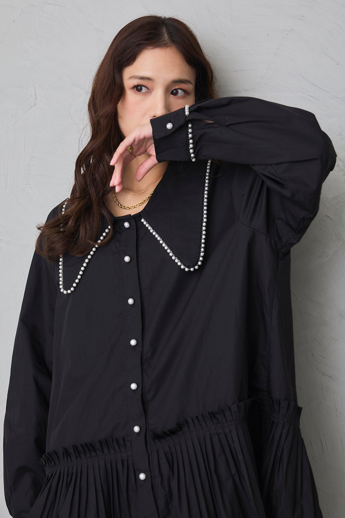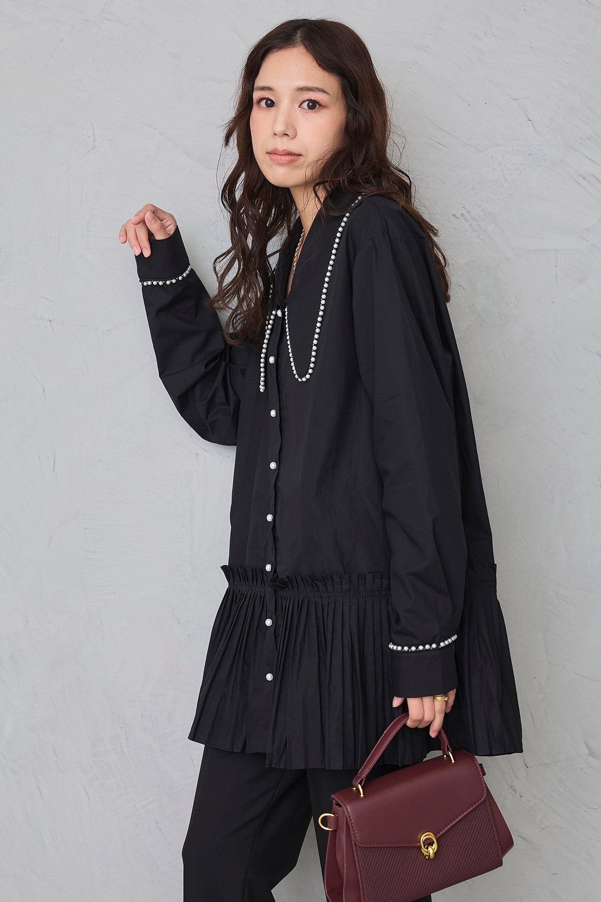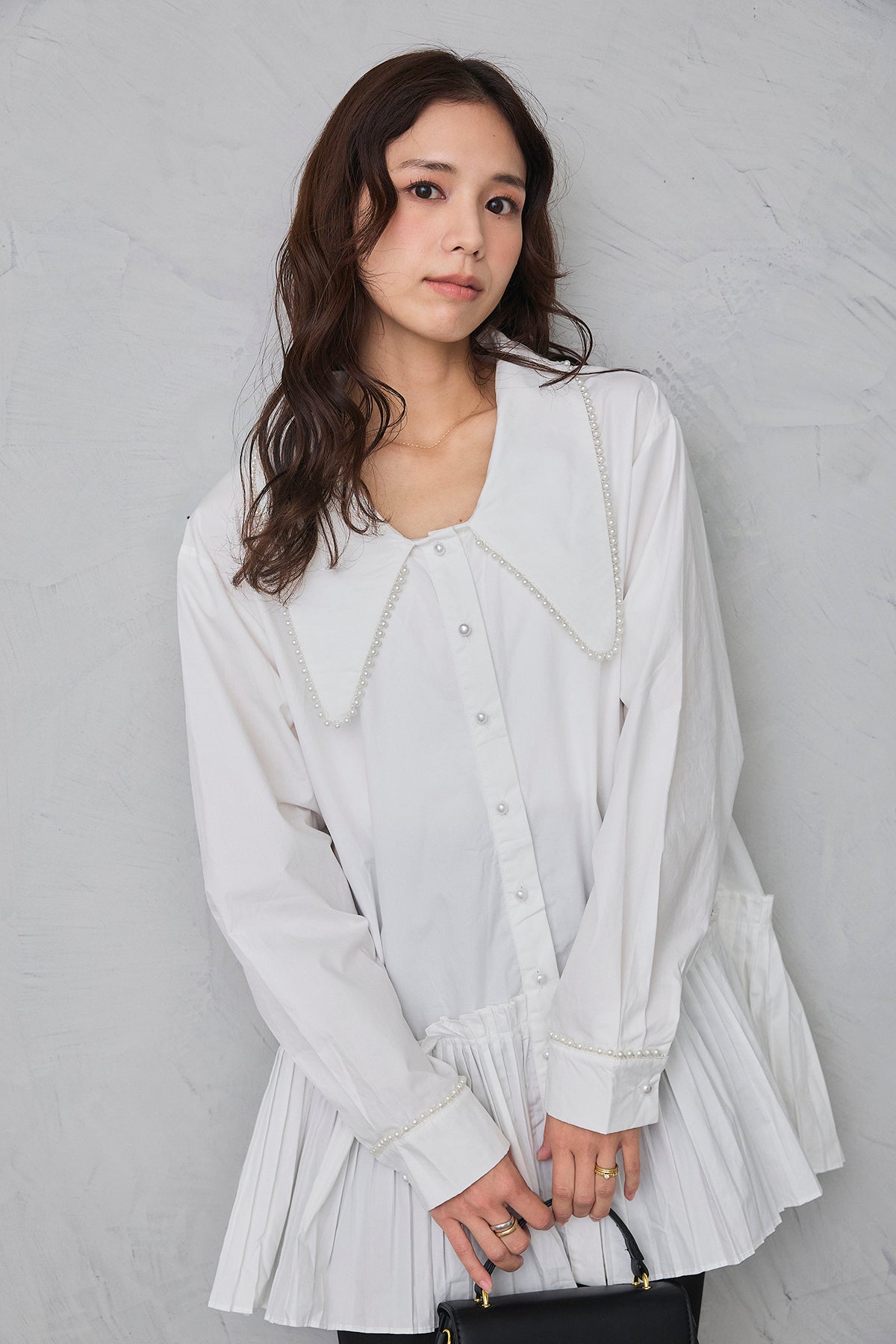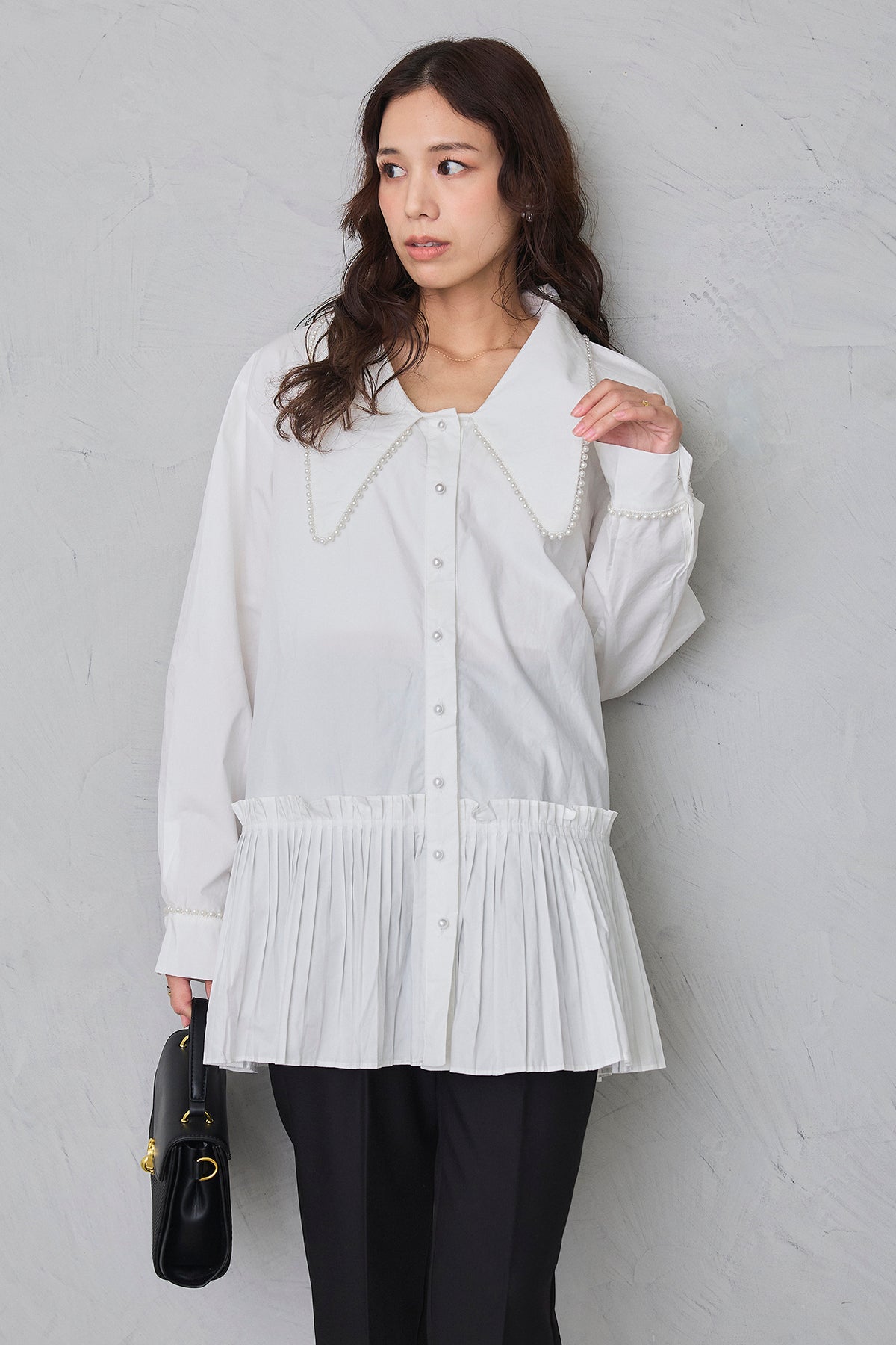 大きめのパールラインが印象的な襟と、裾に広がるプリーツが品よく華やぐシャツトップス。 軽やかな生地が揺れ、1枚でスタイルが決まる存在感のあるデザインです。 ボタンにもパールをあしらい、オケージョンシーンの装いを上品に格上げしてくれる一着です。