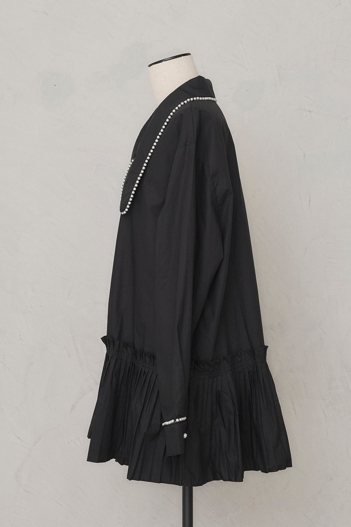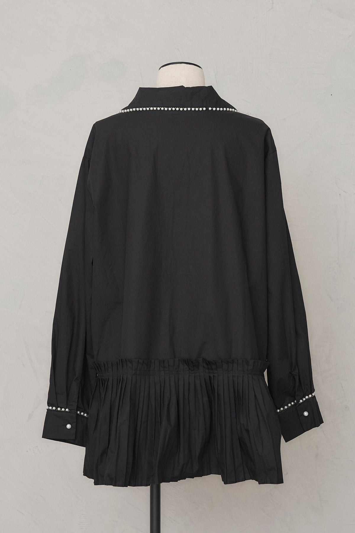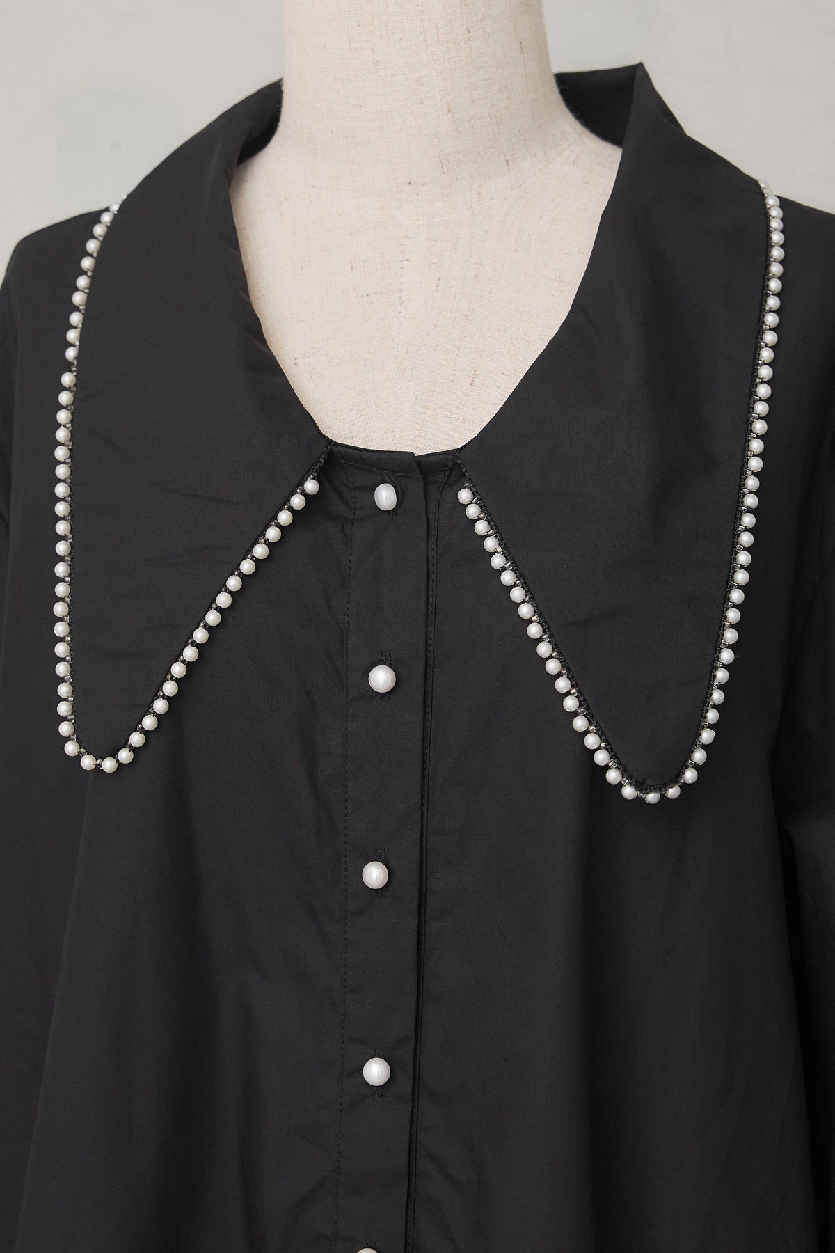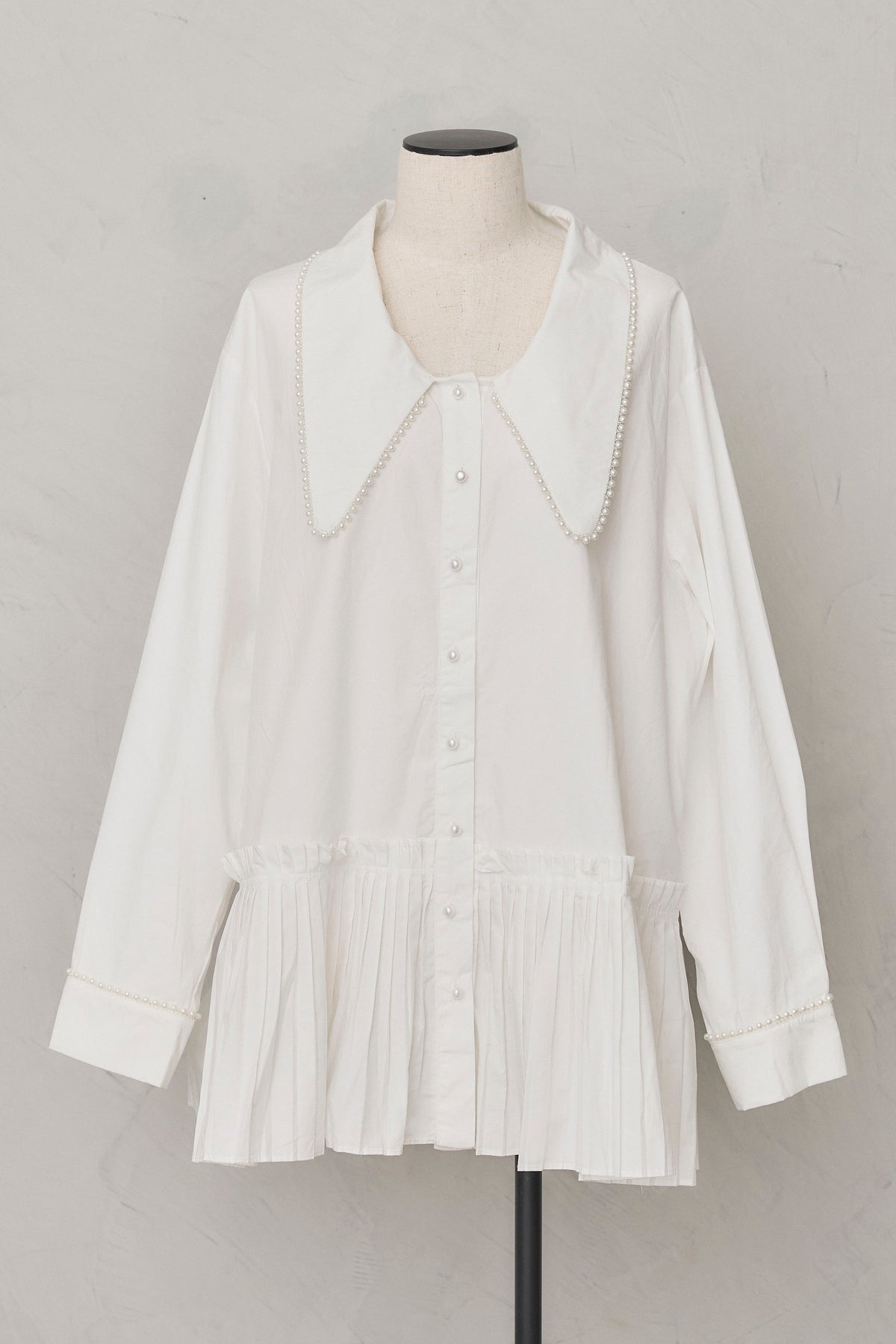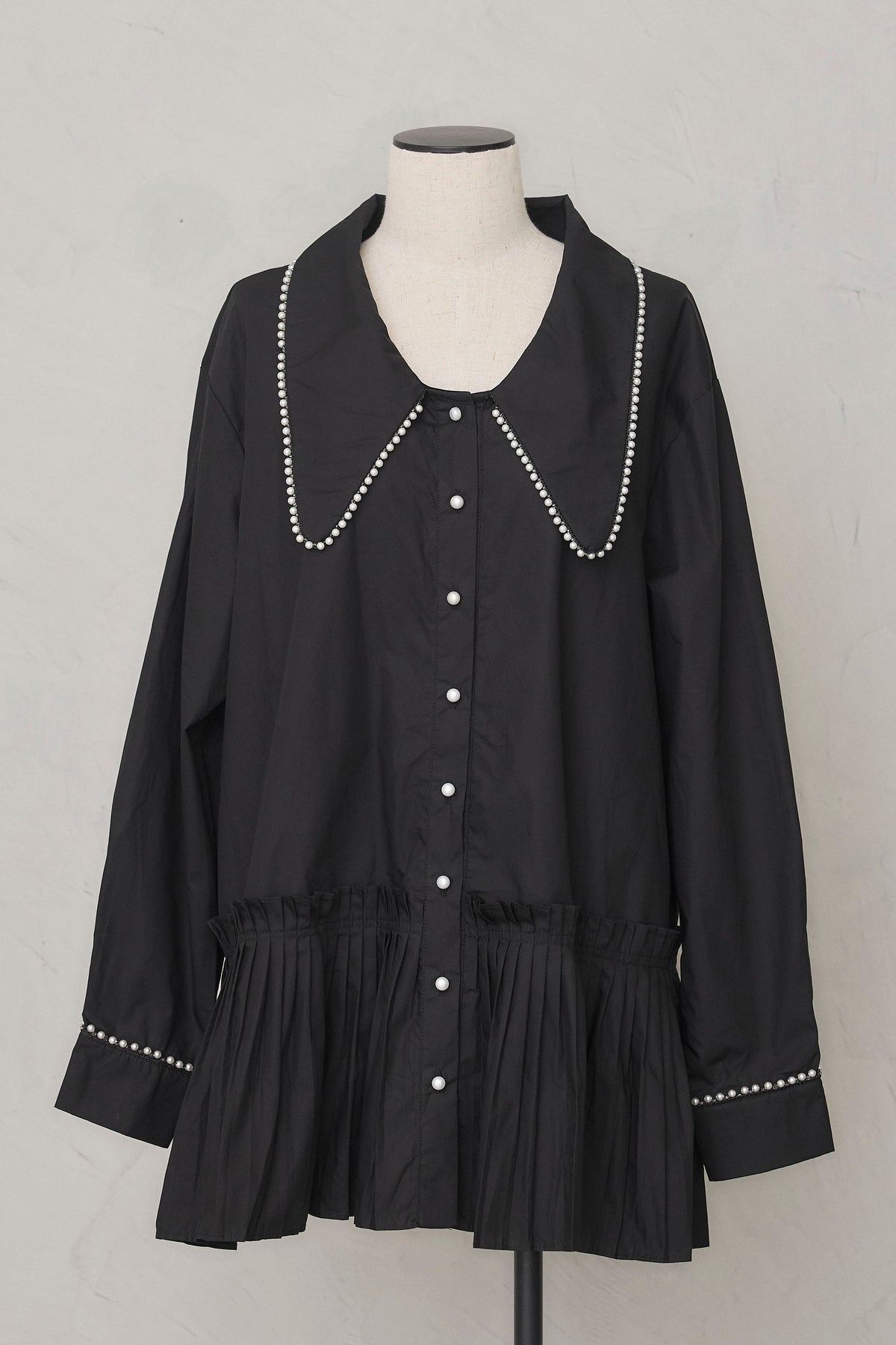 大きめのパールラインが印象的な襟と、裾に広がるプリーツが品よく華やぐシャツトップス。 軽やかな生地が揺れ、1枚でスタイルが決まる存在感のあるデザインです。 ボタンにもパールをあしらい、オケージョンシーンの装いを上品に格上げしてくれる一着です。