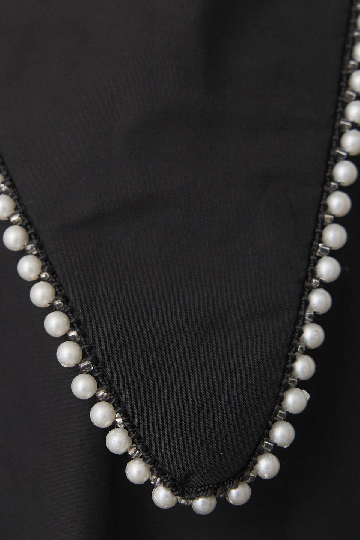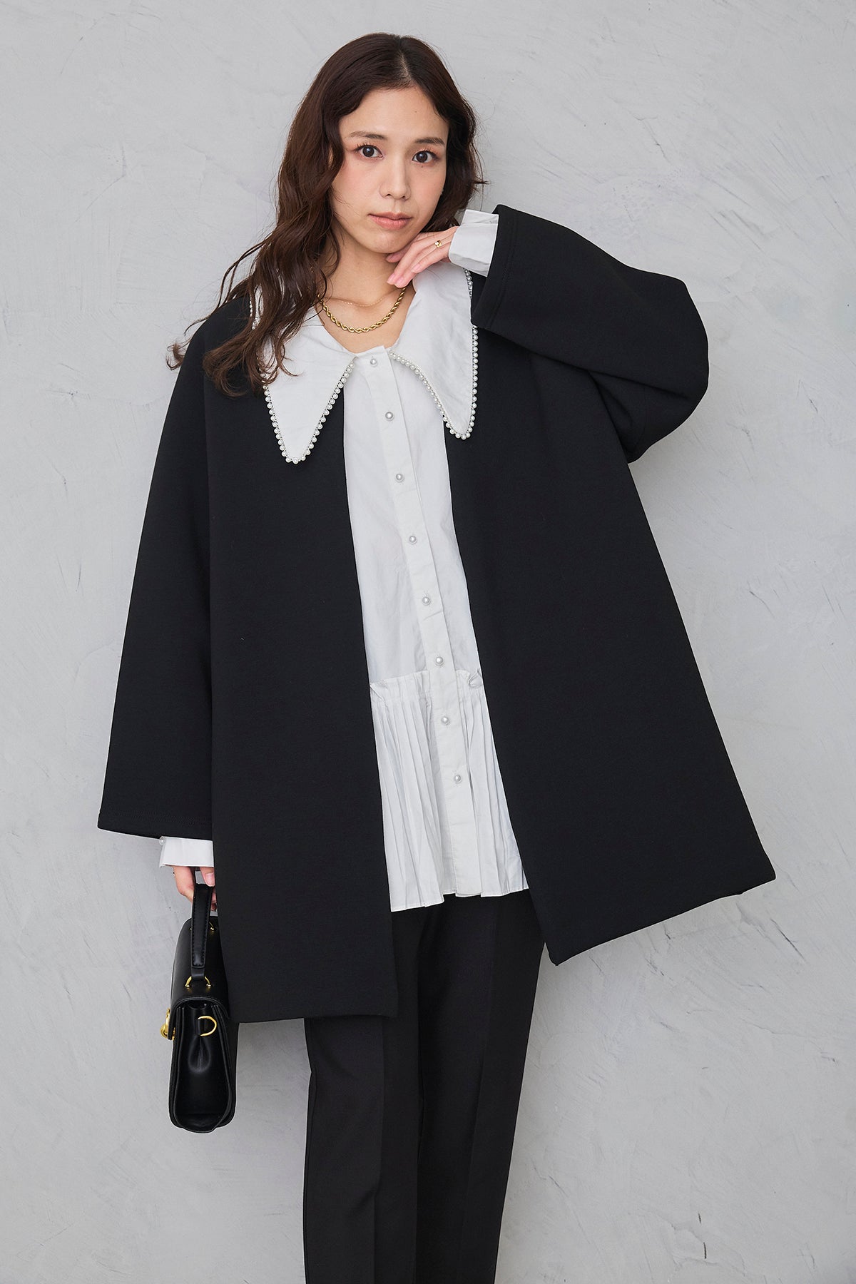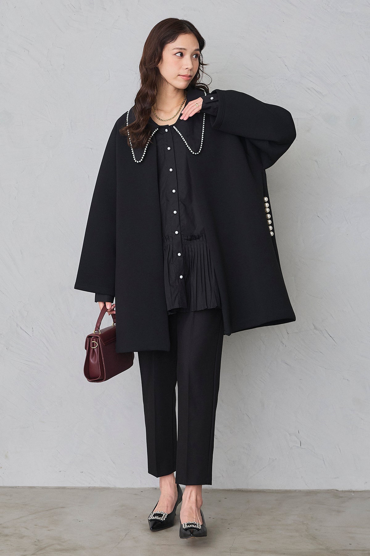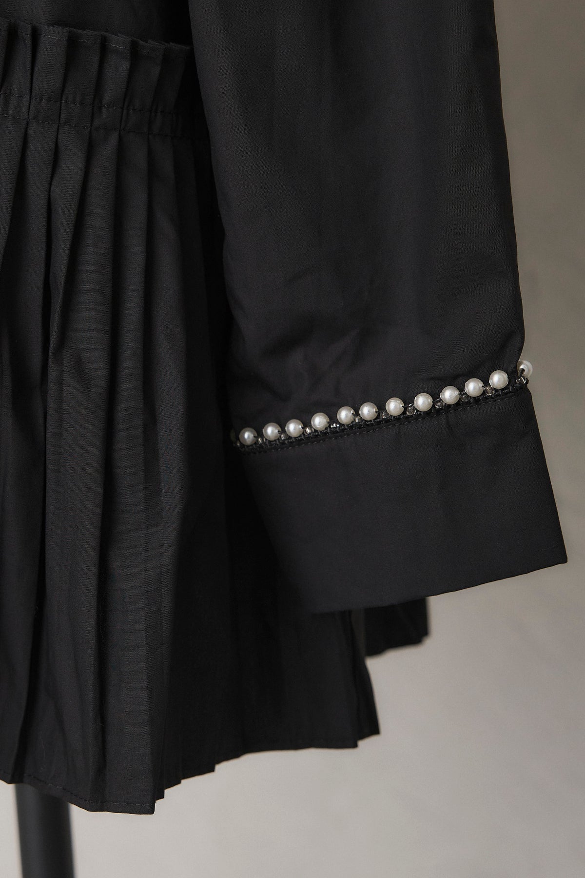 大きめのパールラインが印象的な襟と、裾に広がるプリーツが品よく華やぐシャツトップス。 軽やかな生地が揺れ、1枚でスタイルが決まる存在感のあるデザインです。 ボタンにもパールをあしらい、オケージョンシーンの装いを上品に格上げしてくれる一着です。