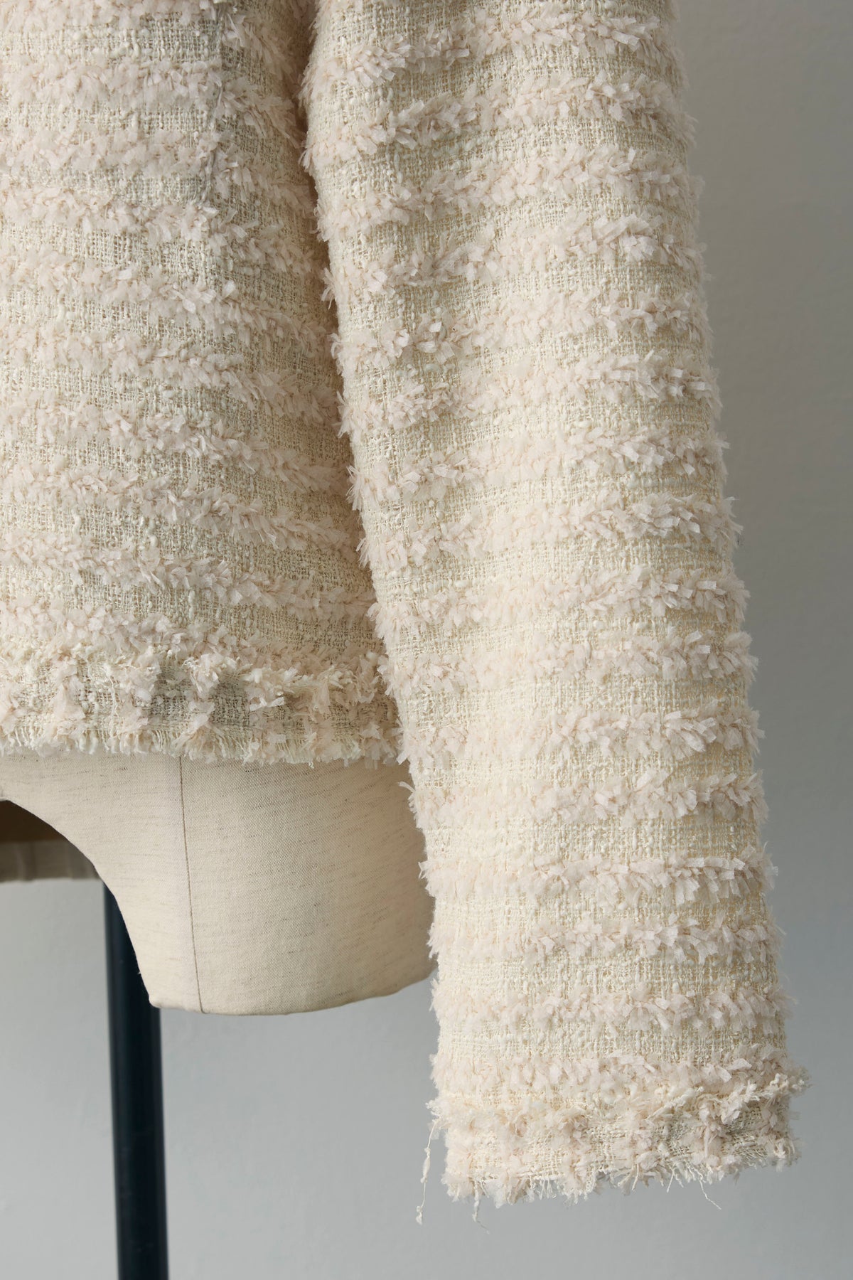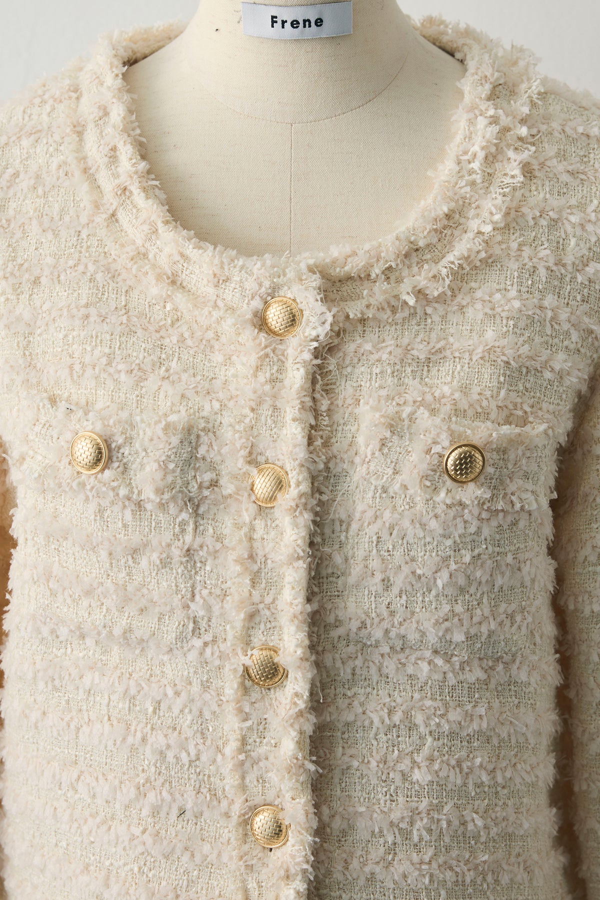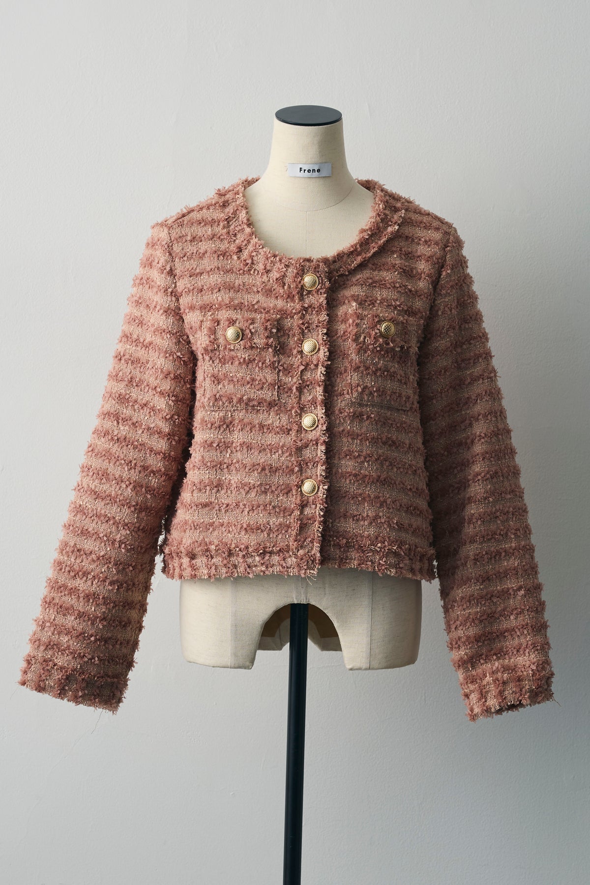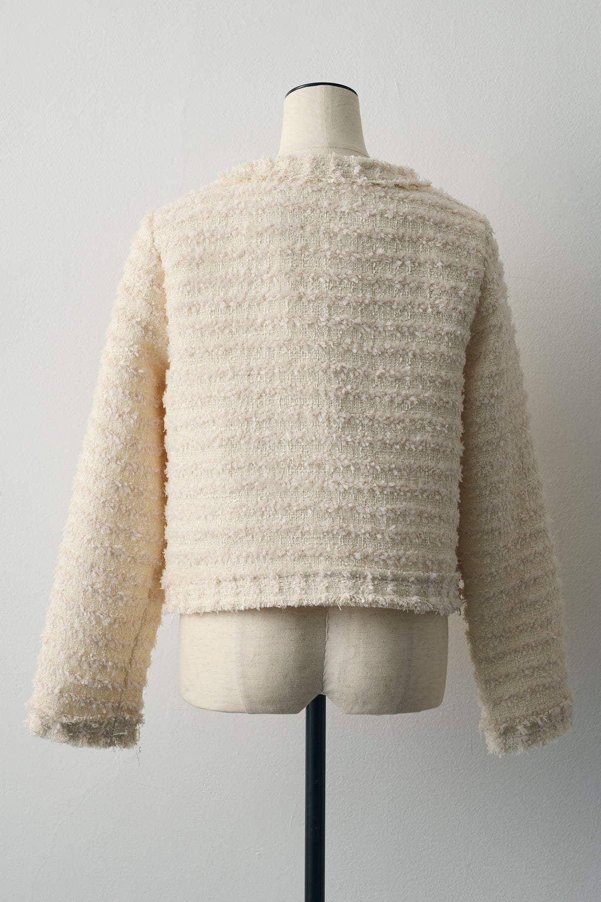 程よく立体感のあるツイードに、丸みのあるクルーネックとゴールドボタンを効かせた一枚。短め丈でバランスが取りやすく、シャツやワンピの上から羽織るだけでコーデがきちんと見え。デニムでカジュアルに、スラックスでお出かけにも。