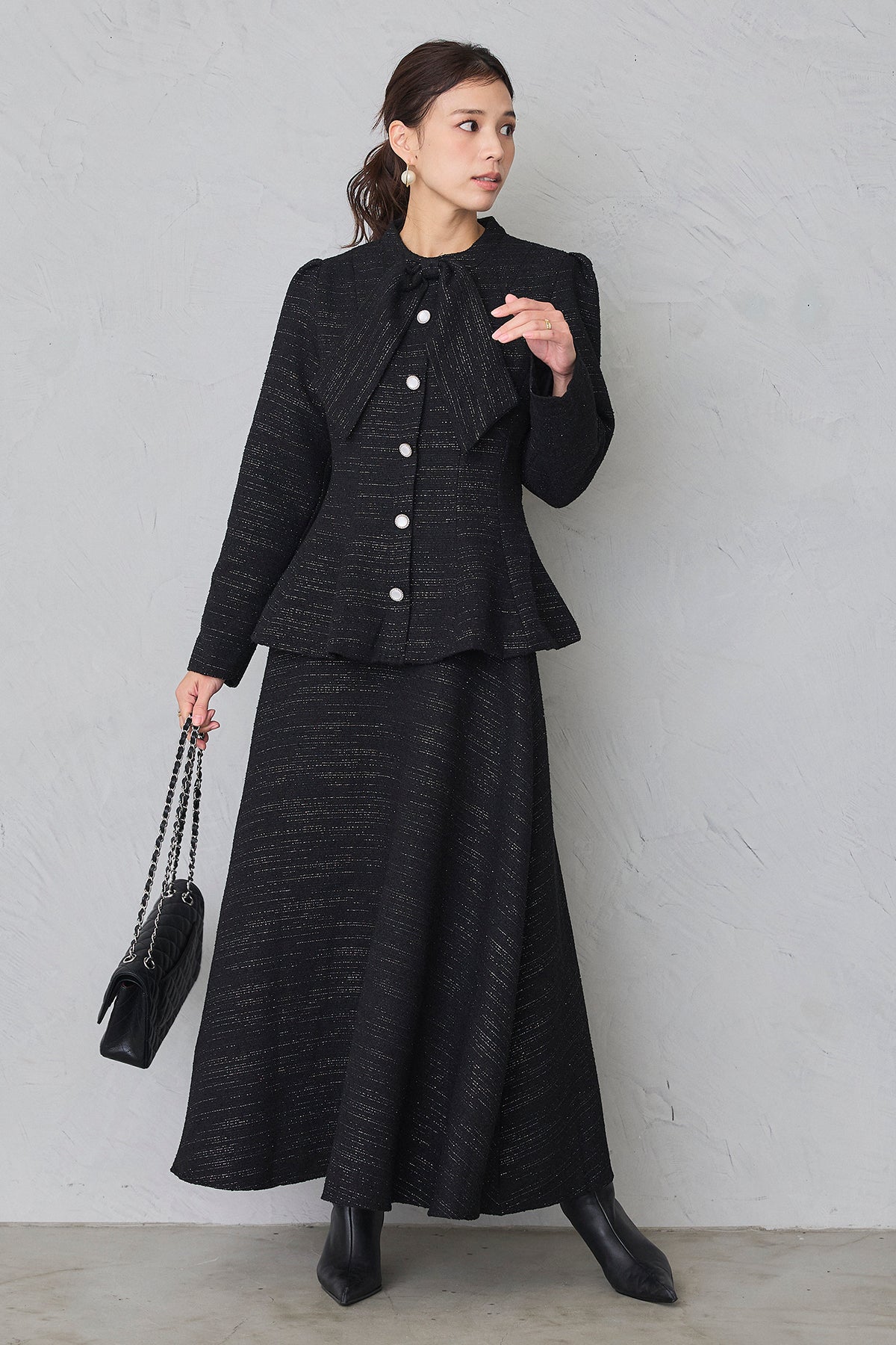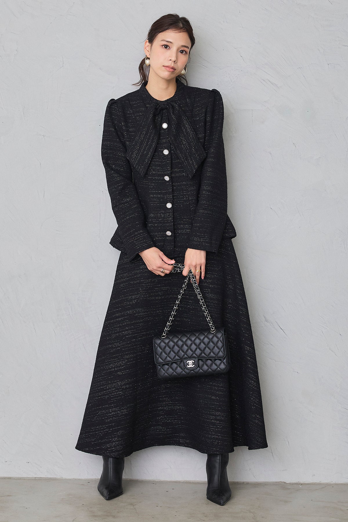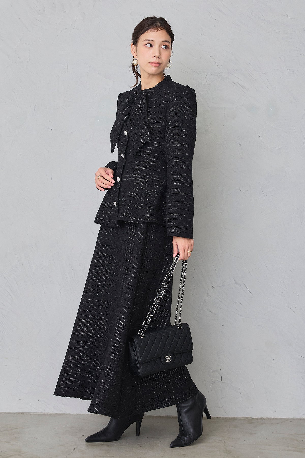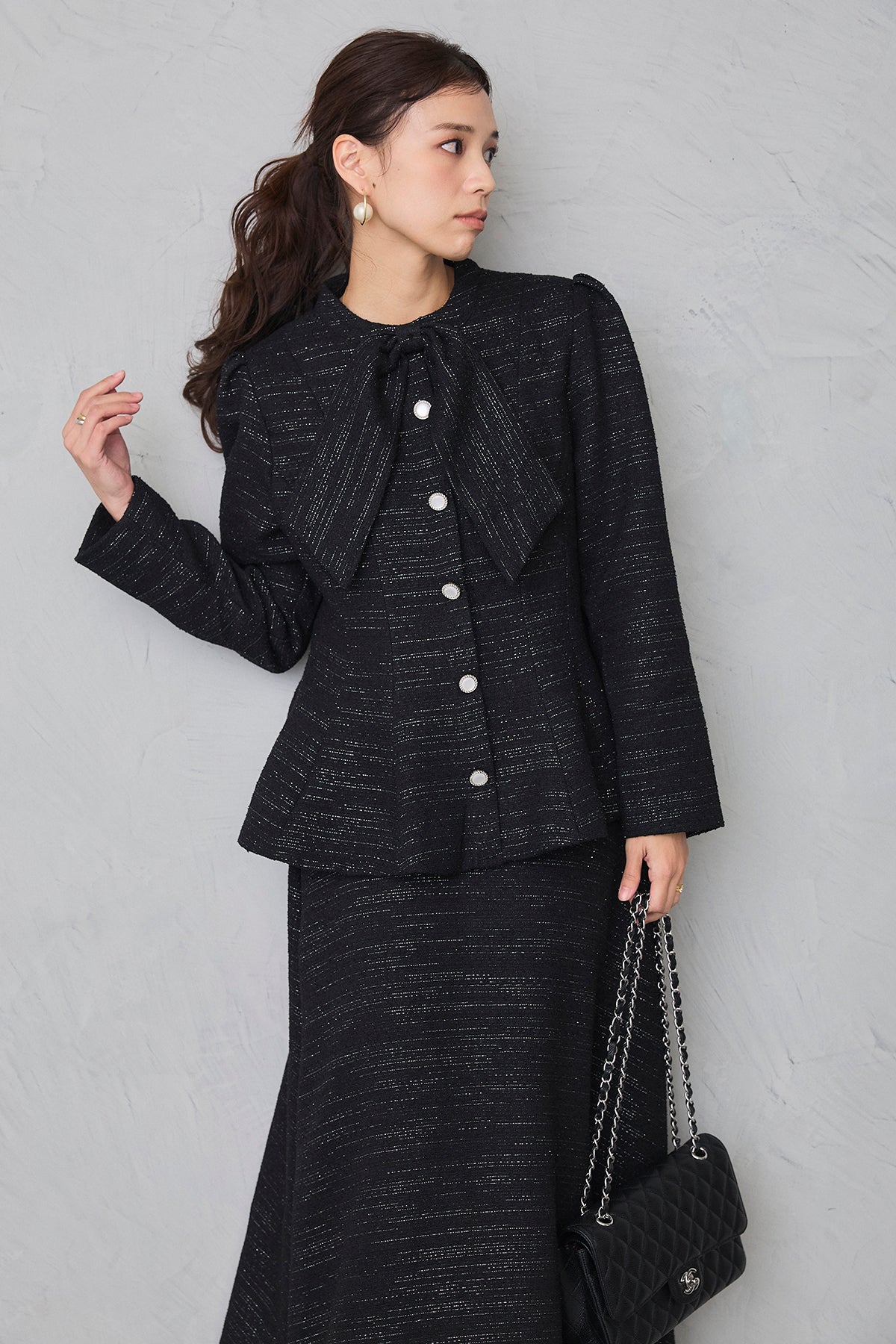 華やかなツイードを贅沢に使用し、立体的なプリンセスラインで上品に仕上げたセットアップ。 大きめのリボンタイとパール調ボタンがクラシカルな存在感を放ち、着るだけで洗練されたフォーマルスタイルが完成します。 ジャケットとスカートは単品使いもでき、オケージョンから特別なお出かけまで幅広く活躍する一着です。