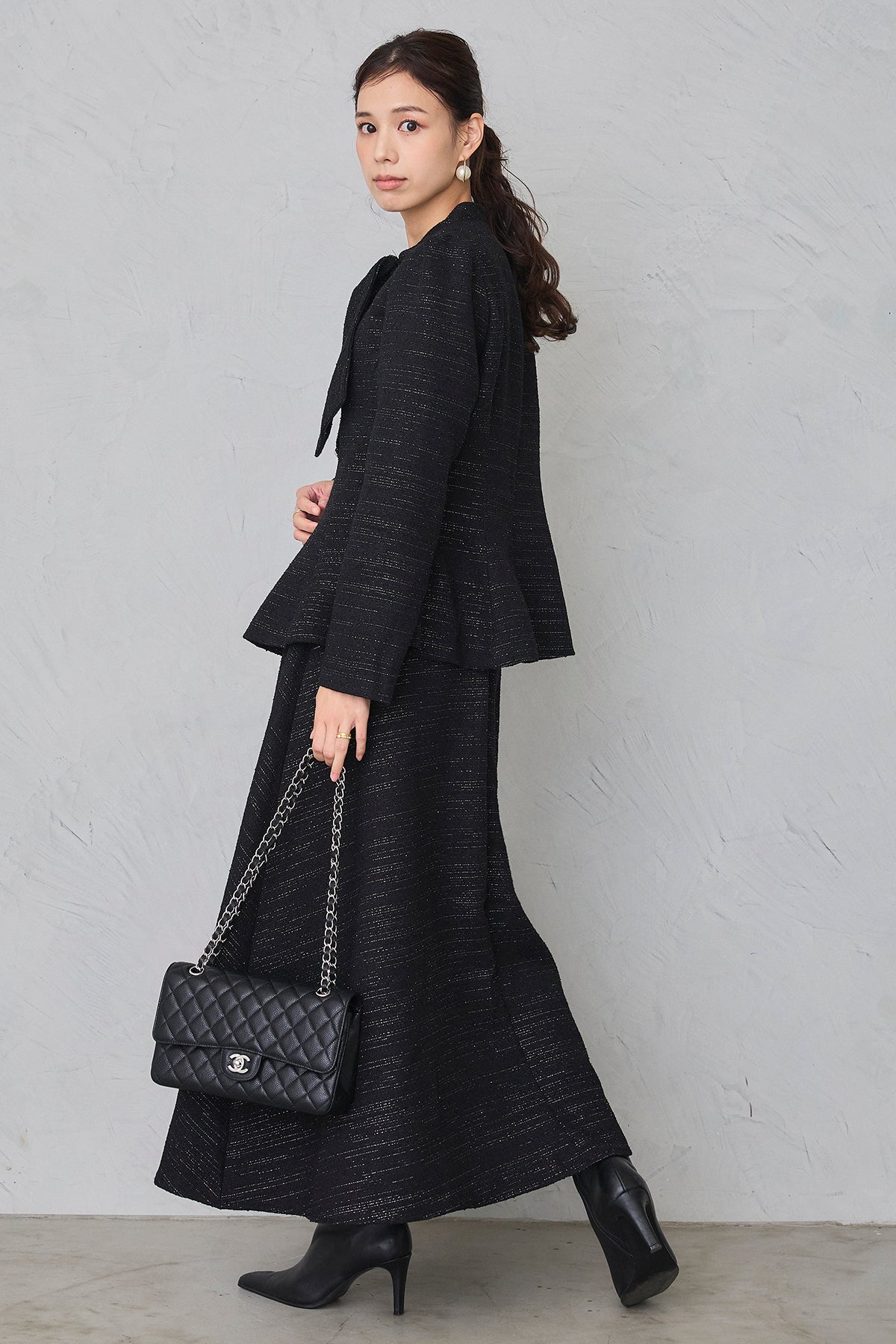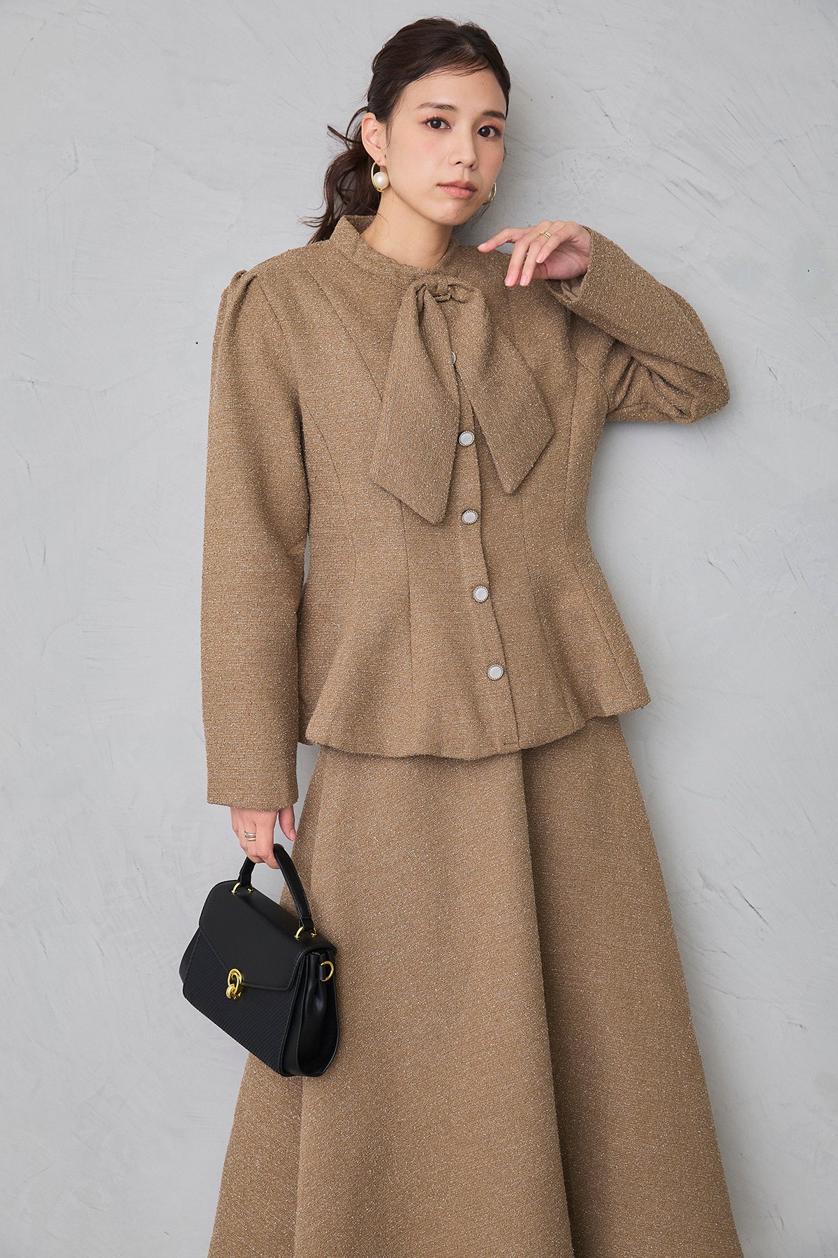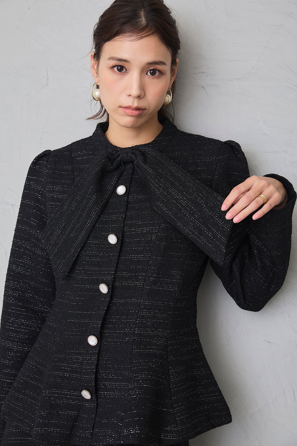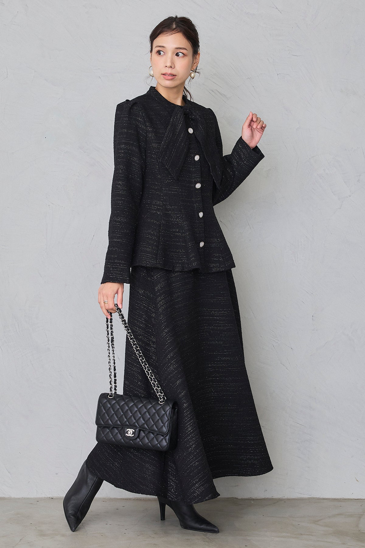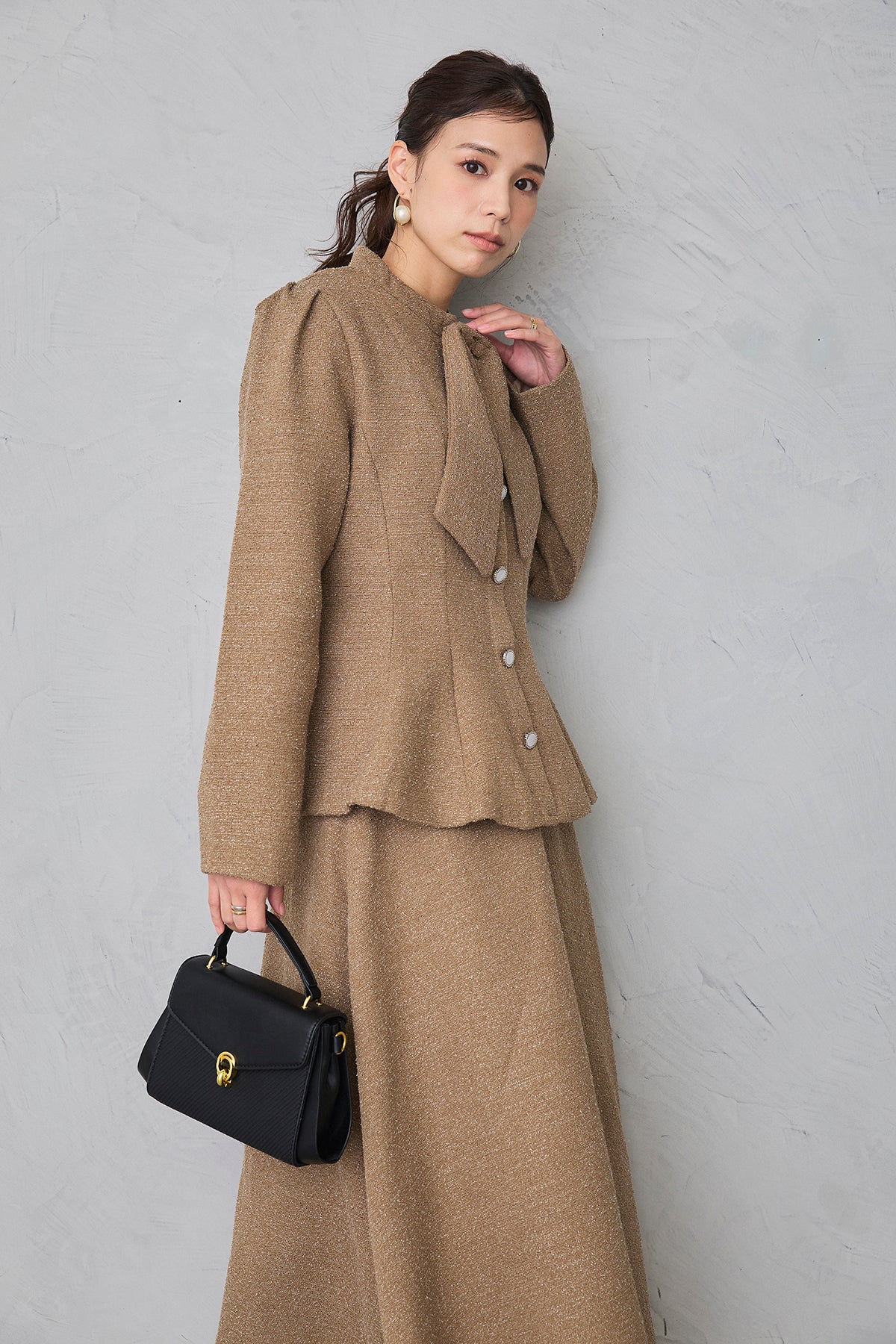 華やかなツイードを贅沢に使用し、立体的なプリンセスラインで上品に仕上げたセットアップ。 大きめのリボンタイとパール調ボタンがクラシカルな存在感を放ち、着るだけで洗練されたフォーマルスタイルが完成します。 ジャケットとスカートは単品使いもでき、オケージョンから特別なお出かけまで幅広く活躍する一着です。