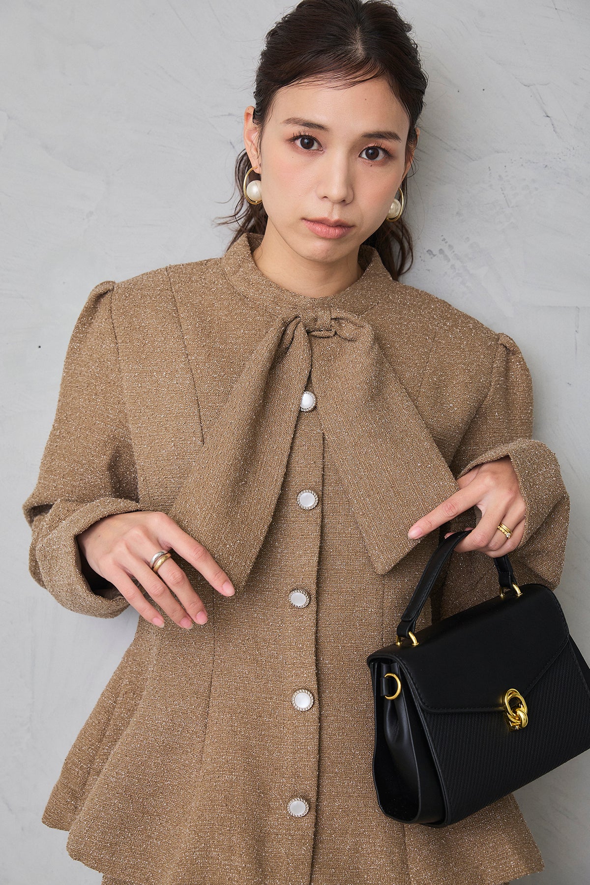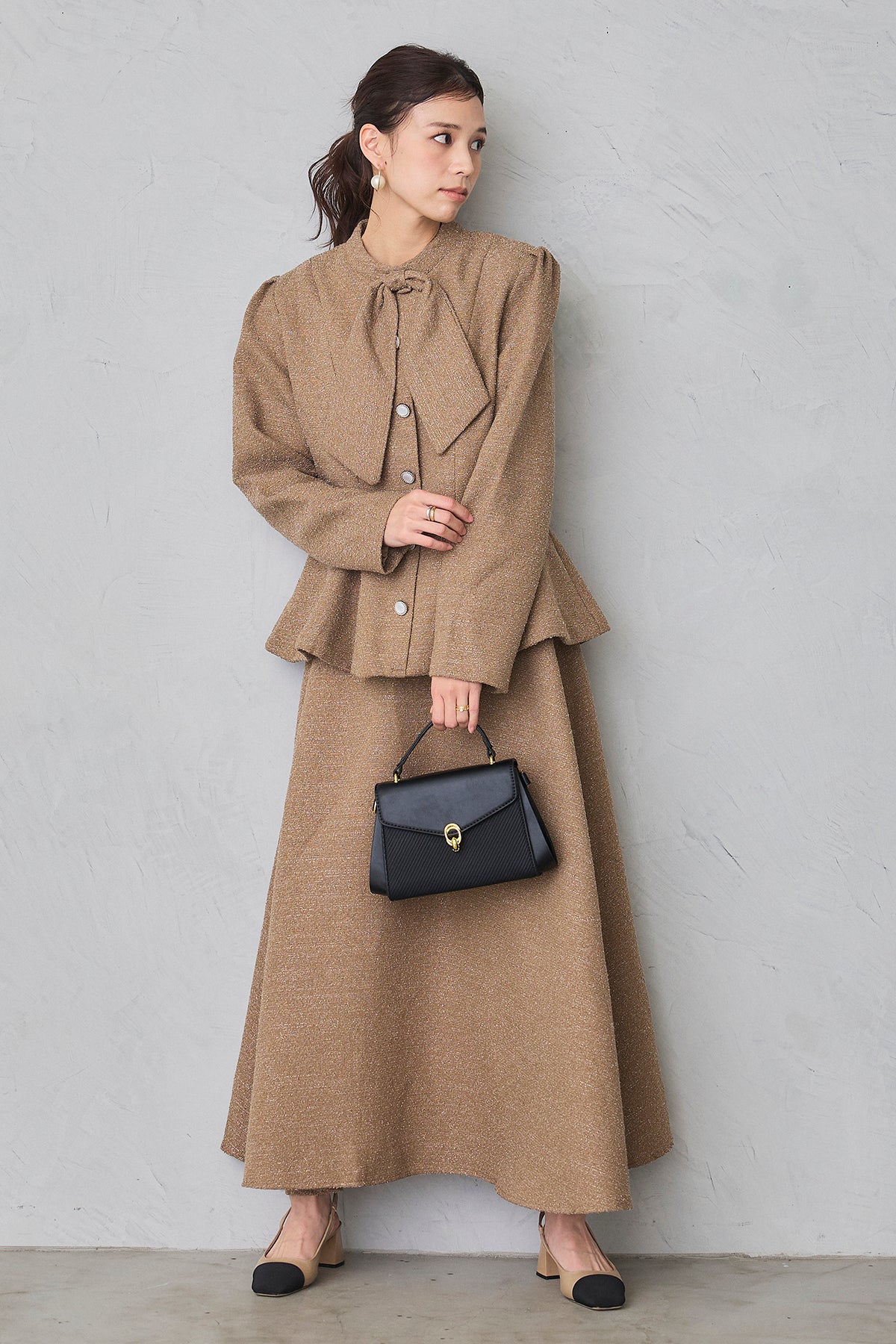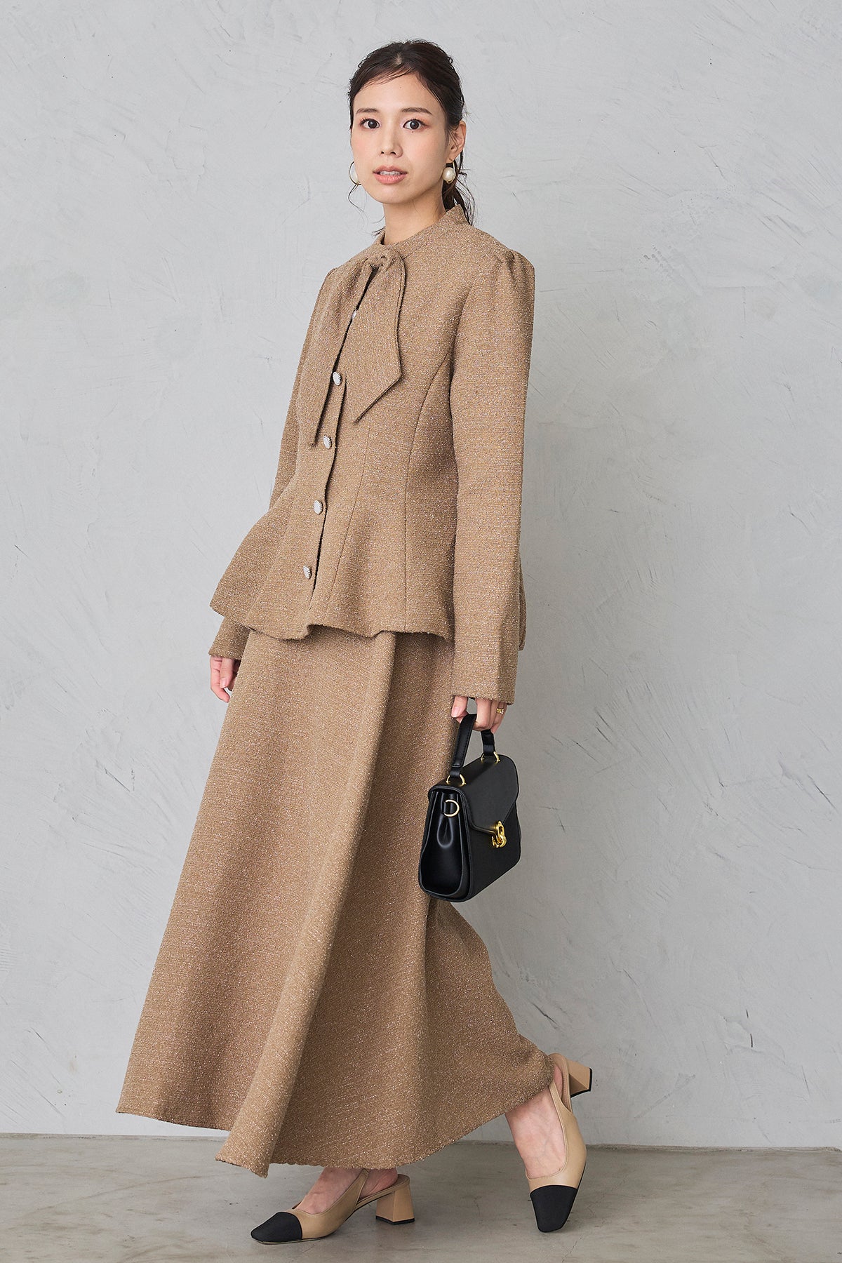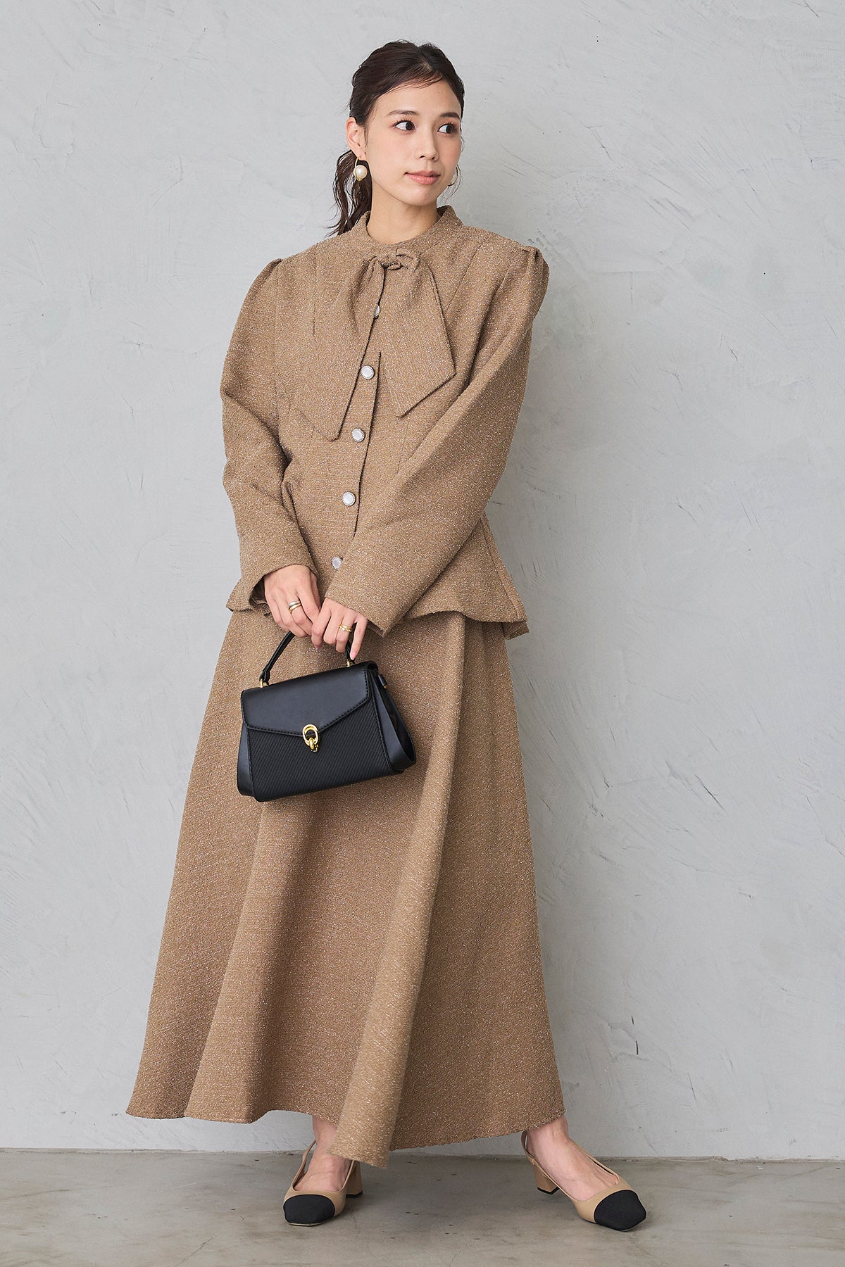華やかなツイードを贅沢に使用し、立体的なプリンセスラインで上品に仕上げたセットアップ。 大きめのリボンタイとパール調ボタンがクラシカルな存在感を放ち、着るだけで洗練されたフォーマルスタイルが完成します。 ジャケットとスカートは単品使いもでき、オケージョンから特別なお出かけまで幅広く活躍する一着です。