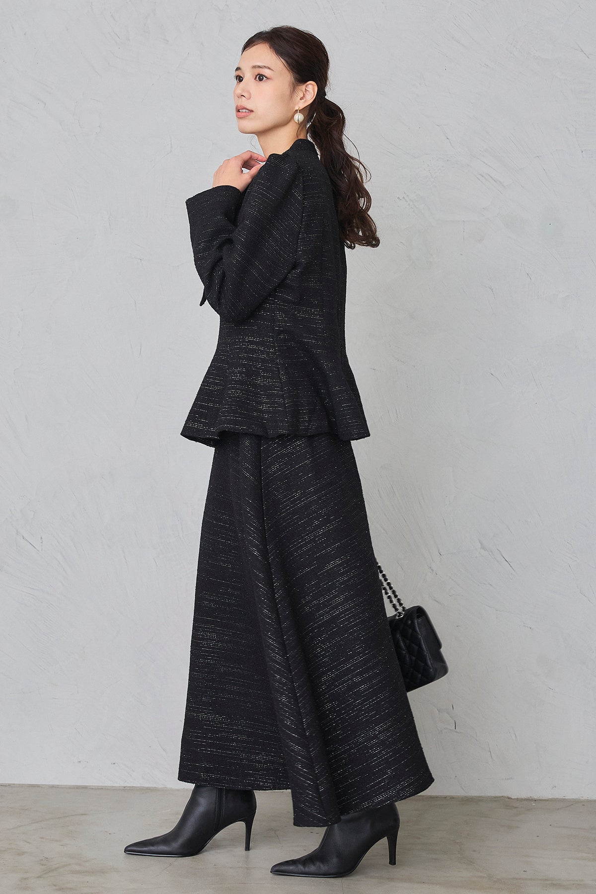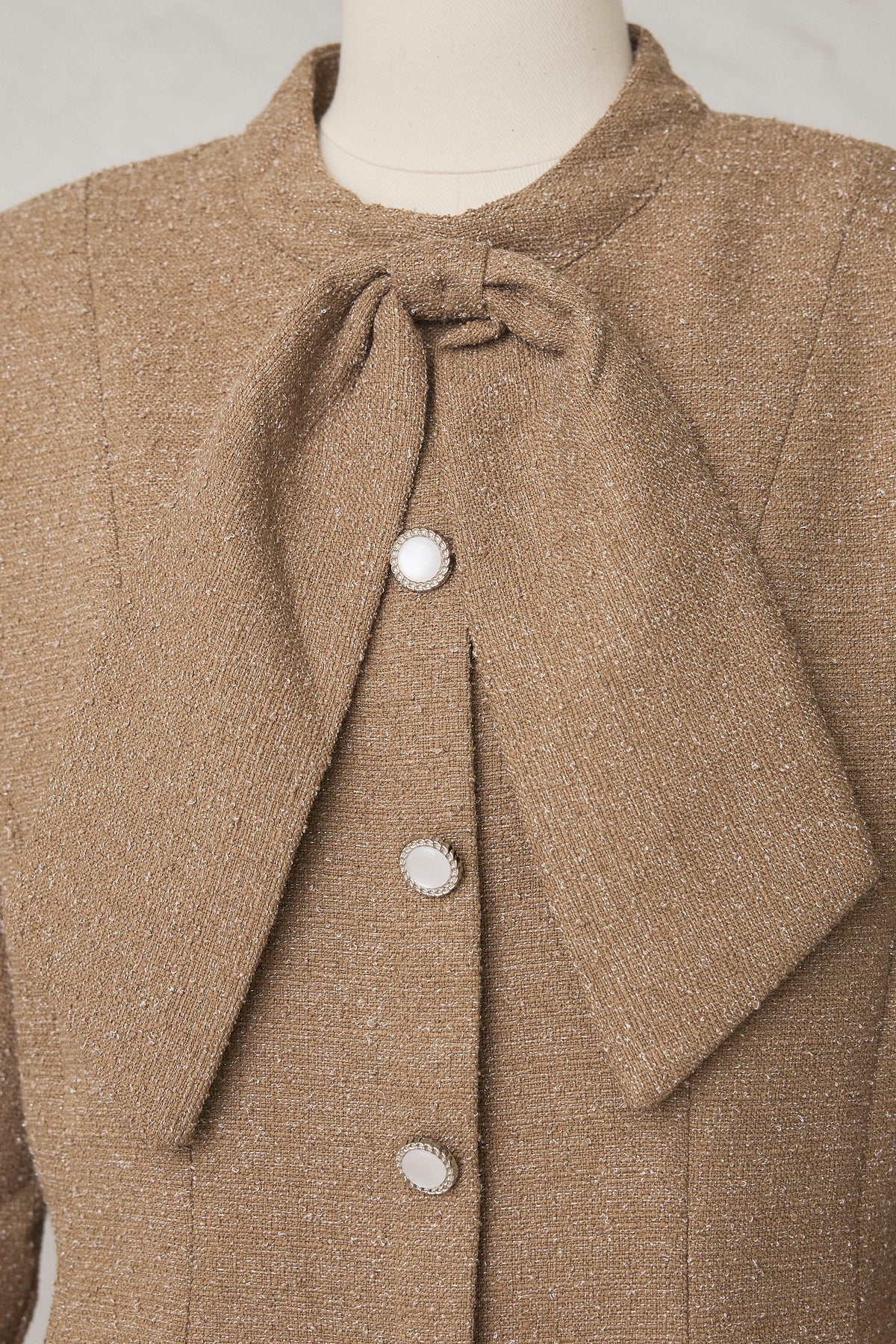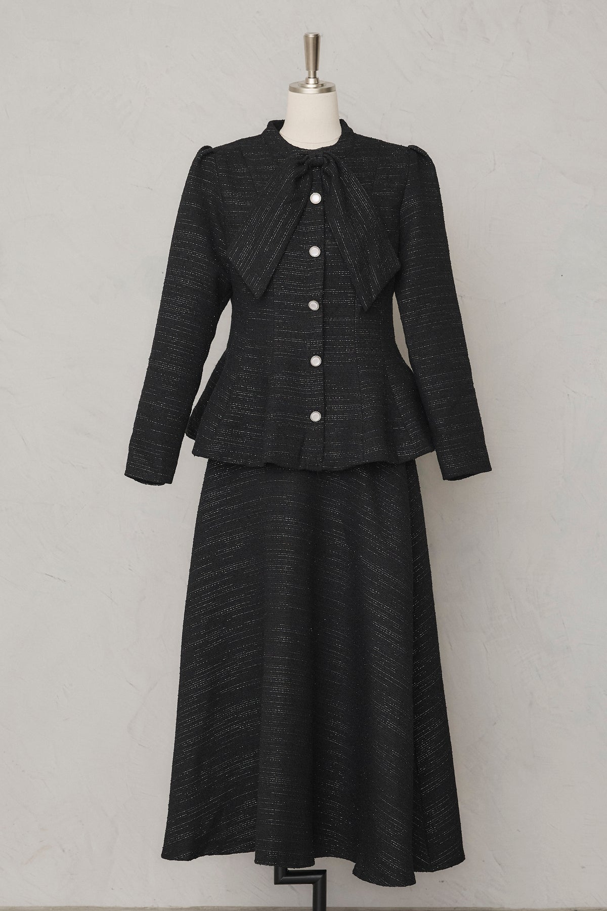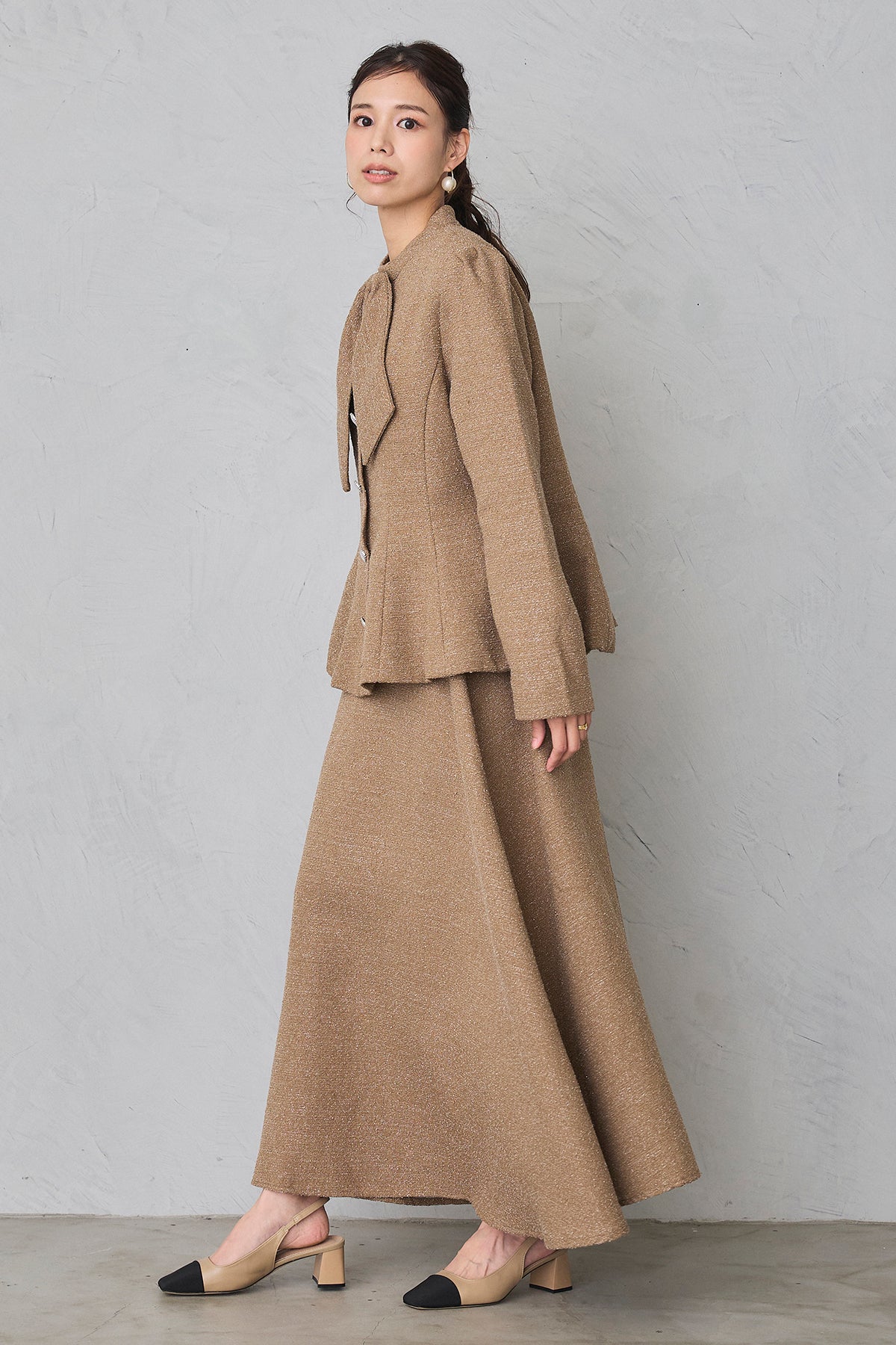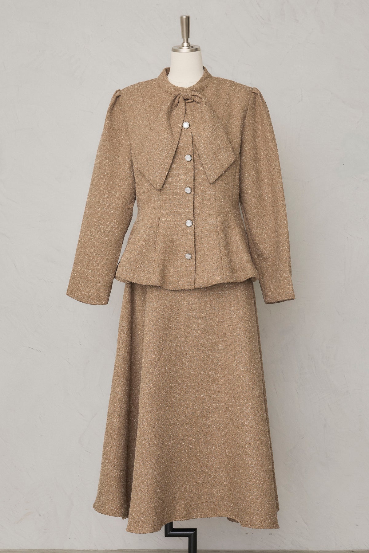 華やかなツイードを贅沢に使用し、立体的なプリンセスラインで上品に仕上げたセットアップ。 大きめのリボンタイとパール調ボタンがクラシカルな存在感を放ち、着るだけで洗練されたフォーマルスタイルが完成します。 ジャケットとスカートは単品使いもでき、オケージョンから特別なお出かけまで幅広く活躍する一着です。