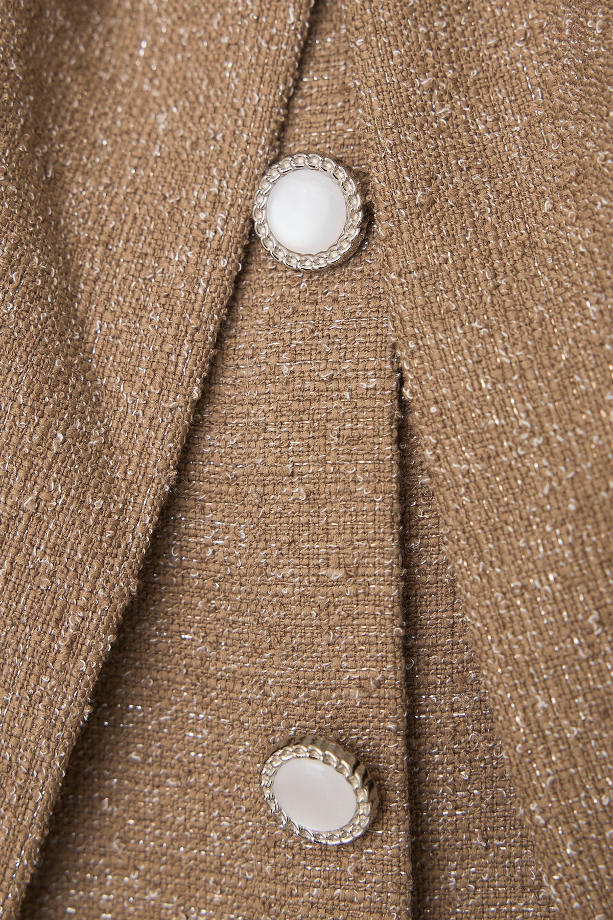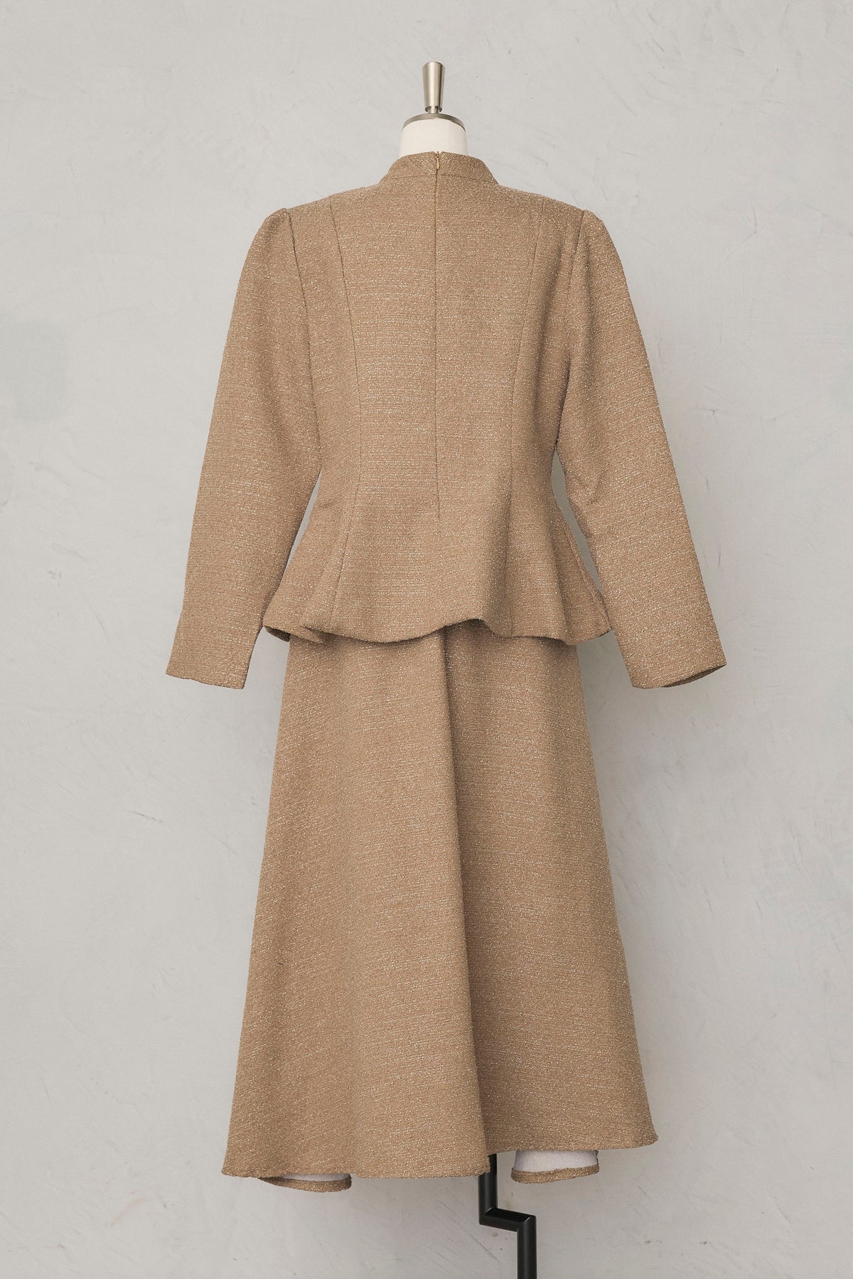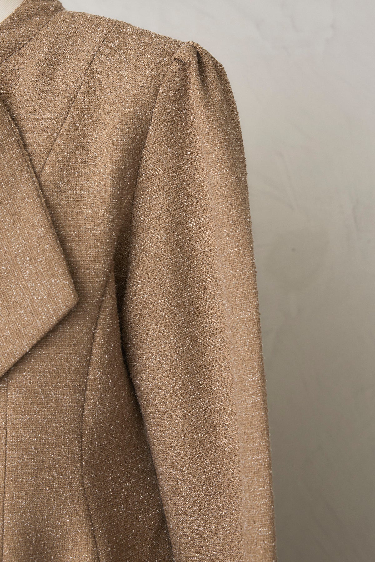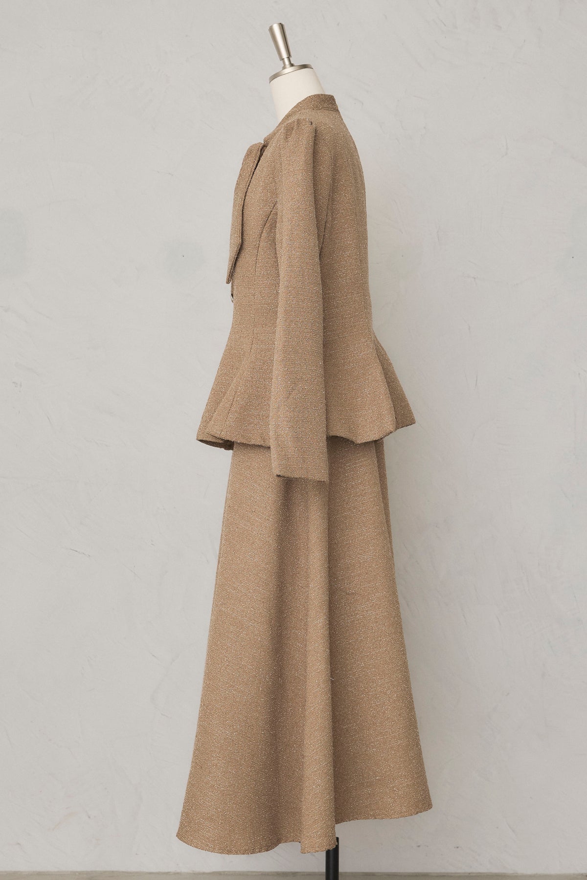 華やかなツイードを贅沢に使用し、立体的なプリンセスラインで上品に仕上げたセットアップ。 大きめのリボンタイとパール調ボタンがクラシカルな存在感を放ち、着るだけで洗練されたフォーマルスタイルが完成します。 ジャケットとスカートは単品使いもでき、オケージョンから特別なお出かけまで幅広く活躍する一着です。