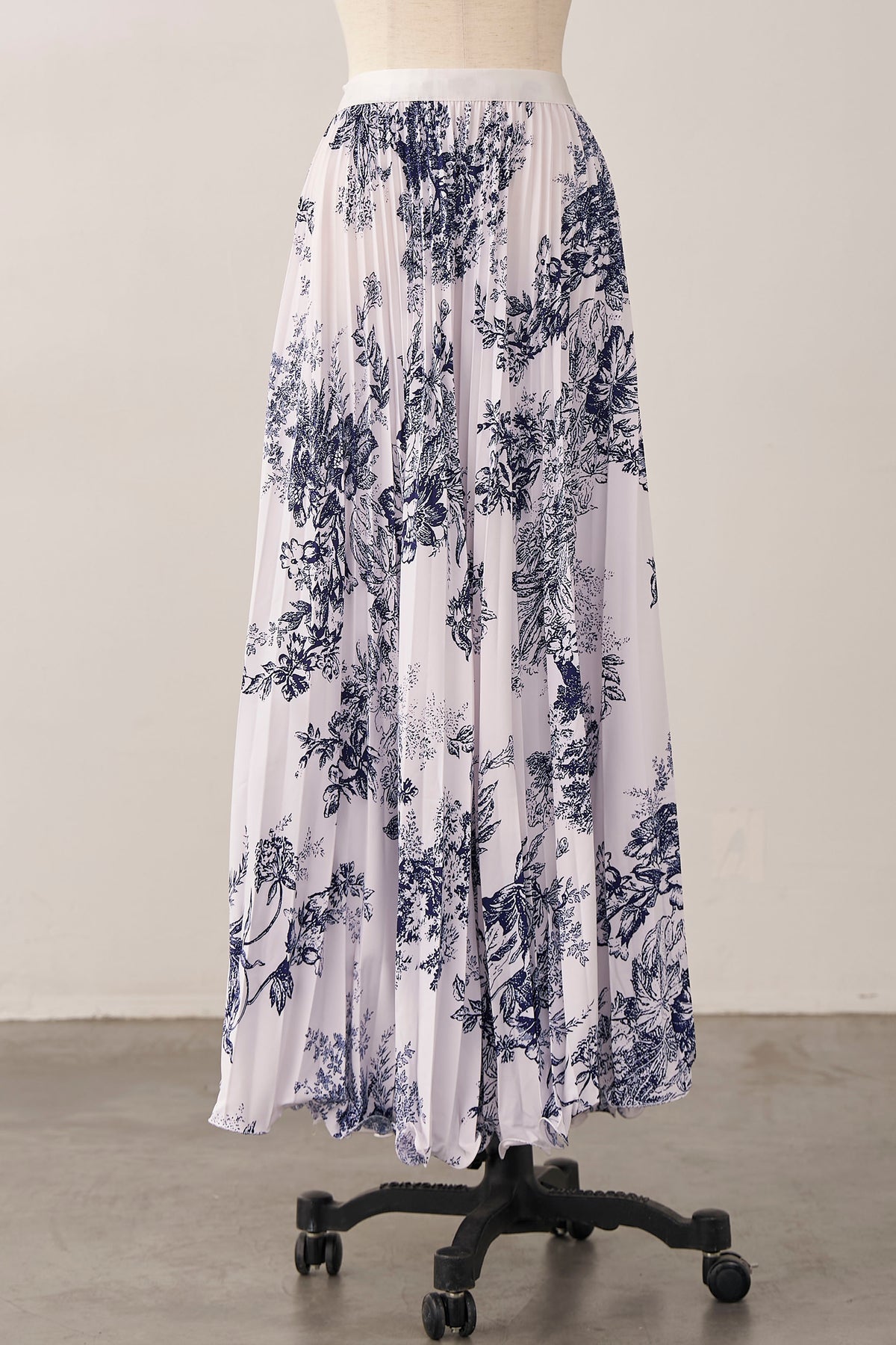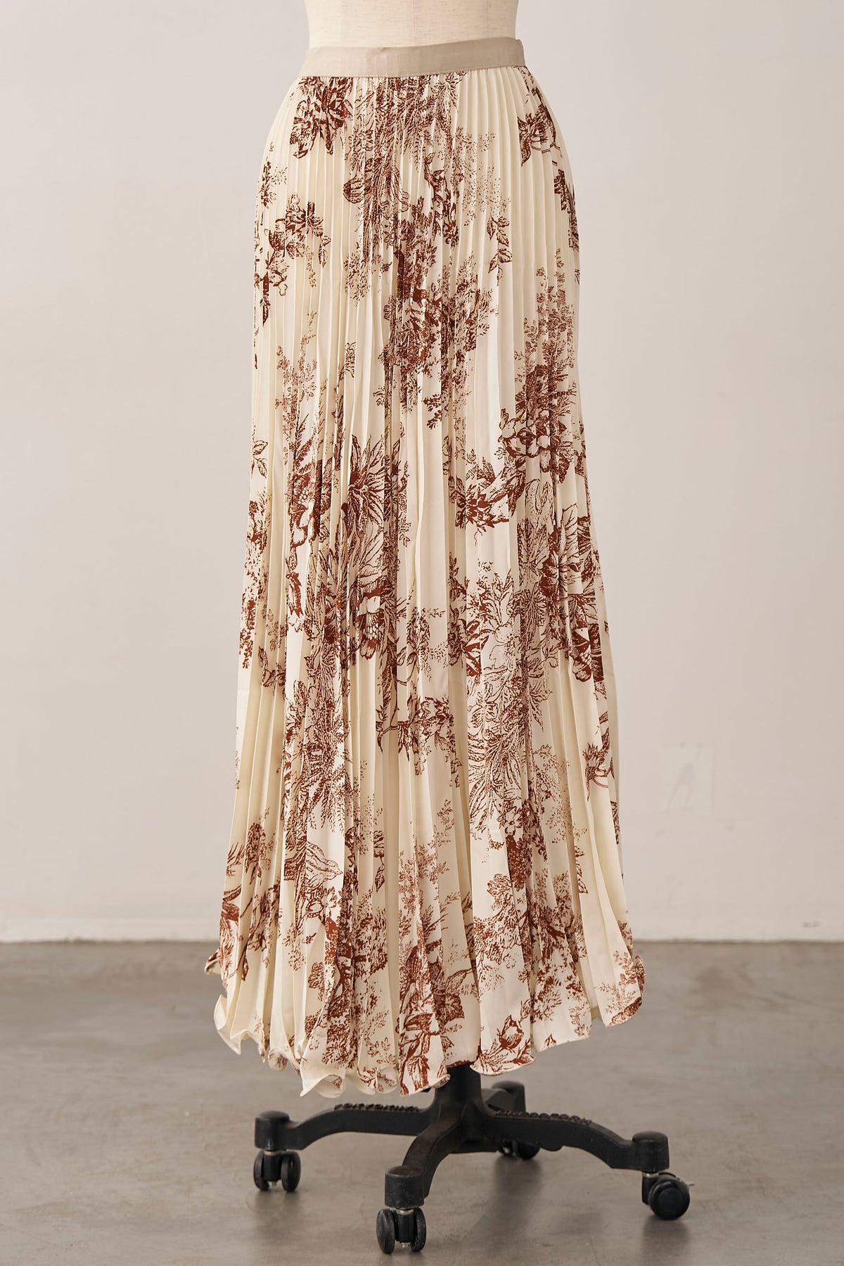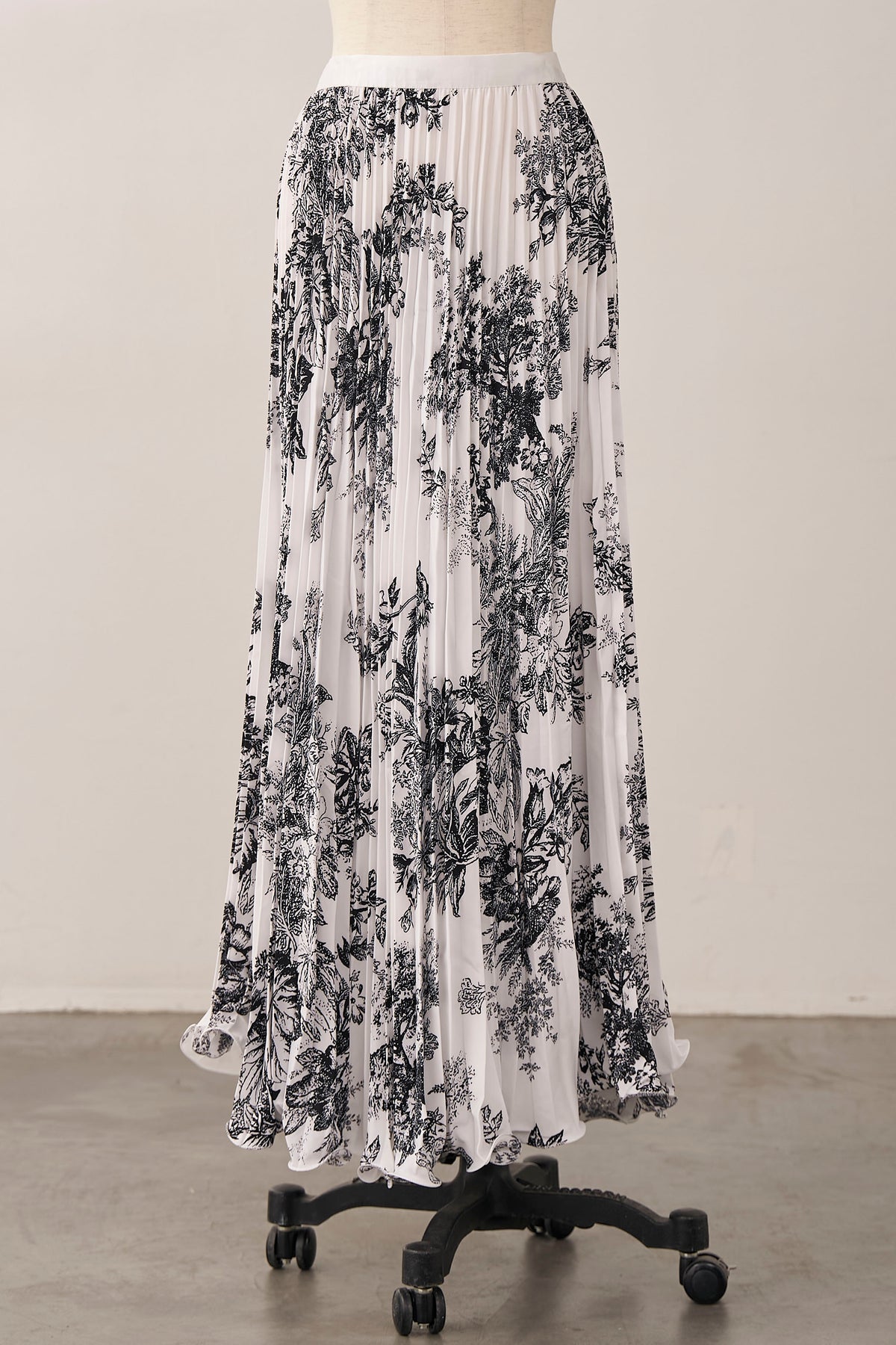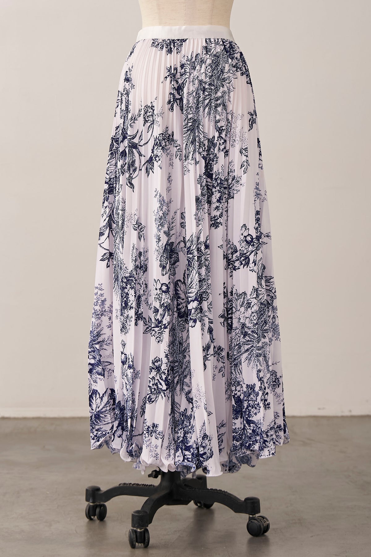 絵画のようなトワル柄と繊細なプリーツが、クラシカルな気品を漂わせるスカート。 縦に落ちるすっきりとしたシルエットは、ジャケットスタイルとも抜群の相性。 歩くたびに軽やかに揺れ、春の街に映える洗練された一着です。