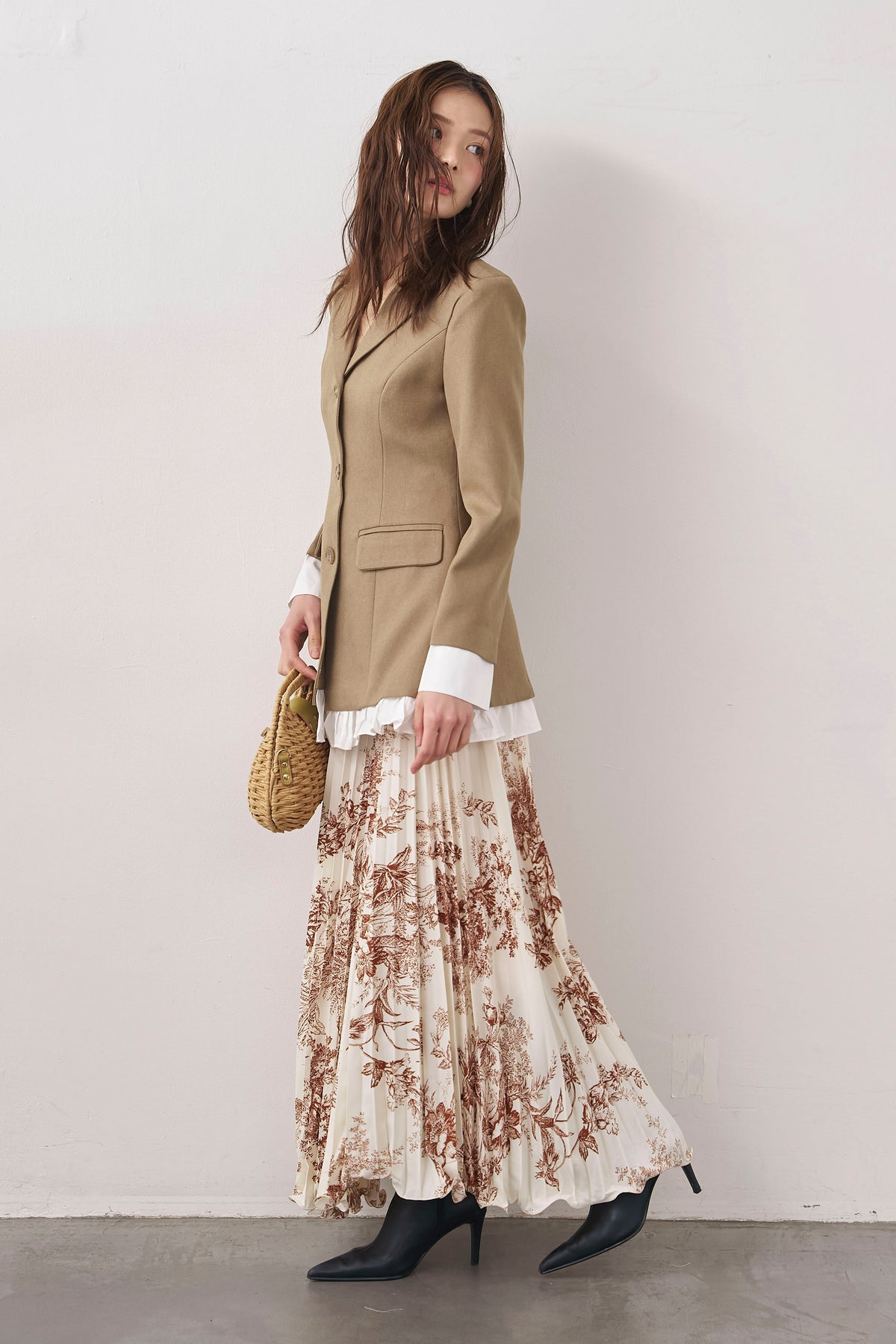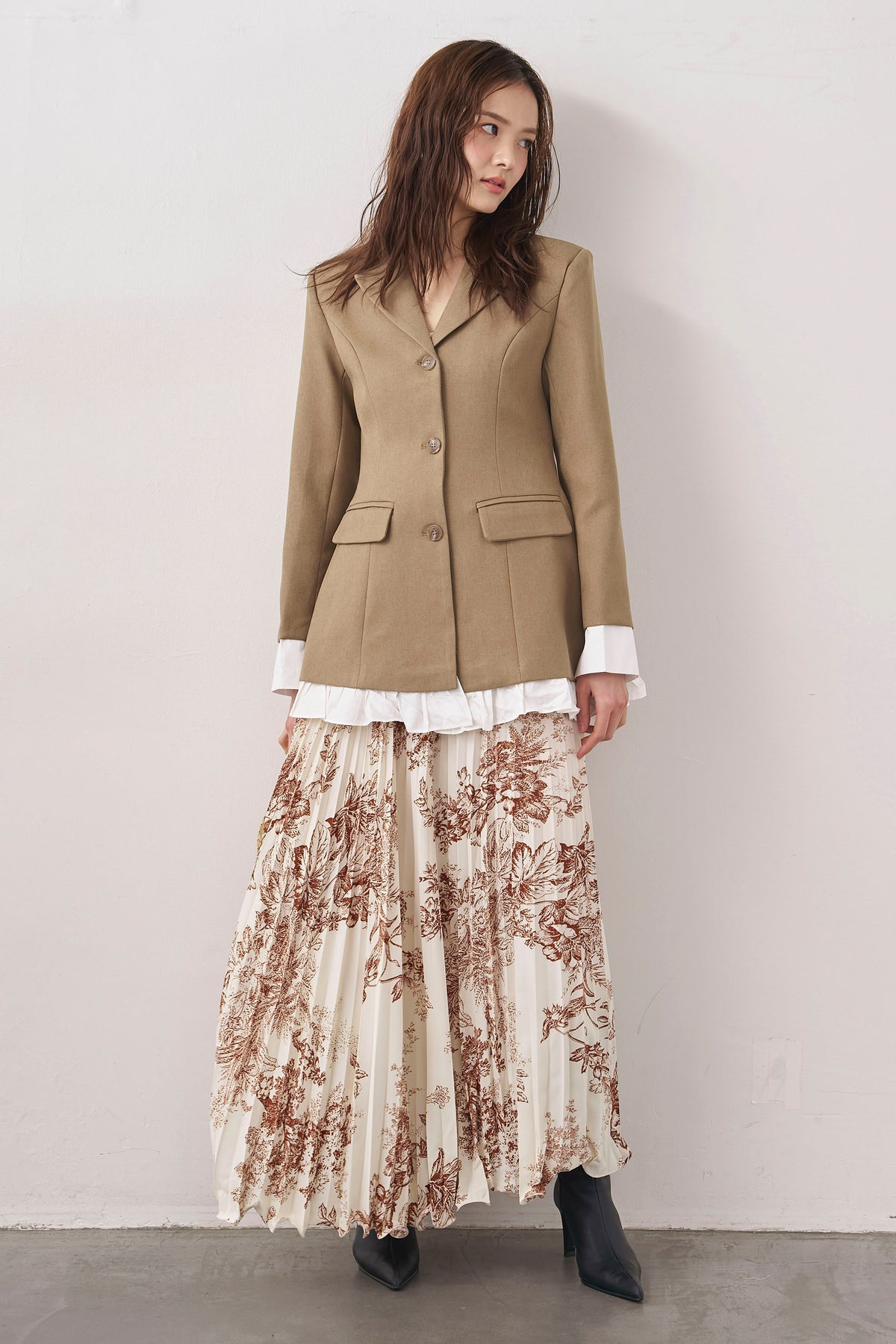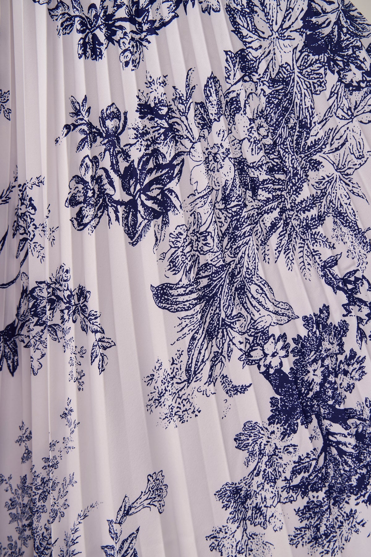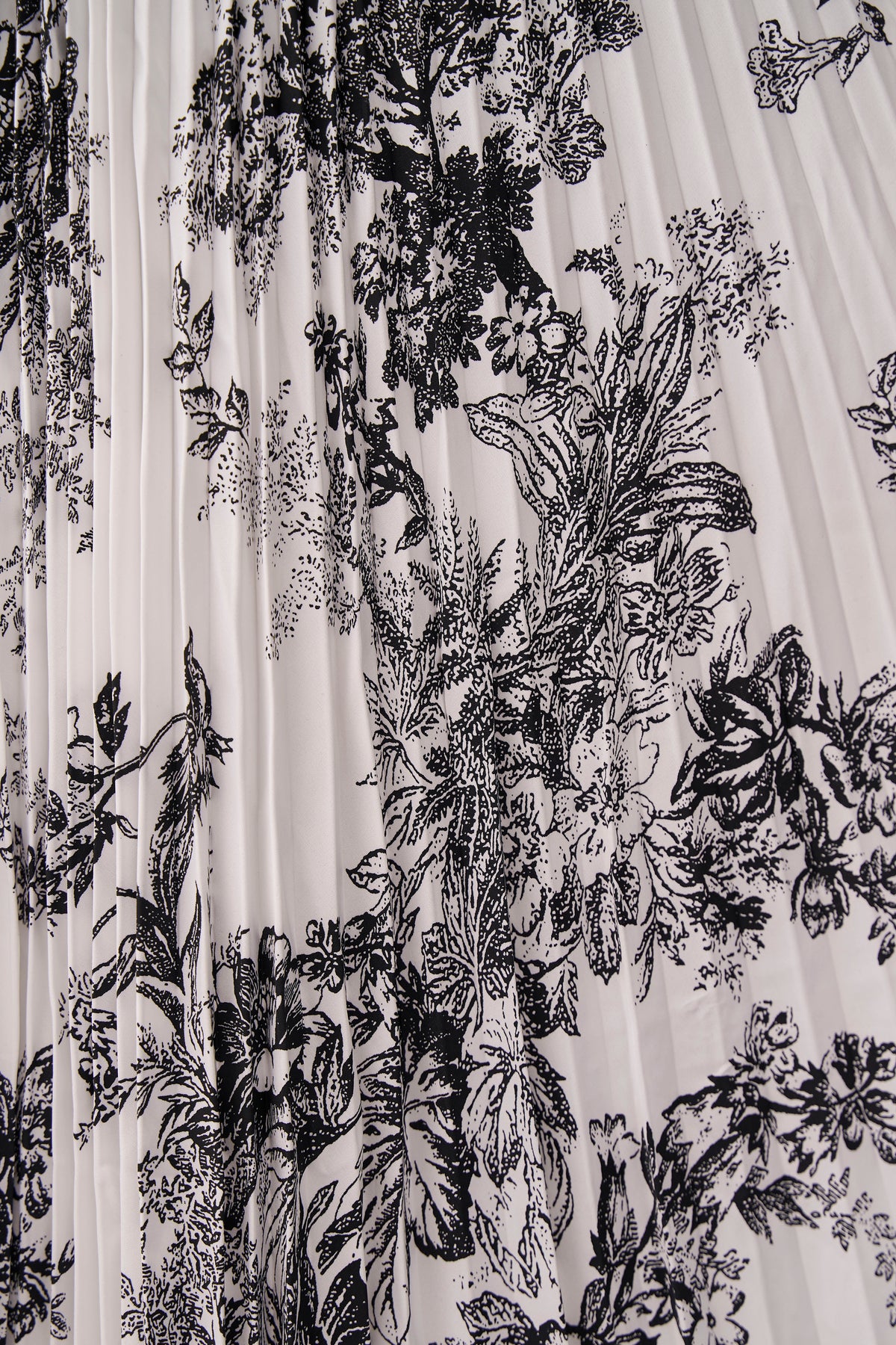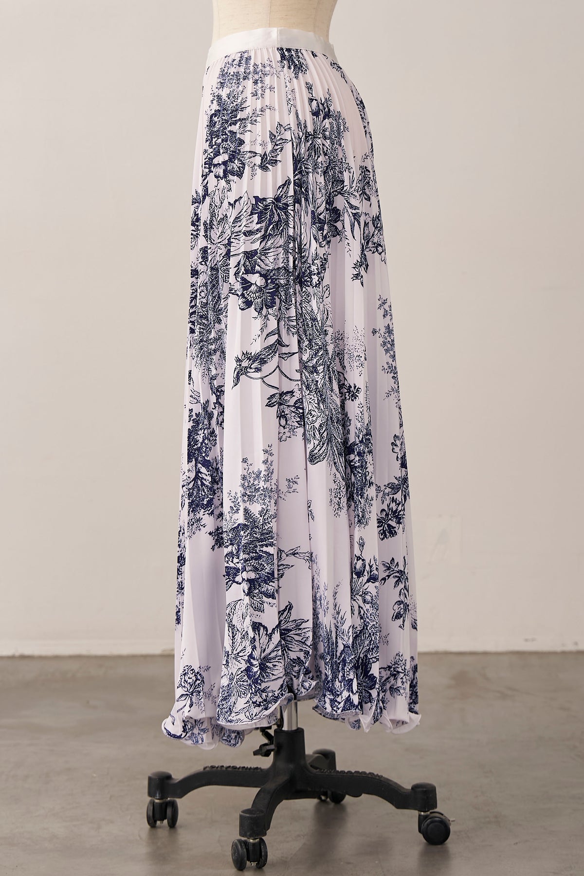 絵画のようなトワル柄と繊細なプリーツが、クラシカルな気品を漂わせるスカート。 縦に落ちるすっきりとしたシルエットは、ジャケットスタイルとも抜群の相性。 歩くたびに軽やかに揺れ、春の街に映える洗練された一着です。
