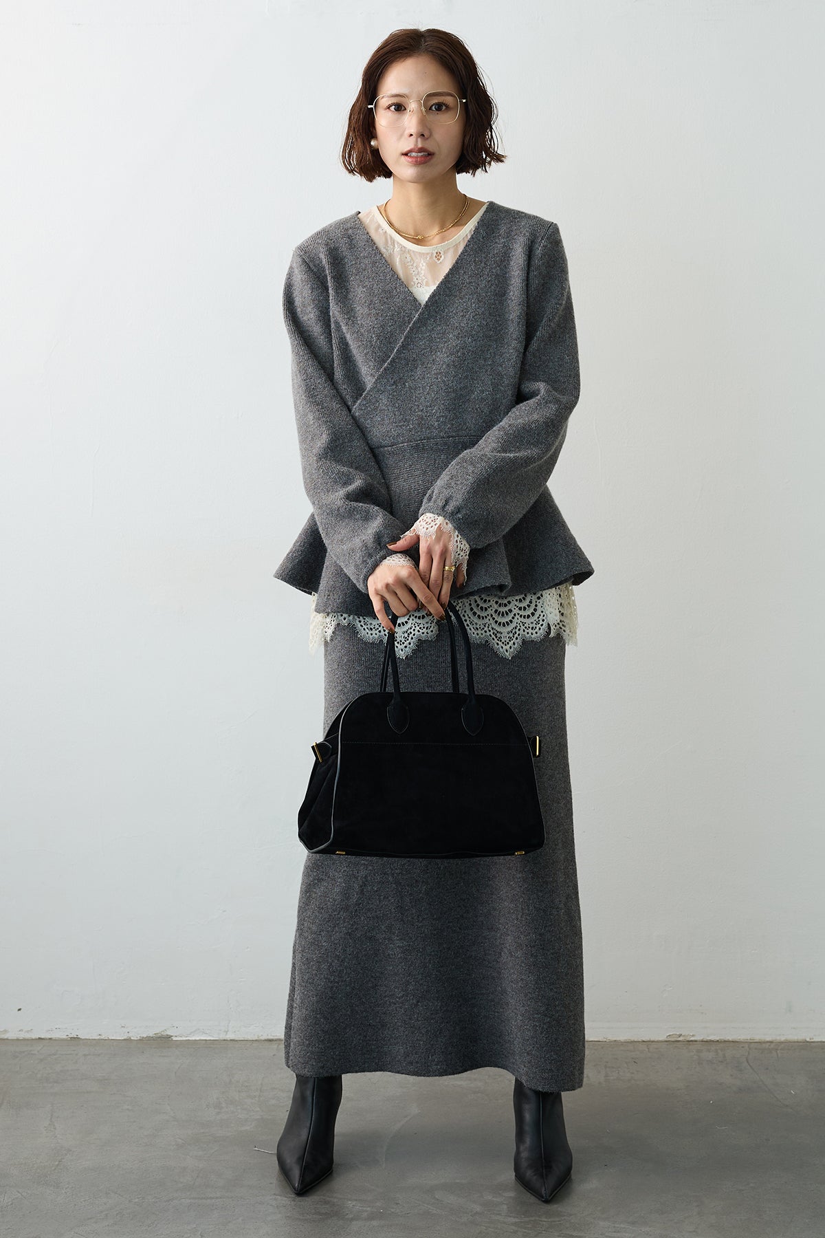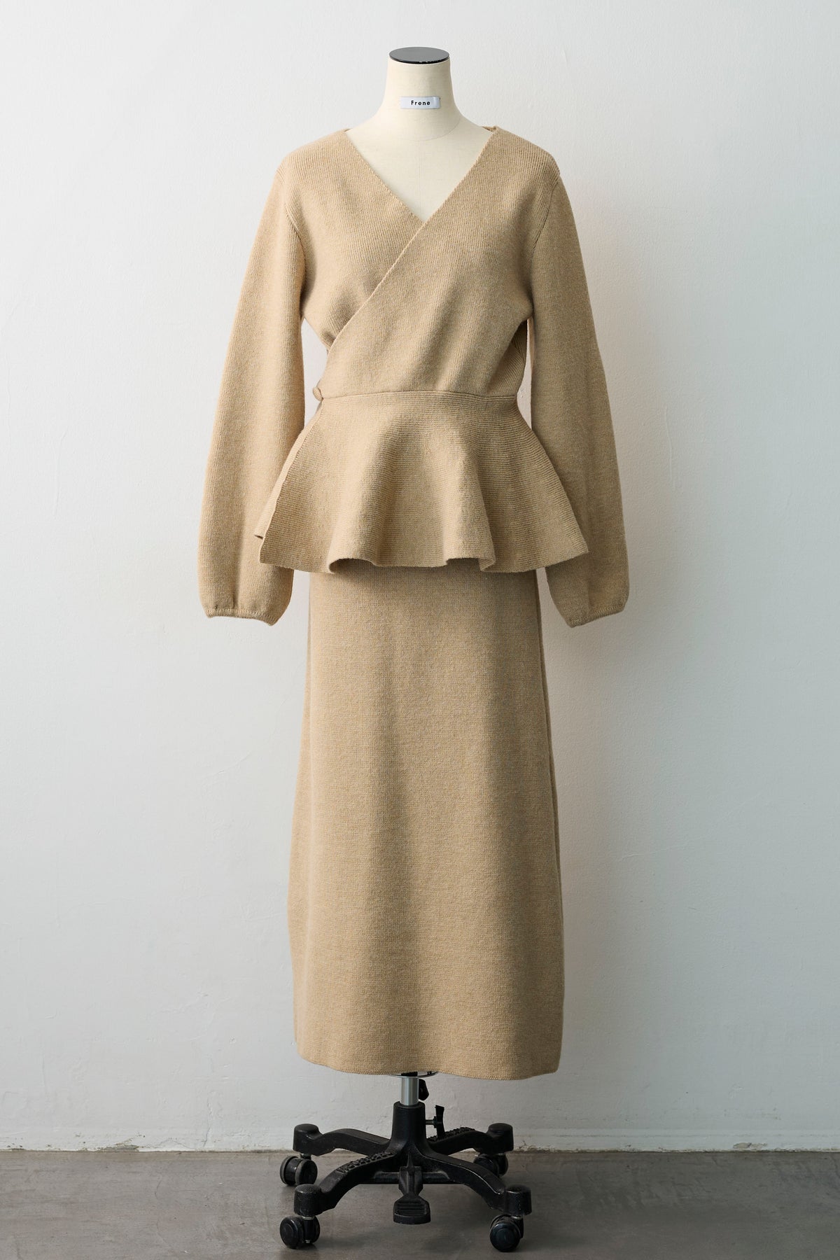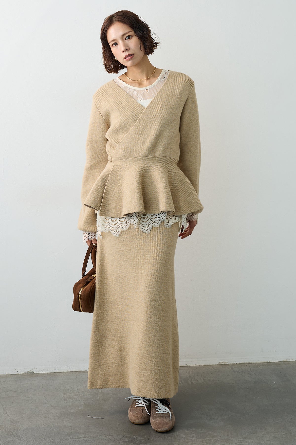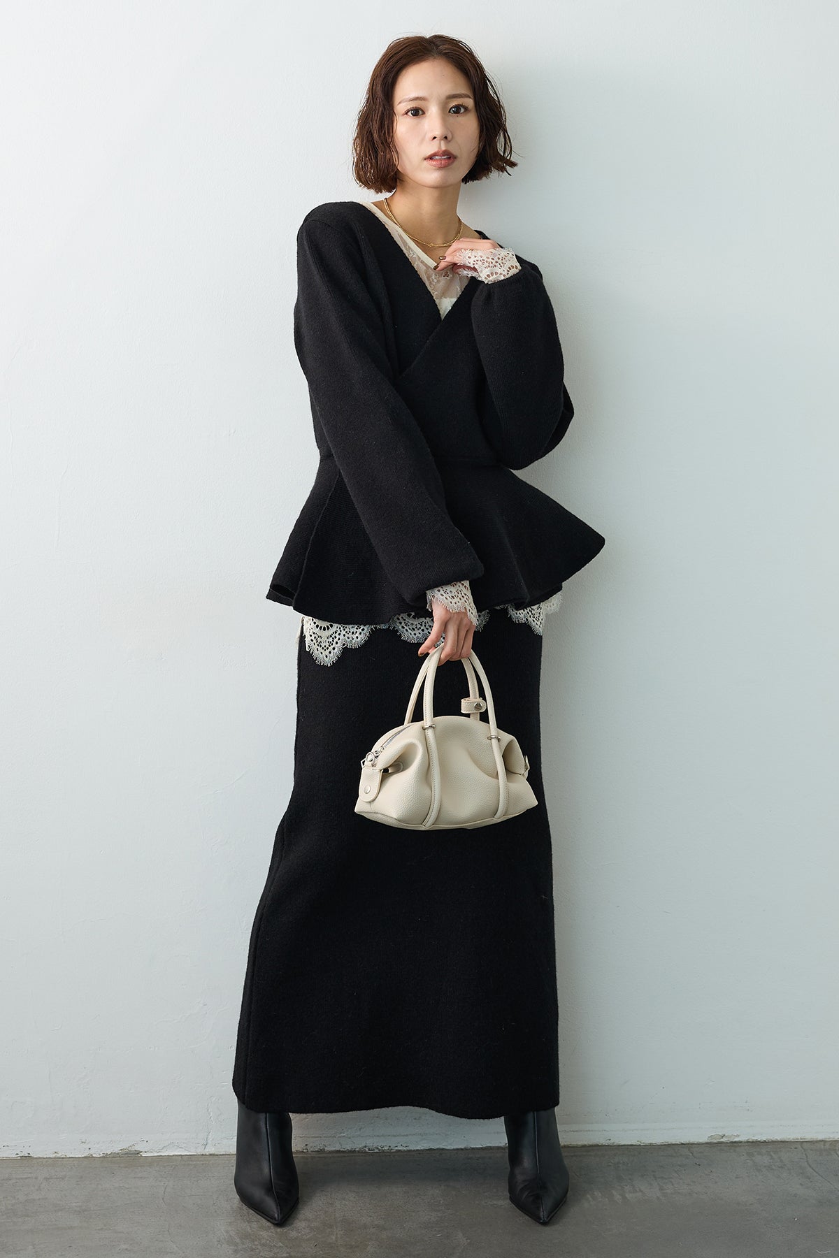 女性らしい曲線美を引き立てる、カシュクールデザインのニットセットアップ。 トップスは高めの位置で切り替えたペプラムシルエットが、腰回りをふわりとカバーしつつ脚長効果を演出します。 程よい開きのVネックは、デコルテを綺麗に見せたり、レーストップスやタートルネックとのレイヤードも楽しめる絶妙なバランス。 スカートはすっきりとした縦のラインを強調するシルエットで、セットアップでの着用はもちろん、単品使いでも着回しの幅が広がる優秀なアイテムです。