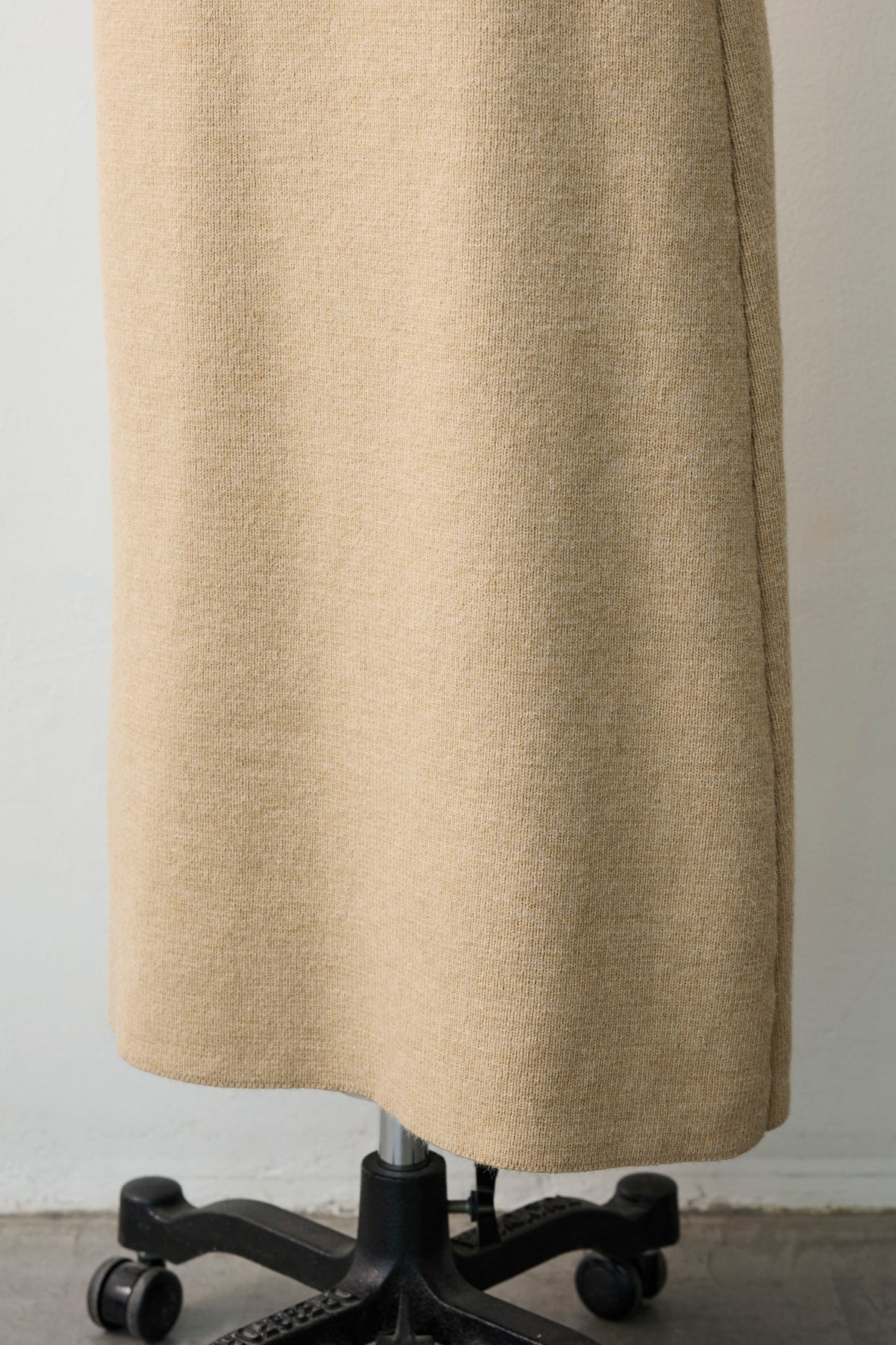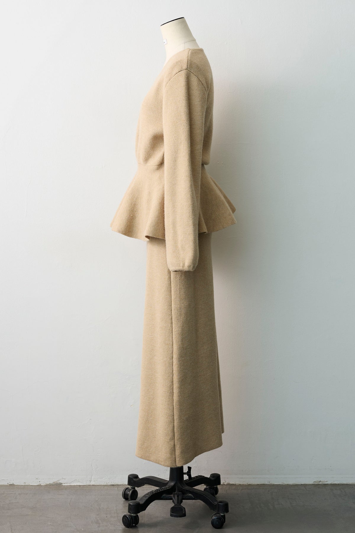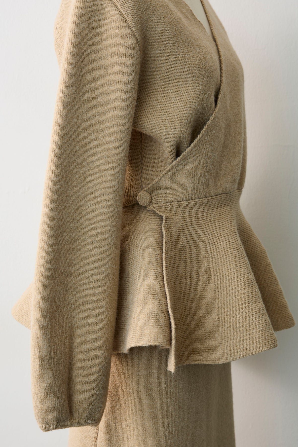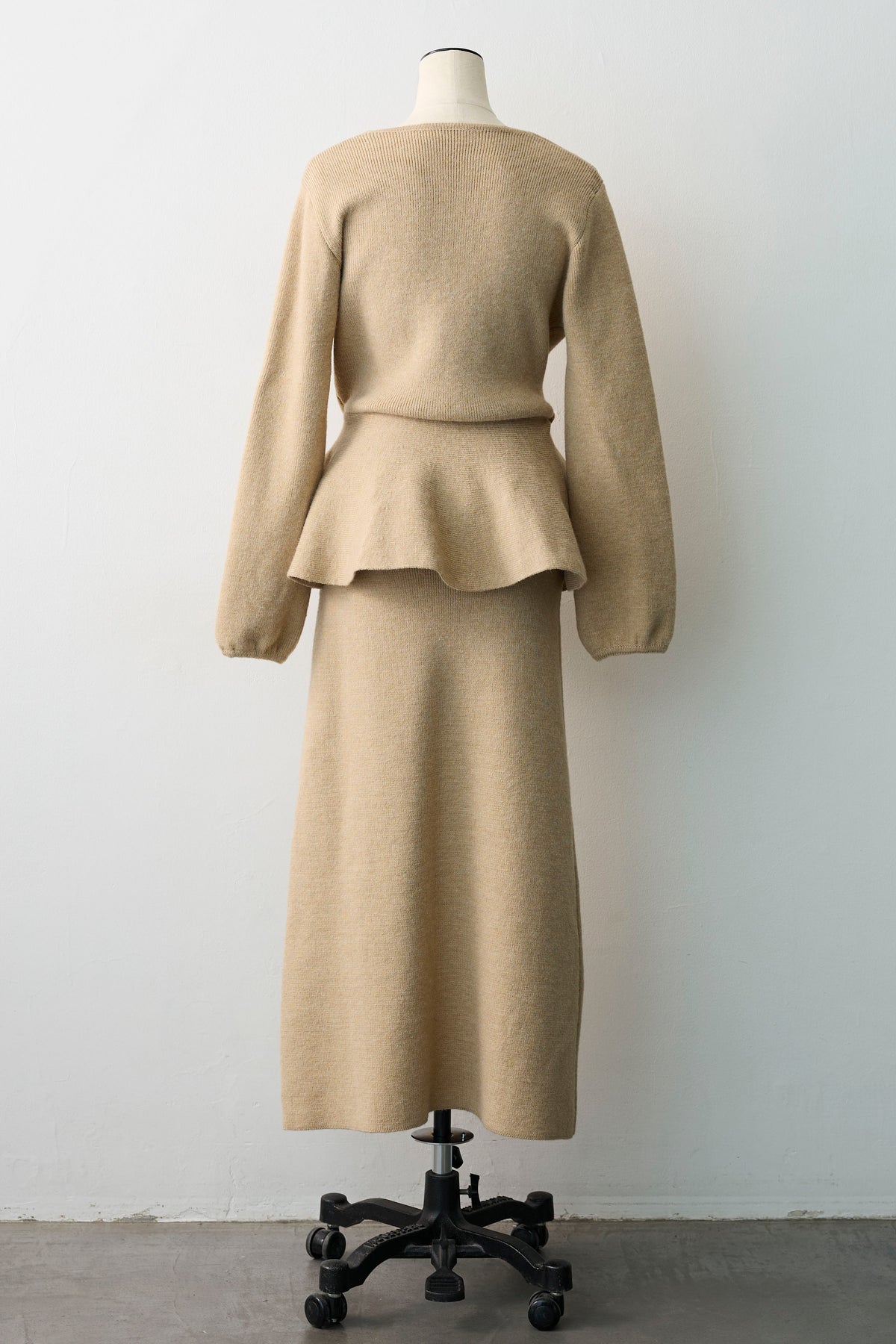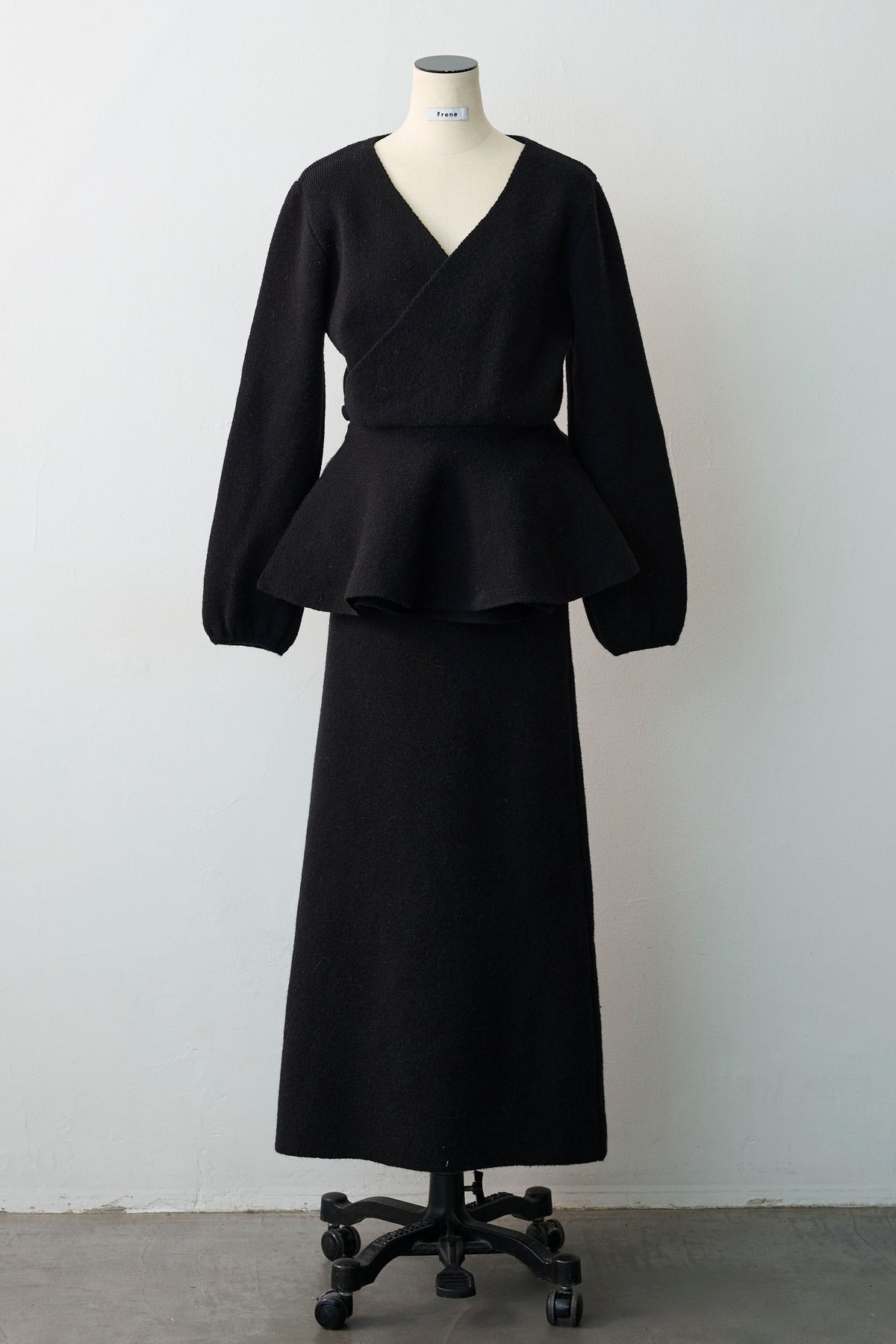 女性らしい曲線美を引き立てる、カシュクールデザインのニットセットアップ。 トップスは高めの位置で切り替えたペプラムシルエットが、腰回りをふわりとカバーしつつ脚長効果を演出します。 程よい開きのVネックは、デコルテを綺麗に見せたり、レーストップスやタートルネックとのレイヤードも楽しめる絶妙なバランス。 スカートはすっきりとした縦のラインを強調するシルエットで、セットアップでの着用はもちろん、単品使いでも着回しの幅が広がる優秀なアイテムです。
