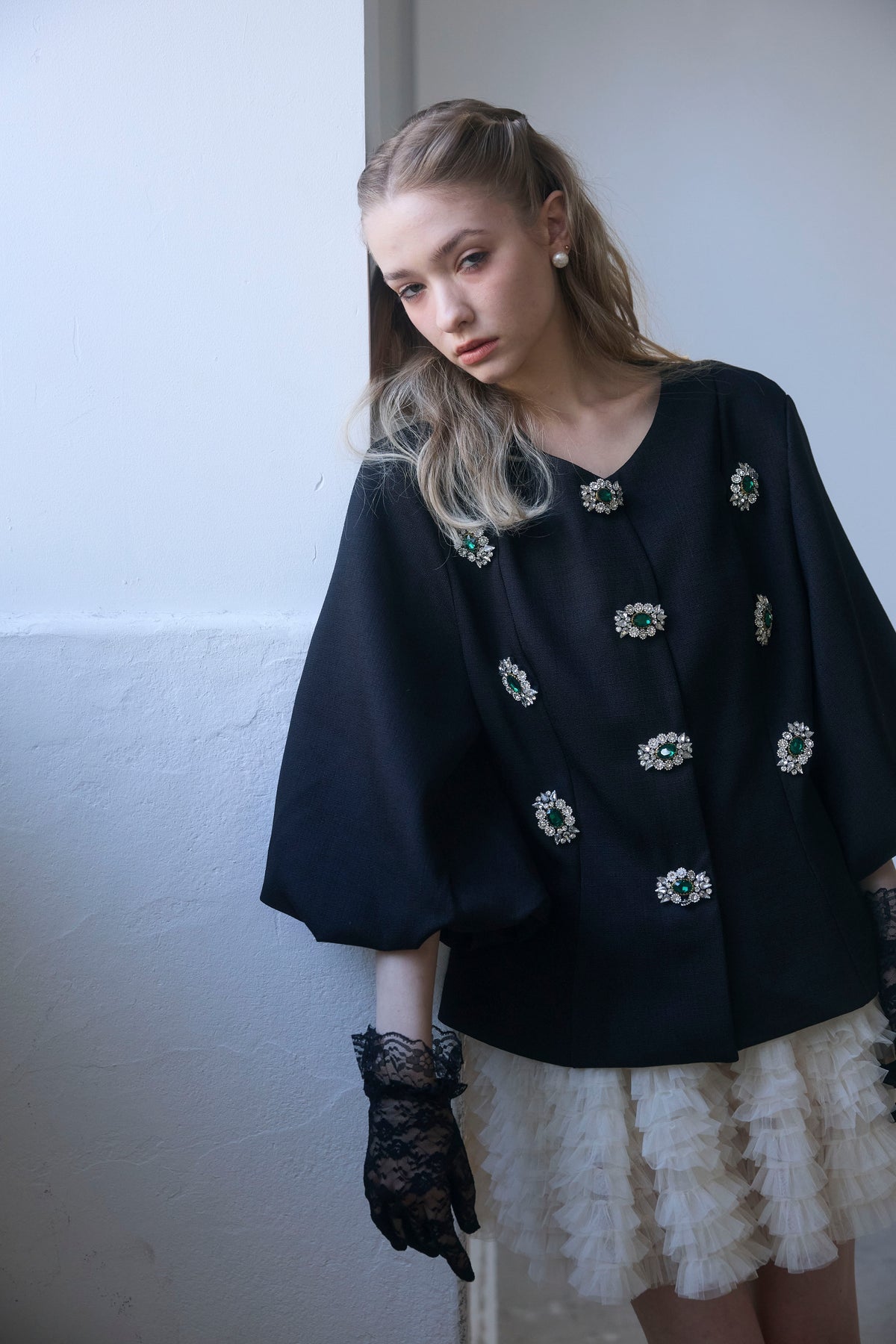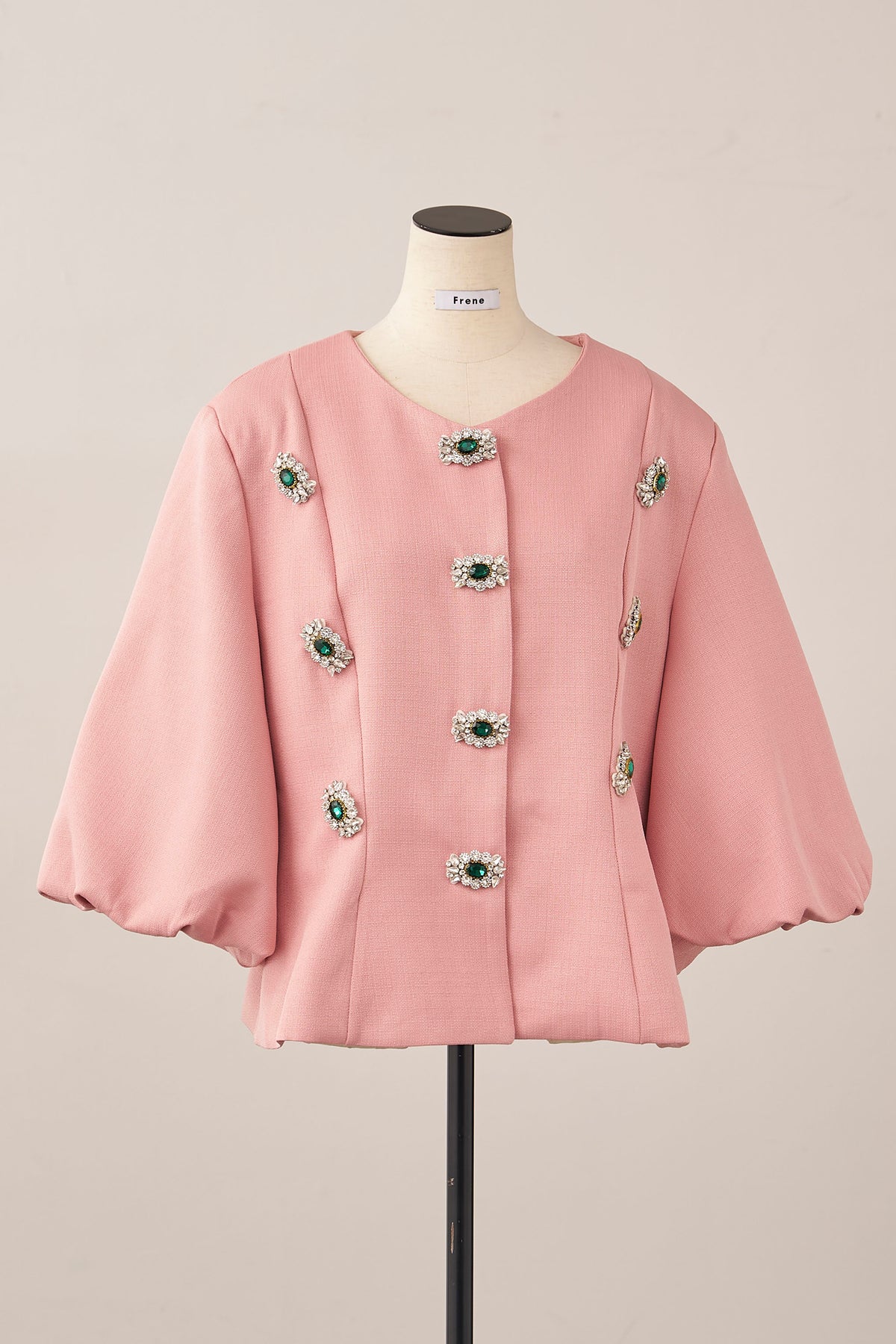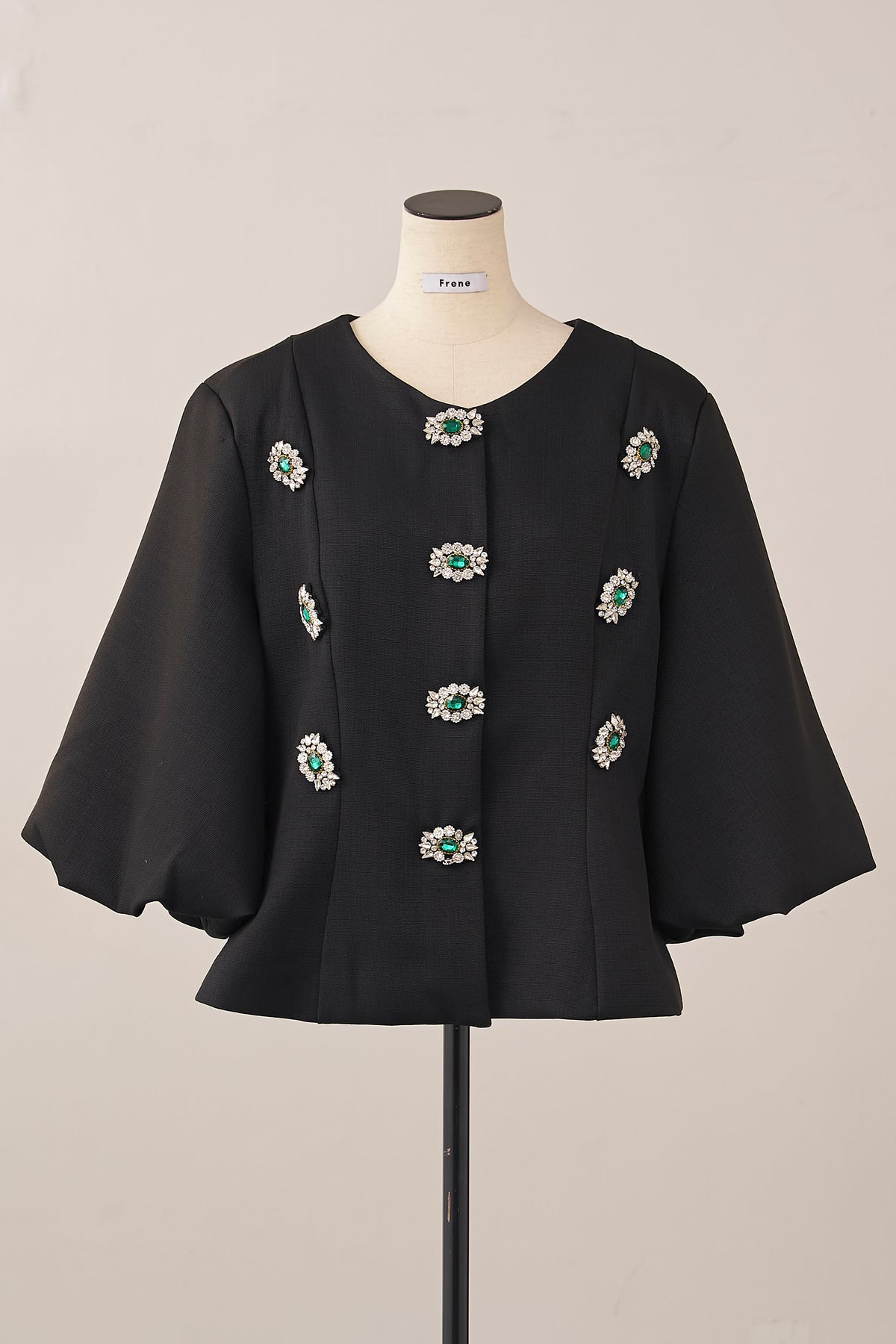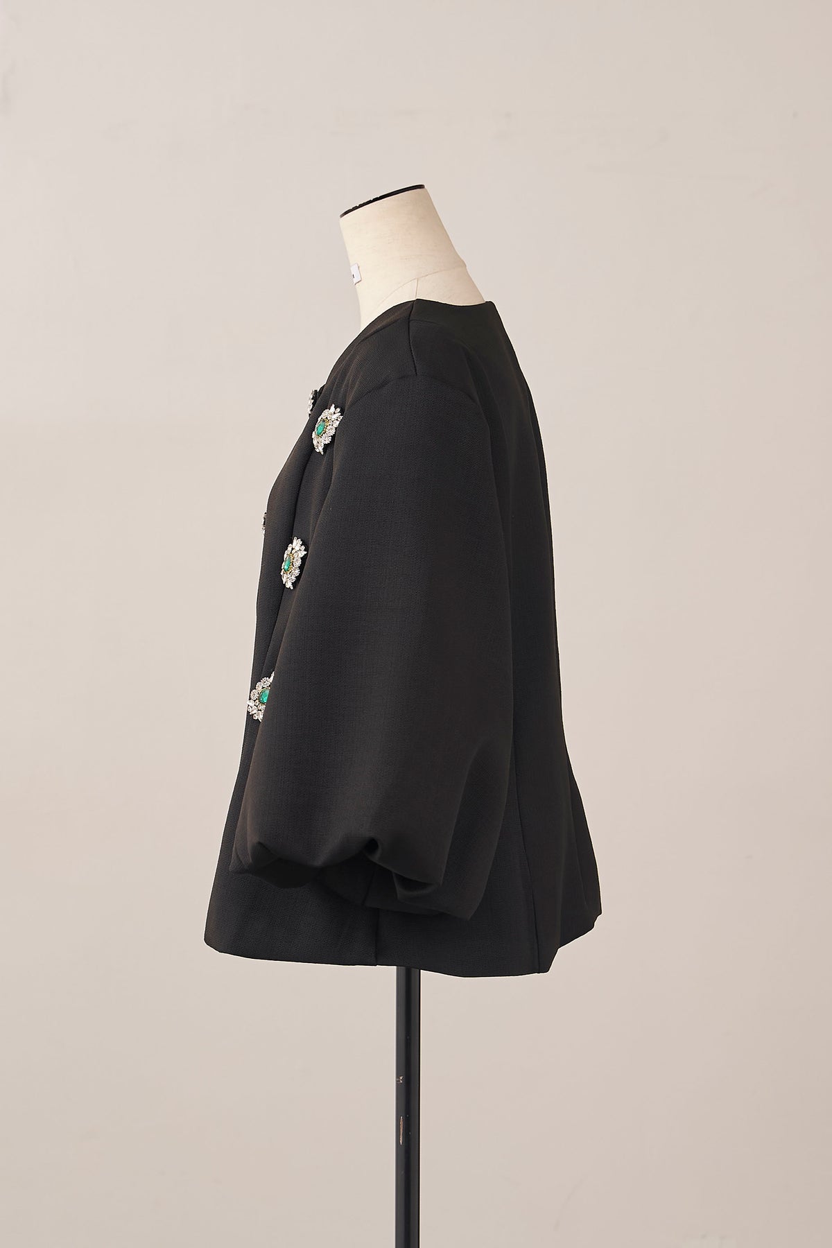 宝石のようなビジューボタンを贅沢にあしらった、クラシカルなノーカラージャケット。 パネルラインで仕立てた立体的なシルエットが、ウエストをすっきりと見せ、羽織るだけで美しいボディラインを演出します。 ふんわりとしたボリュームスリーブは、手元を華奢に見せるフェミニンなアクセント。 シンプルなボトムスと合わせるだけで、日常が特別になる主役級の一着です。