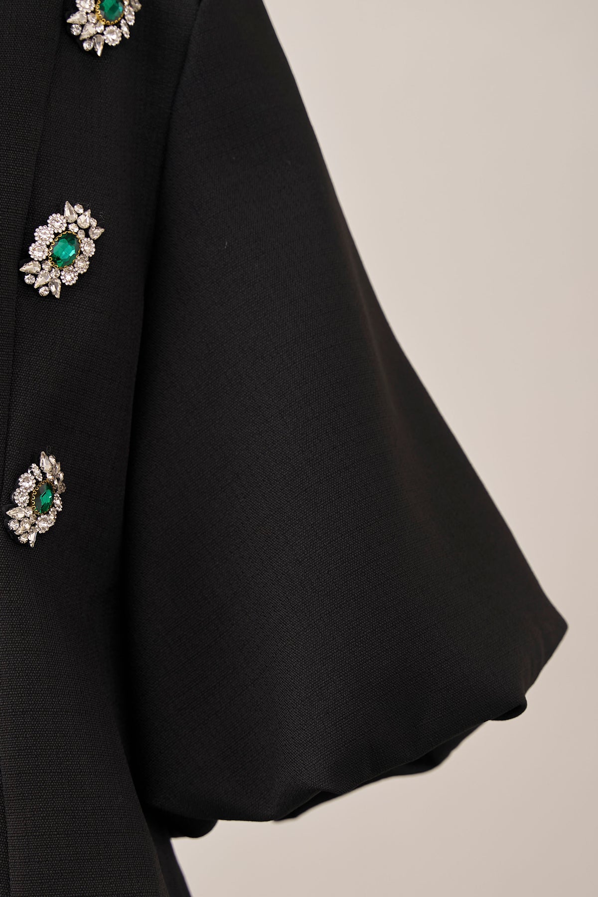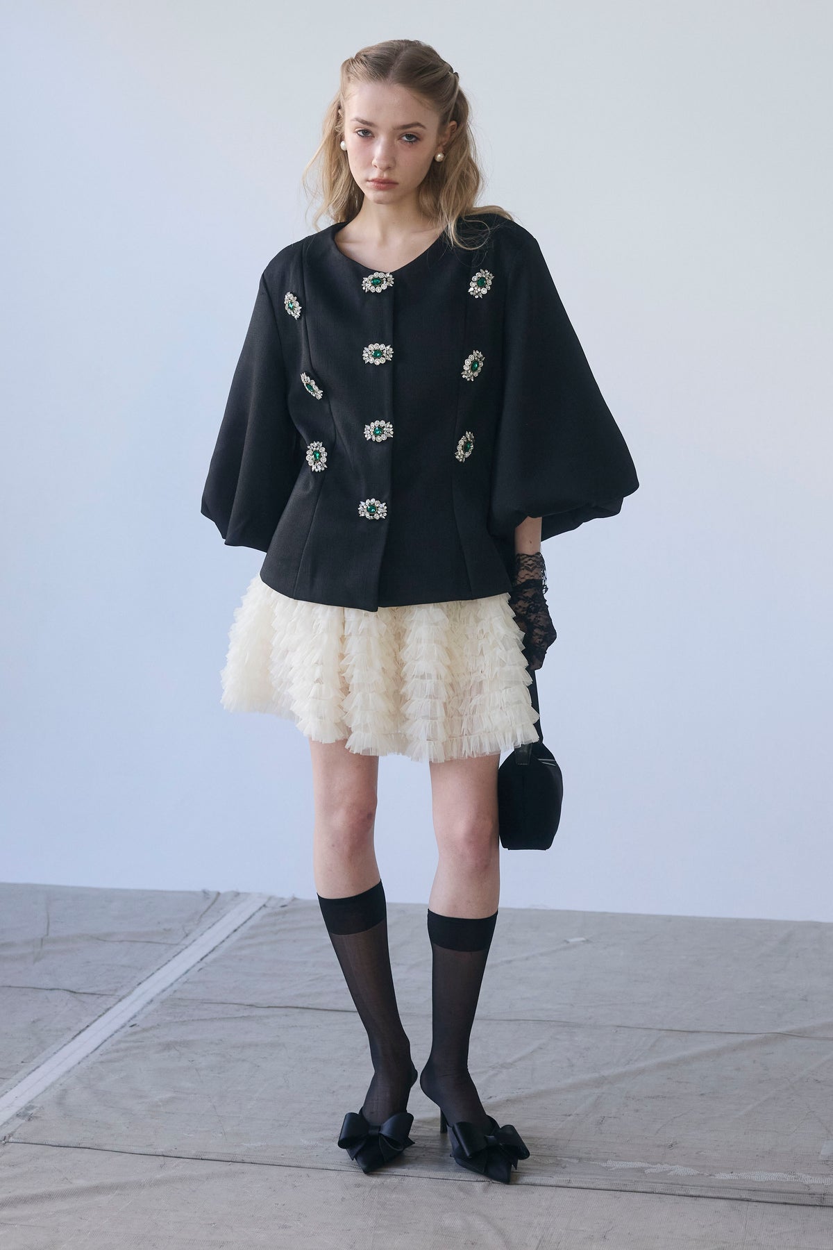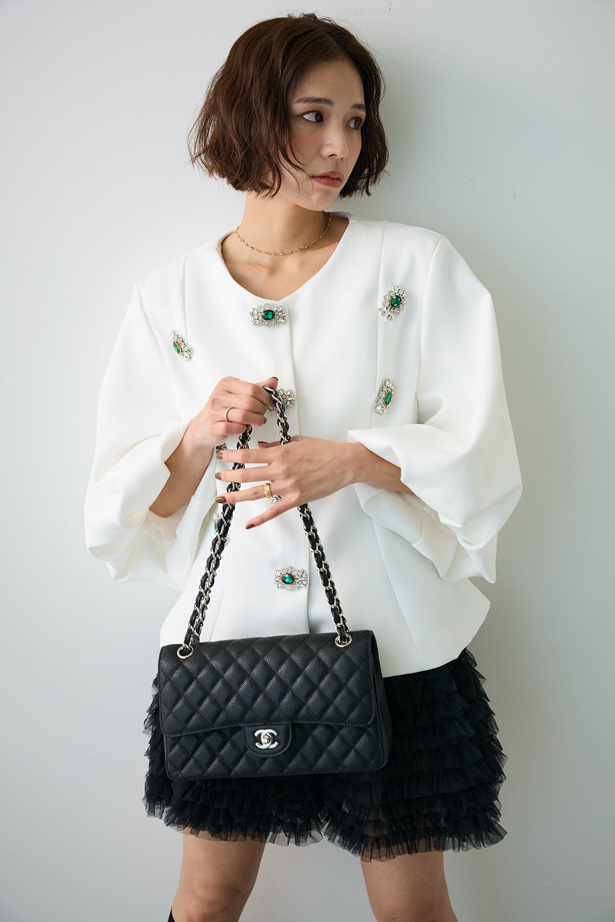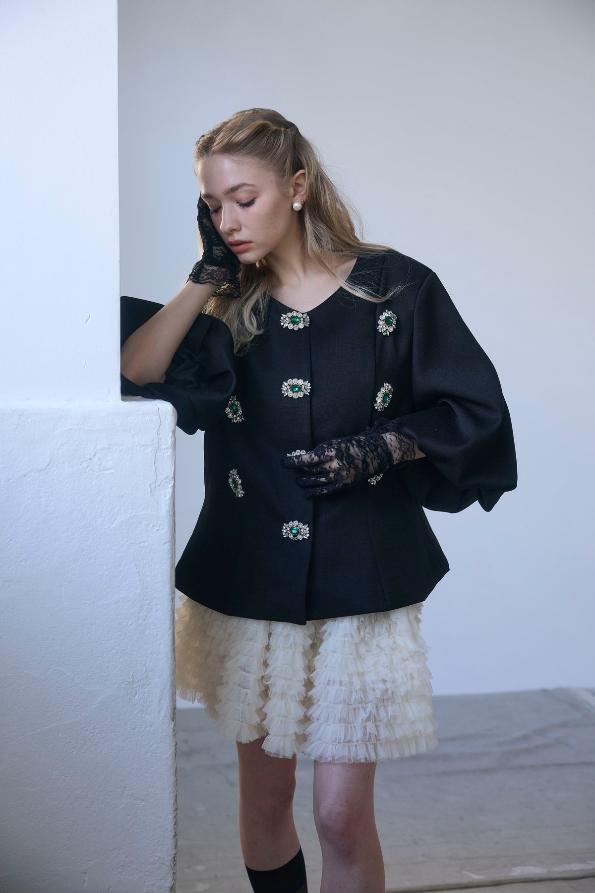 宝石のようなビジューボタンを贅沢にあしらった、クラシカルなノーカラージャケット。 パネルラインで仕立てた立体的なシルエットが、ウエストをすっきりと見せ、羽織るだけで美しいボディラインを演出します。 ふんわりとしたボリュームスリーブは、手元を華奢に見せるフェミニンなアクセント。 シンプルなボトムスと合わせるだけで、日常が特別になる主役級の一着です。
